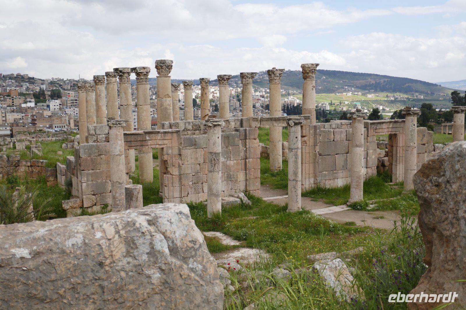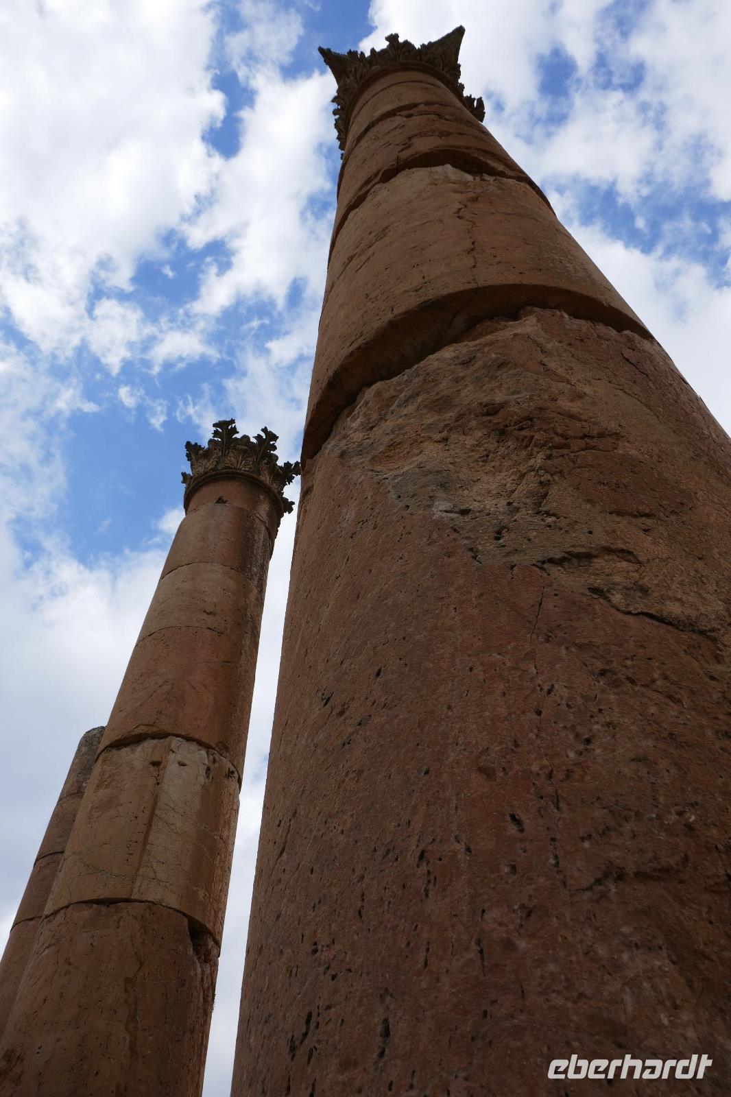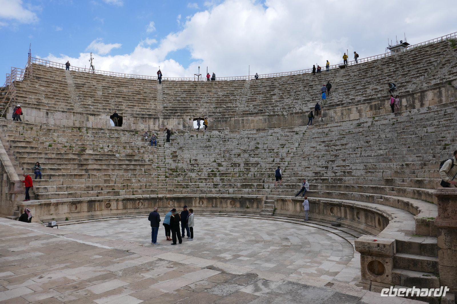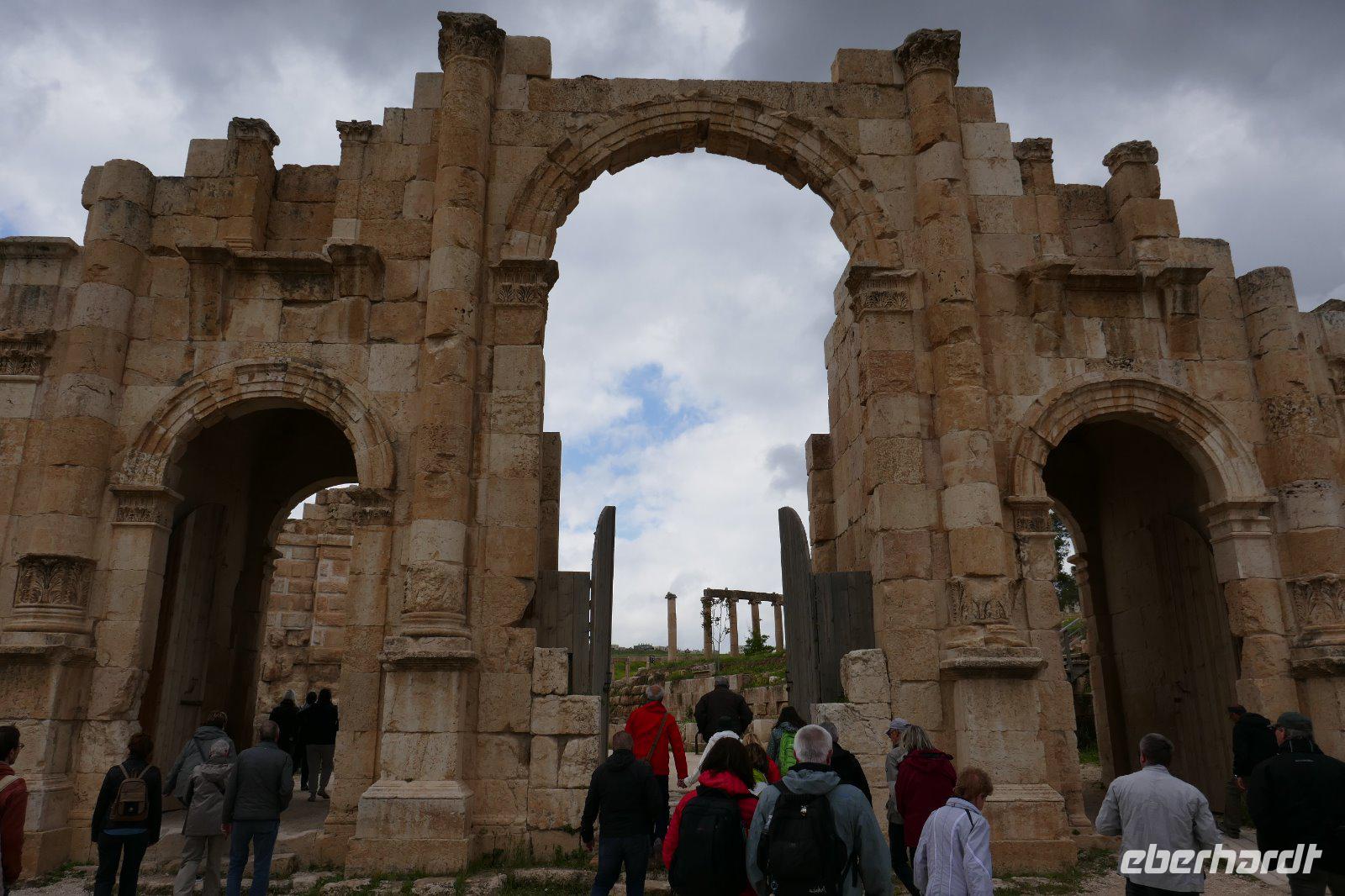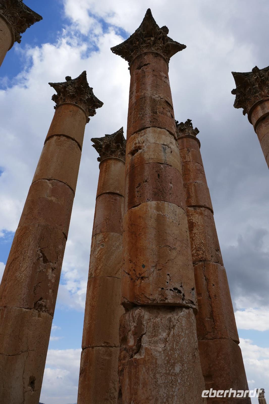 Der Weg heute führt in den Norden. Die Vegetation wurde intensiver. Oliven- u. Feigenhaine, vielfach terrassenförmig angelegt säumen unsere Wegstrecke nach Norden. Sie bilden einen schönen Kontrast zu den weißen Kalkfelsen und der rotfarbigen Erde. Nur die Minarette und der typische Baustil verraten, dass wir nicht in deutschen Mittelgebirgen oder gar in den Alpen sind. Hoch oben über Ajlun thront die in den 1930-er Jahren restaurierte Festung Qala'at ar-Rabad. Im 12. Jahrhundert errichtet war die Festung Teil einer von Sultan Saladin errichteten Festungskette. Sie gilt heute als einzige mittelalterliche Burg Jordaniens und wurde über der Ruine eines Klosters errichtet. Von hier aus hatten wir im Rahmen unserer Besichtigungstour einen wunderschönen Ausblick, den alle genossen haben. Nächstes Ziel war Jerash. das seit 6.500 Jahren ununterbrochen besiedelt ist und einst florierender Handelsplatz an der Weihrauchstraße nach Damaskus war. Die Römer haben hier eindrucksvoll ihre Spuren hinterlassen. Nicht umsonst wird es auch das „Pompeji des Ostens" genannt. Wir bummelten durch die ehemalige römische Stadt mit ihren Tempeln, Theater und Thermen. Beim Rundgang erlebten wir gepflasterte Kolonnadenstraßen, gesäumt mit zahllosen Säulen sowie weitläufig angelegte Plätze und Brunnen. Beim Schließen der Augen konnte man das Treiben der Stadt erahnen und sich der einstigen Bedeutung der Stadt noch klarer werden. Der Artemistempel mit seinen 11 Säulen kann nur von einer Stelle aus so fotografiert werden. Dazu muss man die Stelle kennen. Natürlich kannte unser Guide diese Stelle und so konnten alle ein Bild davon machen. Mit diesen Eindrücken ging es dann wieder zum Hotel zurück.