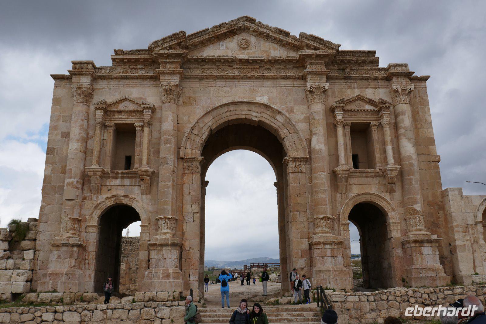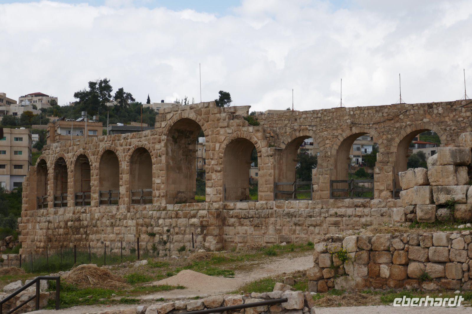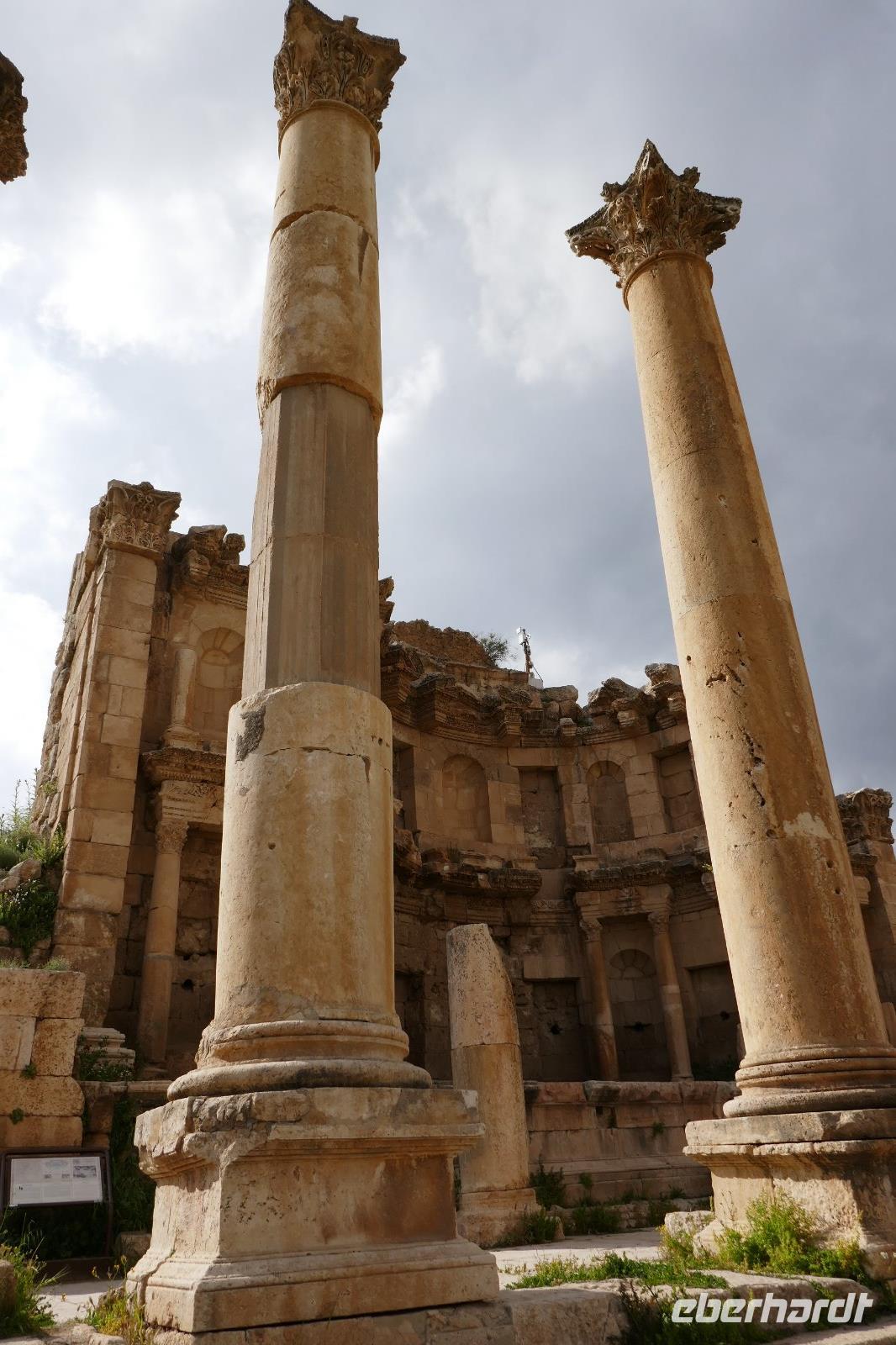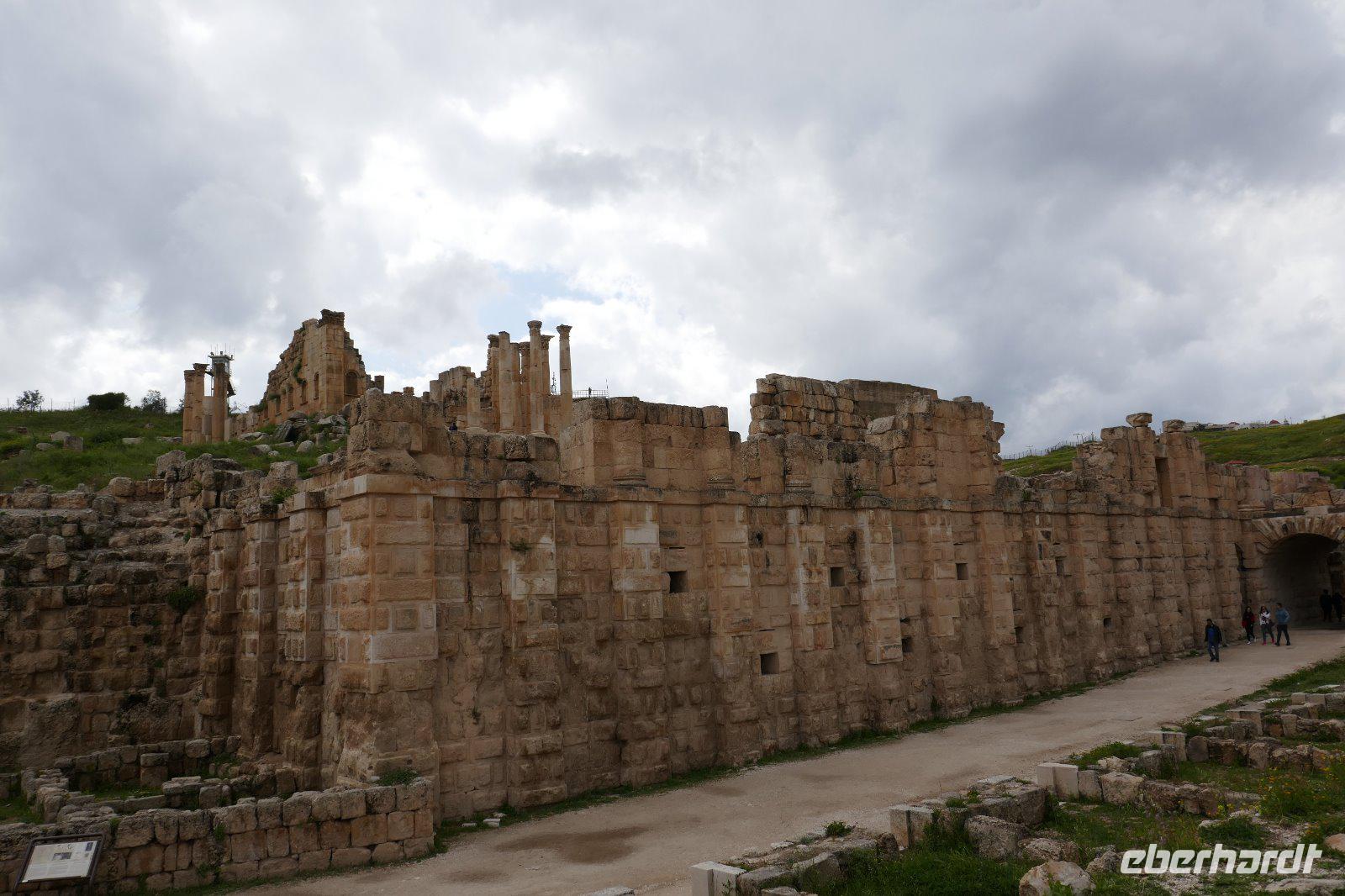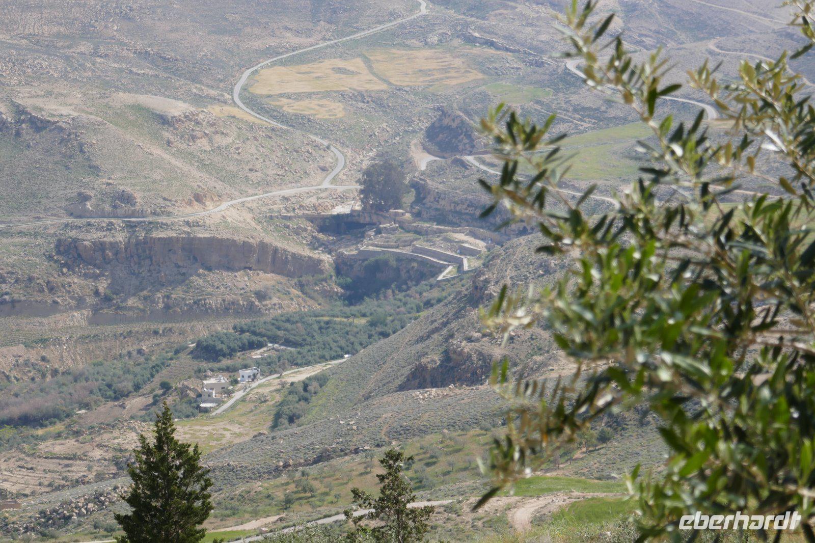 Der Weg heute führt in den Norden. Die Vegetation wurde intensiver. Oliven- u. Feigenhaine, vielfach terrassenförmig angelegt säumen unsere Wegstrecke nach Norden. Sie bilden einen schönen Kontrast zu den weißen Kalkfelsen und der rotfarbigen Erde. Nur die Minarette und der typische Baustil verraten, dass wir nicht in deutschen Mittelgebirgen oder gar in den Alpen sind. Hoch oben über Ajlun thront die in den 1930-er Jahren restaurierte Festung Qala'at ar-Rabad. Im 12. Jahrhundert errichtet war die Festung Teil einer von Sultan Saladin errichteten Festungskette. Sie gilt heute als einzige mittelalterliche Burg Jordaniens und wurde über der Ruine eines Klosters errichtet. Von hier aus hatten wir im Rahmen unserer Besichtigungstour einen wunderschönen Ausblick, den alle genossen haben. Nächstes Ziel war Jerash. das seit 6.500 Jahren ununterbrochen besiedelt ist und einst florierender Handelsplatz an der Weihrauchstraße nach Damaskus war. Die Römer haben hier eindrucksvoll ihre Spuren hinterlassen. Nicht umsonst wird es auch das „Pompeji des Ostens" genannt. Wir bummelten durch die ehemalige römische Stadt mit ihren Tempeln, Theater und Thermen. Beim Rundgang erlebten wir gepflasterte Kolonnadenstraßen, gesäumt mit zahllosen Säulen sowie weitläufig angelegte Plätze und Brunnen. Beim Schließen der Augen konnte man das Treiben der Stadt erahnen und sich der einstigen Bedeutung der Stadt noch klarer werden. Der Artemistempel mit seinen 11 Säulen kann nur von einer Stelle aus so fotografiert werden. Dazu muss man die Stelle kennen. Natürlich kannte unser Guide diese Stelle und so konnten alle ein Bild davon machen. Mit diesen Eindrücken ging es dann wieder zum Hotel zurück.