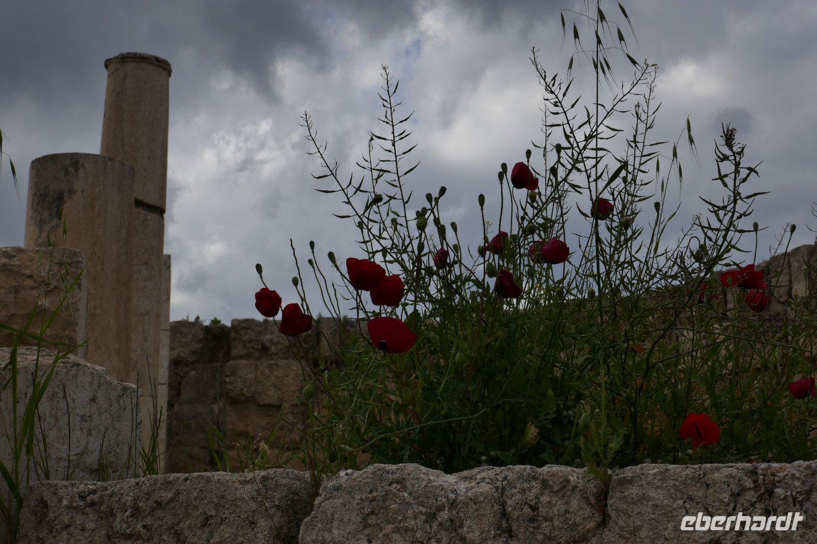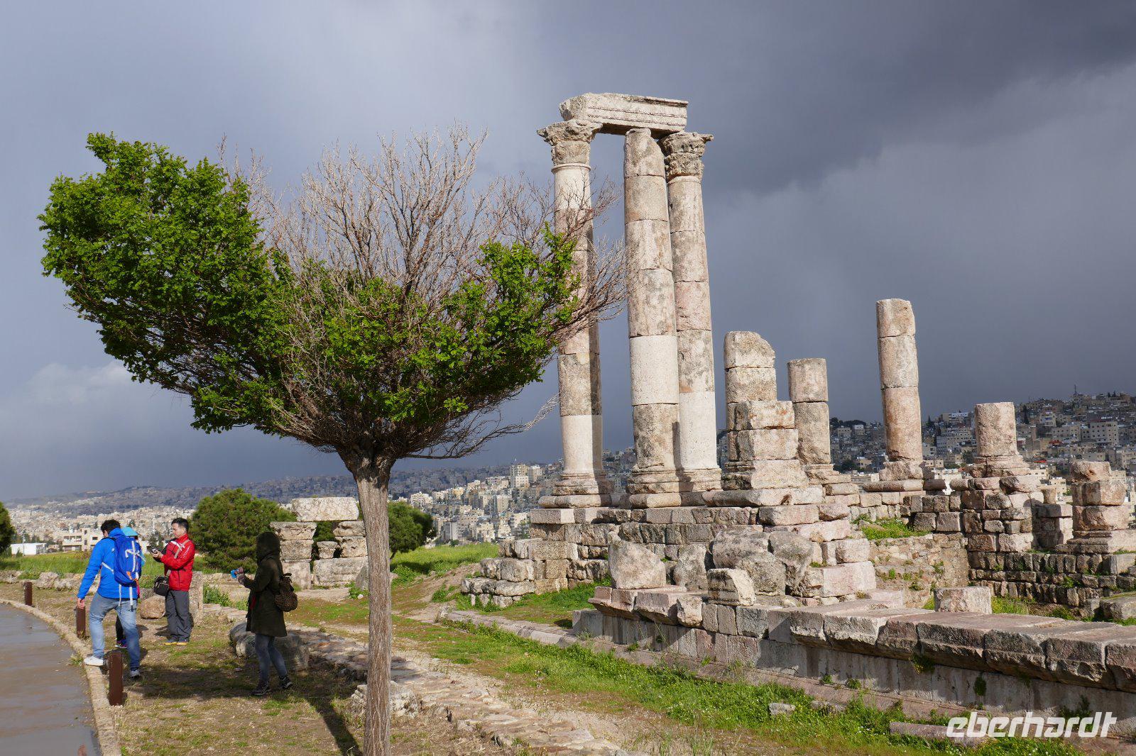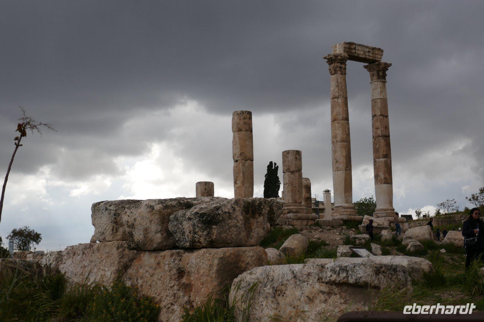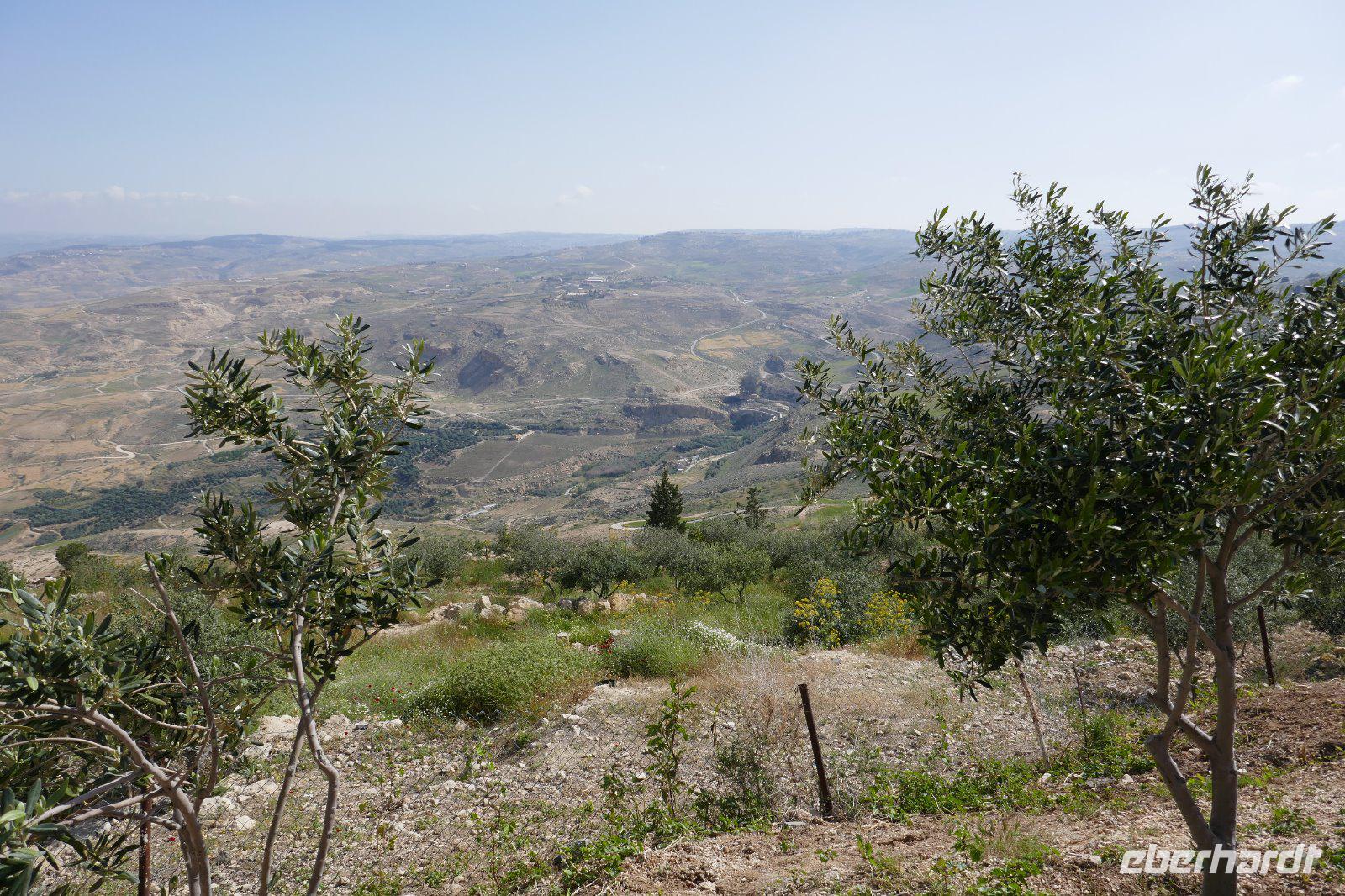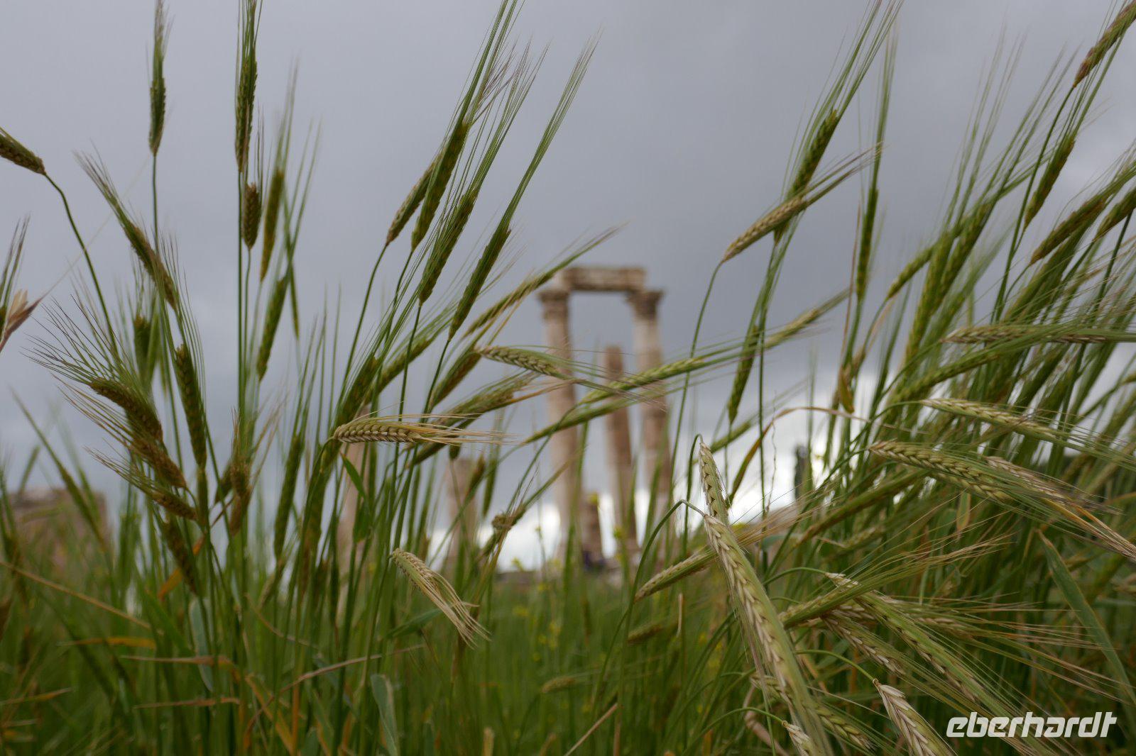 Der Weg heute führt in den Norden. Die Vegetation wurde intensiver. Oliven- u. Feigenhaine, vielfach terrassenförmig angelegt säumen unsere Wegstrecke nach Norden. Sie bilden einen schönen Kontrast zu den weißen Kalkfelsen und der rotfarbigen Erde. Nur die Minarette und der typische Baustil verraten, dass wir nicht in deutschen Mittelgebirgen oder gar in den Alpen sind. Hoch oben über Ajlun thront die in den 1930-er Jahren restaurierte Festung Qala'at ar-Rabad. Im 12. Jahrhundert errichtet war die Festung Teil einer von Sultan Saladin errichteten Festungskette. Sie gilt heute als einzige mittelalterliche Burg Jordaniens und wurde über der Ruine eines Klosters errichtet. Von hier aus hatten wir im Rahmen unserer Besichtigungstour einen wunderschönen Ausblick, den alle genossen haben. Nächstes Ziel war Jerash. das seit 6.500 Jahren ununterbrochen besiedelt ist und einst florierender Handelsplatz an der Weihrauchstraße nach Damaskus war. Die Römer haben hier eindrucksvoll ihre Spuren hinterlassen. Nicht umsonst wird es auch das „Pompeji des Ostens" genannt. Wir bummelten durch die ehemalige römische Stadt mit ihren Tempeln, Theater und Thermen. Beim Rundgang erlebten wir gepflasterte Kolonnadenstraßen, gesäumt mit zahllosen Säulen sowie weitläufig angelegte Plätze und Brunnen. Beim Schließen der Augen konnte man das Treiben der Stadt erahnen und sich der einstigen Bedeutung der Stadt noch klarer werden. Der Artemistempel mit seinen 11 Säulen kann nur von einer Stelle aus so fotografiert werden. Dazu muss man die Stelle kennen. Natürlich kannte unser Guide diese Stelle und so konnten alle ein Bild davon machen. Mit diesen Eindrücken ging es dann wieder zum Hotel zurück.