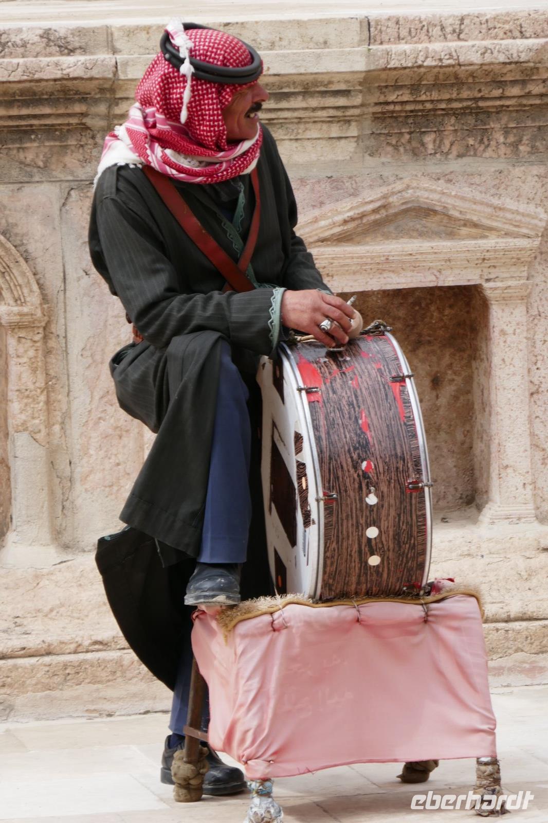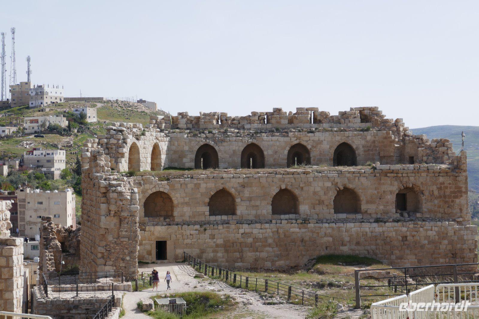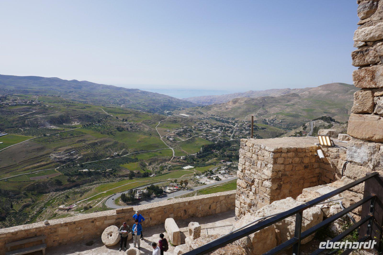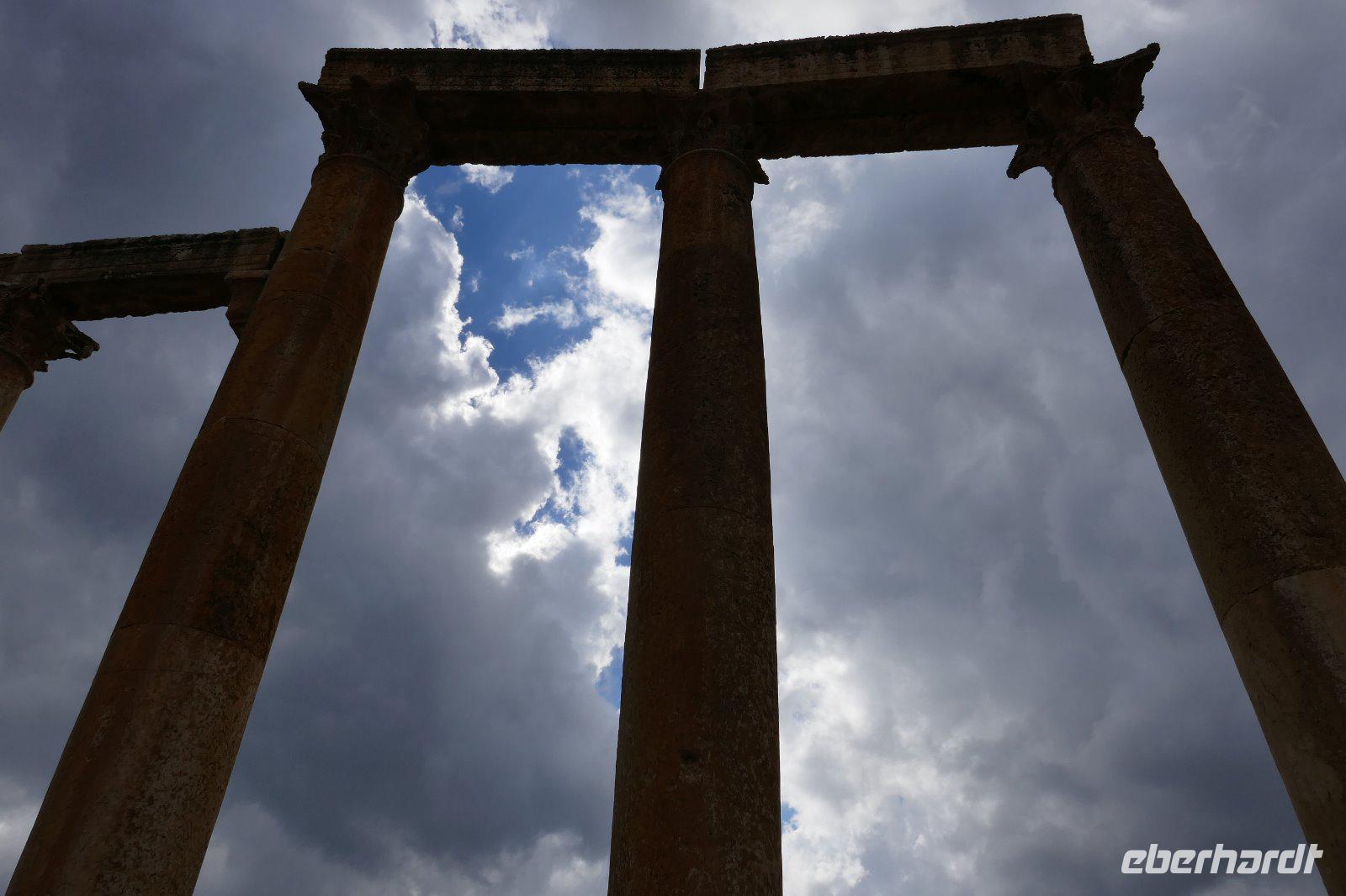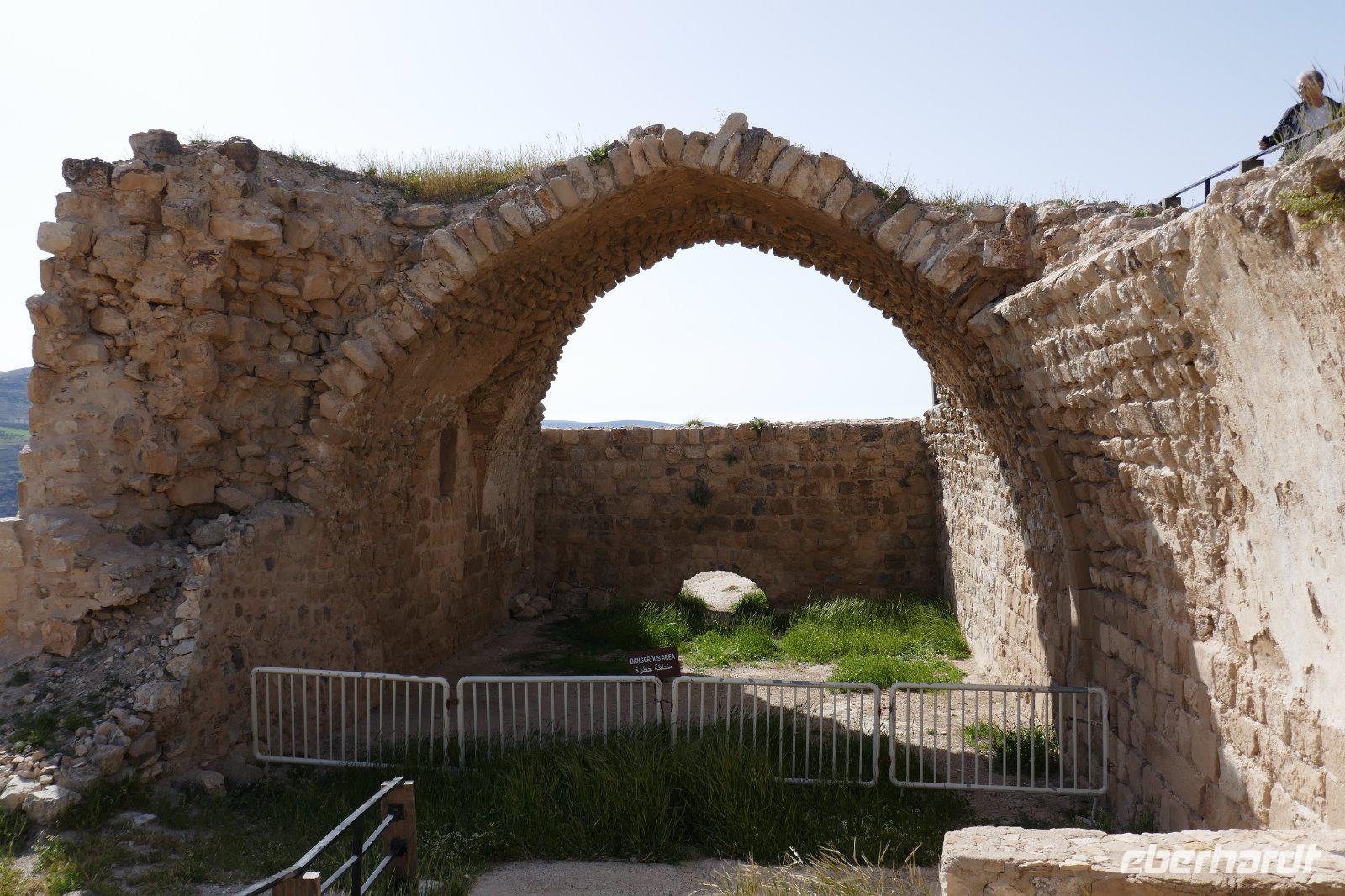 Der Weg heute führt in den Norden. Die Vegetation wurde intensiver. Oliven- u. Feigenhaine, vielfach terrassenförmig angelegt säumen unsere Wegstrecke nach Norden. Sie bilden einen schönen Kontrast zu den weißen Kalkfelsen und der rotfarbigen Erde. Nur die Minarette und der typische Baustil verraten, dass wir nicht in deutschen Mittelgebirgen oder gar in den Alpen sind. Hoch oben über Ajlun thront die in den 1930-er Jahren restaurierte Festung Qala'at ar-Rabad. Im 12. Jahrhundert errichtet war die Festung Teil einer von Sultan Saladin errichteten Festungskette. Sie gilt heute als einzige mittelalterliche Burg Jordaniens und wurde über der Ruine eines Klosters errichtet. Von hier aus hatten wir im Rahmen unserer Besichtigungstour einen wunderschönen Ausblick, den alle genossen haben. Nächstes Ziel war Jerash. das seit 6.500 Jahren ununterbrochen besiedelt ist und einst florierender Handelsplatz an der Weihrauchstraße nach Damaskus war. Die Römer haben hier eindrucksvoll ihre Spuren hinterlassen. Nicht umsonst wird es auch das „Pompeji des Ostens" genannt. Wir bummelten durch die ehemalige römische Stadt mit ihren Tempeln, Theater und Thermen. Beim Rundgang erlebten wir gepflasterte Kolonnadenstraßen, gesäumt mit zahllosen Säulen sowie weitläufig angelegte Plätze und Brunnen. Beim Schließen der Augen konnte man das Treiben der Stadt erahnen und sich der einstigen Bedeutung der Stadt noch klarer werden. Der Artemistempel mit seinen 11 Säulen kann nur von einer Stelle aus so fotografiert werden. Dazu muss man die Stelle kennen. Natürlich kannte unser Guide diese Stelle und so konnten alle ein Bild davon machen. Mit diesen Eindrücken ging es dann wieder zum Hotel zurück.