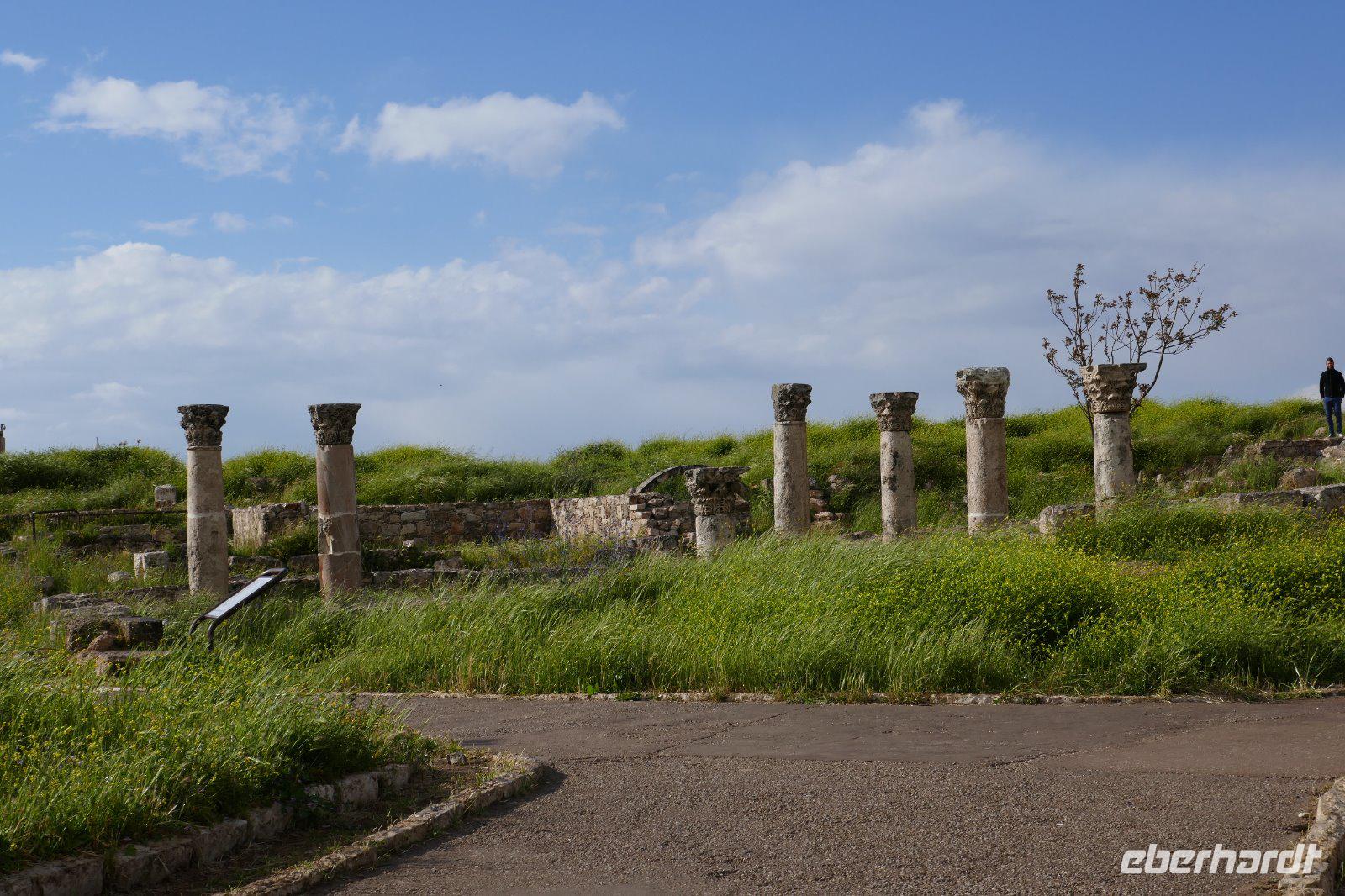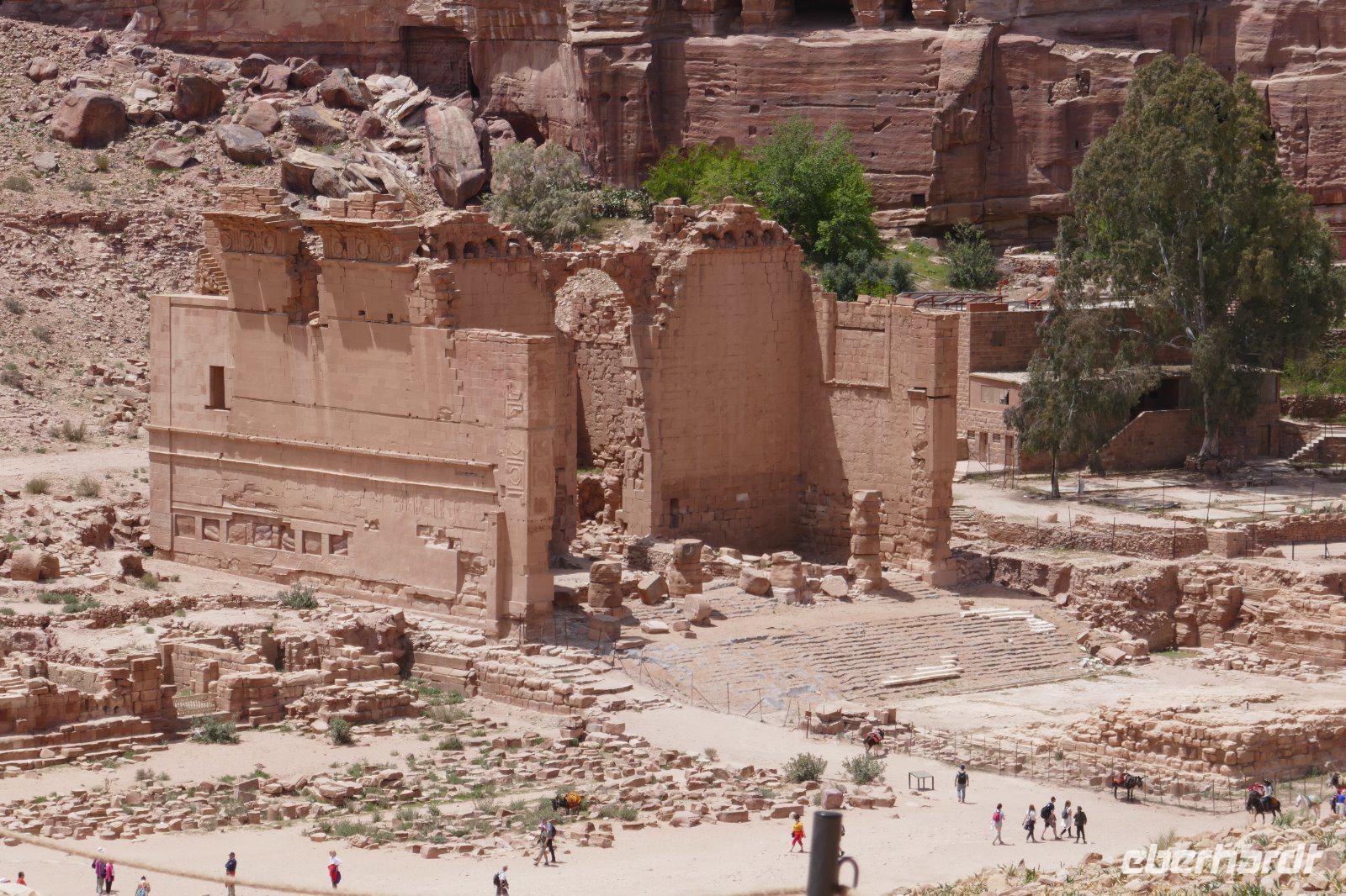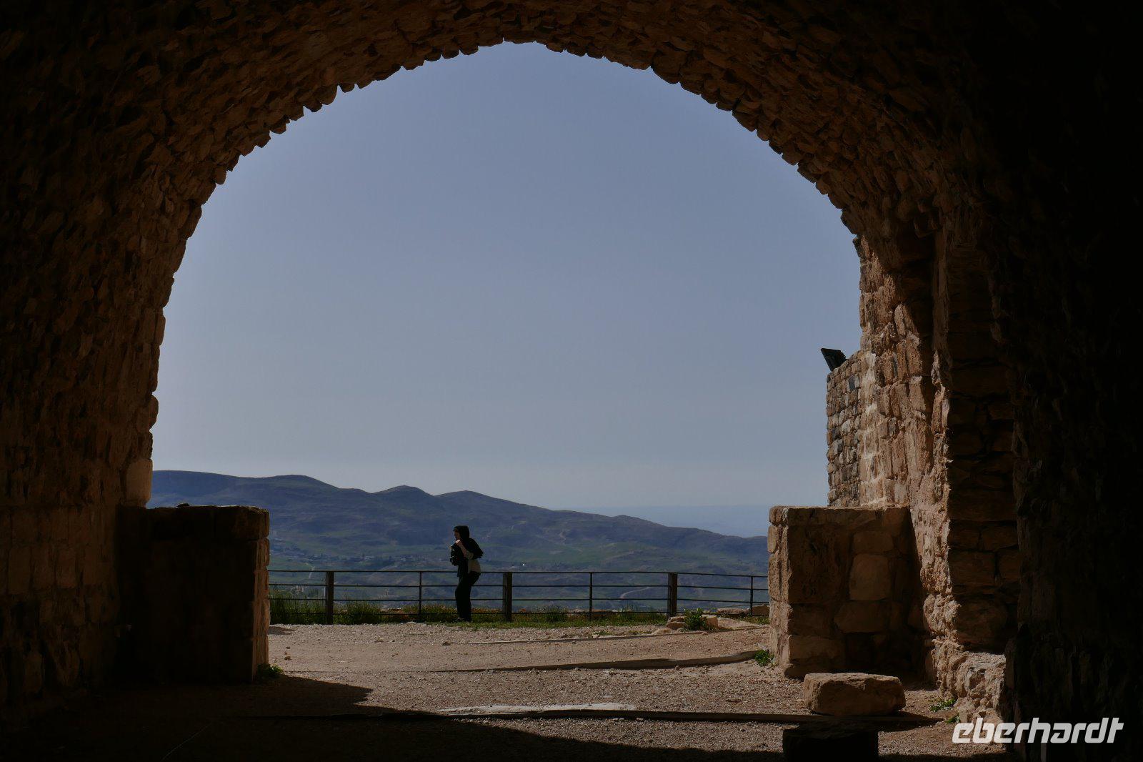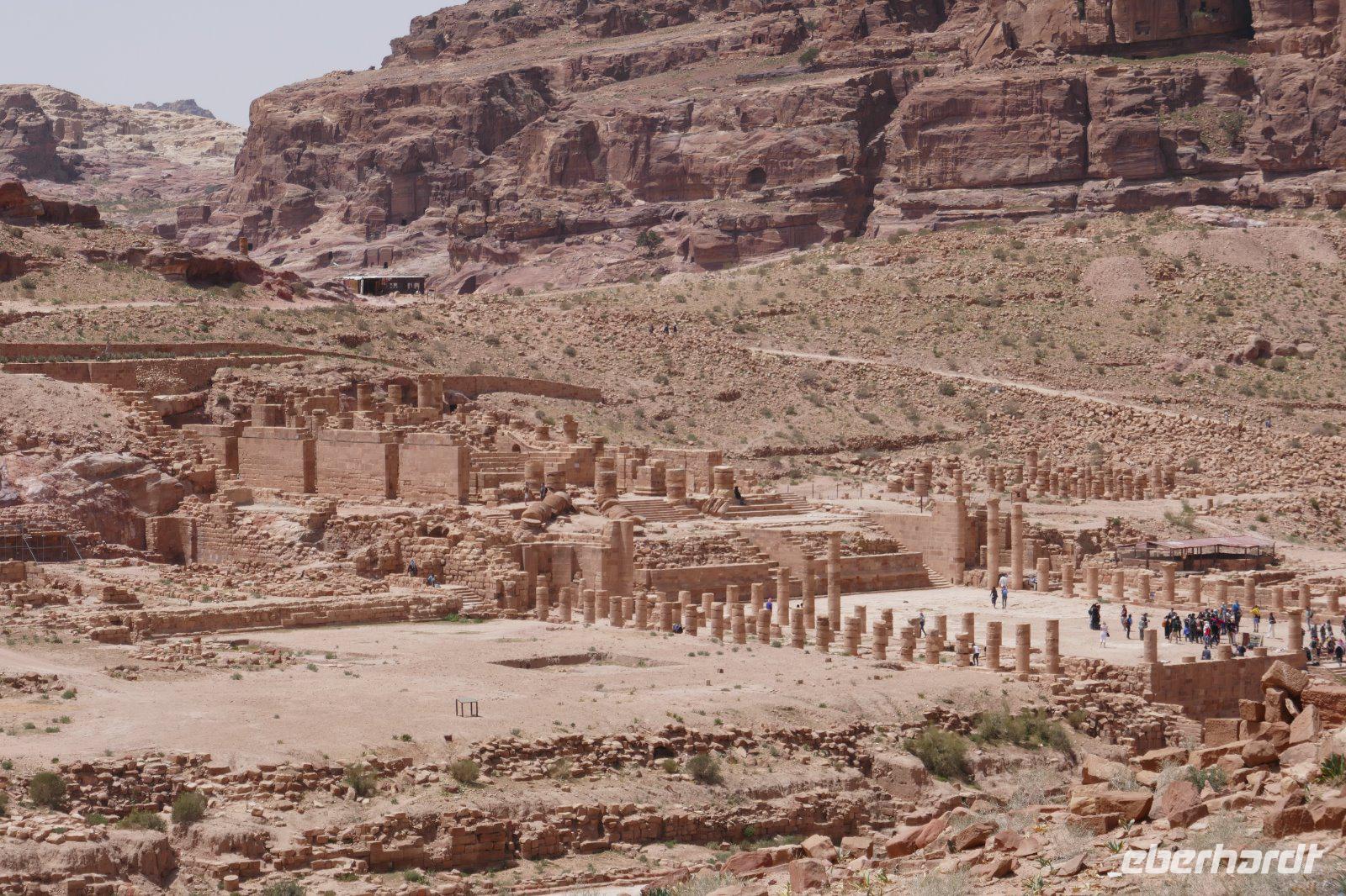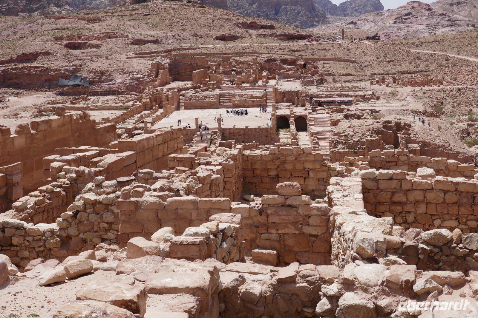 Der Weg heute führt in den Norden. Die Vegetation wurde intensiver. Oliven- u. Feigenhaine, vielfach terrassenförmig angelegt säumen unsere Wegstrecke nach Norden. Sie bilden einen schönen Kontrast zu den weißen Kalkfelsen und der rotfarbigen Erde. Nur die Minarette und der typische Baustil verraten, dass wir nicht in deutschen Mittelgebirgen oder gar in den Alpen sind. Hoch oben über Ajlun thront die in den 1930-er Jahren restaurierte Festung Qala'at ar-Rabad. Im 12. Jahrhundert errichtet war die Festung Teil einer von Sultan Saladin errichteten Festungskette. Sie gilt heute als einzige mittelalterliche Burg Jordaniens und wurde über der Ruine eines Klosters errichtet. Von hier aus hatten wir im Rahmen unserer Besichtigungstour einen wunderschönen Ausblick, den alle genossen haben. Nächstes Ziel war Jerash. das seit 6.500 Jahren ununterbrochen besiedelt ist und einst florierender Handelsplatz an der Weihrauchstraße nach Damaskus war. Die Römer haben hier eindrucksvoll ihre Spuren hinterlassen. Nicht umsonst wird es auch das „Pompeji des Ostens" genannt. Wir bummelten durch die ehemalige römische Stadt mit ihren Tempeln, Theater und Thermen. Beim Rundgang erlebten wir gepflasterte Kolonnadenstraßen, gesäumt mit zahllosen Säulen sowie weitläufig angelegte Plätze und Brunnen. Beim Schließen der Augen konnte man das Treiben der Stadt erahnen und sich der einstigen Bedeutung der Stadt noch klarer werden. Der Artemistempel mit seinen 11 Säulen kann nur von einer Stelle aus so fotografiert werden. Dazu muss man die Stelle kennen. Natürlich kannte unser Guide diese Stelle und so konnten alle ein Bild davon machen. Mit diesen Eindrücken ging es dann wieder zum Hotel zurück.
