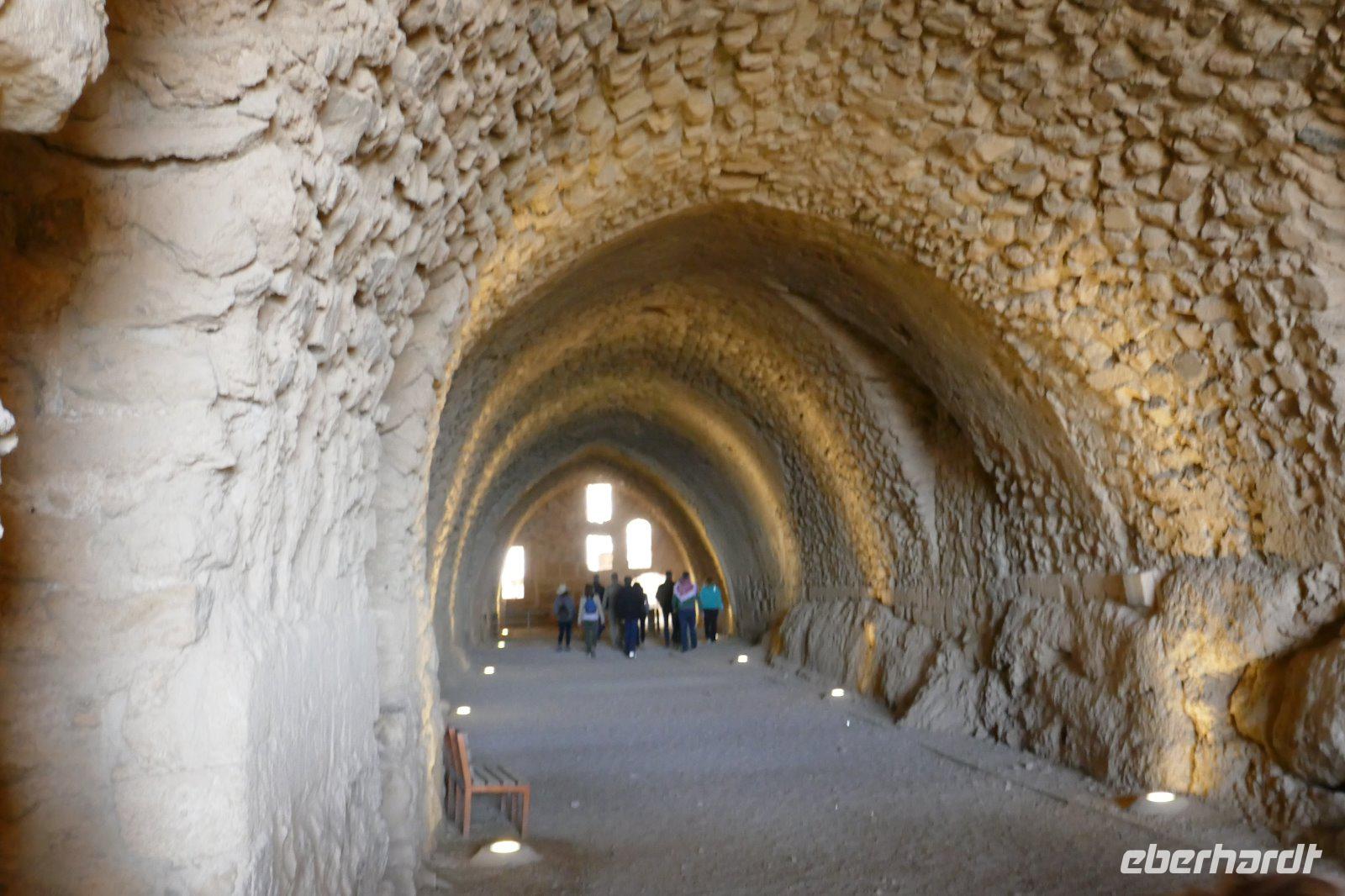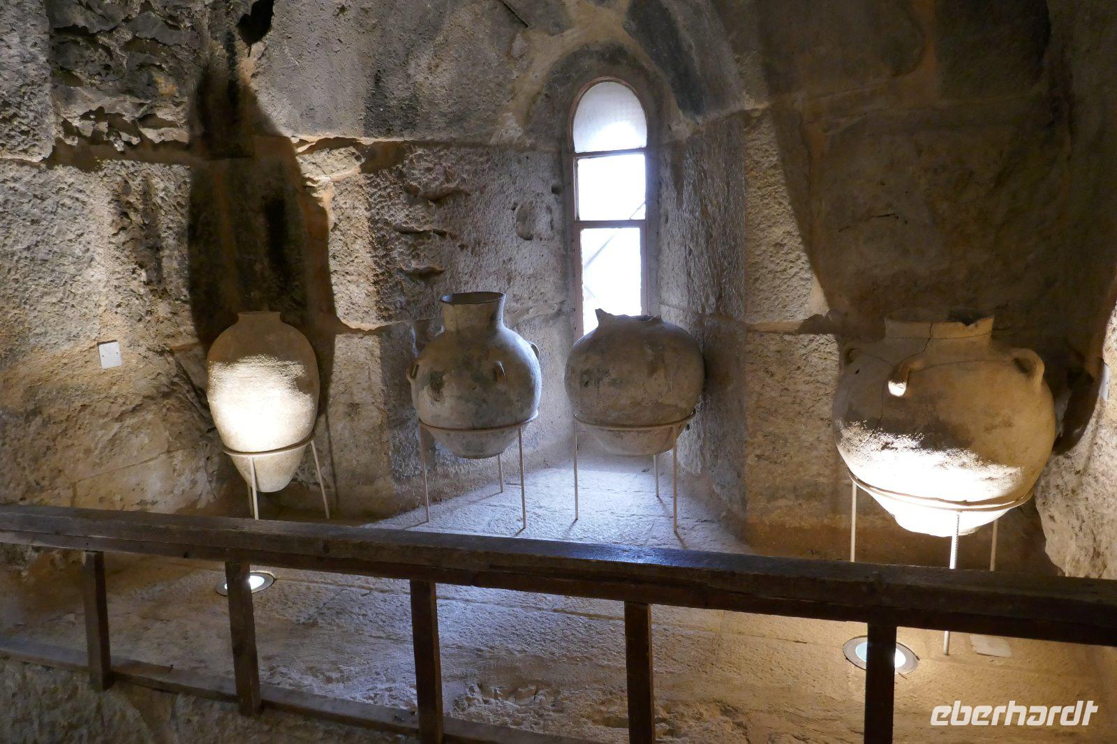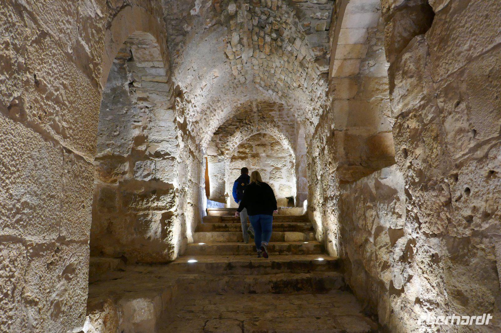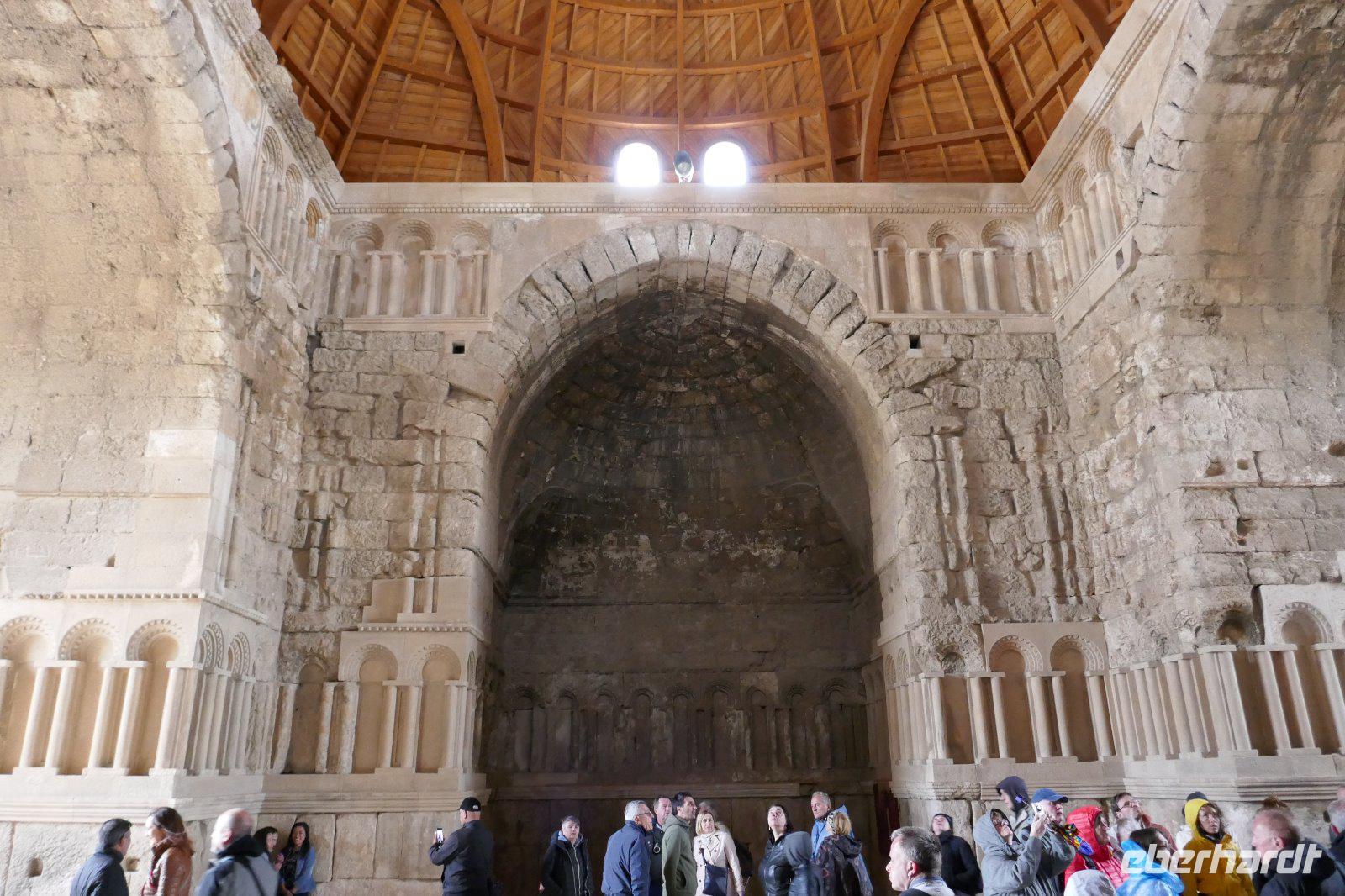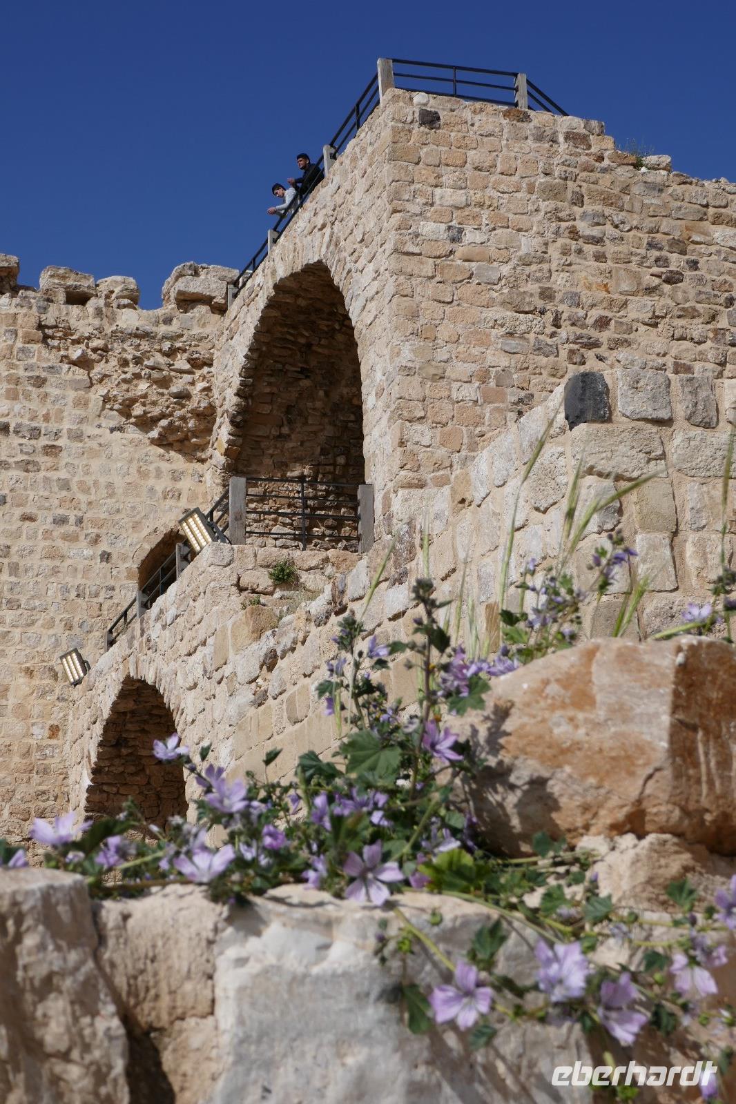 Der Weg heute führt in den Norden. Die Vegetation wurde intensiver. Oliven- u. Feigenhaine, vielfach terrassenförmig angelegt säumen unsere Wegstrecke nach Norden. Sie bilden einen schönen Kontrast zu den weißen Kalkfelsen und der rotfarbigen Erde. Nur die Minarette und der typische Baustil verraten, dass wir nicht in deutschen Mittelgebirgen oder gar in den Alpen sind. Hoch oben über Ajlun thront die in den 1930-er Jahren restaurierte Festung Qala'at ar-Rabad. Im 12. Jahrhundert errichtet war die Festung Teil einer von Sultan Saladin errichteten Festungskette. Sie gilt heute als einzige mittelalterliche Burg Jordaniens und wurde über der Ruine eines Klosters errichtet. Von hier aus hatten wir im Rahmen unserer Besichtigungstour einen wunderschönen Ausblick, den alle genossen haben. Nächstes Ziel war Jerash. das seit 6.500 Jahren ununterbrochen besiedelt ist und einst florierender Handelsplatz an der Weihrauchstraße nach Damaskus war. Die Römer haben hier eindrucksvoll ihre Spuren hinterlassen. Nicht umsonst wird es auch das „Pompeji des Ostens" genannt. Wir bummelten durch die ehemalige römische Stadt mit ihren Tempeln, Theater und Thermen. Beim Rundgang erlebten wir gepflasterte Kolonnadenstraßen, gesäumt mit zahllosen Säulen sowie weitläufig angelegte Plätze und Brunnen. Beim Schließen der Augen konnte man das Treiben der Stadt erahnen und sich der einstigen Bedeutung der Stadt noch klarer werden. Der Artemistempel mit seinen 11 Säulen kann nur von einer Stelle aus so fotografiert werden. Dazu muss man die Stelle kennen. Natürlich kannte unser Guide diese Stelle und so konnten alle ein Bild davon machen. Mit diesen Eindrücken ging es dann wieder zum Hotel zurück.