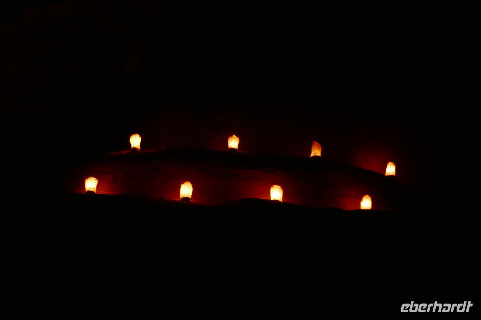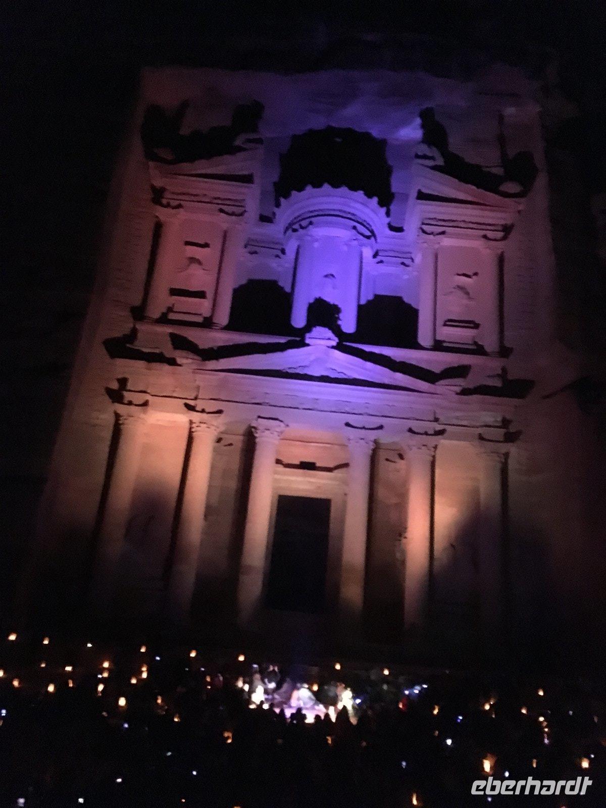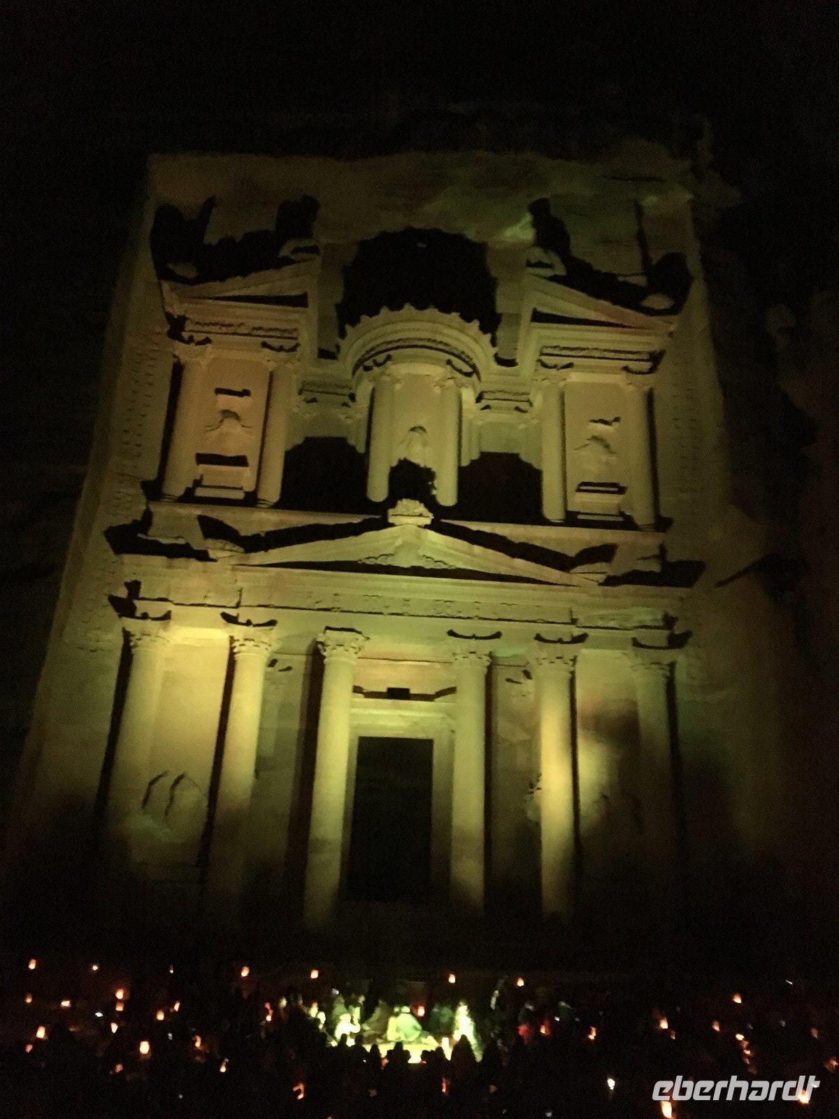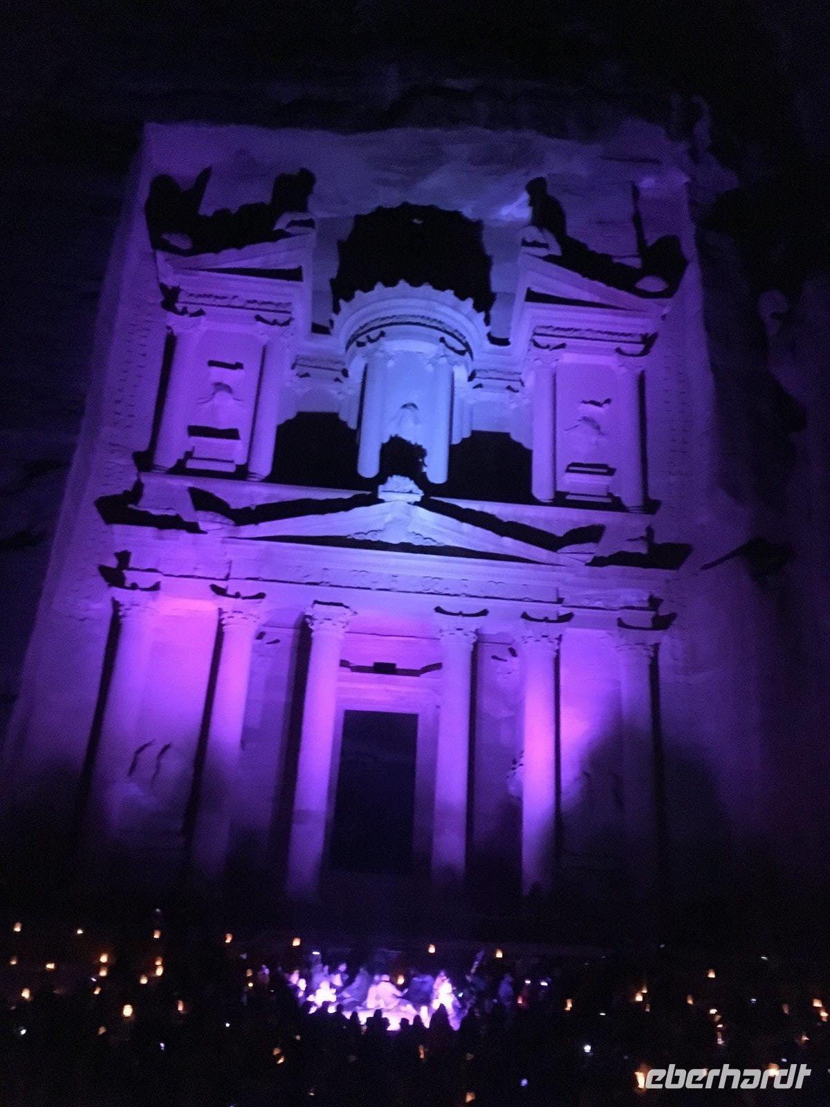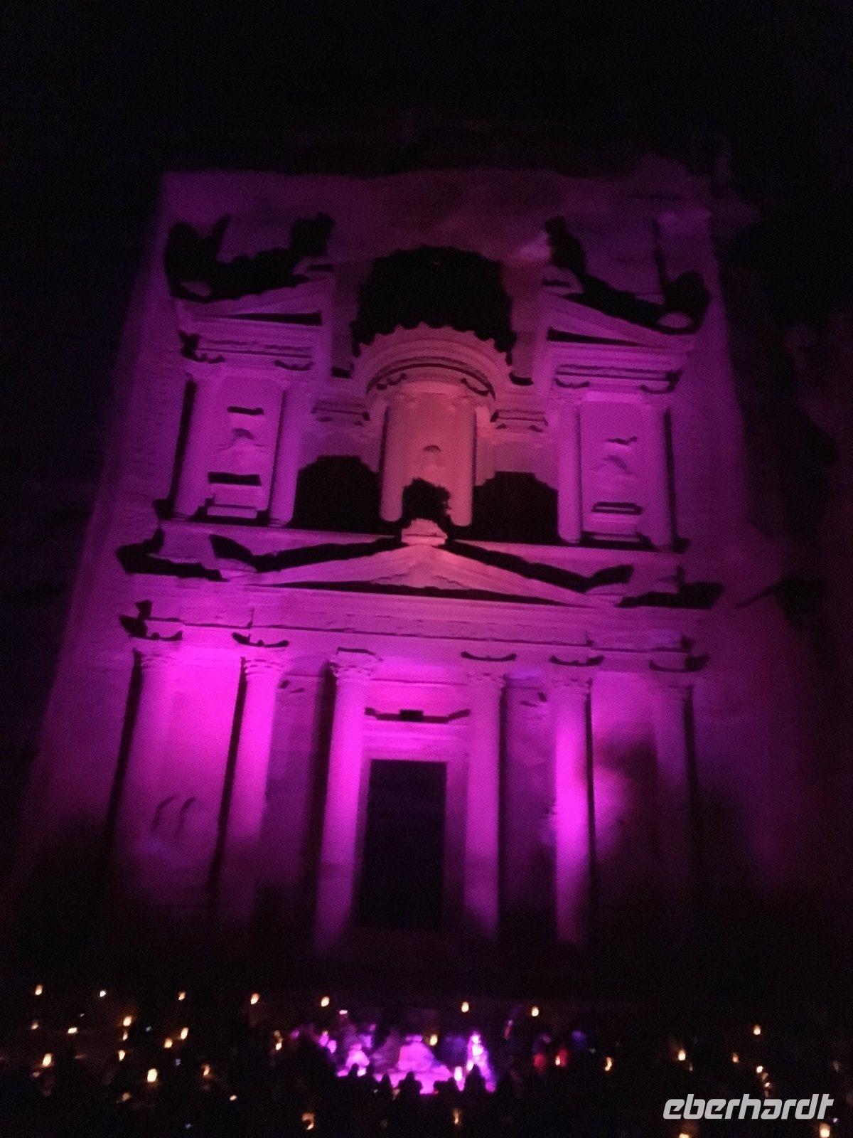 Im Vorfeld hast du ein Bild vor Augen wie es vielleicht dort aussehen könnte. Doch als wir dann vor Ort waren, sah alles ganz anders aus und noch viel eindrucksvoller. Man muss es wirklich gesehen haben um die unglaubliche Schönheit dieses Ortes wirklich fassen zu können. Kein Wunder also, dass es von der UNESCO als das achte Weltwunder bezeichnet wird, obwohl erst ein Bruchteil (10 %) ausgegraben wurde. Auf den Spuren Indiana Jones wollten wir Petra entdecken, auch wenn dazu ein Tag nicht ausreicht. Wir konzentrierten uns auf das wesentlich und durch die Schlucht Siq ging es zum Schatzhaus des Pharaos, das eigentlich ein Grabtempel war. Vielen ist dieser Ort bekannt aus dem Film „Indiana Jones und der letzte Kreuzzug", in dem die Fassade des Schatzhauses zu sehen war. Staunend verharrten wir hier und genossen den Anblick, der einem Postkartenmotiv gleich kam. Auf unserem weiteren Weg kamen wir an unzähligen weiteren Gräbern, Palästen und Theater vorbei. Immer wieder verändern sich durch das Licht die Farbnuancen, die die Gebäude in ein fast magisches Licht rückten. Auch die Felsen boten interessante Farbenspiele. Am Abend erlebten wir die Schatzkammer im Licht von tausenden von Kerzen. Dazu passende Musik und Tee - so klang dieser erlebnisreiche Tag aus.