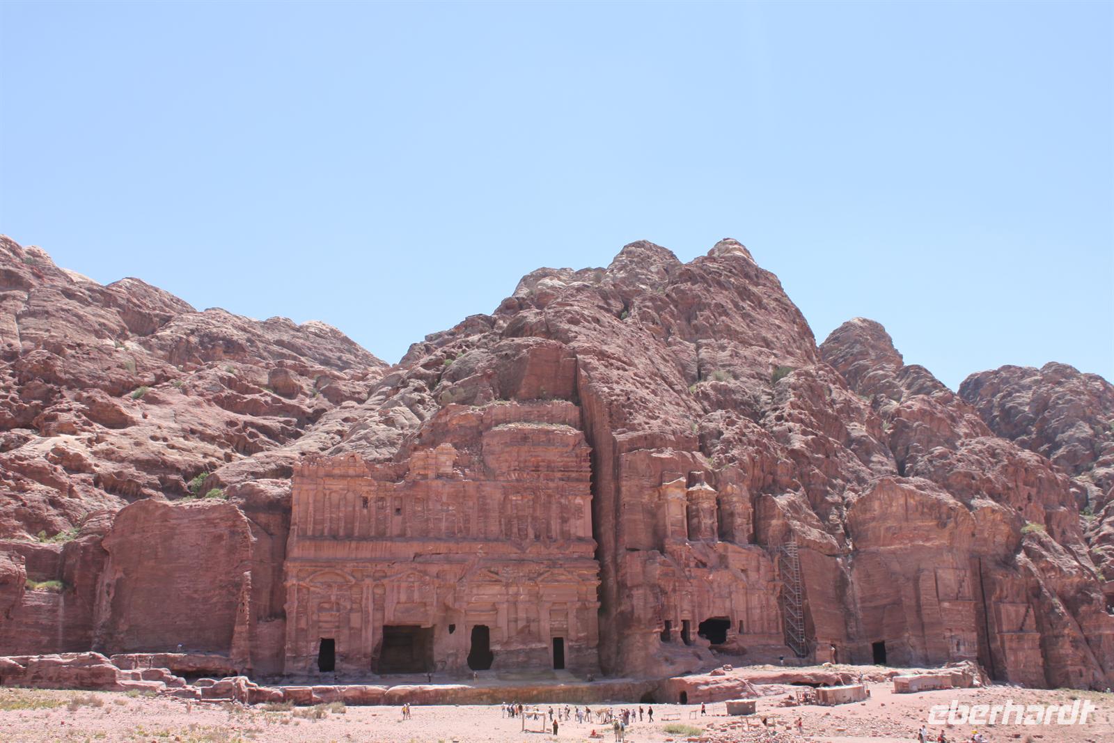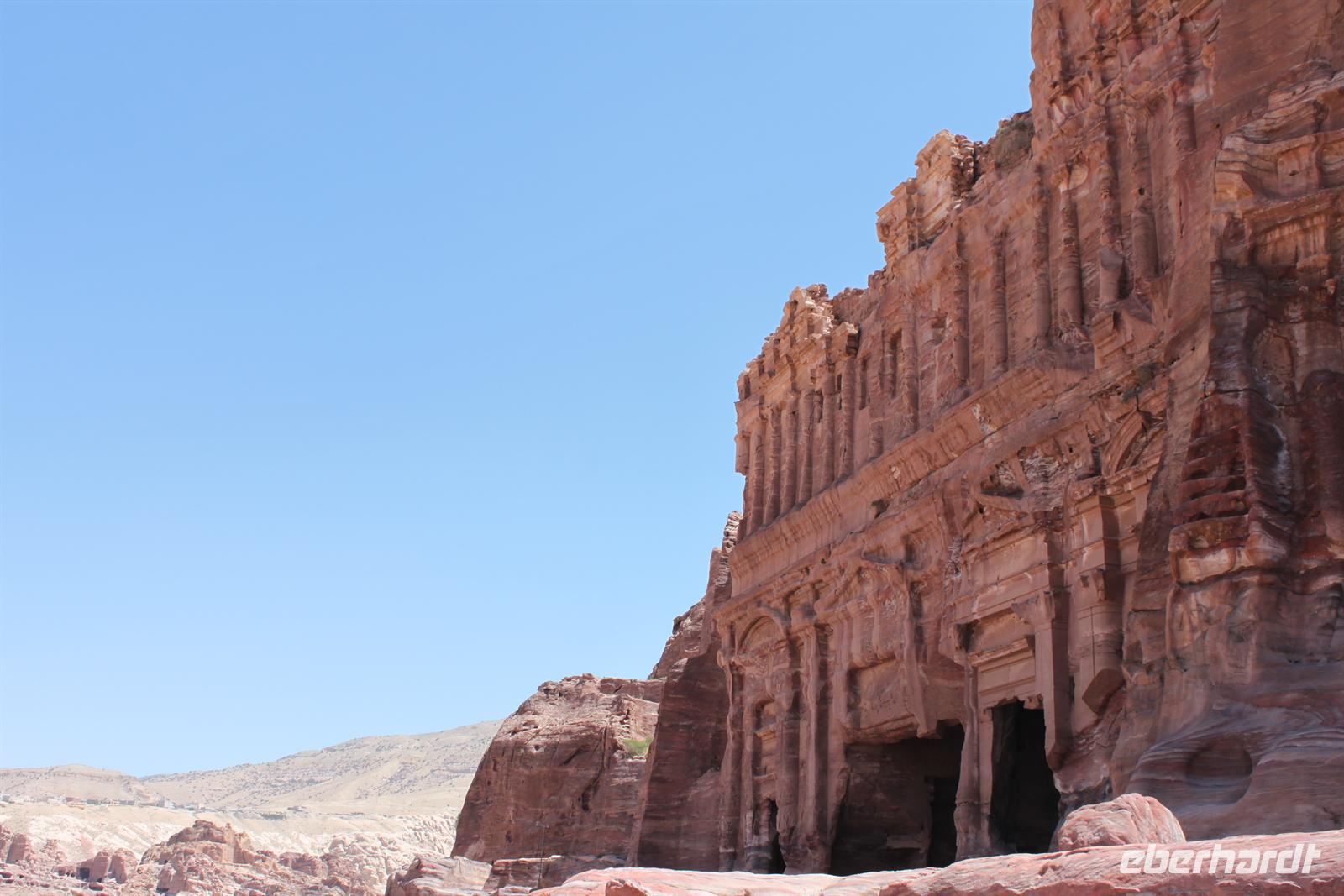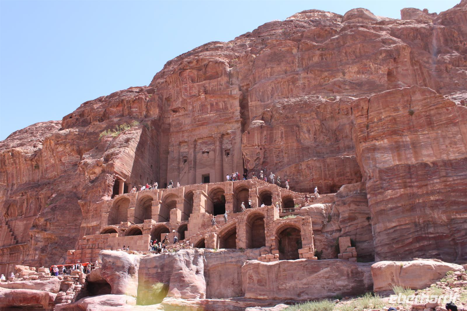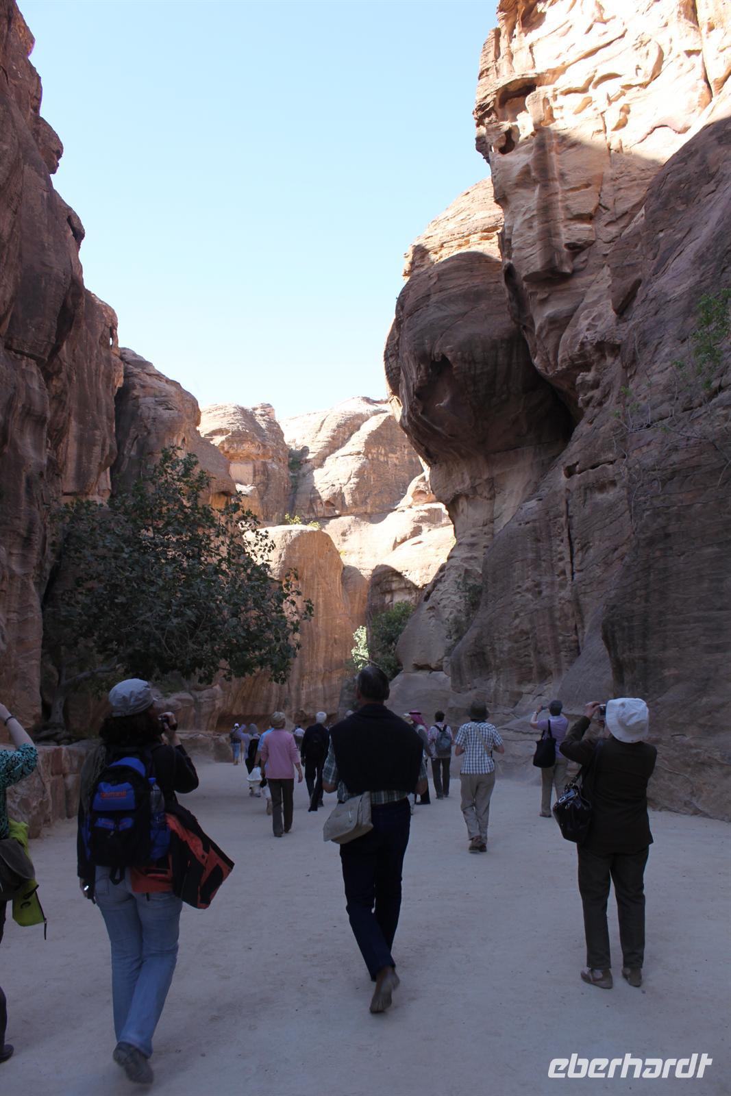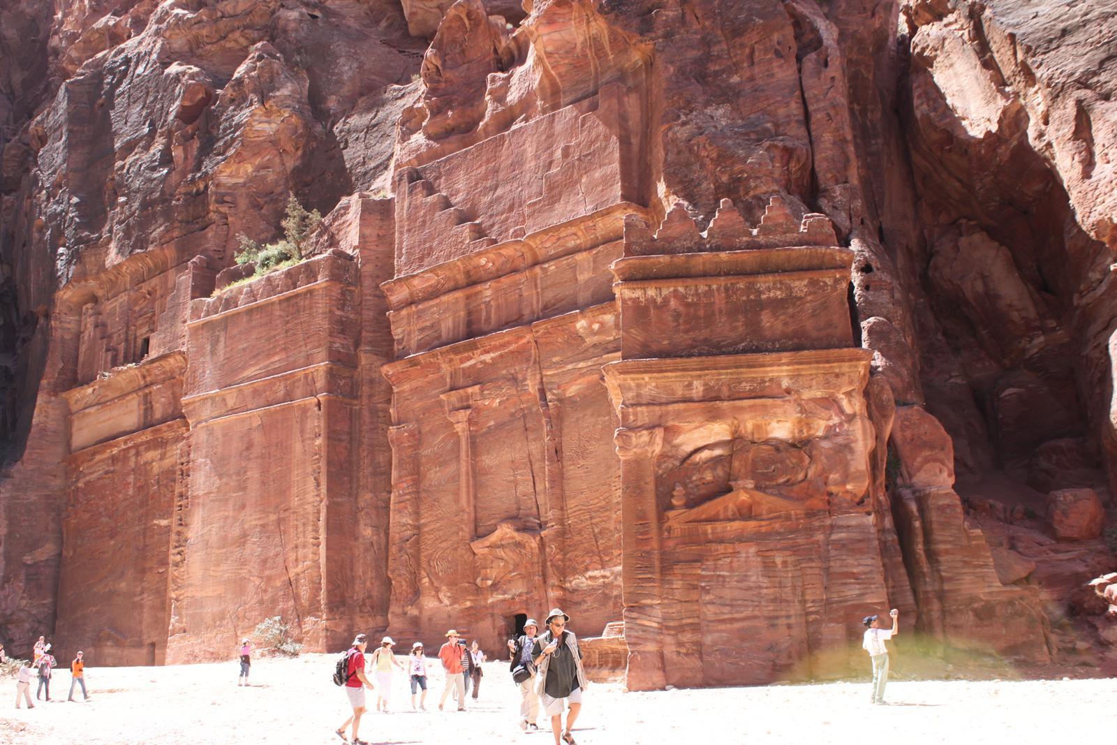 Am nächsten Tag war es schließlich soweit. Gleich am Morgen fuhren wir die kurze Strecke nach Petra und machten uns auf Entdeckungstour. Der Weg durch das Eingangstal, den sogenannten Sik, kam dem ein oder anderem am ersten Tag noch etwas lang vor. Spätestens aber in Anbetracht des Schatzhauses schienen alle Mühen des Fußmarsches belohnt. Es folgte eine sehr ausführliche Wanderung - natürlich gemeinsam mit Mahmoud, der wirklich immer bei der Gruppe war. Wir lernten die Hauptsehenswürdigkeiten Petras kennen und legten eine Strecke von mindestens 10 Kilometer zurück. An dieser Stelle möchte ich als Reisebegleiterin noch einmal ausdrücklich ein Lob an alle meine Gäste aussprechen, die diese Etappe trotz der großen Hitze gemeistert haben. Gelohnt hat es sich allemal! Am nächsten Tag nutzten 13 Gäste die Möglichkeit, Petra gemeinsam mit Mahmoud und mir zu erkunden. Ein Teil unserer Gruppe ging mit Mahmoud auf den Opferberg und drei weitere Gäste machtern sich mit mir auf den Weg zum Kloster Ed Deir. Ohne Ausnahme war es für jeden ein unvergleichlich schöner Tag. Wer im Hotel blieb konnte sich stundenlang am Pool entspannen, spazieren gehen oder einfach mal „nur“ ein Buch lesen.