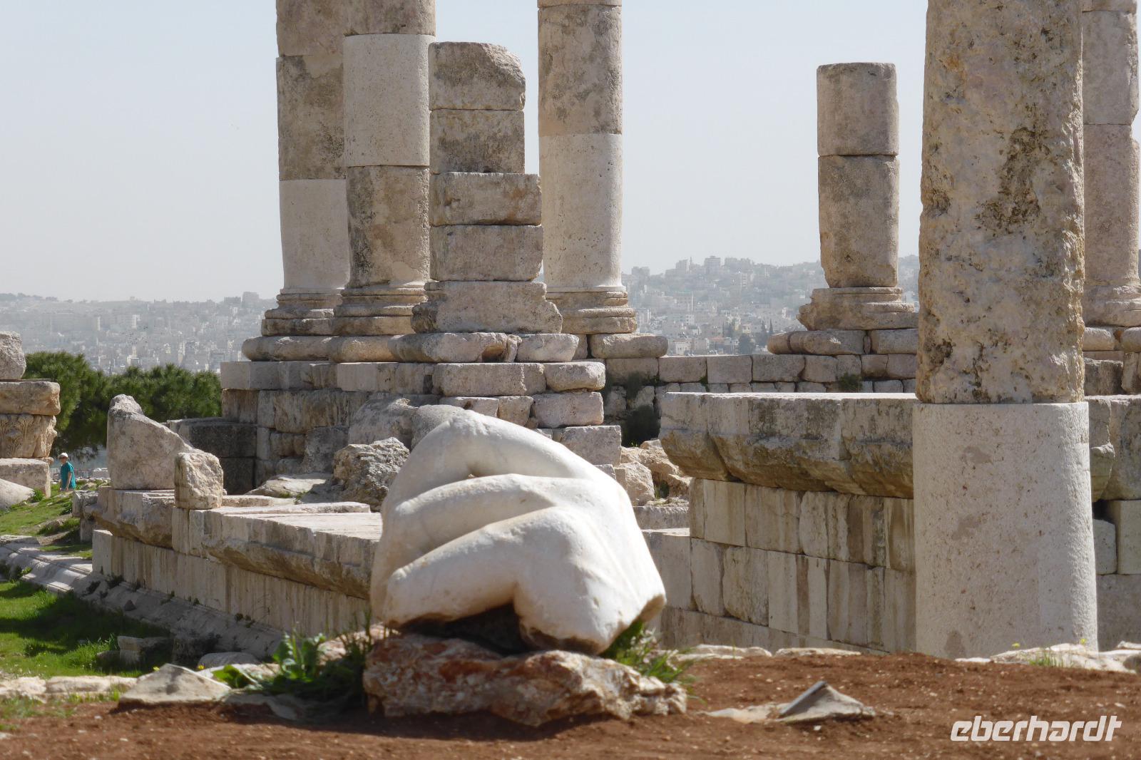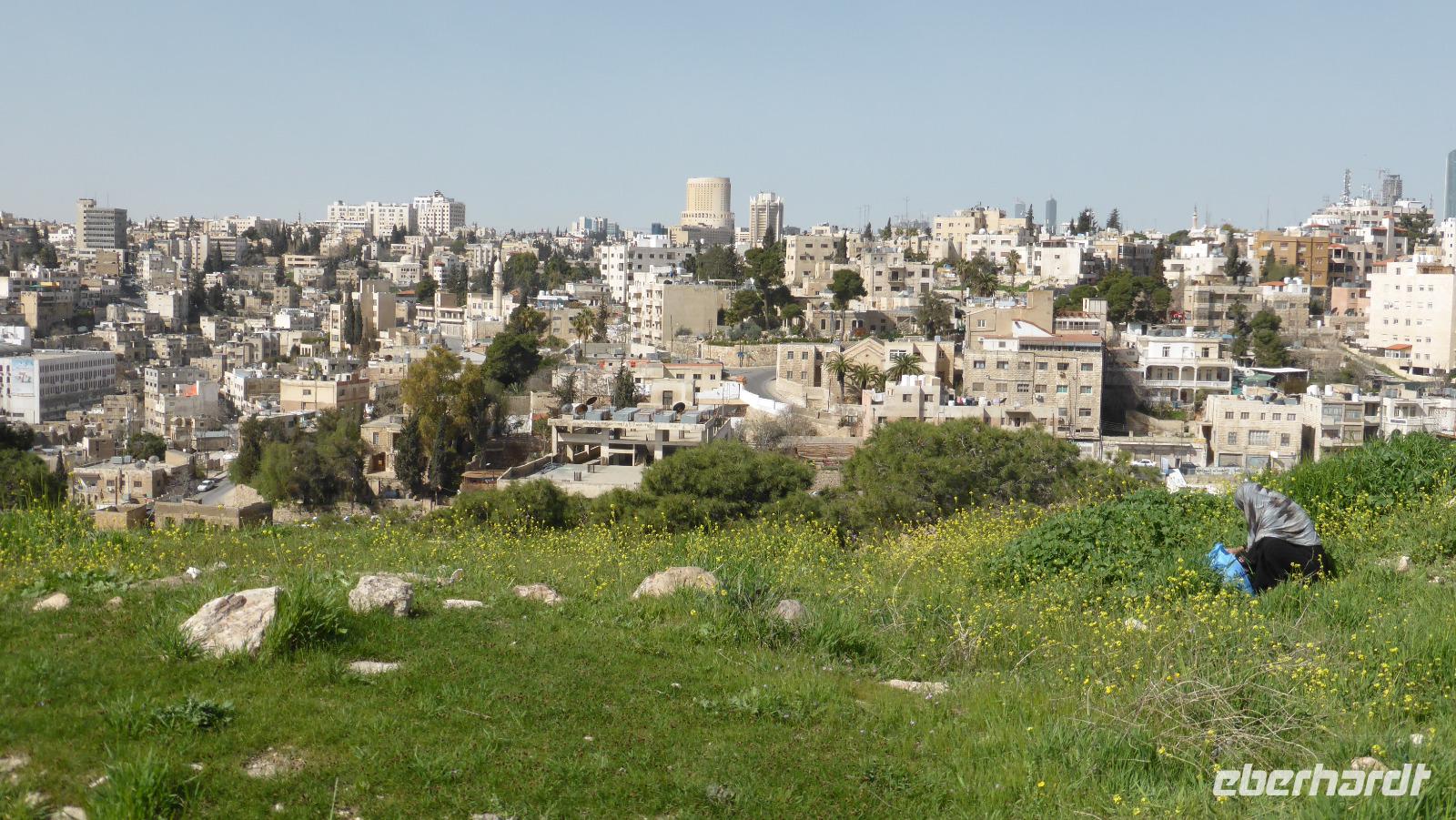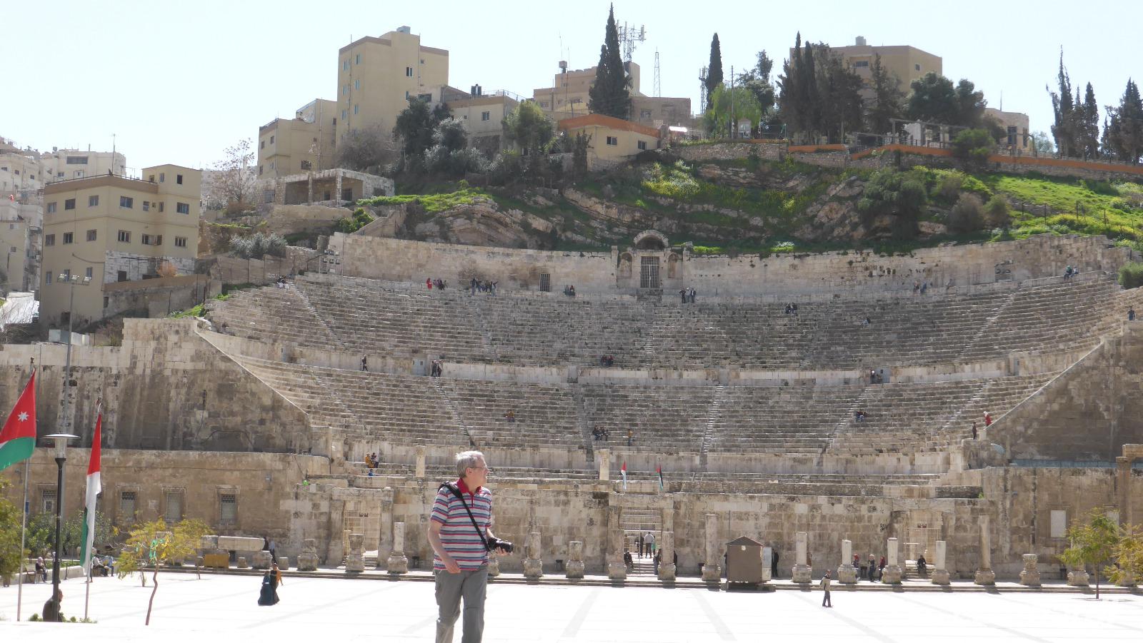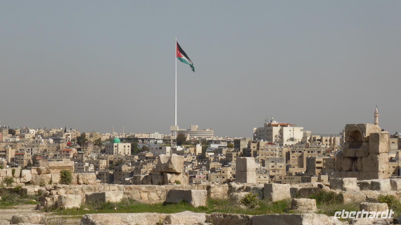 Wir halten an der Zitadelle, einem Hügel, der schon in der Antike besiedelt war, als Amman noch Philadelphia hieß. Bei Sonnenschein und frühlingshaften Temperaturen haben wir von hier einen schönen Rundumblick auf die rund 800 Meter hoch gelegene Stadt. Wir können von hier das Römische Theater, die sogenannte Blaue Moschee und die riesige Staatsflagge sehen. Die Flagge an dem 126 Meter hohen Mast soll 60 Meter breit sein.