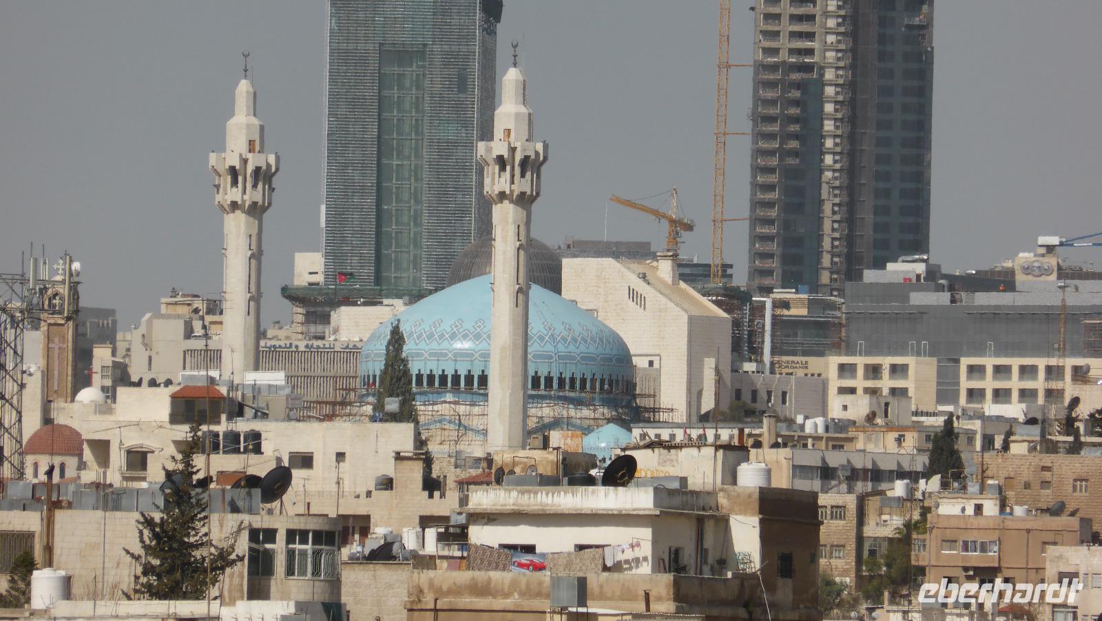Mit Mahmoud und Jehad, unserem Busfahrer, beginnen wir heute Morgen unsere Stadtrundfahrt durch die jordanische Hauptstadt. Durch die Vororte und Wohnviertel mit schönen teuren Villen fahren wir Richtung Innenstadt. Unterwegs weißt uns Mahmoud zwischenzeitlich auf ein strenges Fotografierverbot hin - es betrifft die „Festung" US-Botschaft, an der wir vorbeikommen.