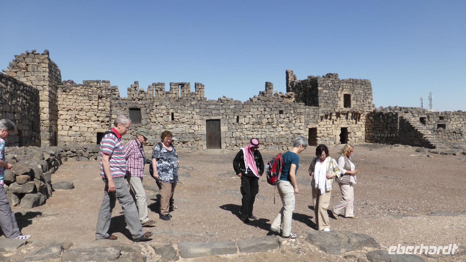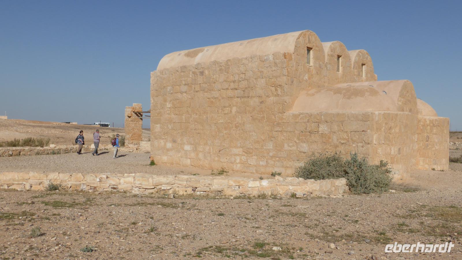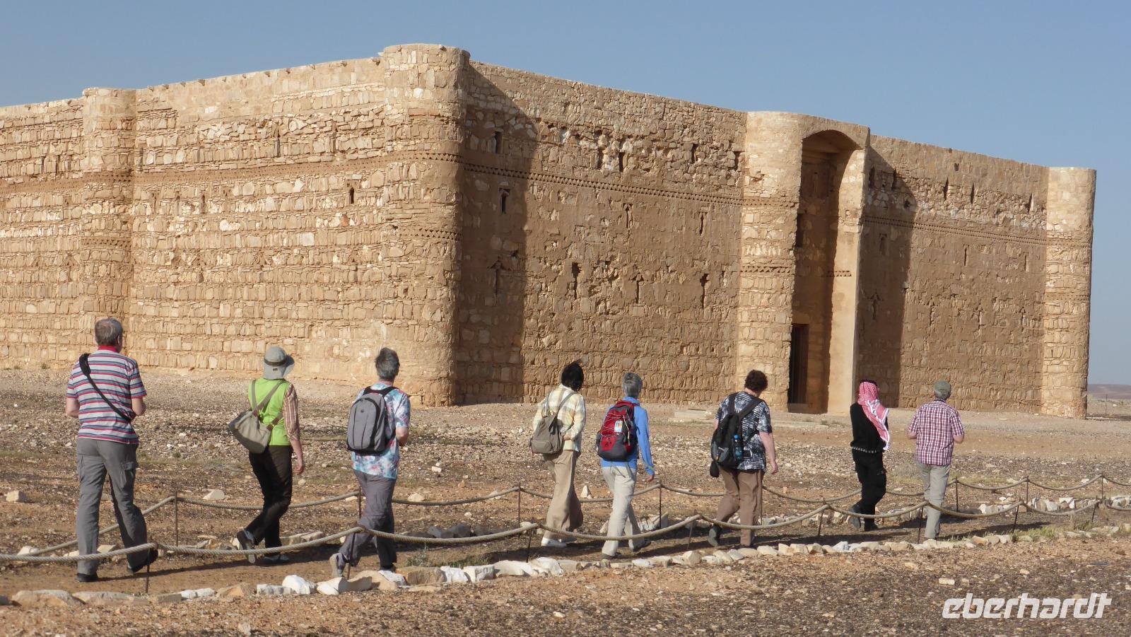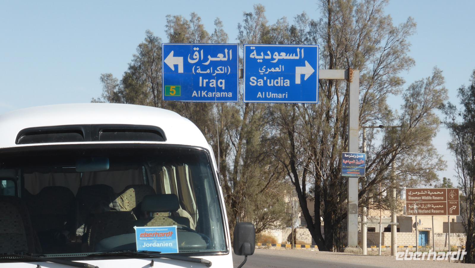 Nachdem wir uns in einer Wechselstube mit Jordanischen Dinar eingedeckt haben, halten wir kurz am Römischen Theater, dann verlassen wir Amman. Mahmoud berichtet, wie viele Flüchtlinge sein Land in den letzten Jahren aus den Nachbarländern aufgenommen hat. Nachdenklich werde ich, als wir an einem riesigen Flüchtlingslager in der Wüste vorbeifahren. ...wie gut es uns doch geht...und es ist richtig, dass wir nach Jordanien kommen, das Land braucht den Tourismus. In der Oasenstadt Al Azraq („die Blaue") besichtigen wir die Festung aus Basaltstein und machen eine Mittagspause. Der Ort selbst liegt an den Fernstraßen nach Saudi Arabien und in den Irak - ein entsprechendes Verkehrsschild wird für uns zum begehrten Fotomotiv. Für die Rückfahrt nach Amman nehmen wir eine andere Route, damit wir die sogenannten Wüstenschlösser Qasr al Amra (mit sehr schönen Malereien in der Thronhalle) sowie Al Kherana besichtigen können. Zusammen mit der Festung in Al Azraq erlebten diese „Schlösser" ihre Blütezeit unter den Umayyaden (arabisch-islamische Dynastie bis 750 u. Z. mit Sitz in Damaskus).