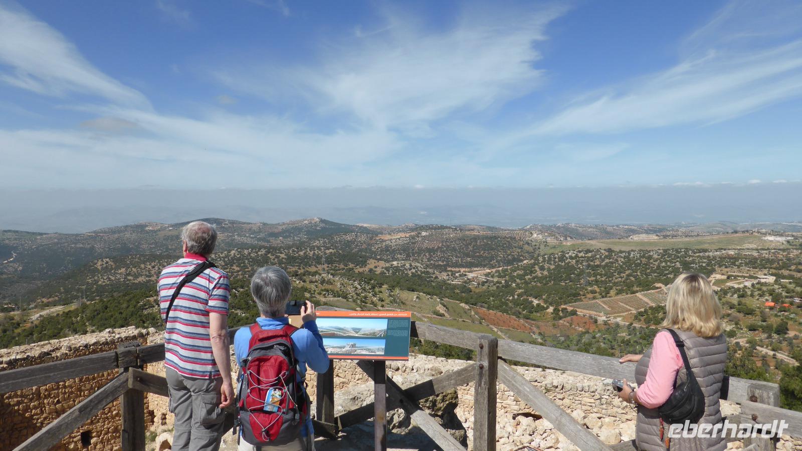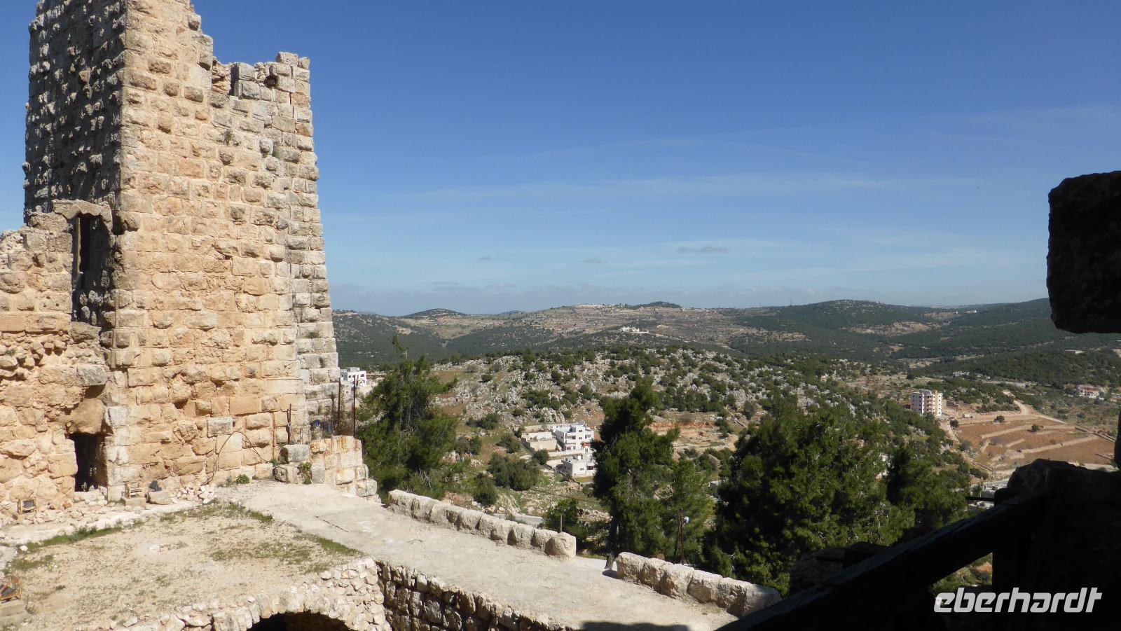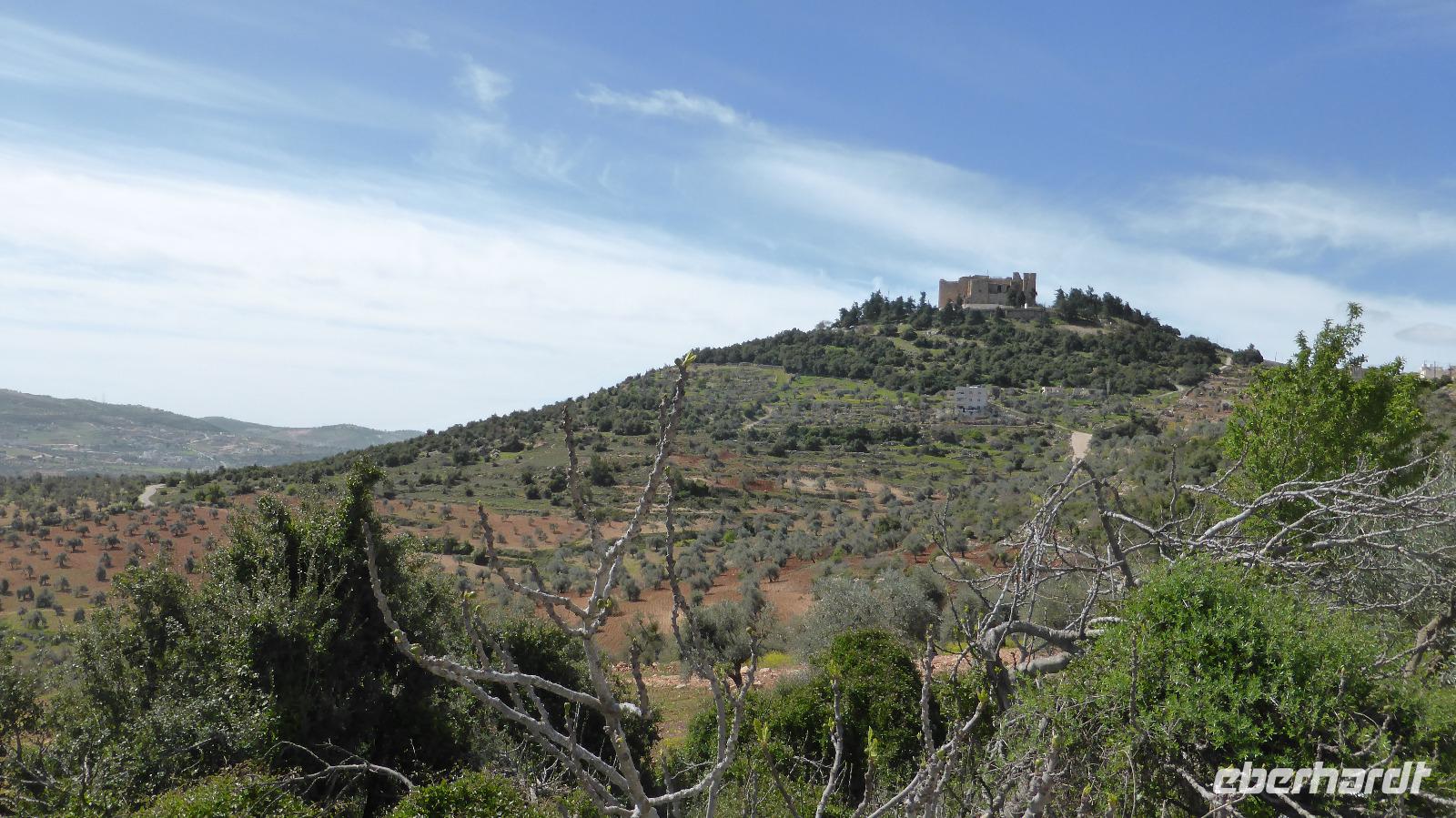 Am Morgen verlassen wir Amman in Richtung Norden in ein erstaunlich grünes Hügelland mit Pinienwäldern, grünen Wiesen und Feldern. Es ist wieder ein schöner Frühlingstag. Unser erstes Ziel heute ist der Ort Ajlub in 1.100 Meter Höhe gelegen. Im Souvenirshop erhalten wir einen Kaffee mit Kardamom, dann geht´s hinauf auf die Burg Qalaat ar Rabad aus Saladins Zeiten. Im 12. Jahrhundert war die Burg Teil des arabischen Widerstandes gegen die Kreuzritter. Vom Burgdach haben wir einen fantastischen Ausblick bis ins Jordantal, zum Toten Meer und auf das besetzte Westjordanland.