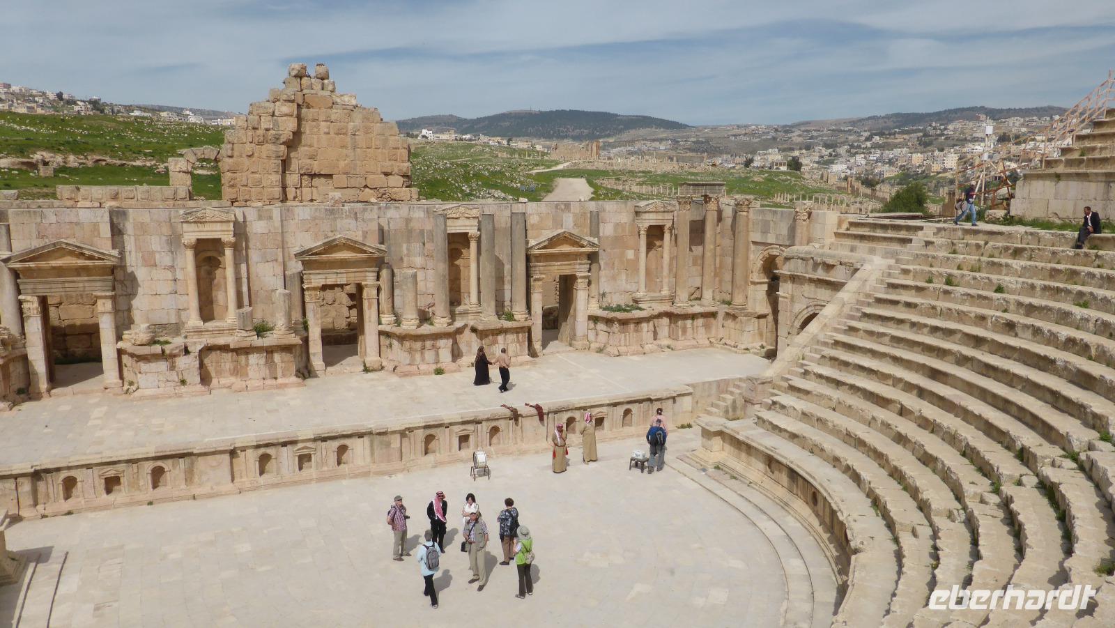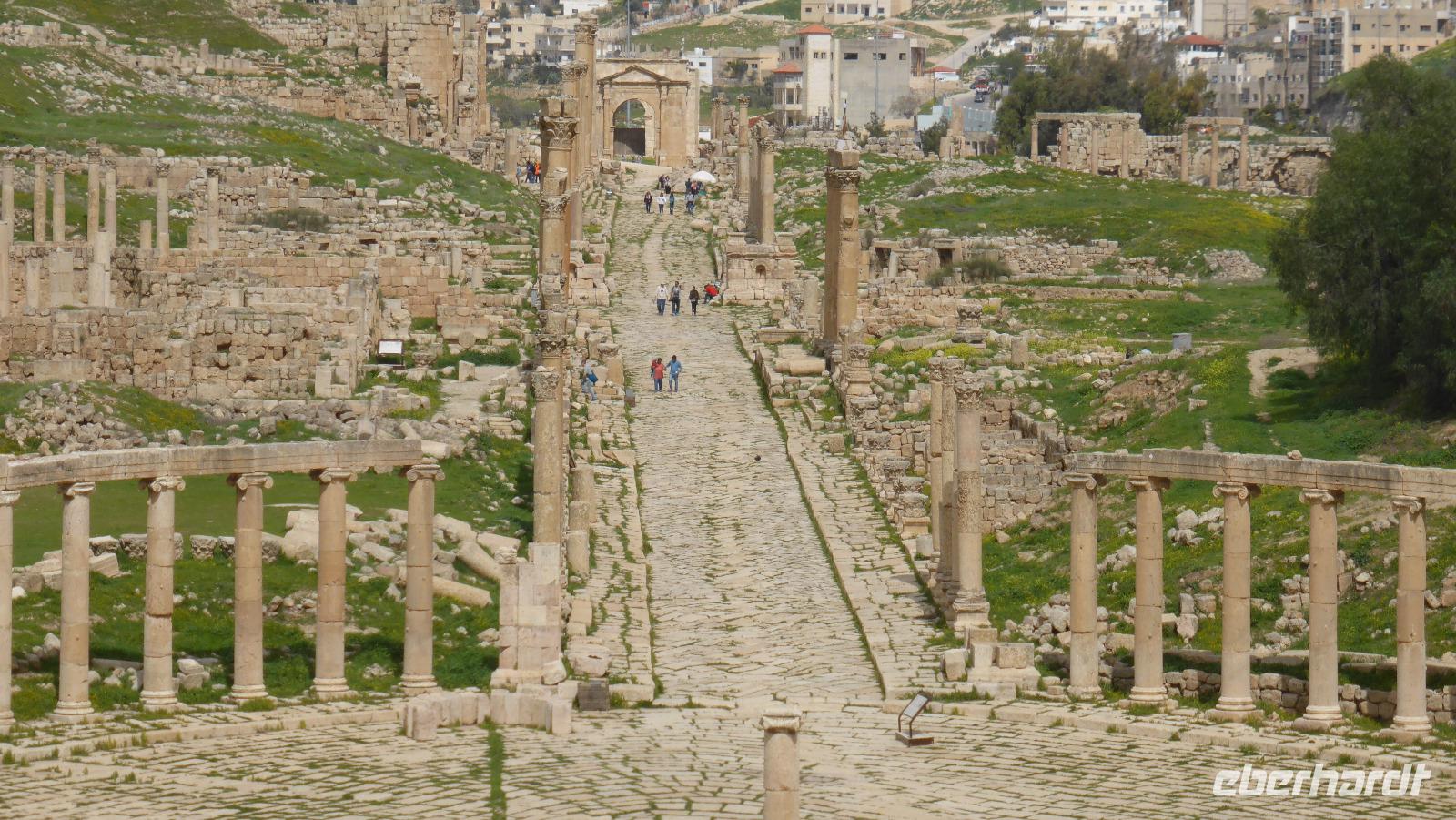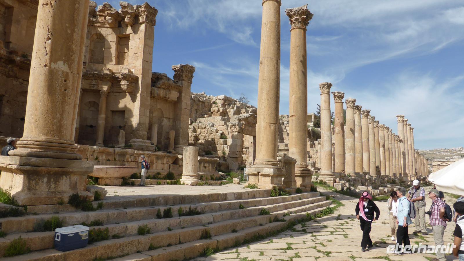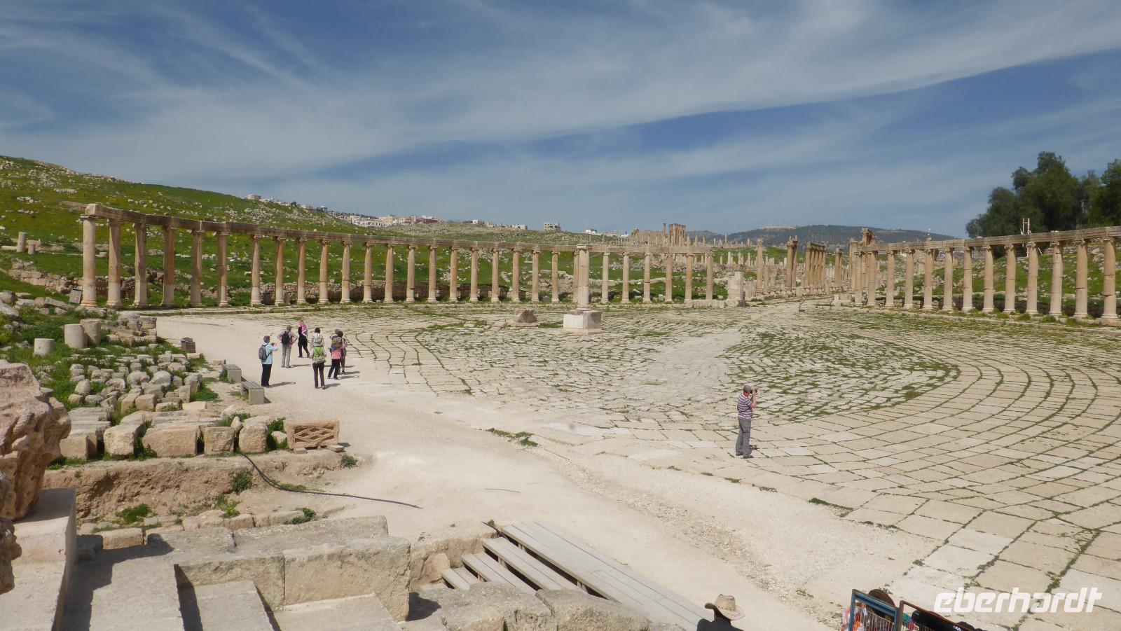 Vor der Weiterfahrt lädt uns Mahmoud auf einen Kaffee/Tee mit Minze ein und von Eberhardt gibt´s passend dazu Dattelkekse. So gestärkt kommen wir nach Jerash, wo sich ein der am besterhaltenen Siedlung der Römer überhaupt befindet. Über zwei Stunden verbringen wir in der antiken Stadt. Durch den Triumphbogen im Süden, vorbei am Hippodrom betreten wir dann die eigentliche Stadt mit zwei Theatern, Tempeln, Kirchen, einer 800 Meter langen Hauptstraße und anderen Einrichtungen. Kaum zu glauben, dass diese Pracht gerade mal für 10.000 Bewohner entstand.. Für mich ist faszinierend, wie heute, 18 Jahrhunderte später, die Stadt noch so gut erhalten ist, dass man nicht viel Fantasie benötigt, um sich die damalige Zeit vorstellen zu können. Natürlich denkt man bei Jordanien zuerst an Petra, aber Jerash ist auf jeden Fall auch einen Besuch wert.