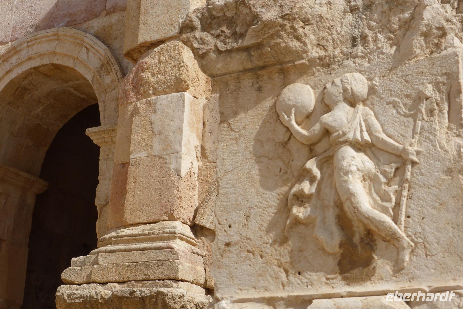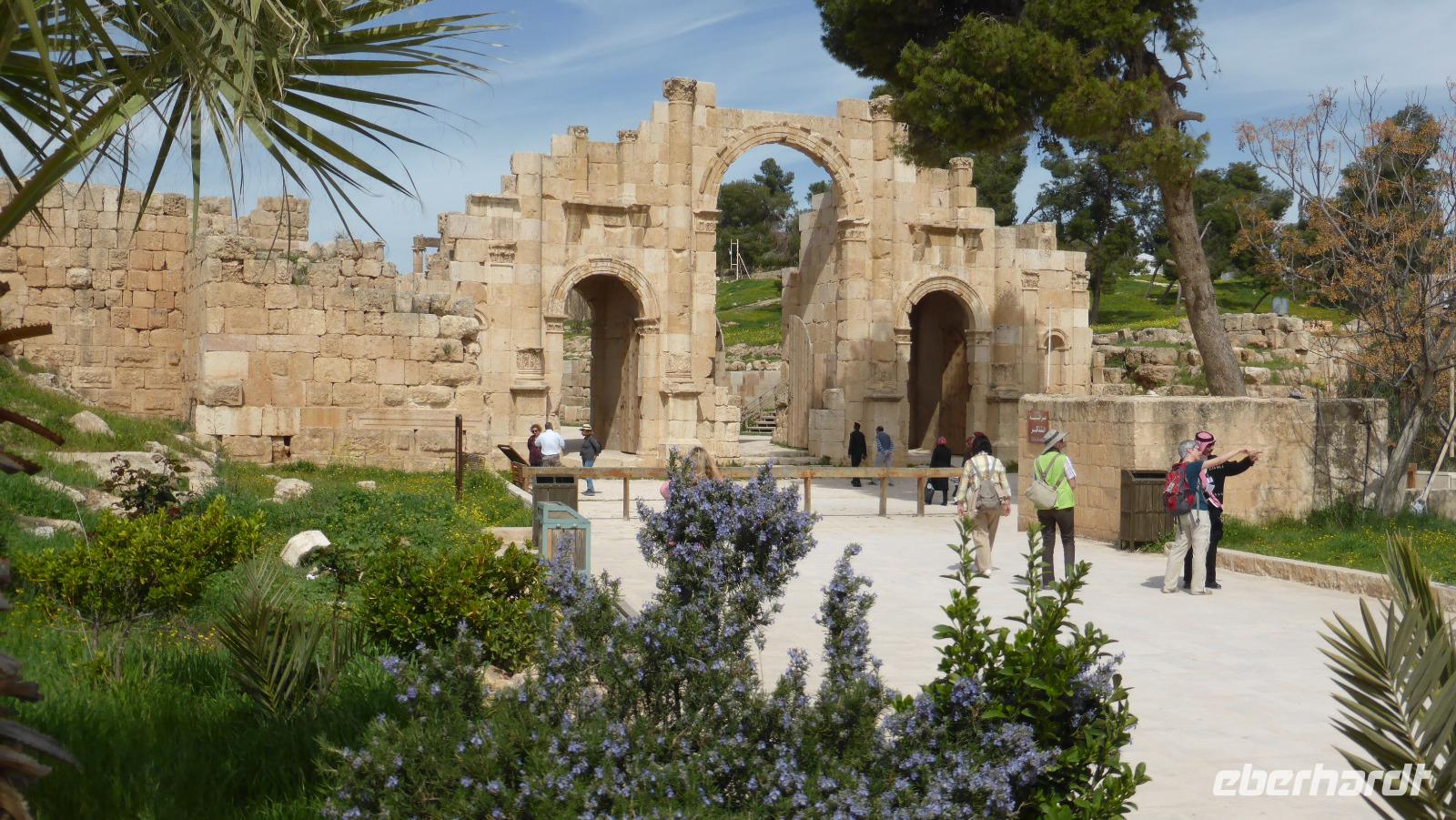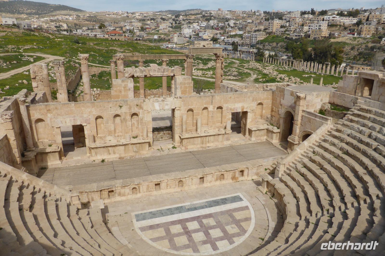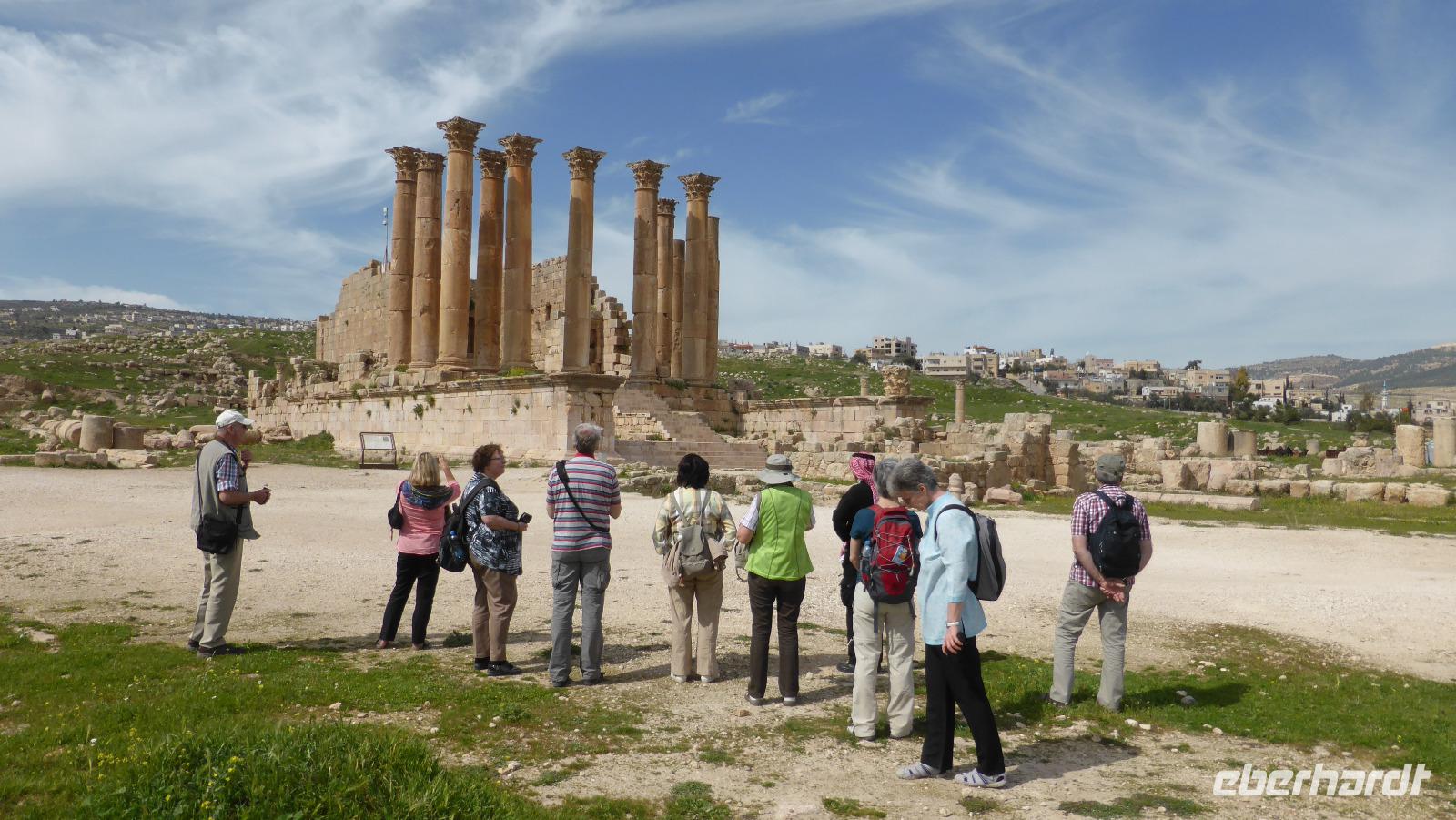 Vor der Weiterfahrt lädt uns Mahmoud auf einen Kaffee/Tee mit Minze ein und von Eberhardt gibt´s passend dazu Dattelkekse. So gestärkt kommen wir nach Jerash, wo sich ein der am besterhaltenen Siedlung der Römer überhaupt befindet. Über zwei Stunden verbringen wir in der antiken Stadt. Durch den Triumphbogen im Süden, vorbei am Hippodrom betreten wir dann die eigentliche Stadt mit zwei Theatern, Tempeln, Kirchen, einer 800 Meter langen Hauptstraße und anderen Einrichtungen. Kaum zu glauben, dass diese Pracht gerade mal für 10.000 Bewohner entstand.. Für mich ist faszinierend, wie heute, 18 Jahrhunderte später, die Stadt noch so gut erhalten ist, dass man nicht viel Fantasie benötigt, um sich die damalige Zeit vorstellen zu können. Natürlich denkt man bei Jordanien zuerst an Petra, aber Jerash ist auf jeden Fall auch einen Besuch wert.