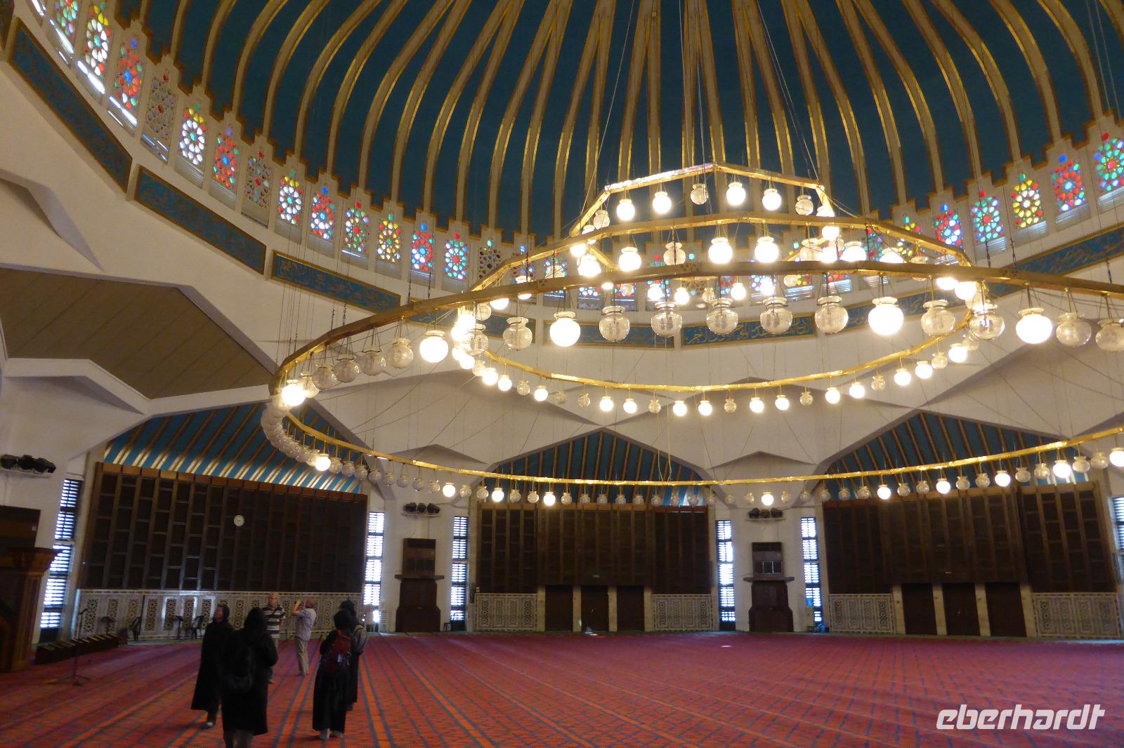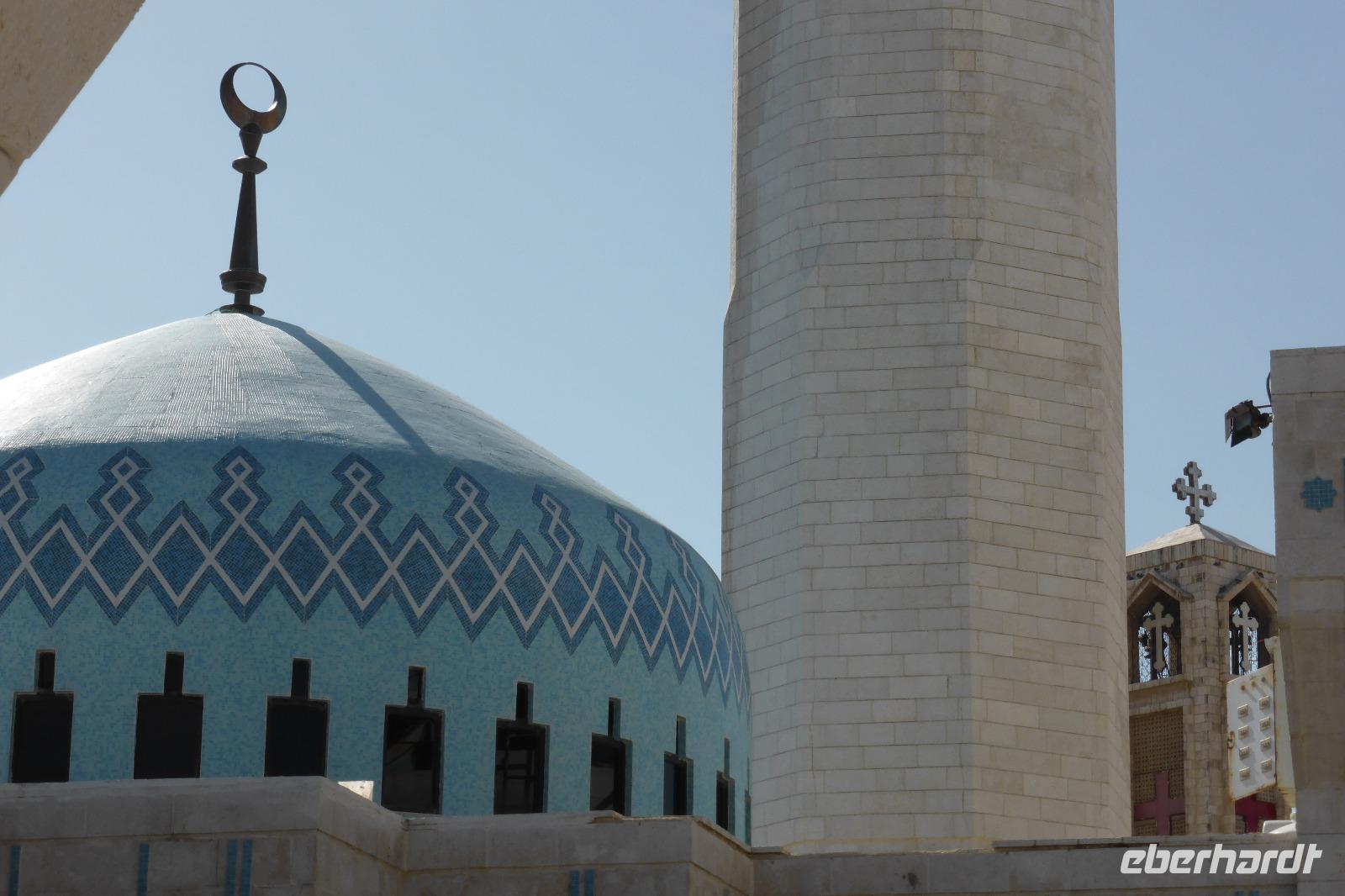 Etwa 250 Kilometer werden wir heute bis zurücklegen. Im Berufsverkehr Ammans sehen wir Hassa, den berühmtesten Verkehrspolizisten der Stadt, der mit seinen Gesten und Zeichen wohl ein Unikat ist. Bevor wir Amman verlassen, besuchen wir die King Abdullah I. Moschee, aufgrund ihrer blauen Kuppel von Touristen auch gern „Blaue Moschee" genannt. Unsere Frauen bekommen schwarze Kapuzengewänder für den Moscheebesuch. Dafür dürfen Sie auch die Frauengebetshalle besichtigen, die den Männern versperrt bleibt. In der Hauptgebetshalle erklärt Mahmoud mit einfachen und verständlichen Worten die Grundlagen des Islam. Übrigens befindet sich direkt neben der Moschee eine Kirche - für uns ein ungewohnter Anblick, aber hier eine Selbstverständlichkeit.