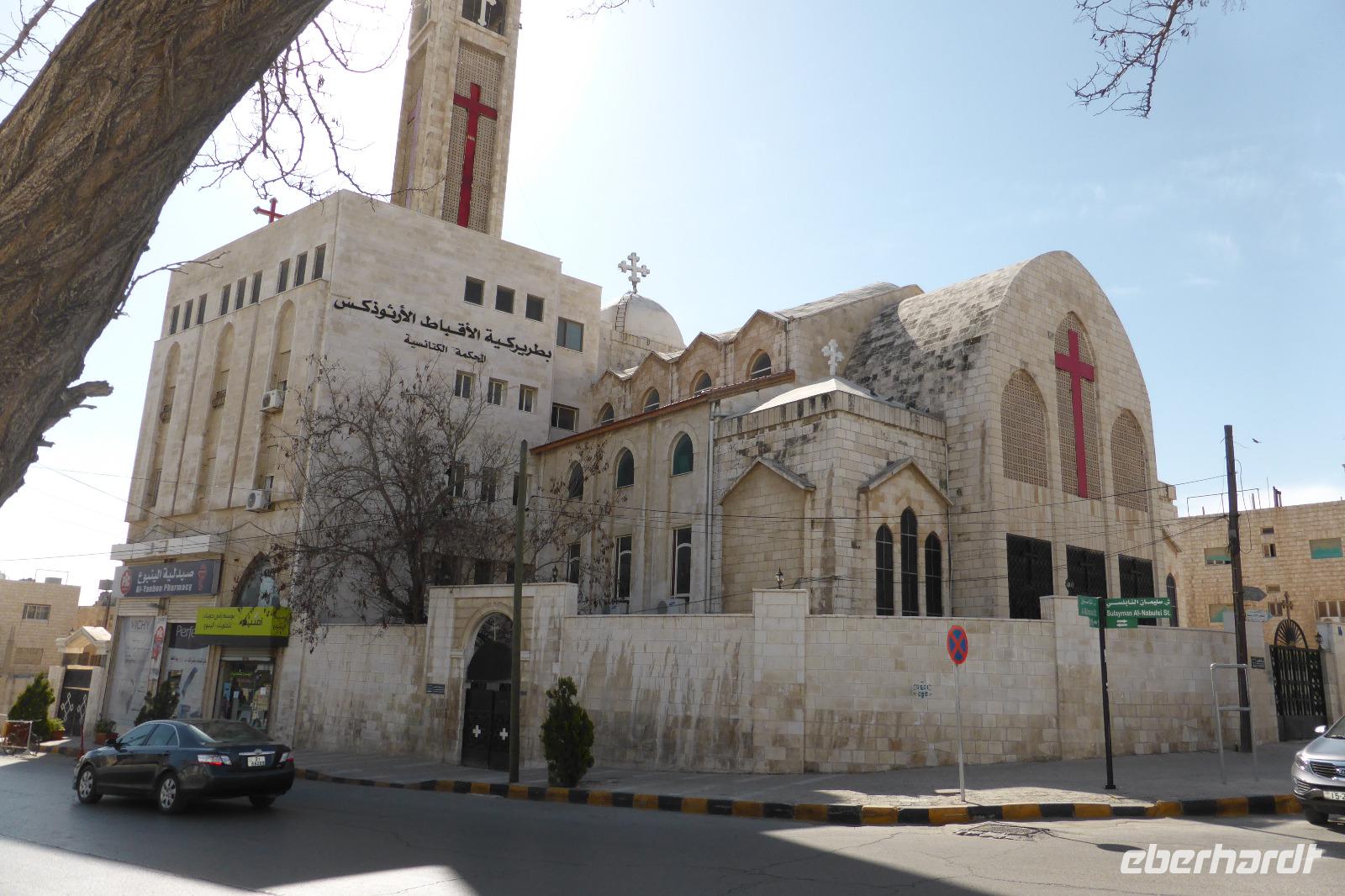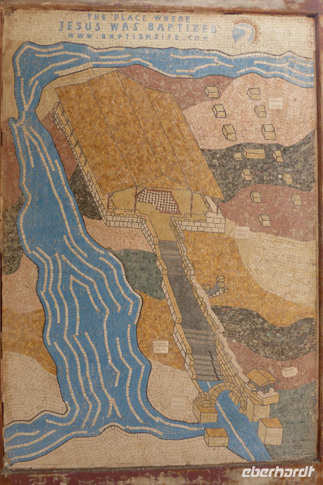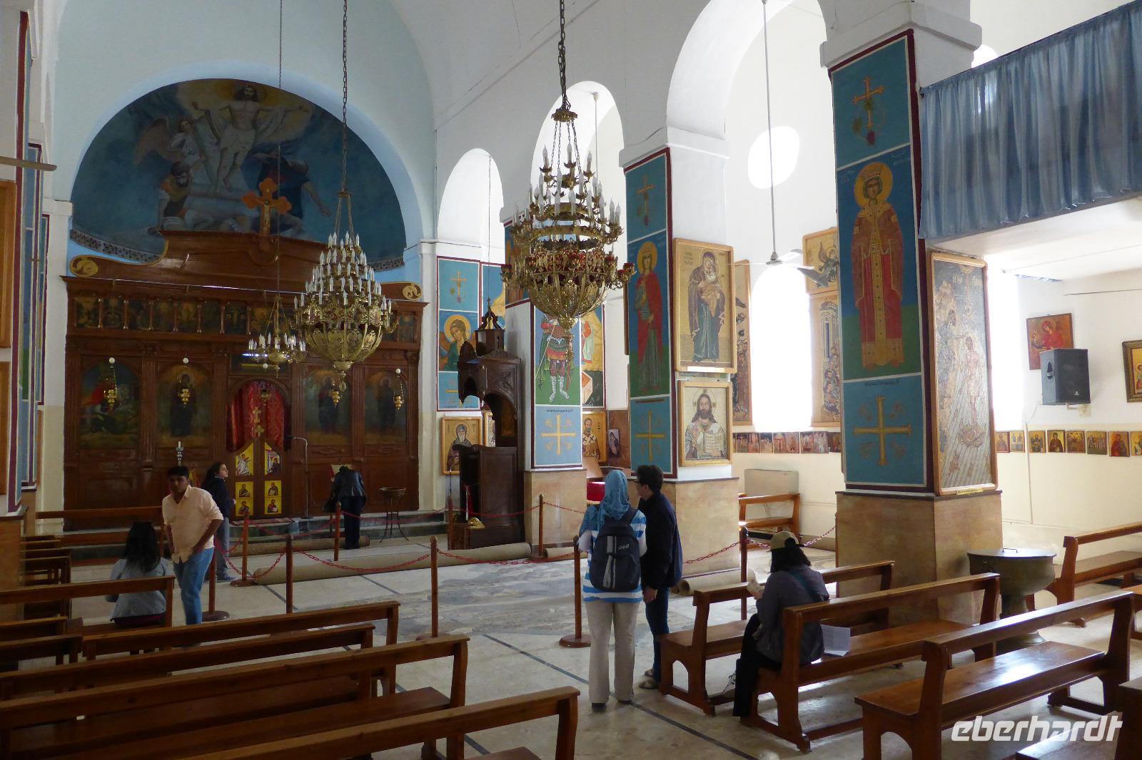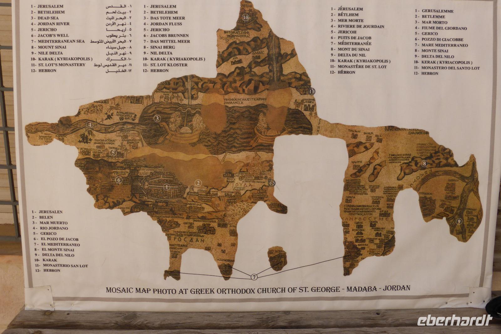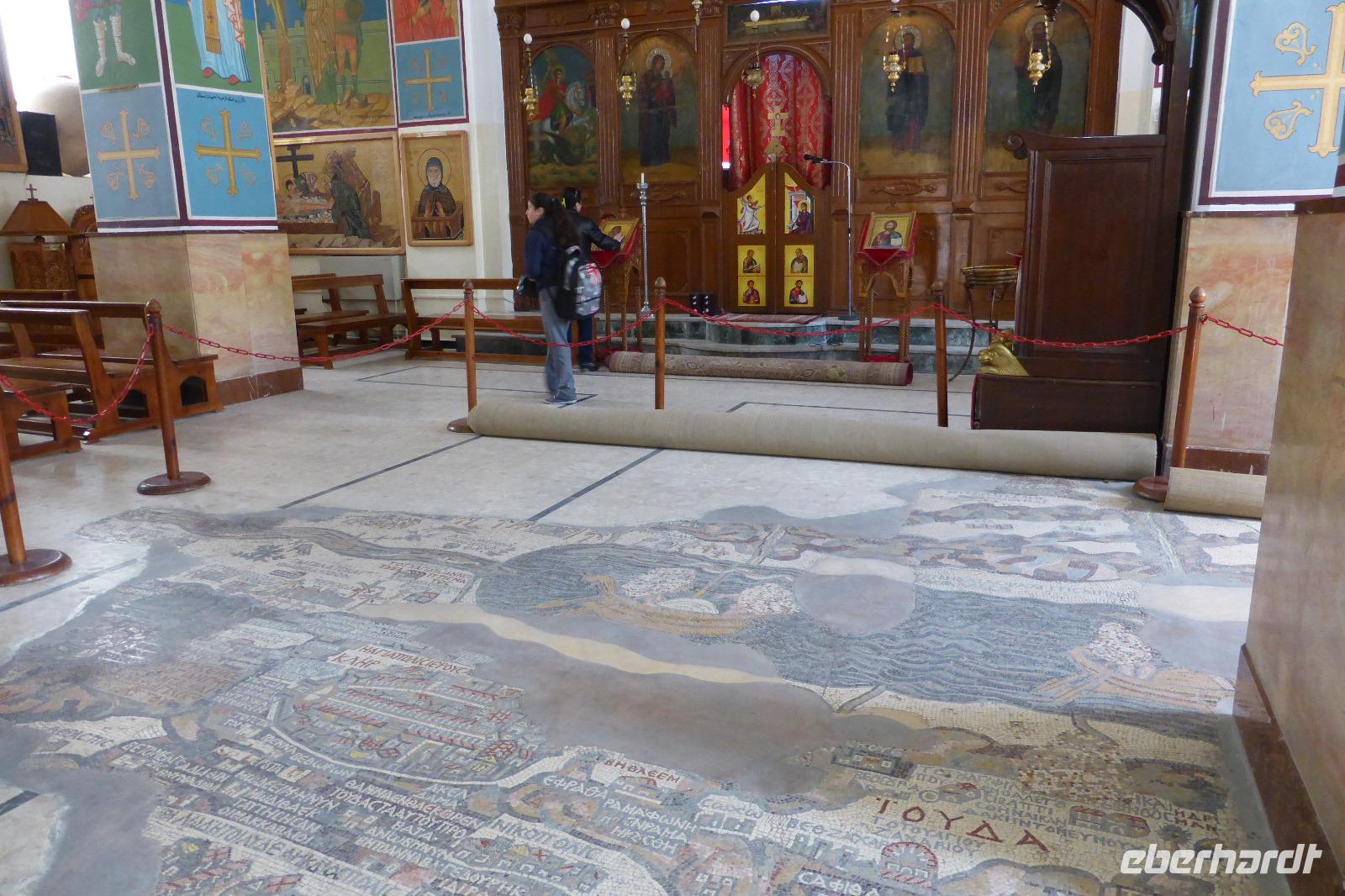 Ein paar Fahrtminuten weiter steht in Madaba ein Kirchenbesuch an. In der St. Georgskirche befindet sich die Palästina-Landkarte, ein berühmtes Mosaik aus dem 6. Jahrhundert das später mit der Kirche überbaut wurde. Es zeigt den Nahen Osten vom Libanon bis zur Nilmündung.