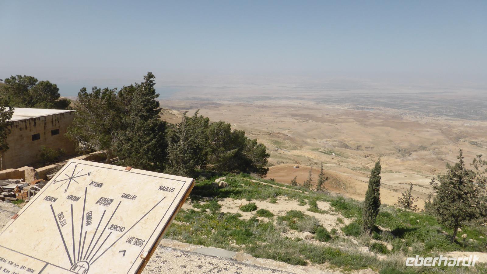 Eine Stunde später stehen wir wieder neben einer Kirche auf dem Berg Nebo (750 m hoch). Wir haben relativ gute Sicht , sehen im Norden Amman, im Westen das Jordantal, das Tote Meer und Jericho, so wie laut Altem Testament Moses einst das „Gelobte Land" von hier aus sah.