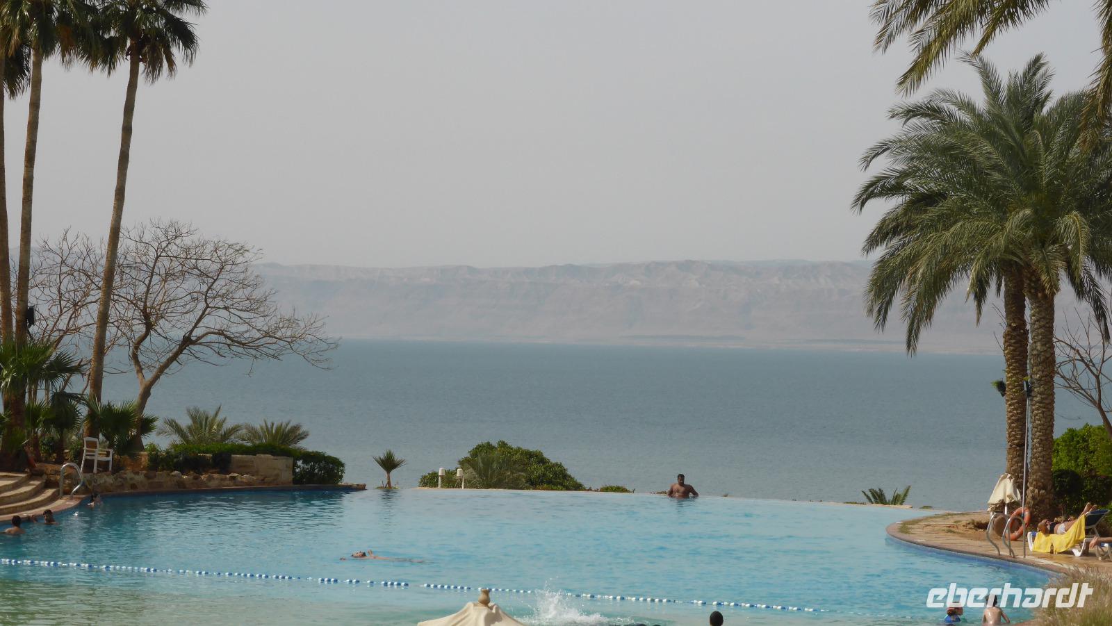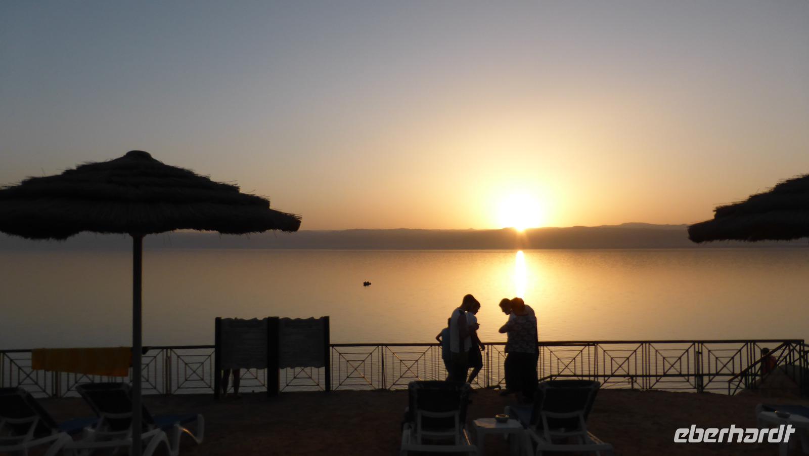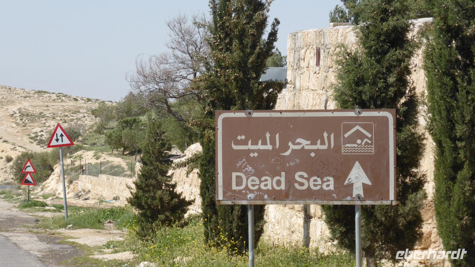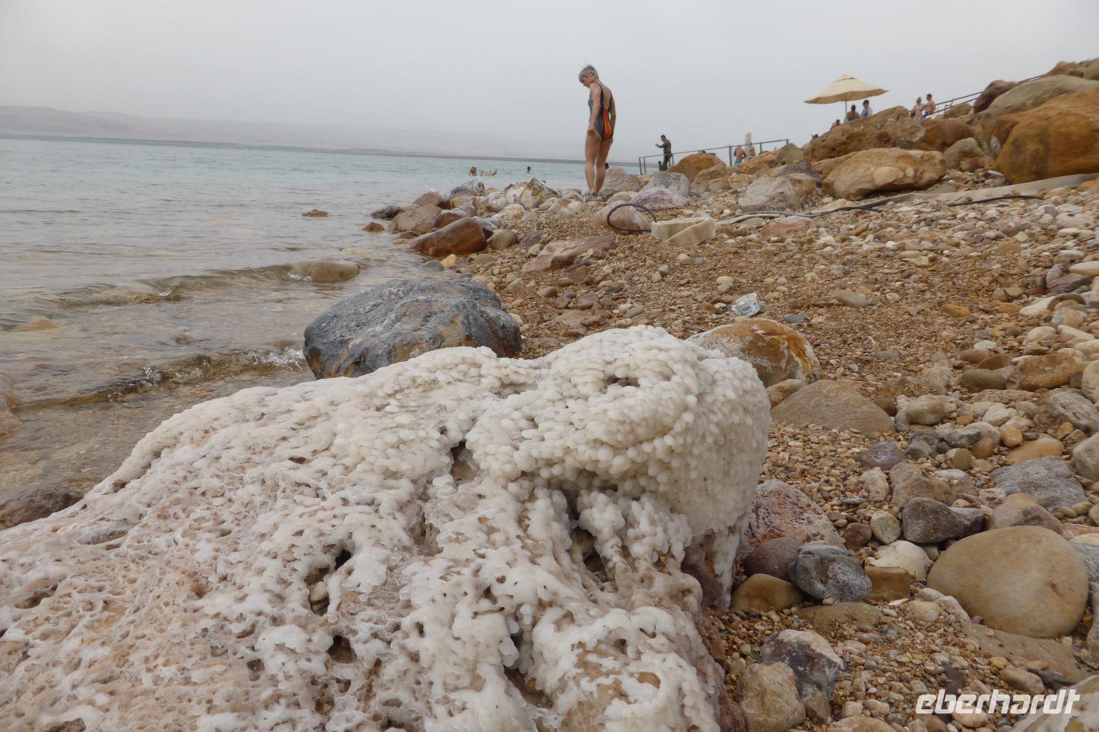 Hier „unten" am Toten Meer befinden wir uns übrigens rund 420 Meter unter dem Meeresspiegel der Ozeane und damit am tiefsten Punkt der Erde überhaupt (der ohne Hilfsmittel zu Fuß erreicht werden kann)!