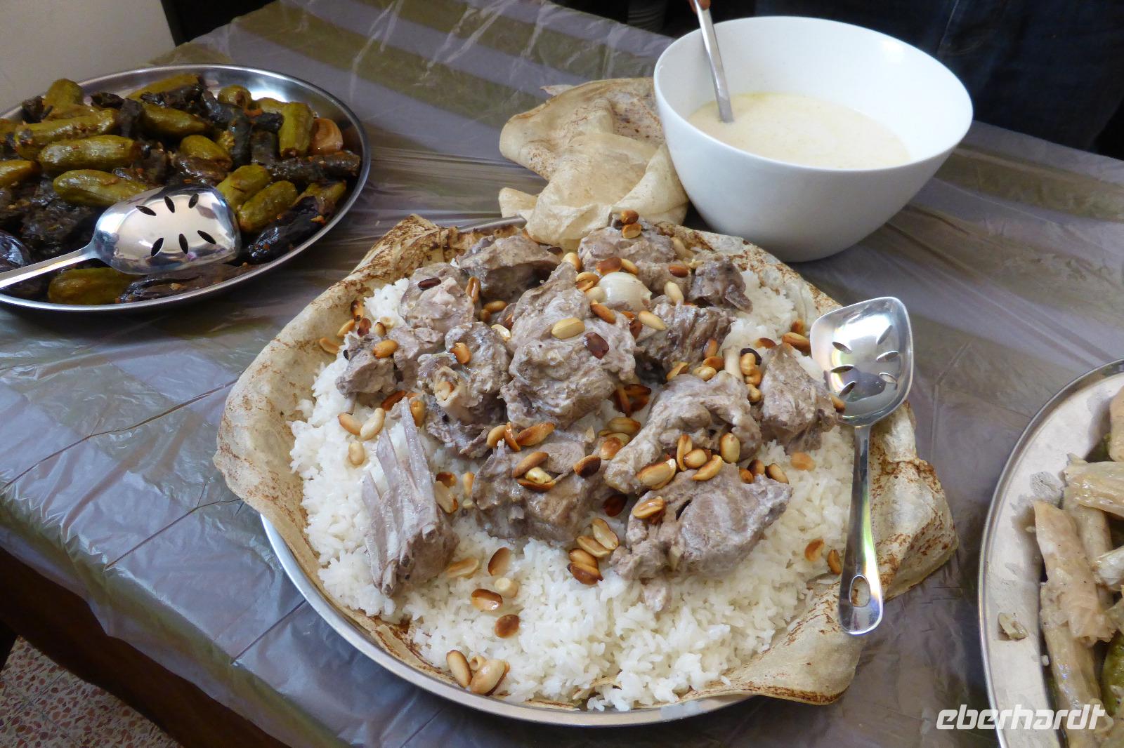 Zu Fuß gelangen wir in ein kleines Lokal, das von einer Familie betrieben wird. Nach den typischen Vorspeisen der Region gibt es das Nationalgericht Mansaf - in der mit einem großen Fladenbrot abgedeckten Schüssel befindet sich geschmortes Lammfleisch. Es wird mit Reis, vermengt mit Nüssen und Rosinen gegessen, dazu gibt es eine Joghurtsauce.