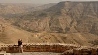 Auf dem Weg nach Süden halten wir oberhalb des Wadi Mujib, auch der Große Canyon von Jordanien genannt. Es ist ein Ausblick auf karge Felsen und ausgetrocknetes Land, unterbrochen von einem Stausee.