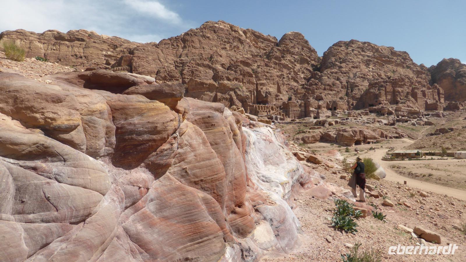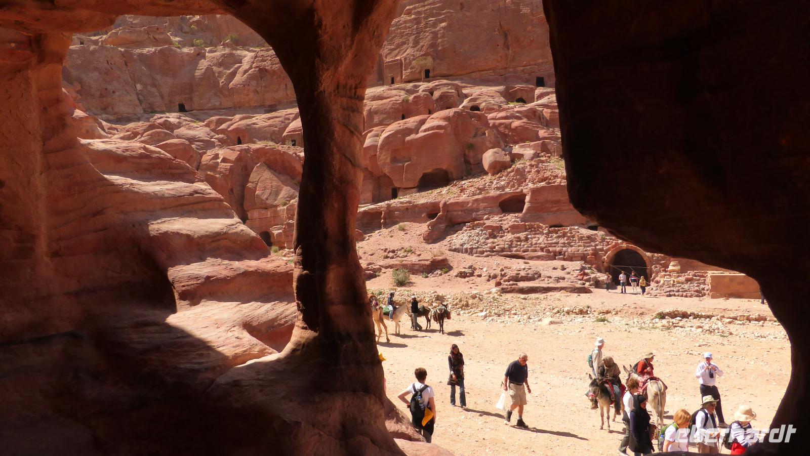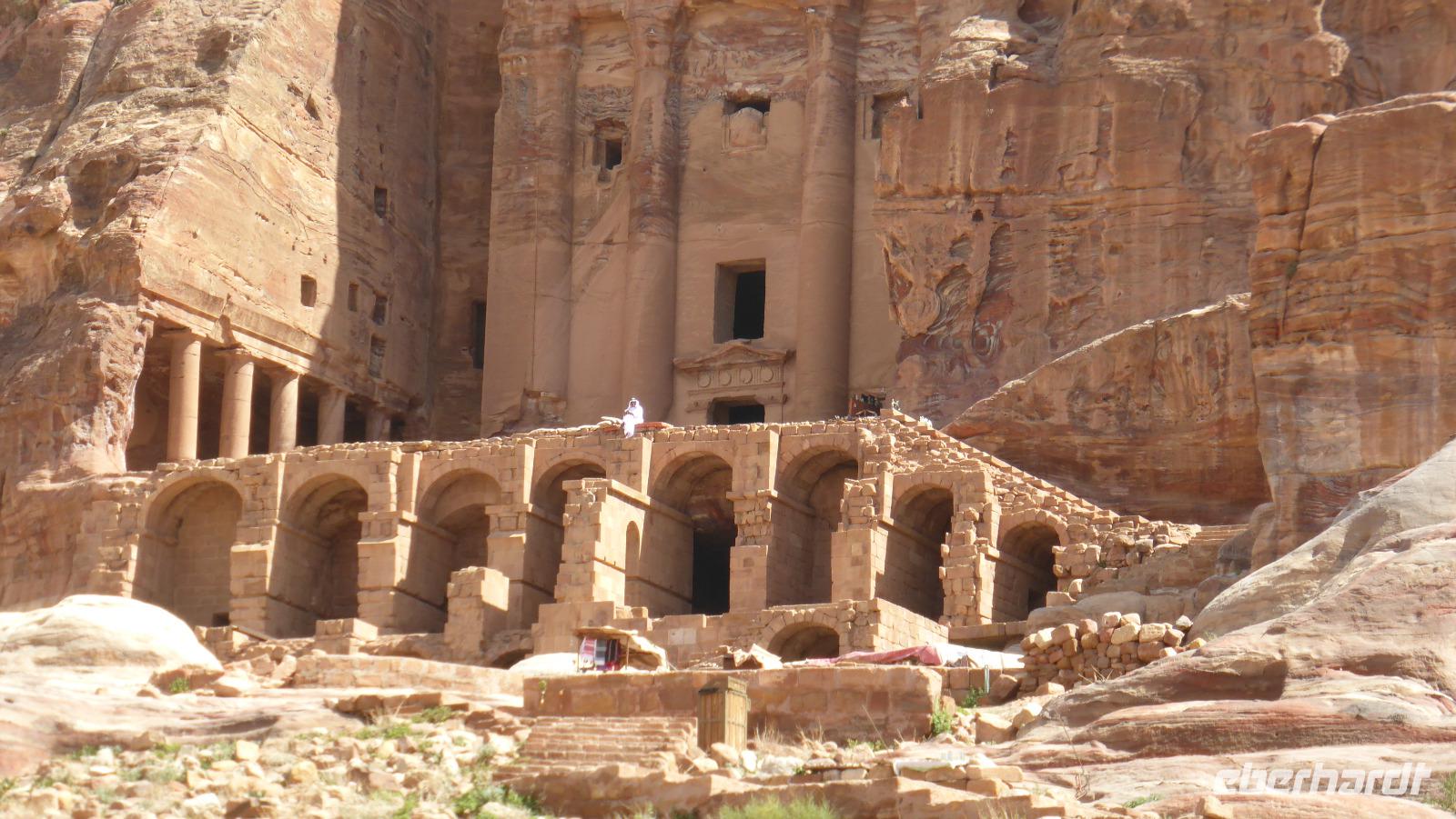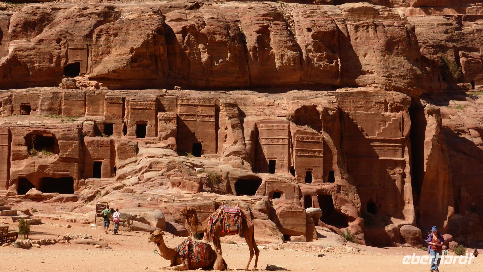 Petra wird oft auf den Siq und das Schatzhaus reduziert. Jetzt bekommen wir eine Vorstellung, dass wir am Schatzhaus gerade mal am Anfang einer großen Stadt stehen, die einst bis zu 30.000 Bewohner zählte. Acht Stunden dauert heute unsere Besichtigung der Sehenswürdigkeiten im Tal, darunter sind Theater, Großer Tempel, Festung Qasr al Bint, Byzantinische Kirche, Felsengräber.