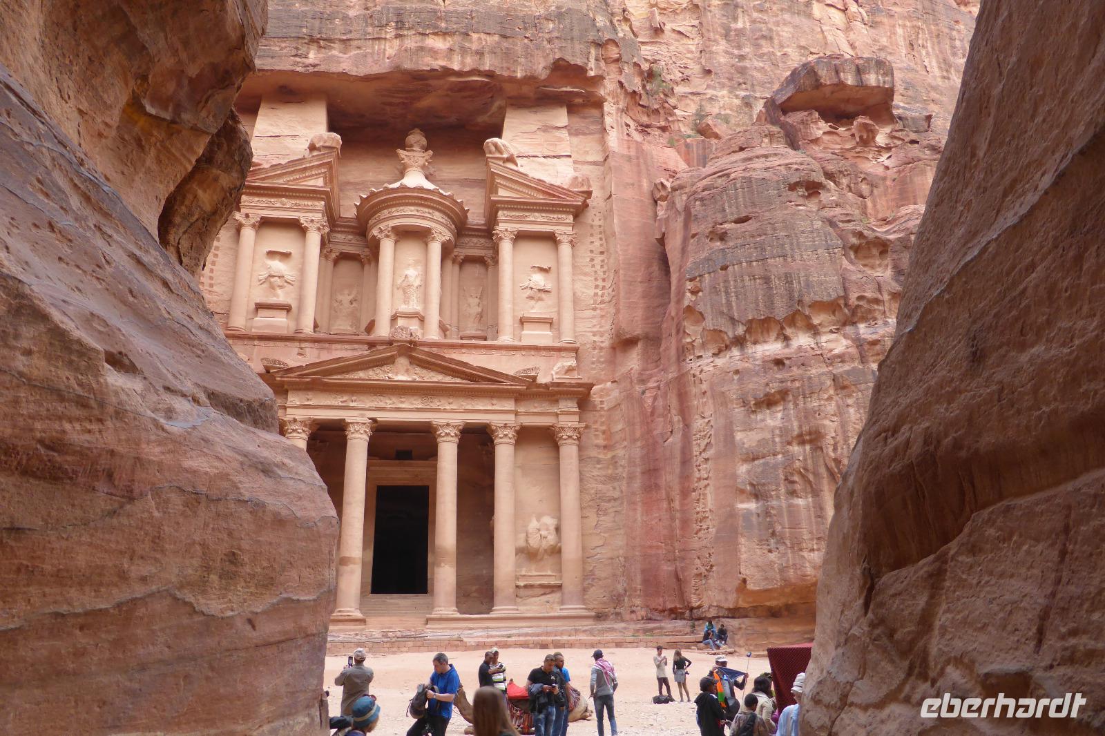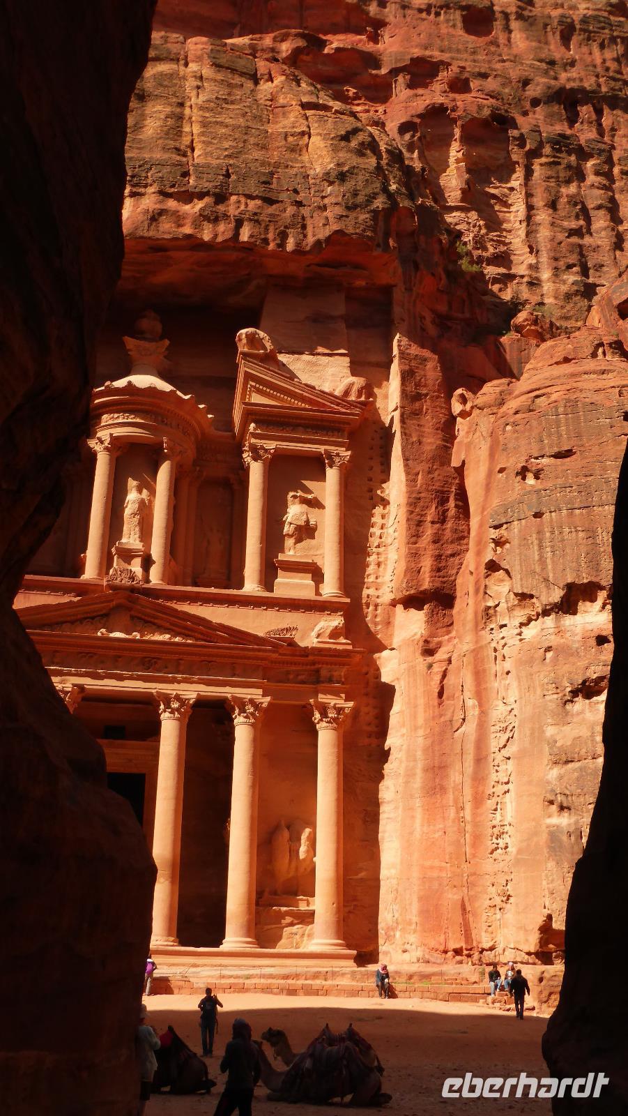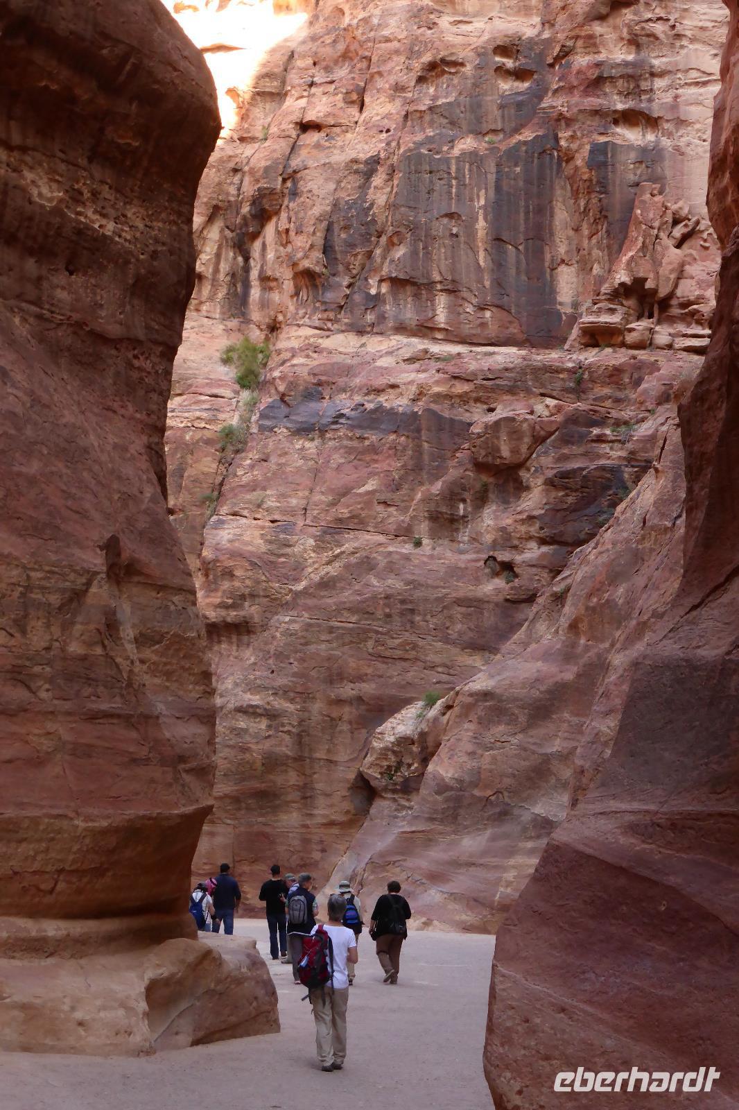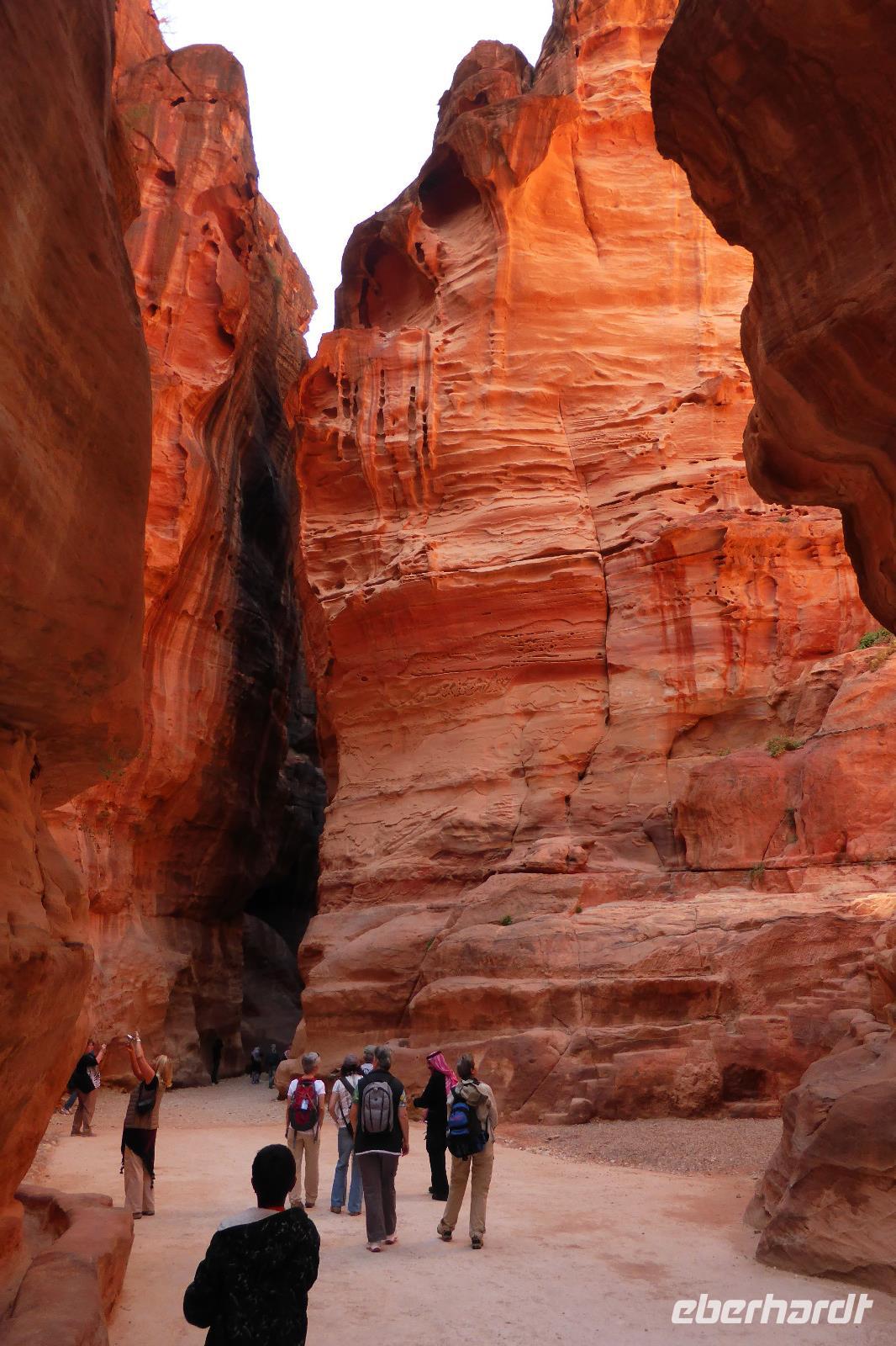 Nun betreten wir also diesen Ort, durch den Siq, den Felsenkorridor. Überraschend für mich die Tiefe der Schlucht, die bizarren Felsformationen und vor allem die Farbenpracht des Sandsteins. Nach 1,3 Kilometer öffnet sich die Schlucht vor dem berühmtesten und prächtigsten Monument, dem Schatzhaus. Jetzt einfach nur den Moment genießen, staunen, fotografieren... Wir sind hier mit nur einigen wenigen weiteren Besuchern. Dies schätzen wir umso mehr, wenn man hört, dass in Spitzenzeiten täglich 5.000 Touristen, in der Spitze sogar 8.000 kommen.