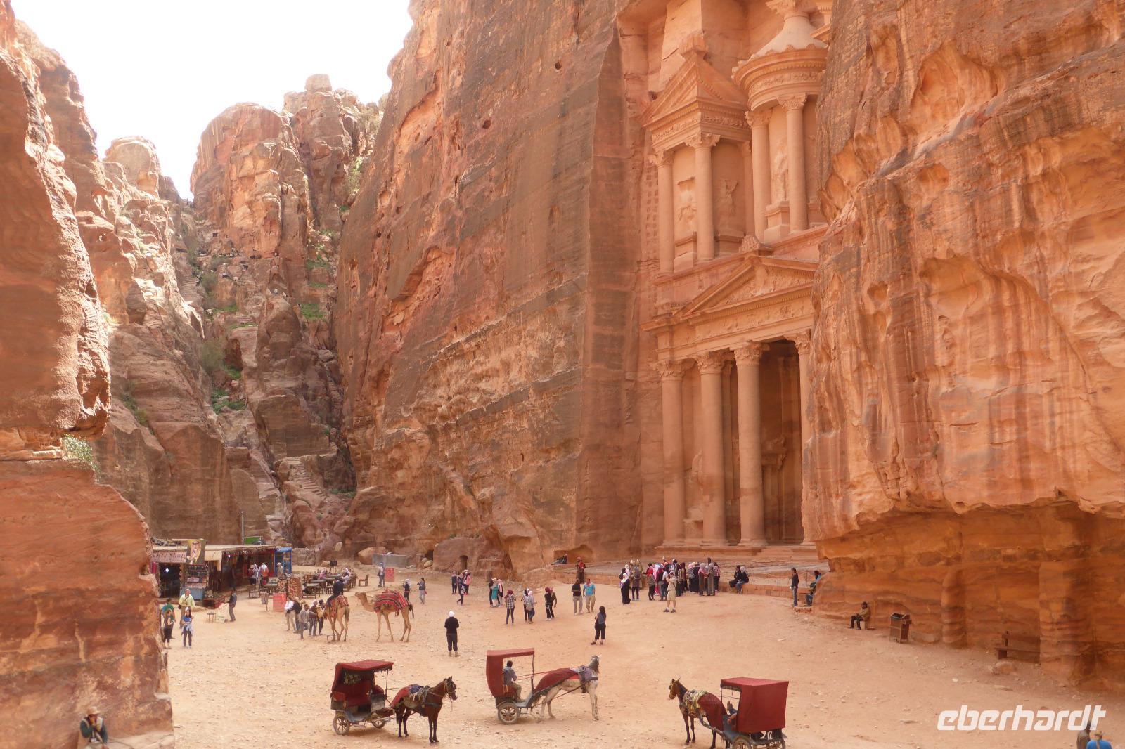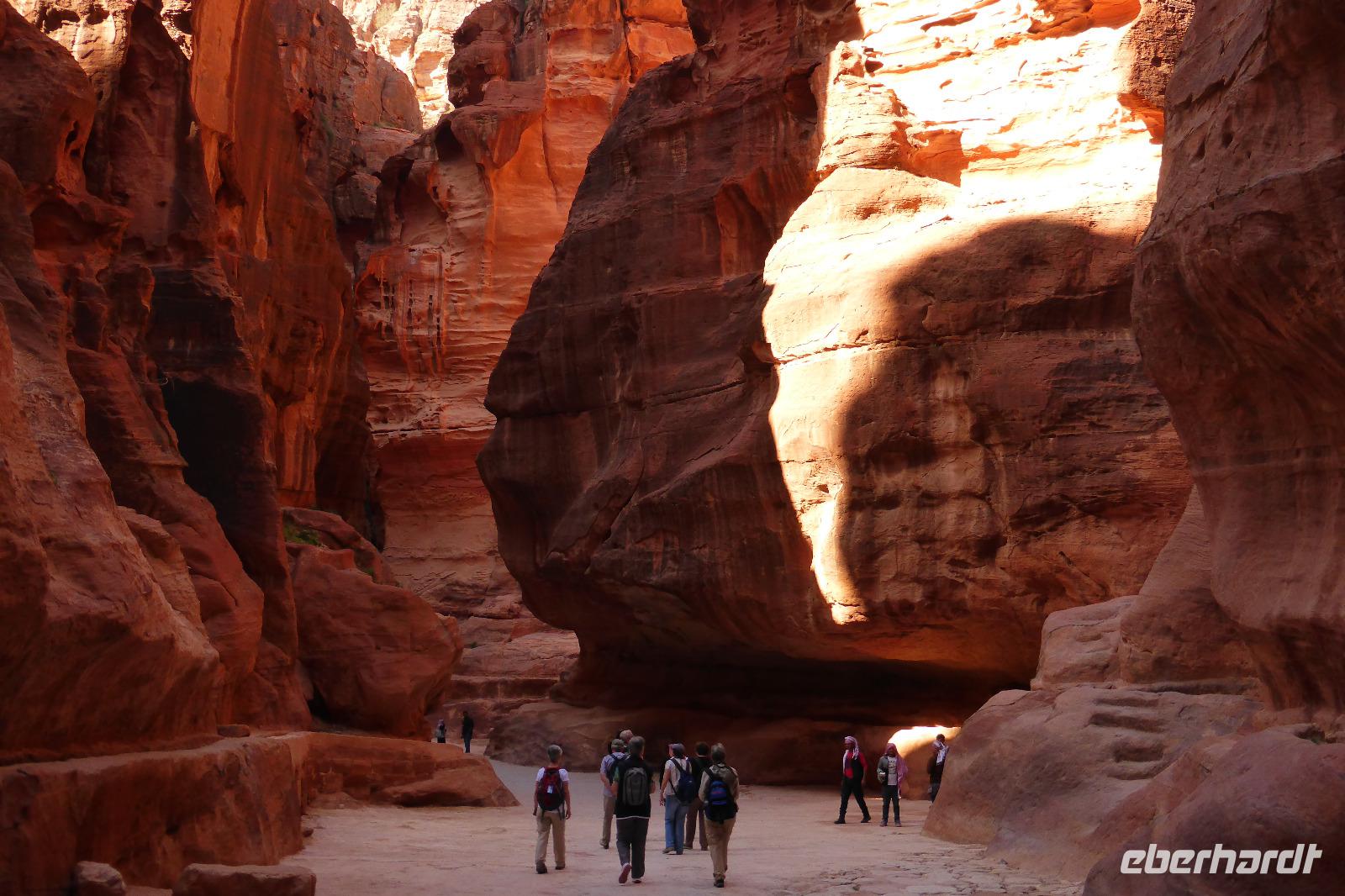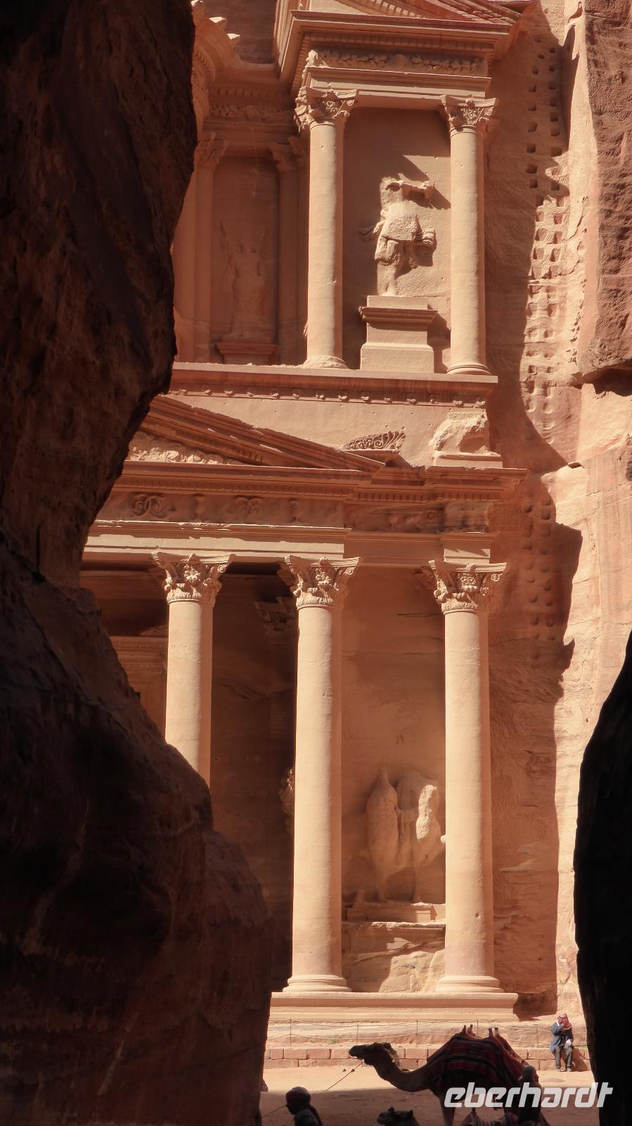 Nun betreten wir also diesen Ort, durch den Siq, den Felsenkorridor. Überraschend für mich die Tiefe der Schlucht, die bizarren Felsformationen und vor allem die Farbenpracht des Sandsteins. Nach 1,3 Kilometer öffnet sich die Schlucht vor dem berühmtesten und prächtigsten Monument, dem Schatzhaus. Jetzt einfach nur den Moment genießen, staunen, fotografieren... Wir sind hier mit nur einigen wenigen weiteren Besuchern. Dies schätzen wir umso mehr, wenn man hört, dass in Spitzenzeiten täglich 5.000 Touristen, in der Spitze sogar 8.000 kommen.