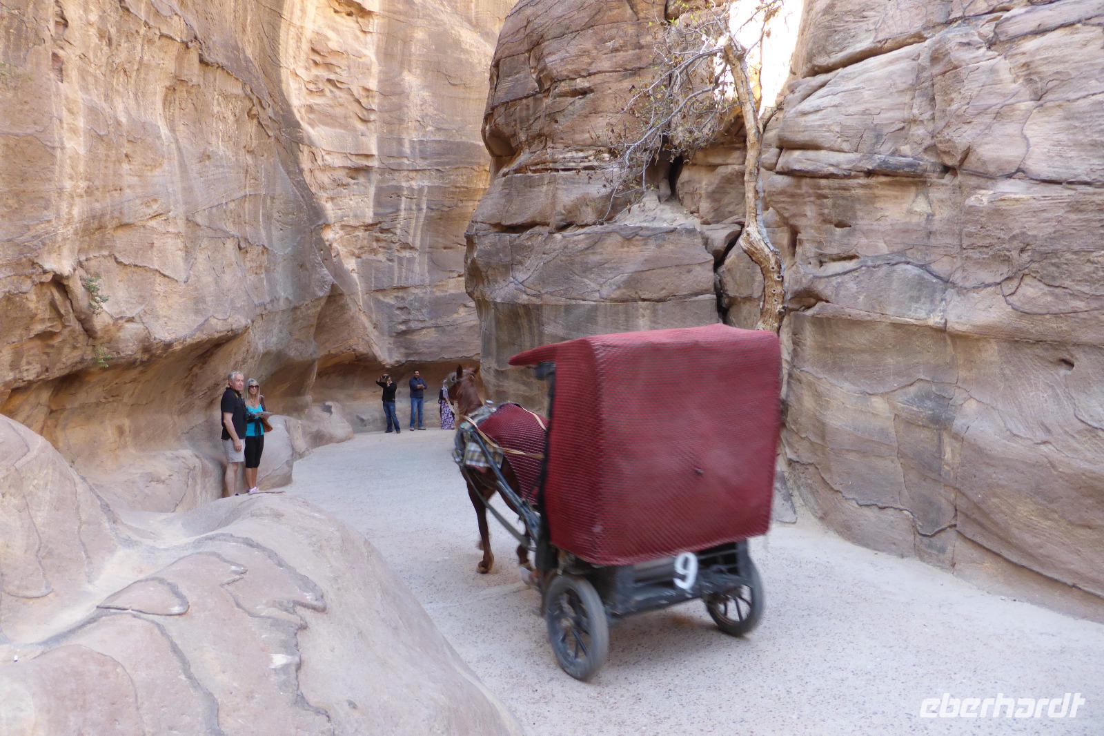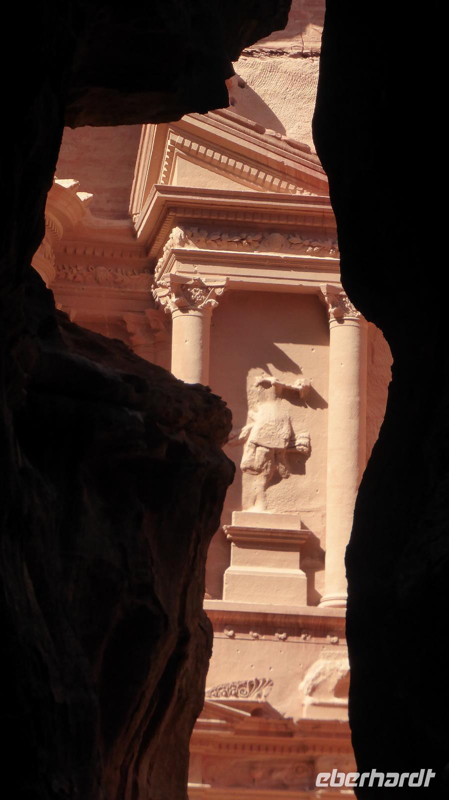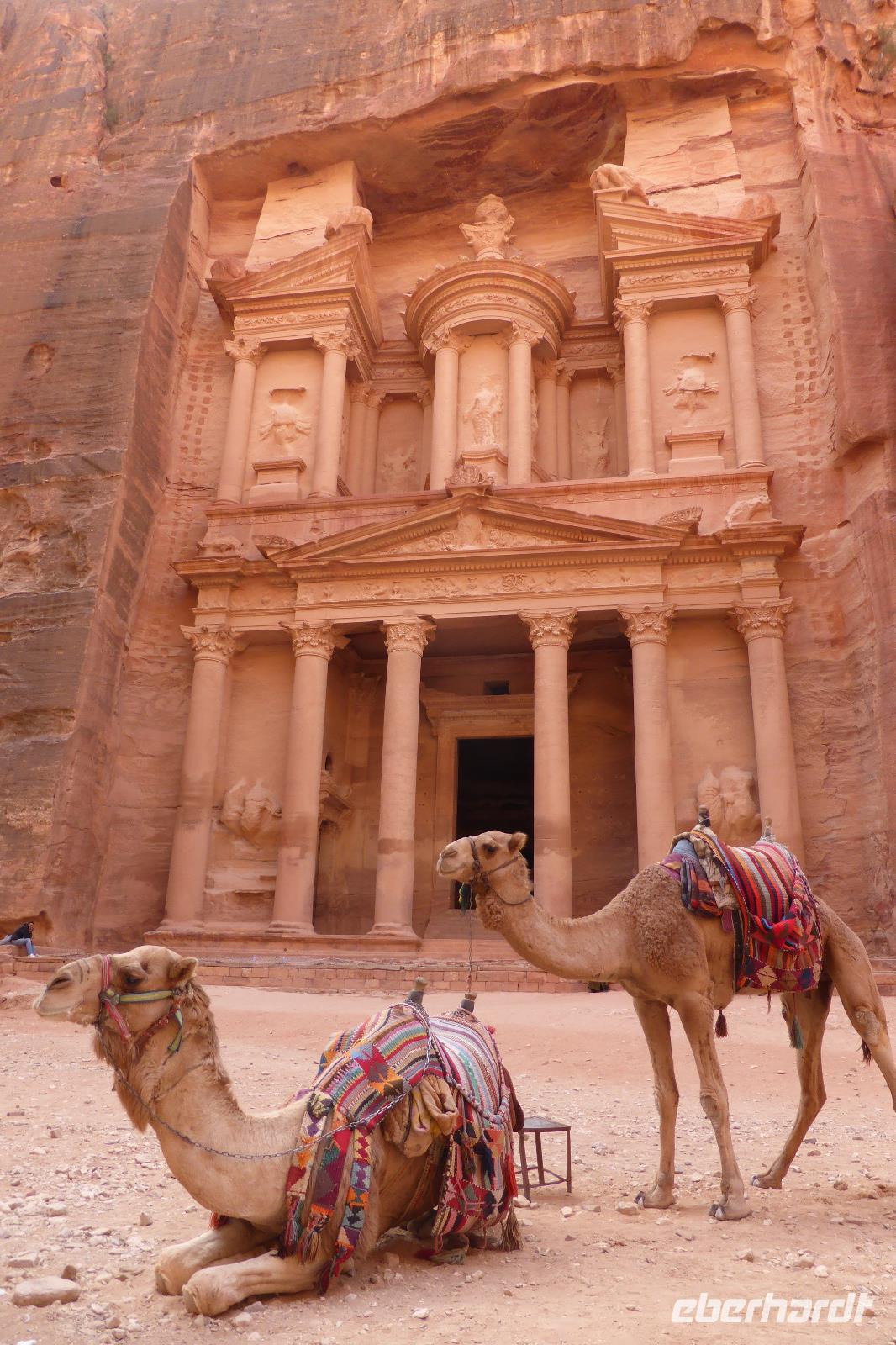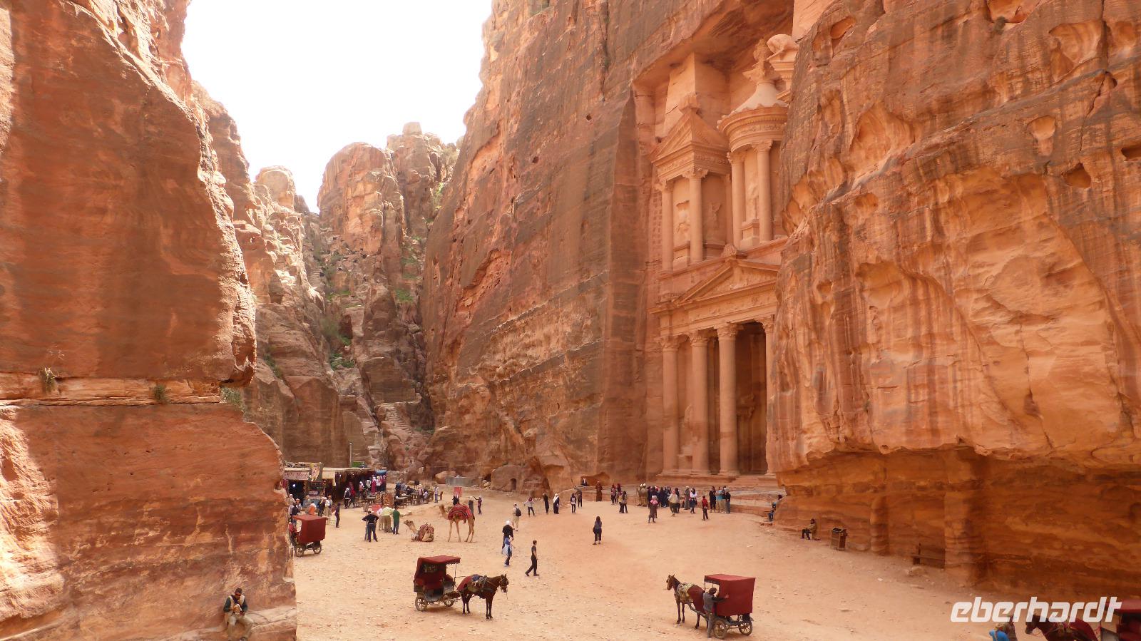 Nun betreten wir also diesen Ort, durch den Siq, den Felsenkorridor. Überraschend für mich die Tiefe der Schlucht, die bizarren Felsformationen und vor allem die Farbenpracht des Sandsteins. Nach 1,3 Kilometer öffnet sich die Schlucht vor dem berühmtesten und prächtigsten Monument, dem Schatzhaus. Jetzt einfach nur den Moment genießen, staunen, fotografieren... Wir sind hier mit nur einigen wenigen weiteren Besuchern. Dies schätzen wir umso mehr, wenn man hört, dass in Spitzenzeiten täglich 5.000 Touristen, in der Spitze sogar 8.000 kommen.
