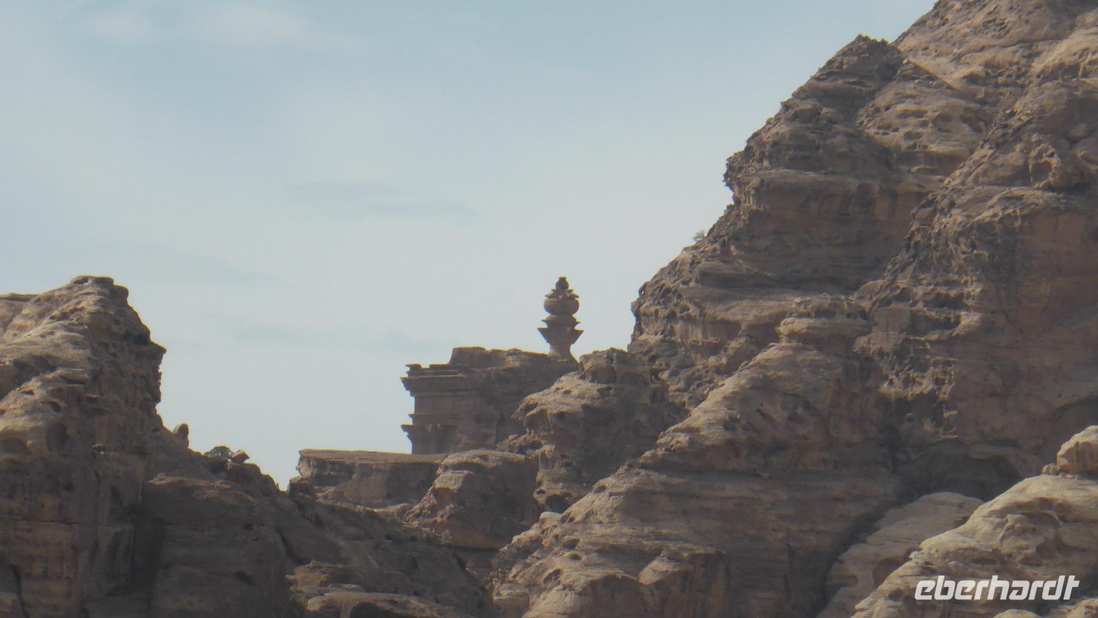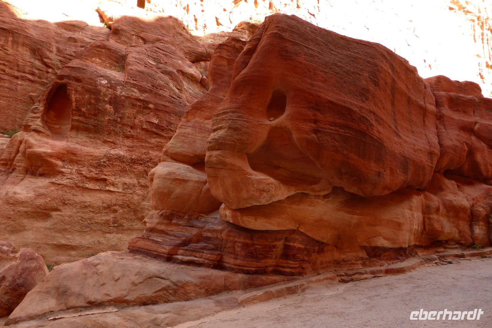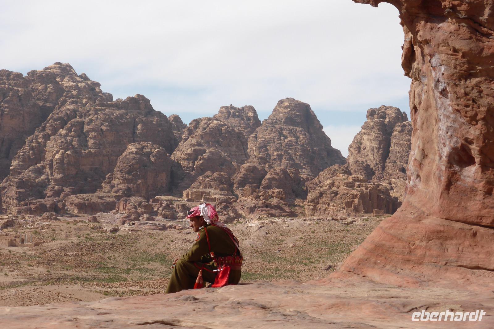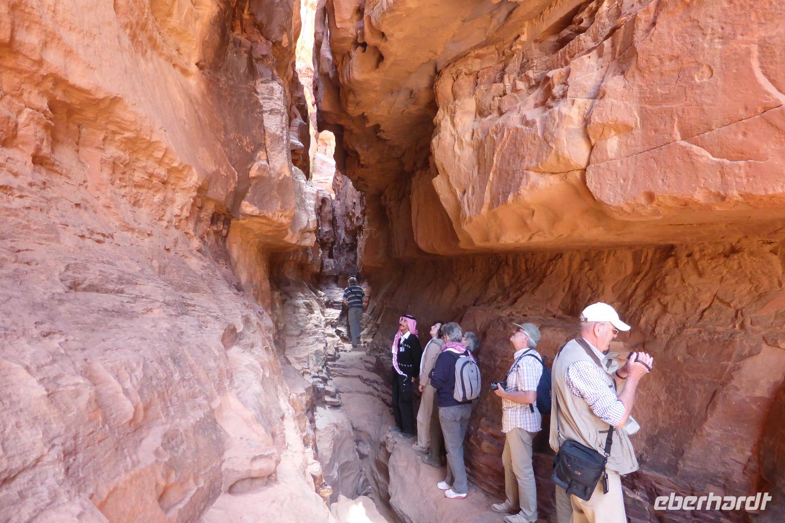 An diesem Tag überrascht und beeindruckt mich besonders, dass neben den Kunstwerken von Nabatäern und Römern die Natur hier Einzigartiges geschaffen hat, was ich so nicht erwartet hatte. Bizarre Felsen und fantasievolle Farbmuster im Sandstein faszinieren immer wieder aufs Neue. Nicht unerwähnt lassen möchte ich zwei Mädchen: die elfjährige Khitaam mit ihren bestechenden Augen, die uns eine Weile auf ihrem Esel begleitet hat und wir miteinander ein paar Worte gewechselt haben. Und ein unbekanntes Mädchen, das uns hilfsbereit einen Weg über einen Bergrücken gezeigt hat.