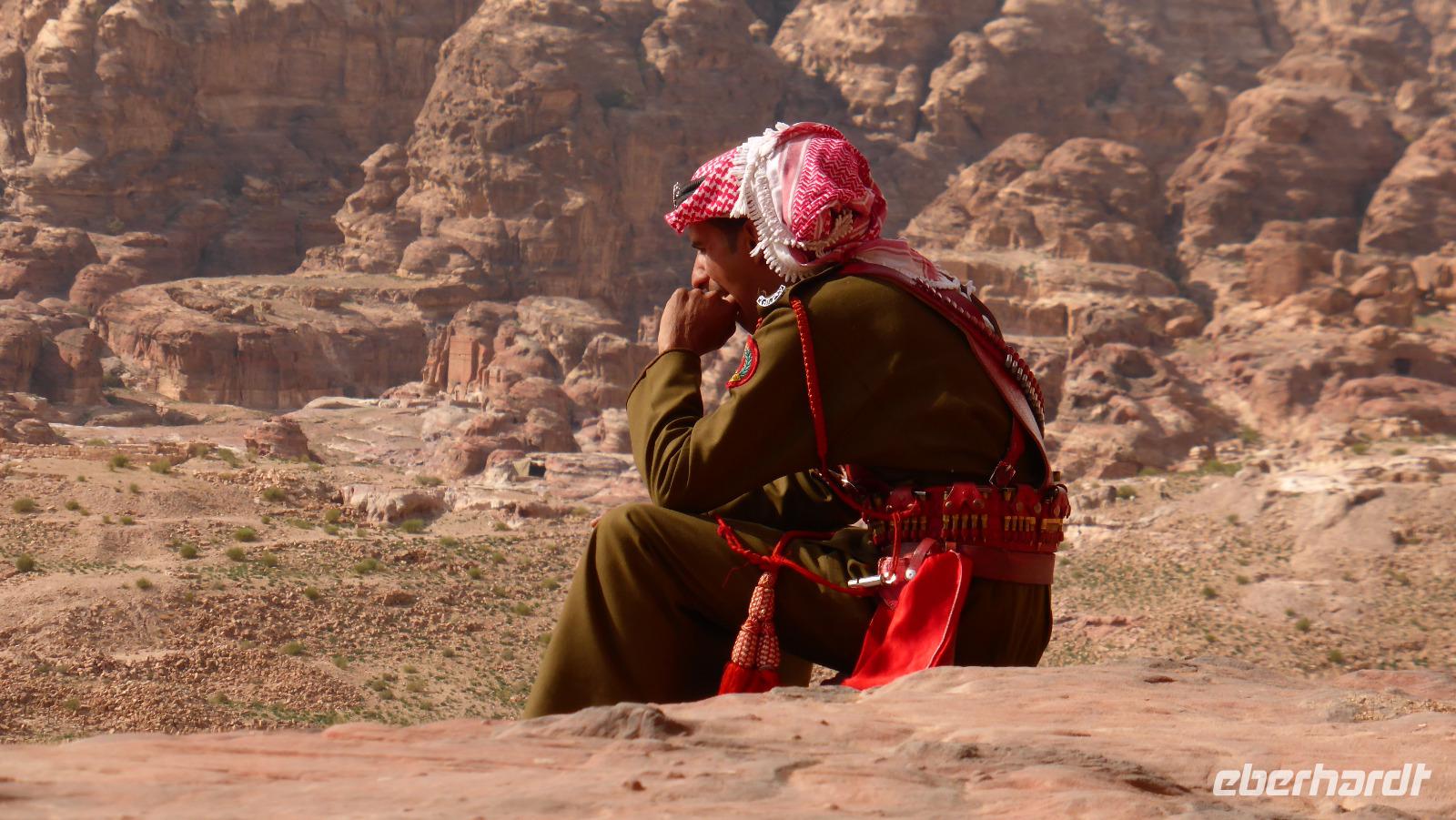 „Die Griechen nannten diesen Ort Petra, den Fels. Ein mehr als schlichter Name für die kühnste, die unwahrscheinlichste Wüstenstadt der antiken Welt, deren Geschichte wohl vor 2.400 Jahren beginnt. Nabatäer, räuberische Nomaden vermutlich, schlagen damals in den Bergen des Ostjordanlandes ihre Zelt auf. Ein Tal zieht sie besonders an - wegen der nahen Quellen, der natürlichen Höhlen und des Hauptzugangsweges, eines kilometerlangen Felskorridors, der an seiner engsten Stelle so schmal ist, dass ihn ein Mann mit Kamel problemlos versperren kann. Hinter dem Hohlweg öffnet sich ein breites, sanft gewelltes Tal mit schützenden Bergflanken, Eine natürliche Festung..." (GEO SPEZIAL, Syrien und Jordanien 01/2011).