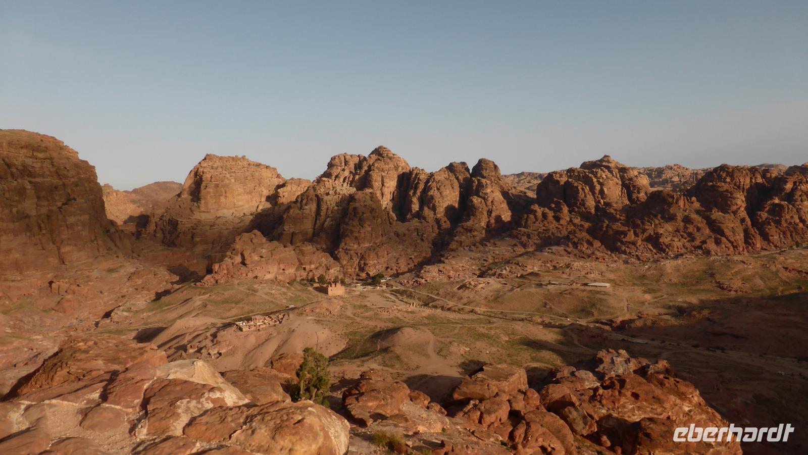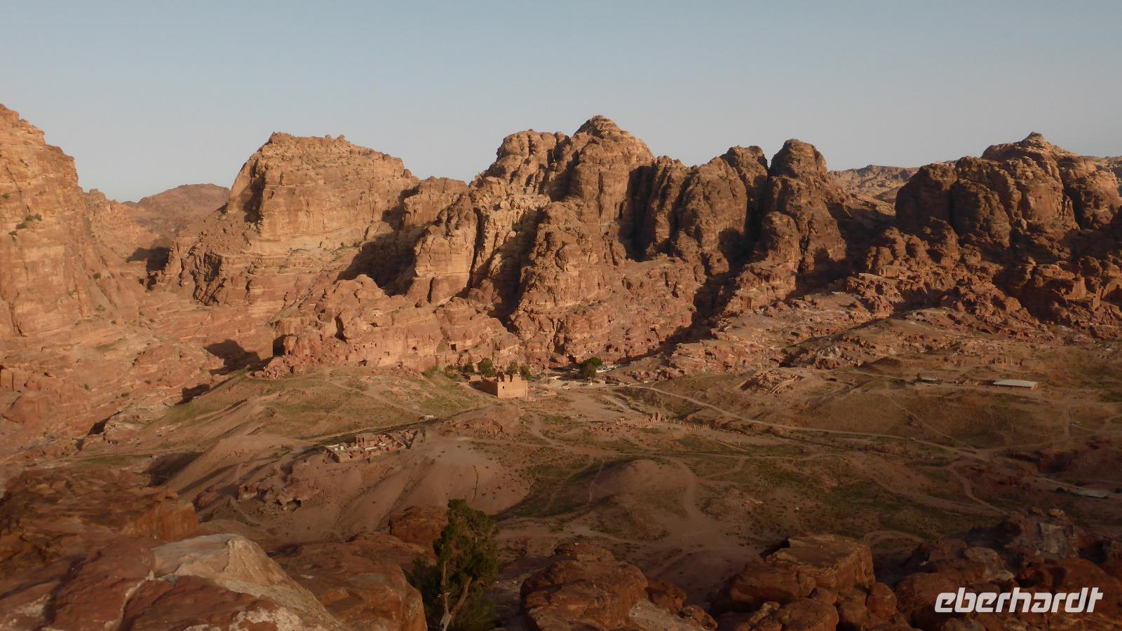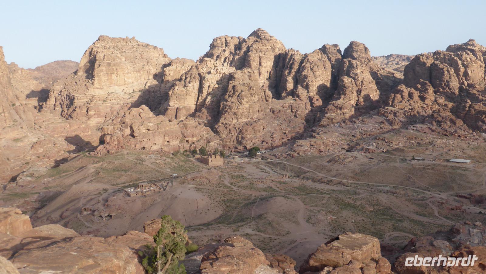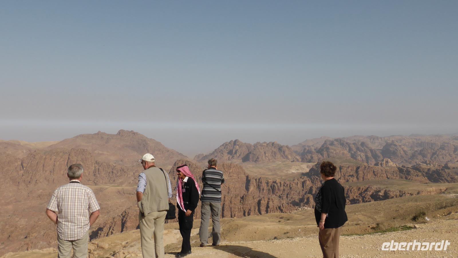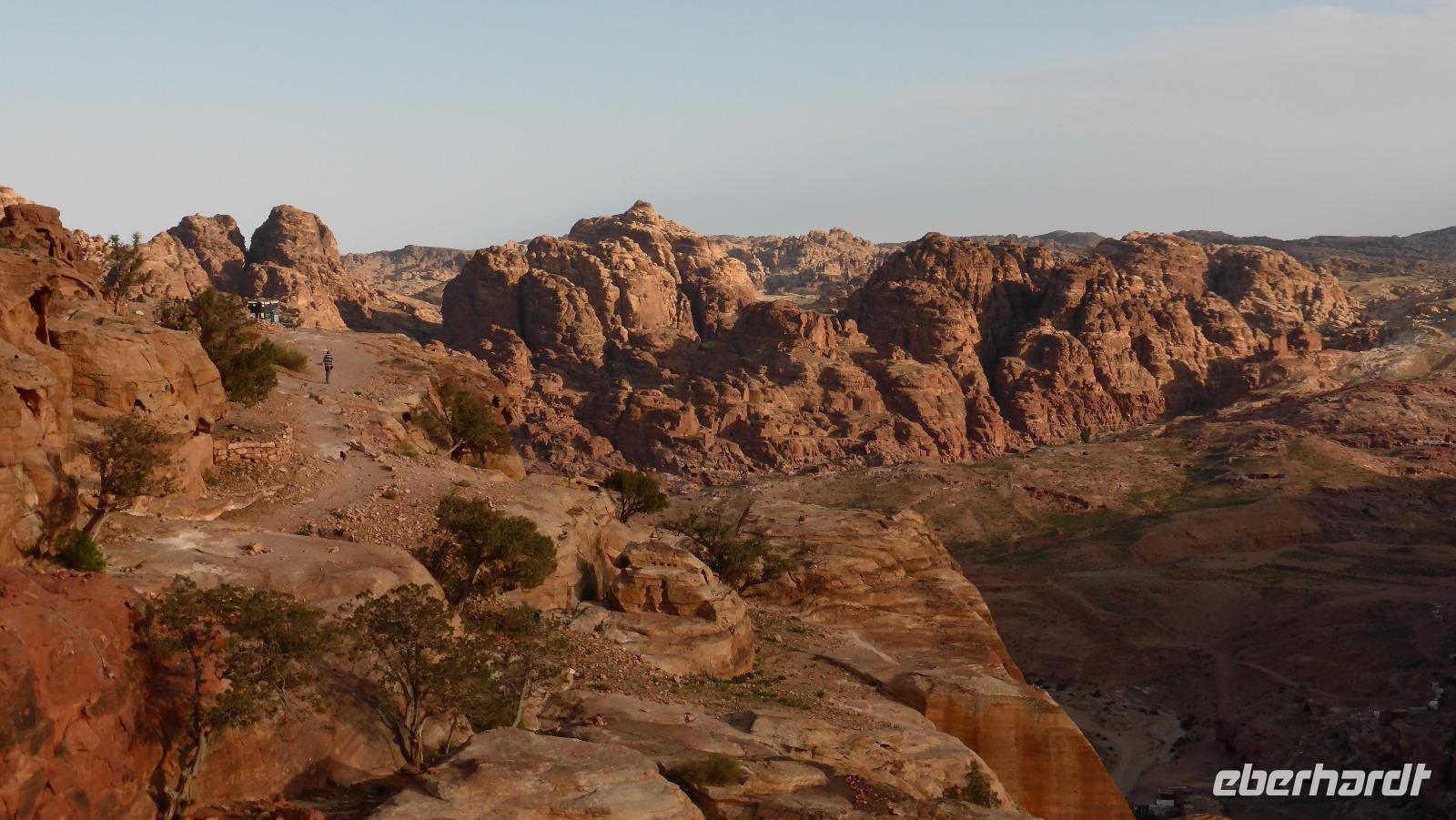 Oberhalb des Wadi Musa halten wir für einen letzten Blick auf die Felsen von Petra. Nur das Grab des Aaron, ein weißer Punkt auf einem Berggipfel, ist noch zu erkennen.