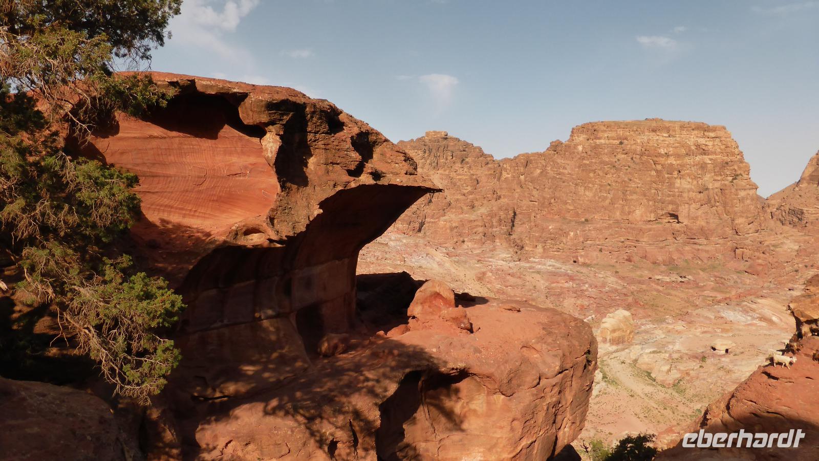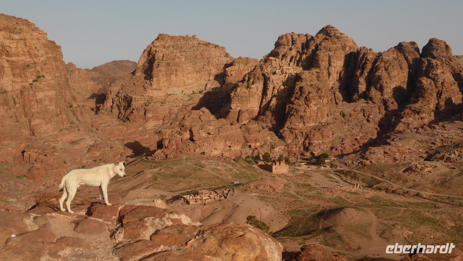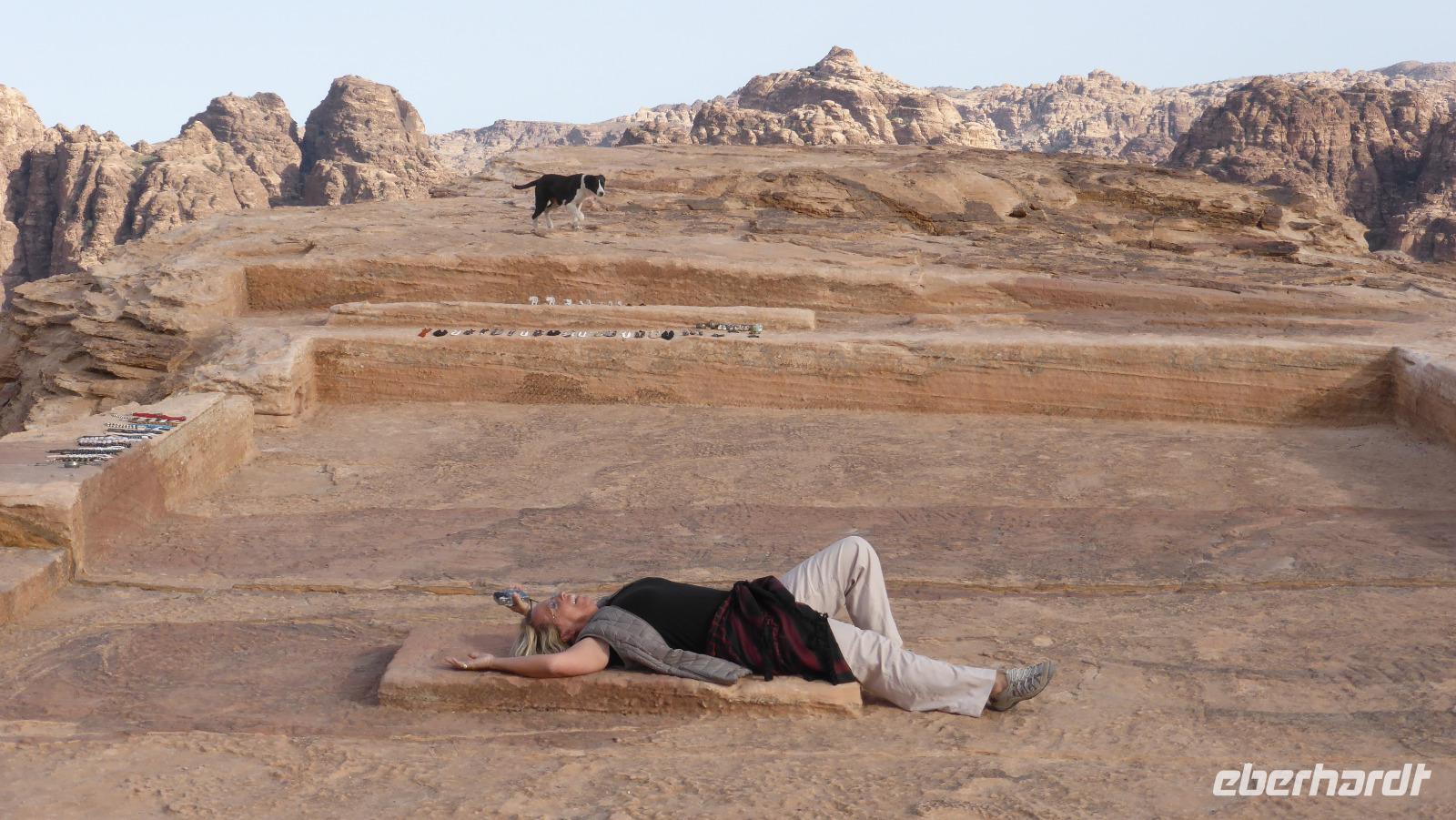 Die „Frühschicht" trifft sich kurz vor 6.00 Uhr in der Hotellobby. Wir sind zu sechst und betreten am frühen Morgen als Erste das historische Petra. Ganz allein sind wir am Schatzhaus, werfen aber nur einen flüchtigen Blick darauf, denn wir wollen hinauf auf den höchsten Punkt, den Opferplatz. Dafür sind über 800 Stufen zu überwinden. Von oben haben wir bei der noch tiefstehenden Morgensonne einen fantastischen Rundumblick. Dafür haben wir auf unser Frühstück im Hotel verzichtet und holen es jetzt am Opferplatz nach. Gestärkt beginnt der Abstieg auf einem anderen Weg Richtung Großer Tempel. Unsere etwas lästigen Begleiter, streuende Hunde, kommen auch mit. Unterwegs kommen wir immer wieder an fantasievollen farbigen Sandsteinformationen vorbei und hin und wieder tauchen steinerne Kunstwerke der Nabatäer auf (Löwenbrunnen, Renaissance- und Soldatengrab).