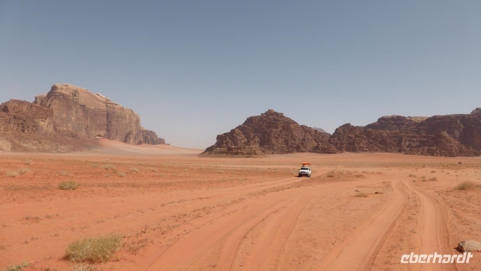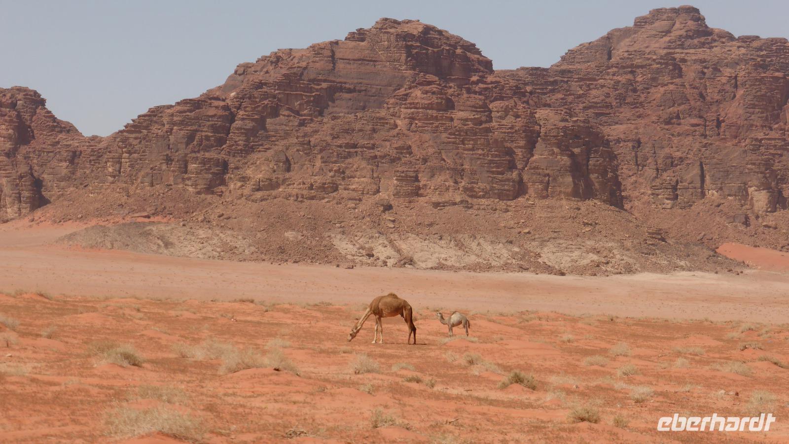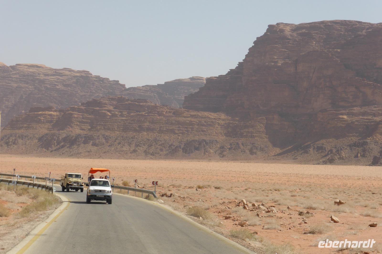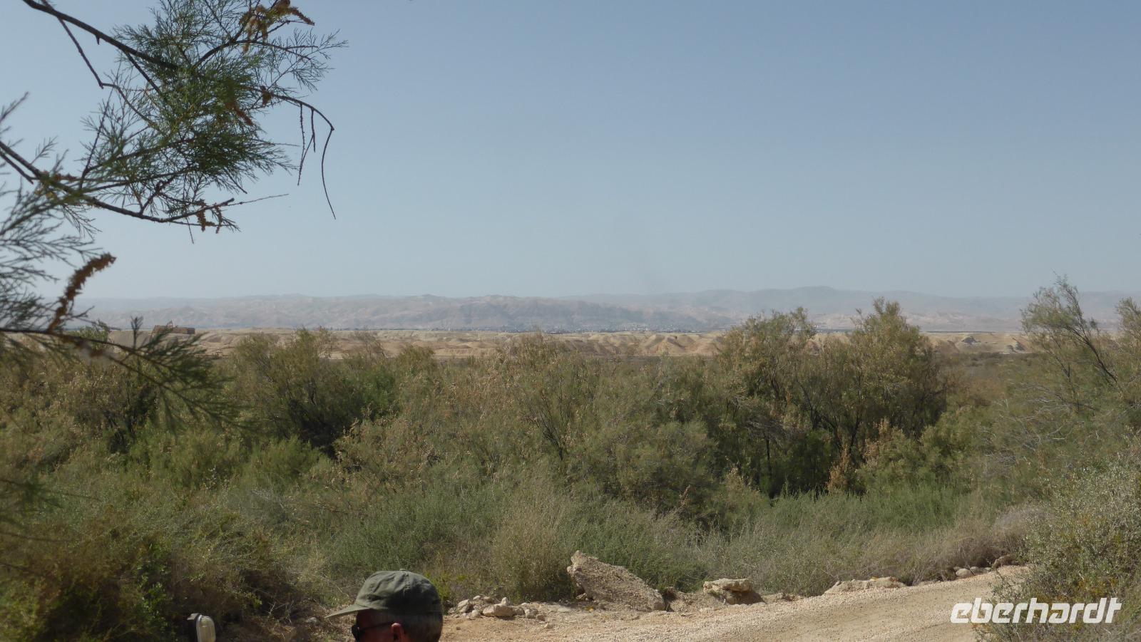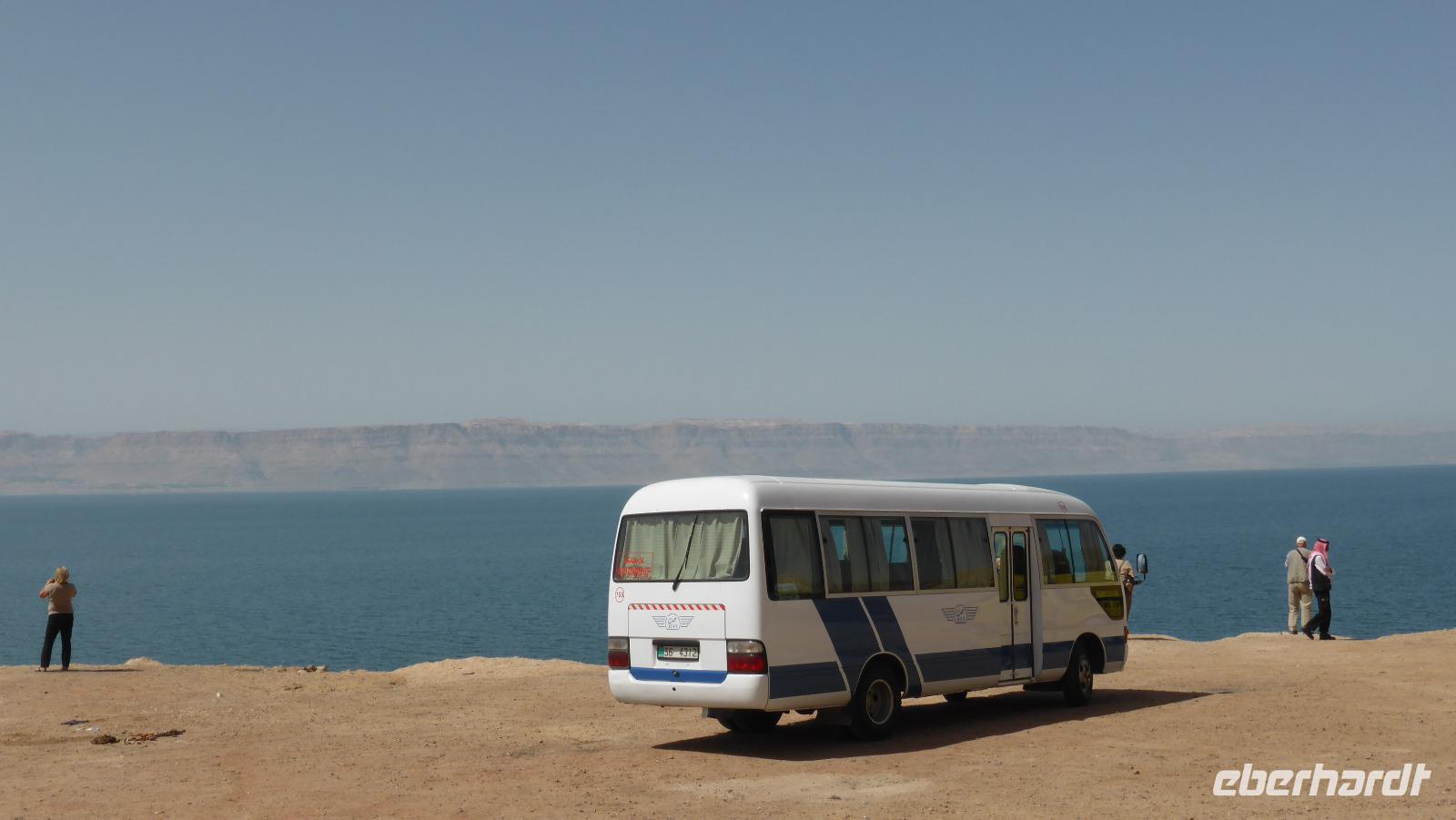 Am Morgen verlassen wir Aqaba. Im Morgenlicht kann man das benachbarte Elat in Israel gut erkennen. Durch das breite Wadi Araba fahren wir parallel zur israelischen Grenze nach Norden. Anfangs gleicht das Wadi einer Wüste, später wird es grüner. Wo Land bewässert wird, sehen wir Gemüsefelder und Gewächshäuser. Hier werden Gurken, Tomaten, Auberginen, Paprika, Kohl, Zwiebeln, Fenchel und sogar Bananen angebaut. Vor allem die Tomaten werden an vielen Straßenständen von Händlern zum Kauf angeboten. Nach rund drei Stunden sehen wir den südlichen Teil des Toten Meeres. Nachdem wir die Mündung des Wadi Mujib überquert haben, führt die Straße am Ufer des Toten Meeres entlang mit schönen Ausblicken auf das blaue Wasser und weiße Salzablagerungen am Ufer.
