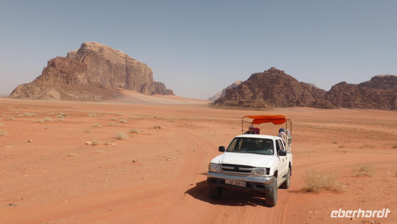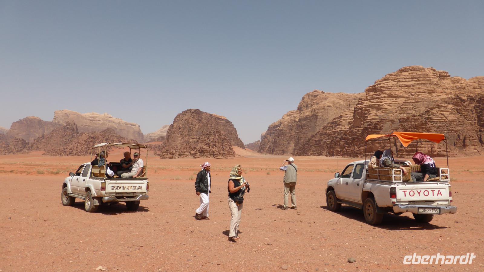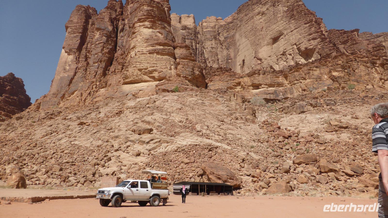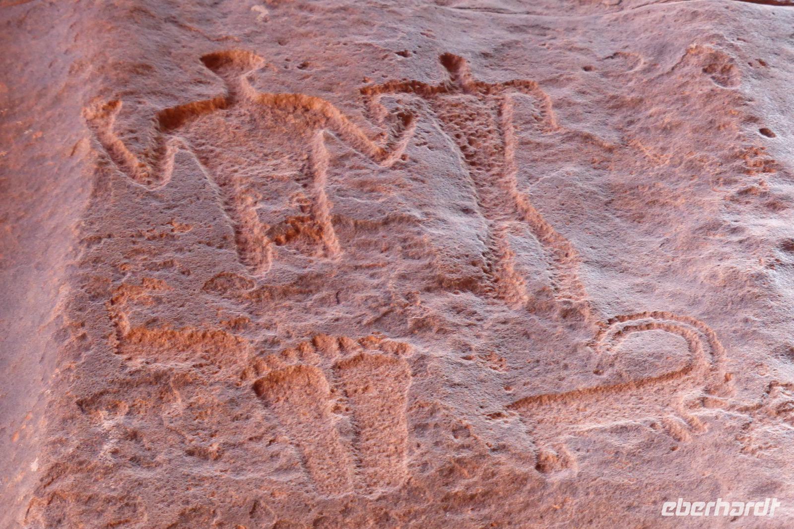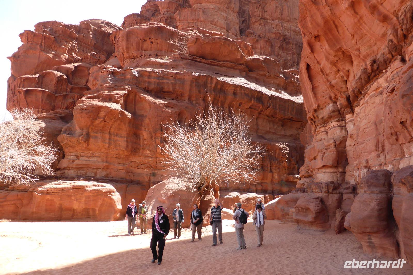 Eine Stunde später sind wir im Wadi Rum, bekannt durch Lawrence von Arabien, der 1917 hier war. 1962 diente dieses Wüstental als Kulisse für die Verfilmung seines Lebens und machte so diese Landschaft mit dem roten Sand, bizarren Felsen und mächtigen Bergen berühmt. Wir sind hier im Tal mit offenen Geländewagen unterwegs und halten an verschieden Stellen. Zuerst sind wir an der Lawrence Quelle. Hier befinden sich an einem Felsen Schriftzeichen, die man bis heute nicht entschlüsseln kann. Anschließend lädt uns Mahmoud zu einem Tee im Beduinenzelt ein. Dieses Mal gibt es eine interessante Mischung aus schwarzem Tee mit Salbei, Zimt und Kardamom. Nebenan tut sich im Fels eine kleine Schlucht (Siq) auf, in der sich Felszeichnungen mit Menschen und verschieden Tieren befinden. Schließlich halten wir noch an der sogenannten steinernen Brücke, welche die Natur in den Sandstein geformt hat.