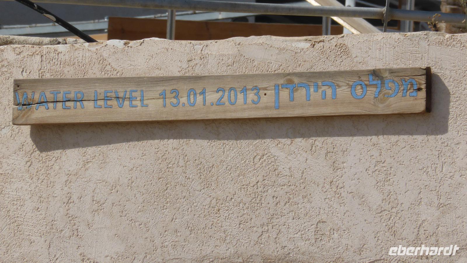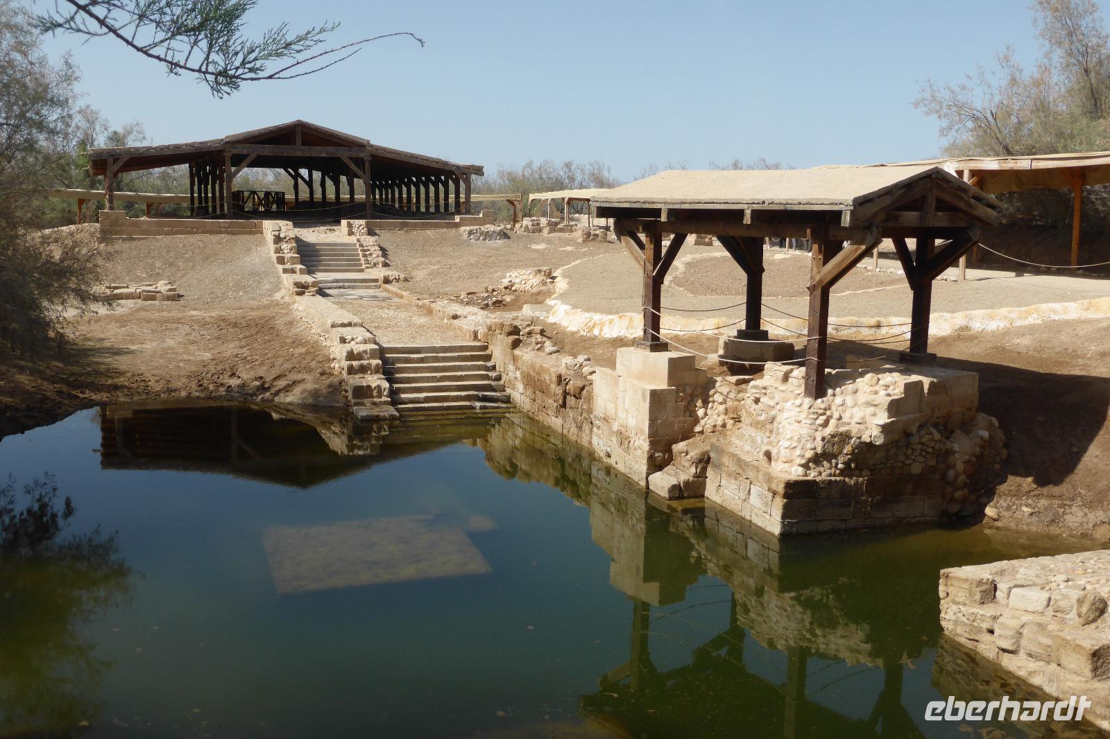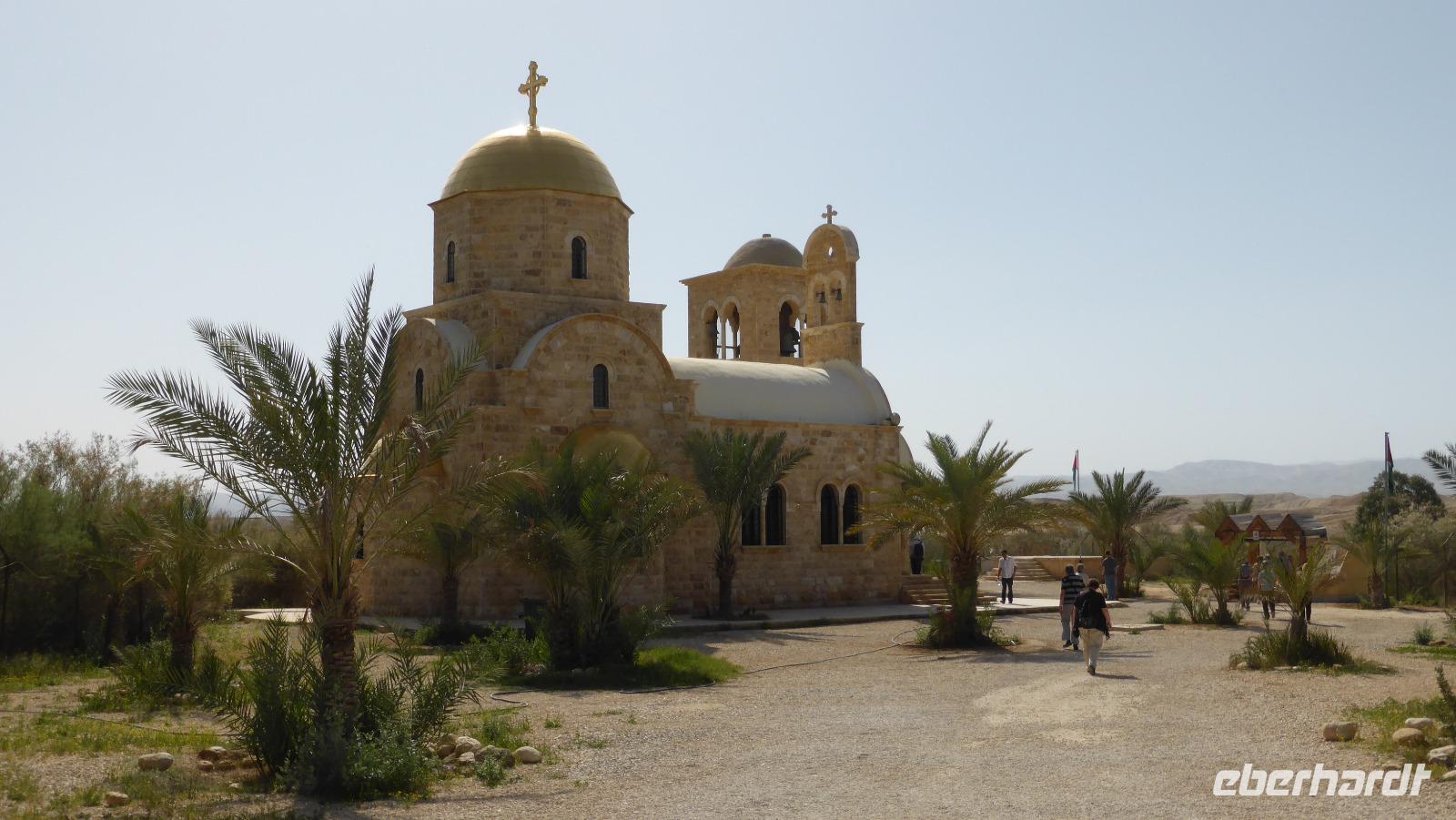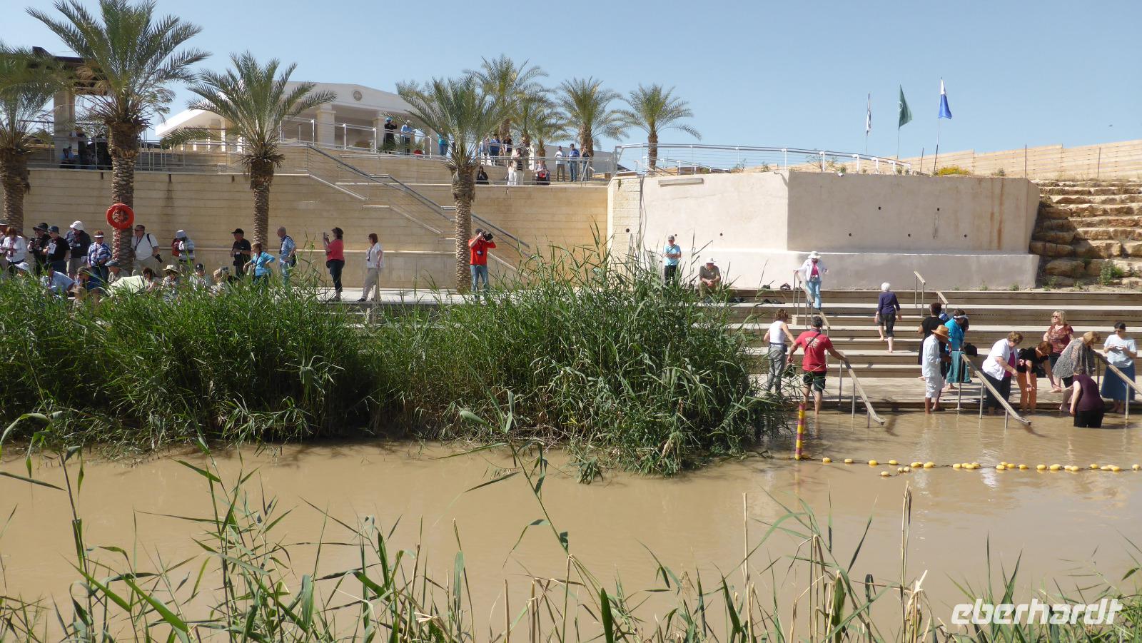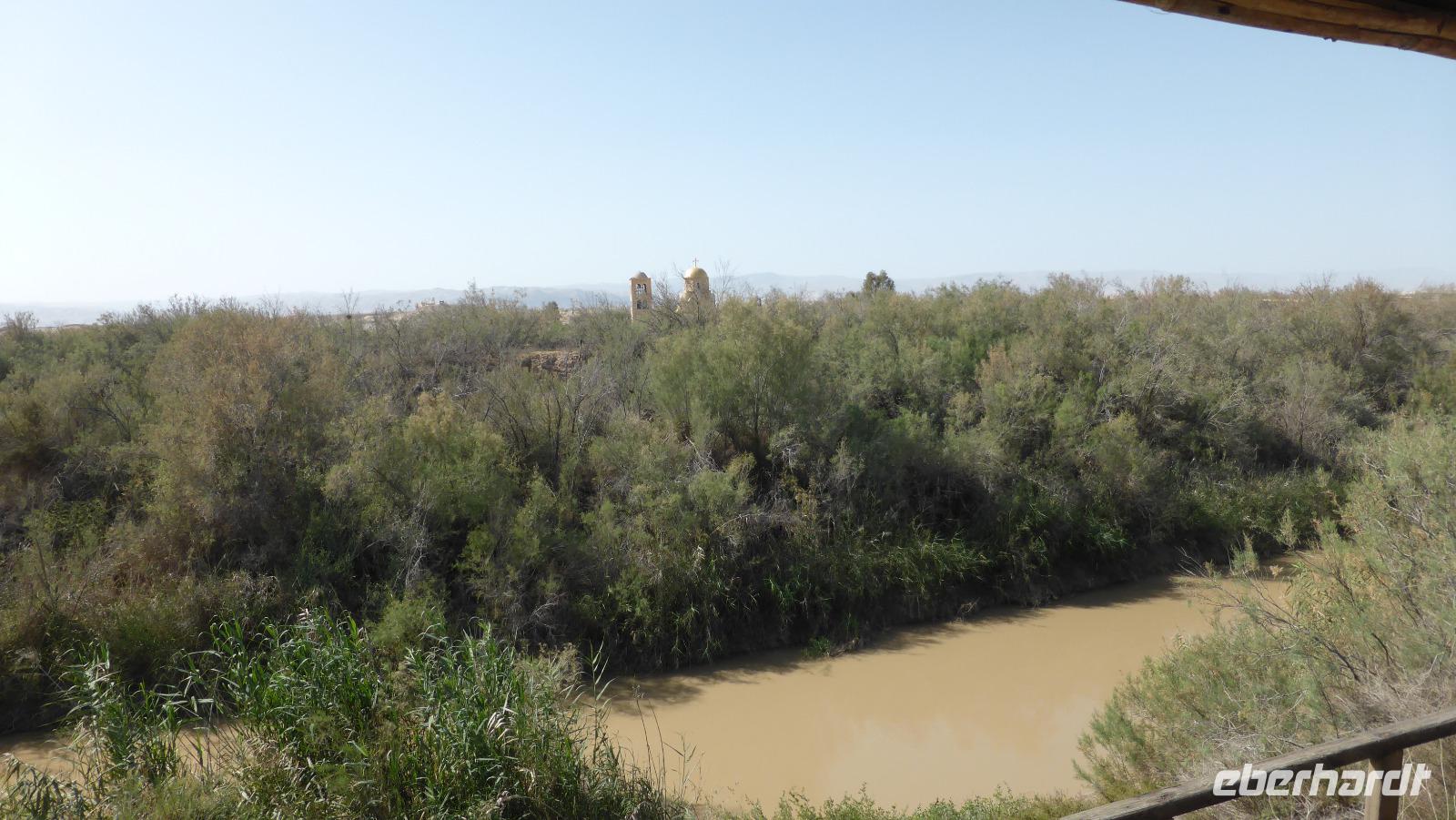 Im Ort Suweima befindet sich unser Hotel, welches wir bei der Vorbeifahrt schon mal flüchtig sehen. Zunächst wollen wir noch an den Jordanfluss fahren, zur Taufstelle von Jesus. Entlang der Johannesquelle laufen wir zu jener Stelle, wo Johannes der Täufer Jesus getauft haben soll. An diesem Ort wurde eine Kirche errichtet und nach jeden Erdbeben wieder aufgebaut. Auch der Papst war schon hier (Papst Johannes Paul der II im Jahr 2000). Der Jordanfluss hat im Laufe der Jahrhunderte seinen Lauf geändert. Und bildet heute den Grenzfluss zwischen Jordanien und dem von Israel besetzten Westjordanland. Für uns überraschend ist, dass wir direkt bis an den Jordan herankommen, 10 Meter gegenüber stehen die Besucher unter israelischer Flagge. Ein paar kleine Bojen in der Flußmitte markieren die Grenze. Es ist unser letzter Besichtigungspunkt.