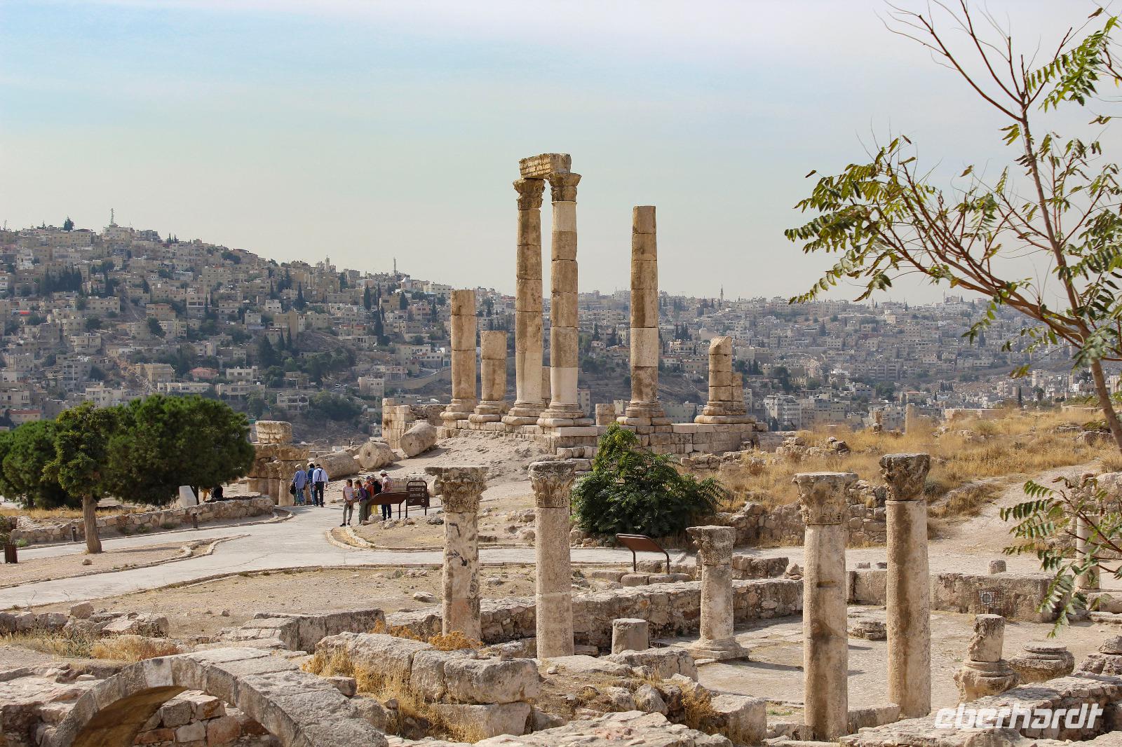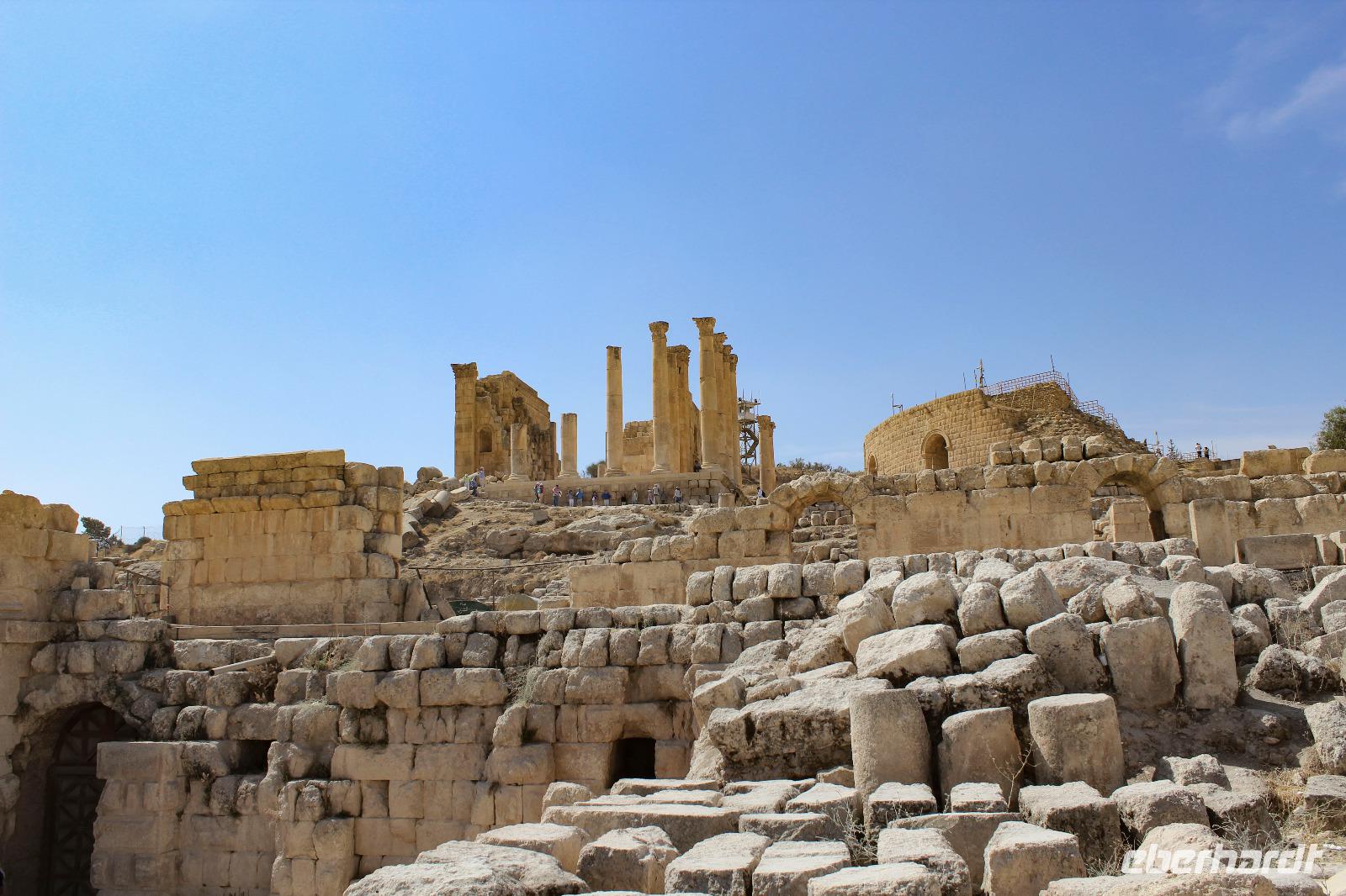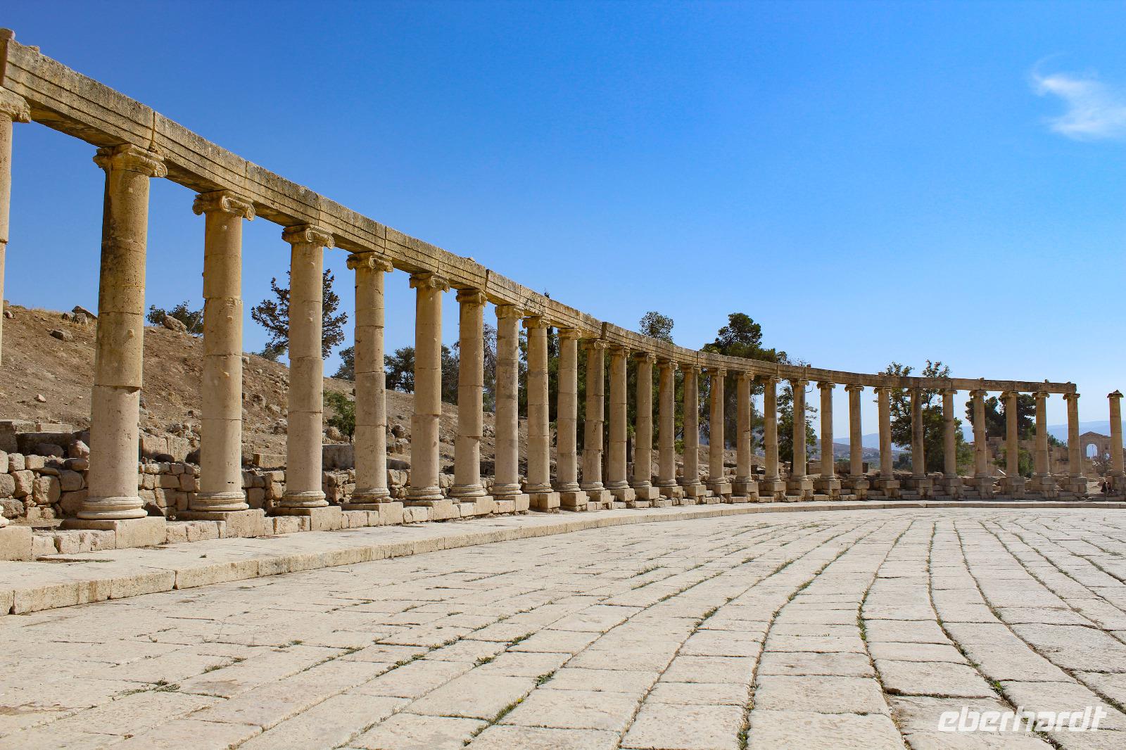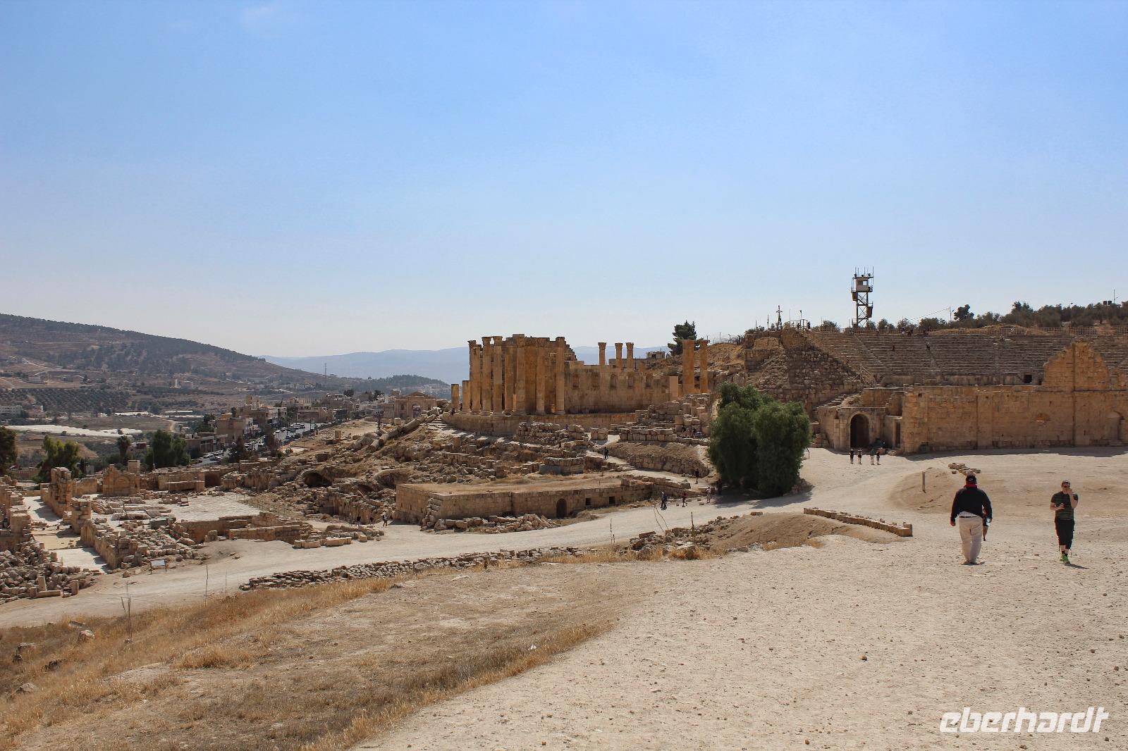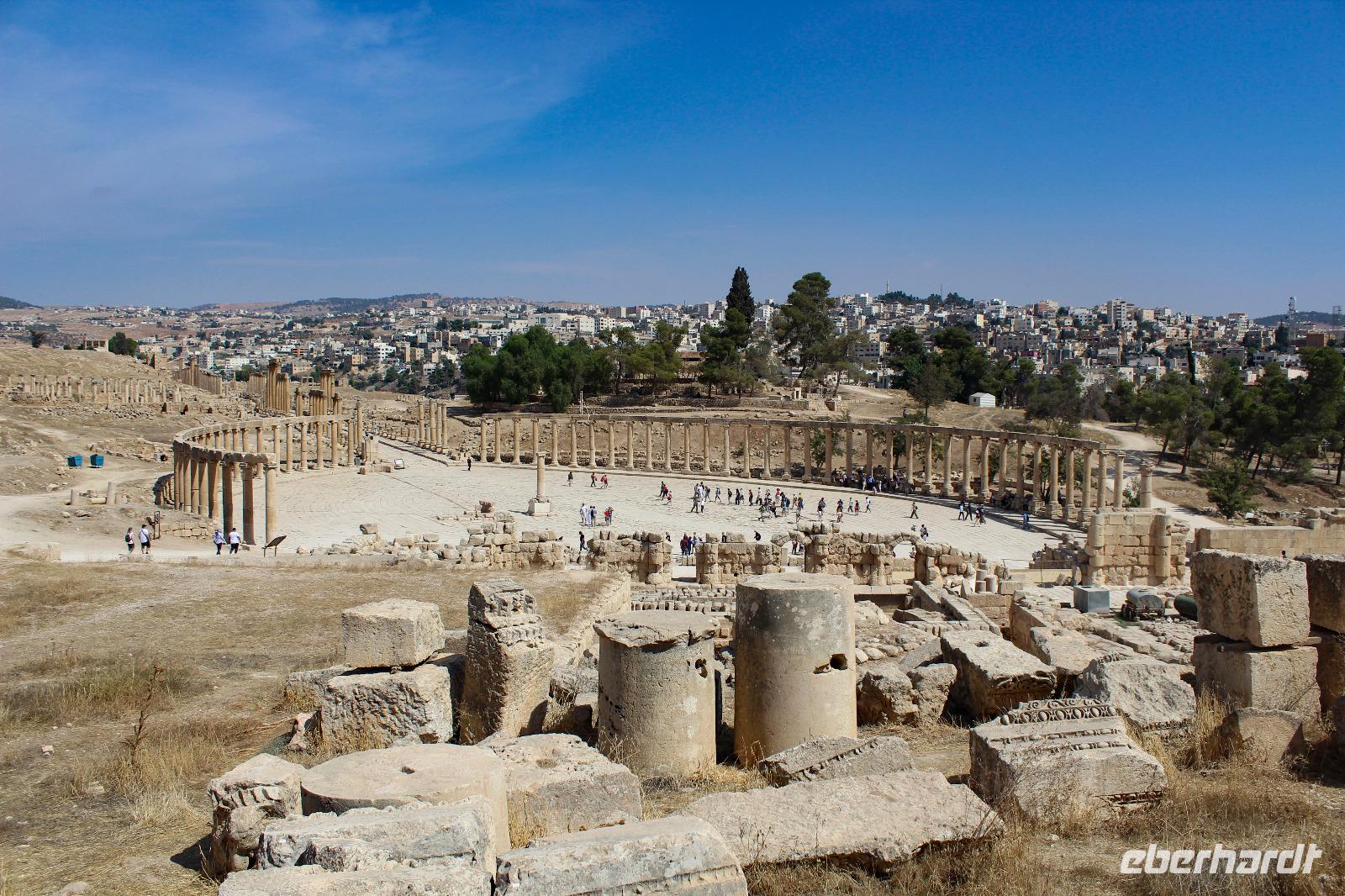 Nach dem Frühstück fahren wir in den Norden Jordaniens. Im Gegensatz zum Rest des Landes finden wir hier grüne Bäume und wir sehen einen deutlichen Kontrast zur Landschaft der letzten Tage. Viele Einheimische kommen am Wochenende hier her um sich zum Essen zu treffen. Aufgeforstete Pinien- und immergrüne Steineichenwälder spenden Schatten. Bei einem Fotostopp können wir schon den ersten guten Blick auf den Berg Qalaat ar-Rabad und die Festung von Ajlun erhaschen. Diese mittelalterliche Burg aus dem 12. Jahrhundert wurde zum Schutz der Pilger nach Mekka errichtet. Auf dem Rückweg halten wir in der antiken Stadt Jerash. Gemeinsam treten wir durch den Hadrian-Bogen und besichtigen den Zeus-Tempel und das Südtheater. Eine kleine Dudelsack-Kapelle spielt die schottische Nationalhymne und danach demonstriert Mahmoud uns die unglaubliche Akustik des Theaters. Egal wie hoch wir sitzen, wenn Mahmoud in der Mitte steht und zu uns spricht, können wir ihn alle hören. Weiter geht es zum Artemis-Tempel und dem Nordtheater, bis wir schließlich auf der von Säulen gesäumten Hauptstraße ankommen, welche uns wieder zurück zum Ovalen Platz führt. Bevor es zurück zum Hotel geht machen wir noch eine Pause in einem Restaurant in Jerash. Zurück in Amman haben alle noch ein wenig Freizeit bevor wir uns zum Abendessen treffen.