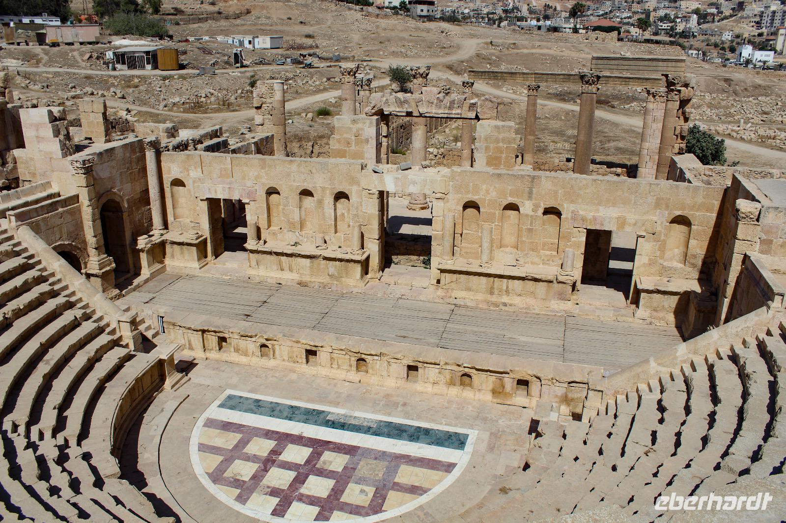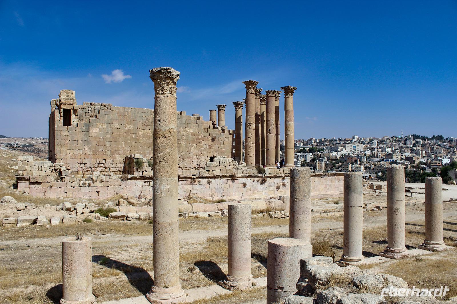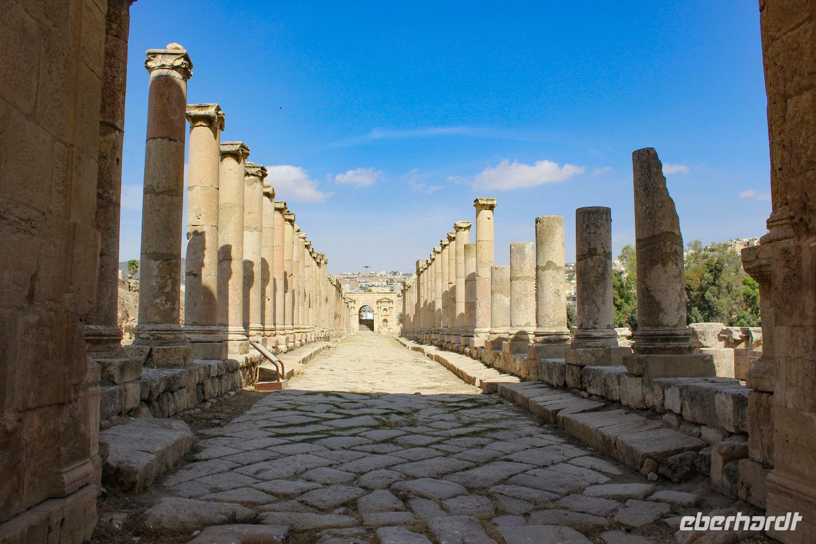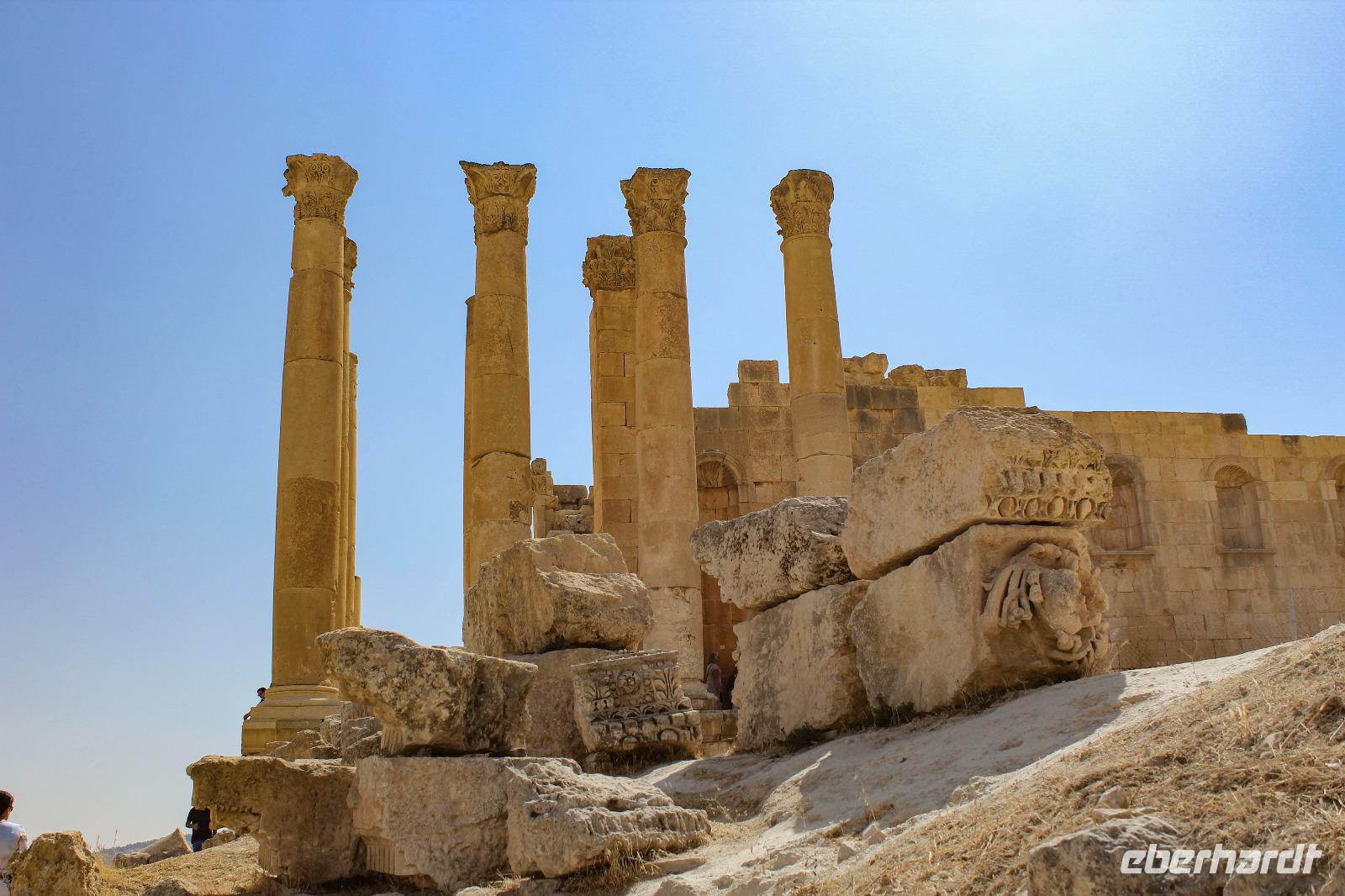 Nach dem Frühstück fahren wir in den Norden Jordaniens. Im Gegensatz zum Rest des Landes finden wir hier grüne Bäume und wir sehen einen deutlichen Kontrast zur Landschaft der letzten Tage. Viele Einheimische kommen am Wochenende hier her um sich zum Essen zu treffen. Aufgeforstete Pinien- und immergrüne Steineichenwälder spenden Schatten. Bei einem Fotostopp können wir schon den ersten guten Blick auf den Berg Qalaat ar-Rabad und die Festung von Ajlun erhaschen. Diese mittelalterliche Burg aus dem 12. Jahrhundert wurde zum Schutz der Pilger nach Mekka errichtet. Auf dem Rückweg halten wir in der antiken Stadt Jerash. Gemeinsam treten wir durch den Hadrian-Bogen und besichtigen den Zeus-Tempel und das Südtheater. Eine kleine Dudelsack-Kapelle spielt die schottische Nationalhymne und danach demonstriert Mahmoud uns die unglaubliche Akustik des Theaters. Egal wie hoch wir sitzen, wenn Mahmoud in der Mitte steht und zu uns spricht, können wir ihn alle hören. Weiter geht es zum Artemis-Tempel und dem Nordtheater, bis wir schließlich auf der von Säulen gesäumten Hauptstraße ankommen, welche uns wieder zurück zum Ovalen Platz führt. Bevor es zurück zum Hotel geht machen wir noch eine Pause in einem Restaurant in Jerash. Zurück in Amman haben alle noch ein wenig Freizeit bevor wir uns zum Abendessen treffen.