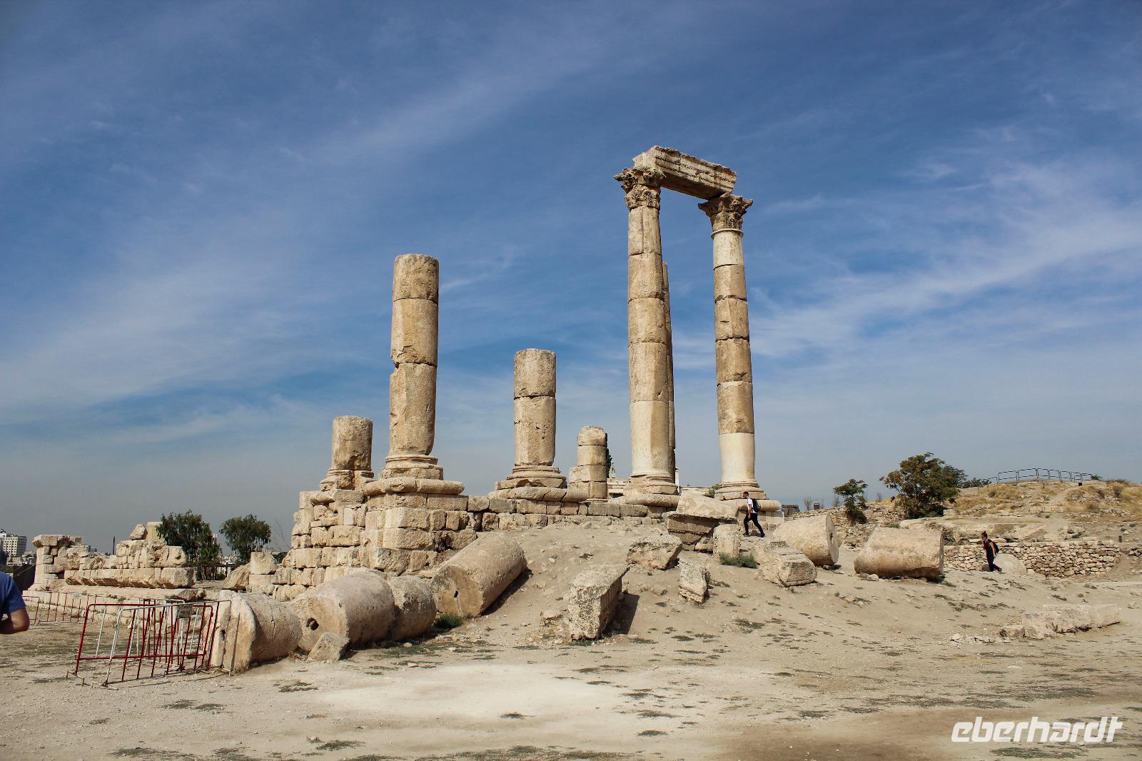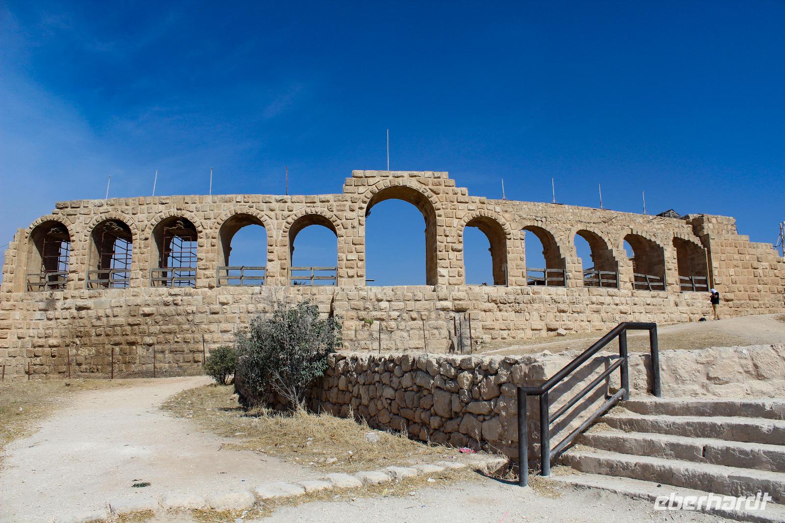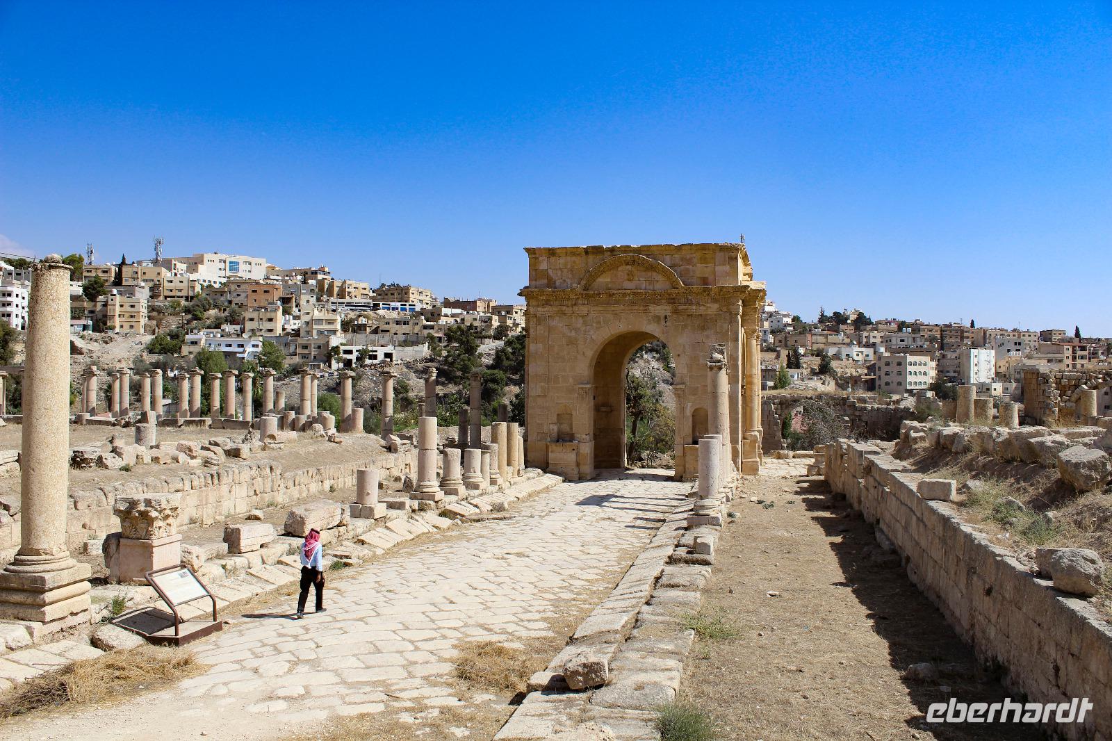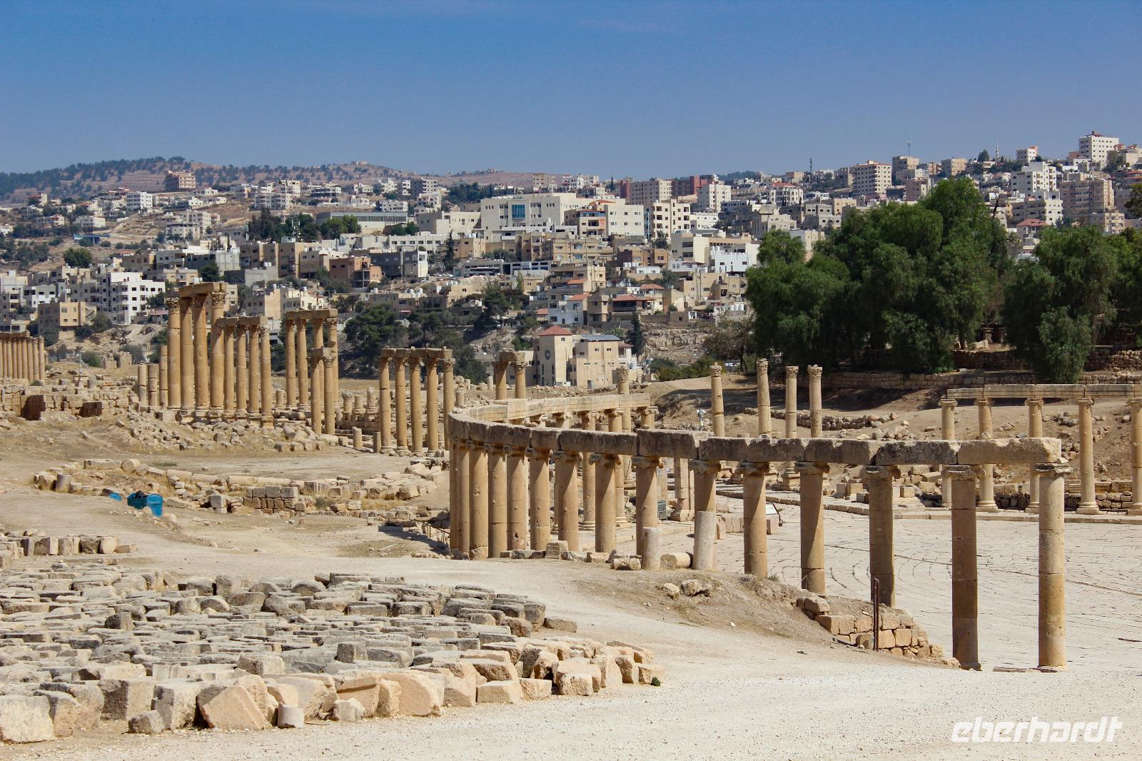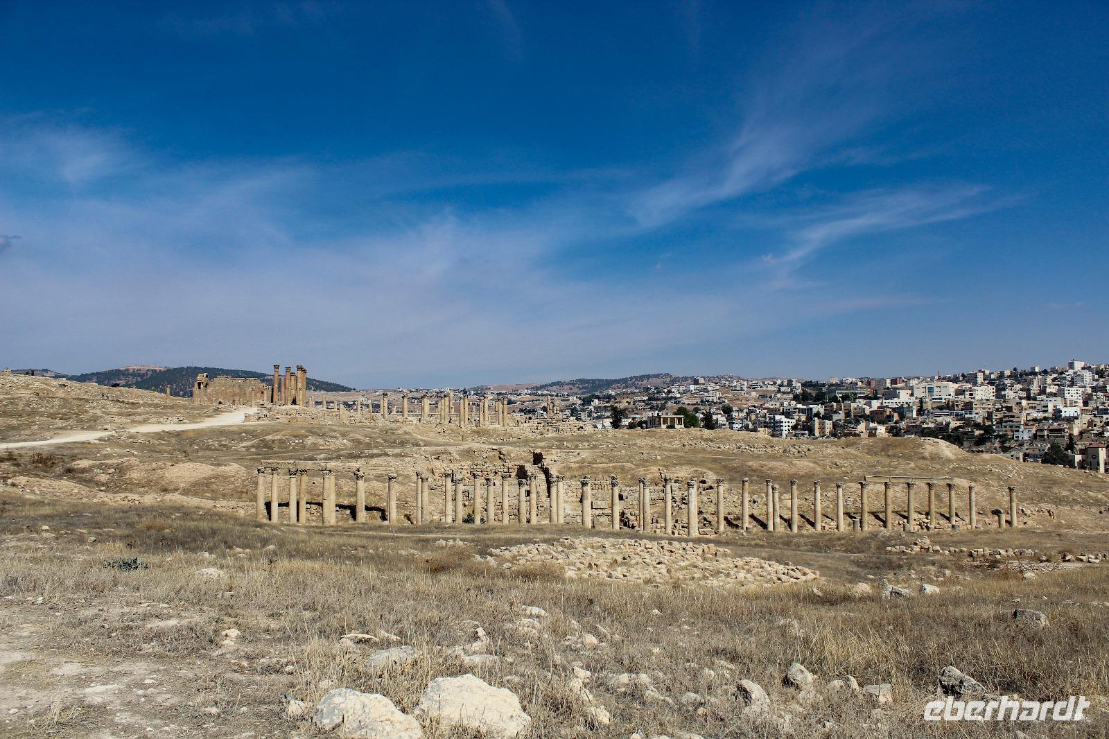 Nach dem Frühstück fahren wir in den Norden Jordaniens. Im Gegensatz zum Rest des Landes finden wir hier grüne Bäume und wir sehen einen deutlichen Kontrast zur Landschaft der letzten Tage. Viele Einheimische kommen am Wochenende hier her um sich zum Essen zu treffen. Aufgeforstete Pinien- und immergrüne Steineichenwälder spenden Schatten. Bei einem Fotostopp können wir schon den ersten guten Blick auf den Berg Qalaat ar-Rabad und die Festung von Ajlun erhaschen. Diese mittelalterliche Burg aus dem 12. Jahrhundert wurde zum Schutz der Pilger nach Mekka errichtet. Auf dem Rückweg halten wir in der antiken Stadt Jerash. Gemeinsam treten wir durch den Hadrian-Bogen und besichtigen den Zeus-Tempel und das Südtheater. Eine kleine Dudelsack-Kapelle spielt die schottische Nationalhymne und danach demonstriert Mahmoud uns die unglaubliche Akustik des Theaters. Egal wie hoch wir sitzen, wenn Mahmoud in der Mitte steht und zu uns spricht, können wir ihn alle hören. Weiter geht es zum Artemis-Tempel und dem Nordtheater, bis wir schließlich auf der von Säulen gesäumten Hauptstraße ankommen, welche uns wieder zurück zum Ovalen Platz führt. Bevor es zurück zum Hotel geht machen wir noch eine Pause in einem Restaurant in Jerash. Zurück in Amman haben alle noch ein wenig Freizeit bevor wir uns zum Abendessen treffen.