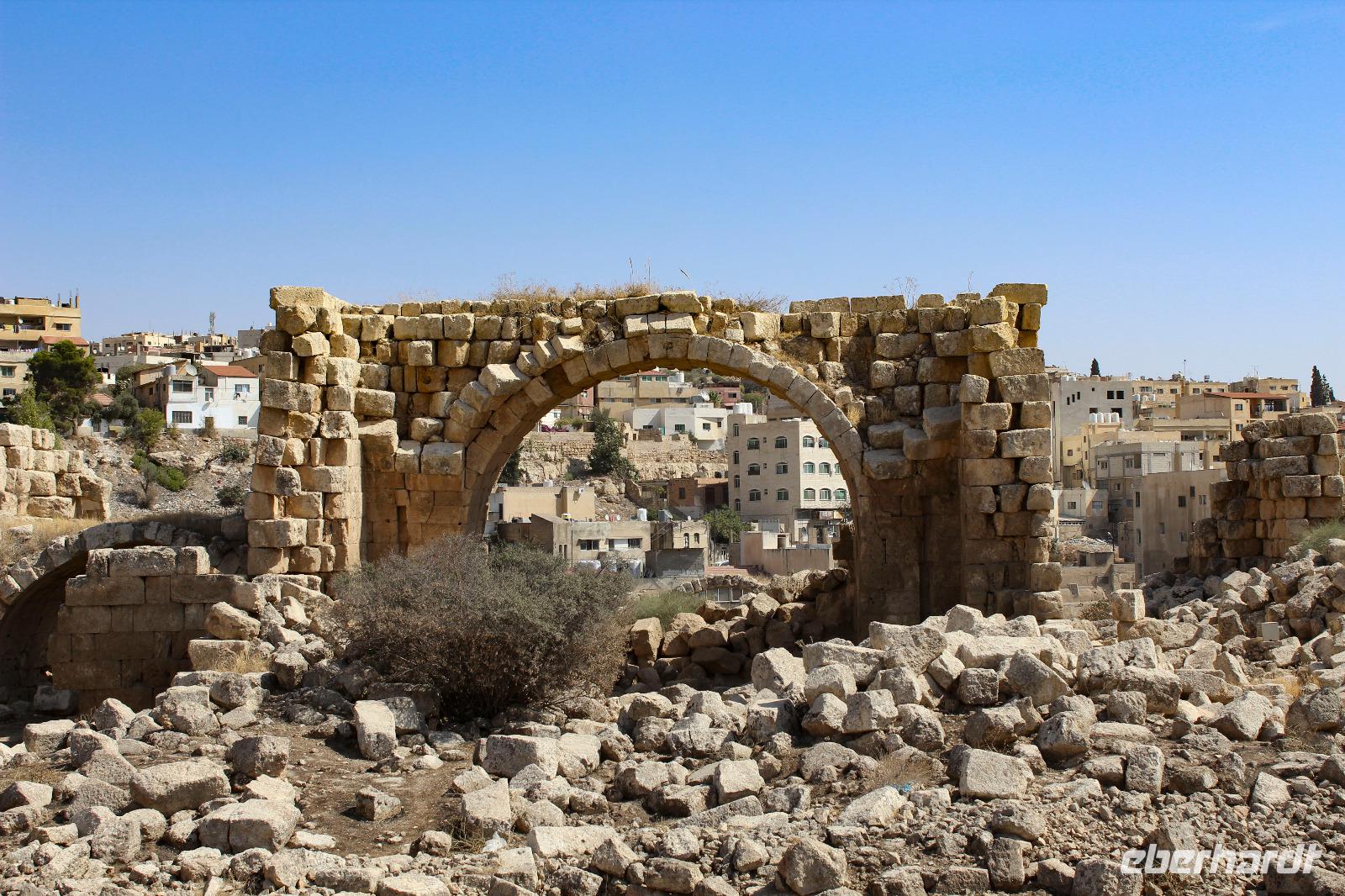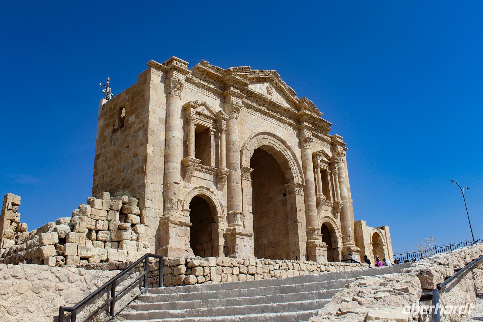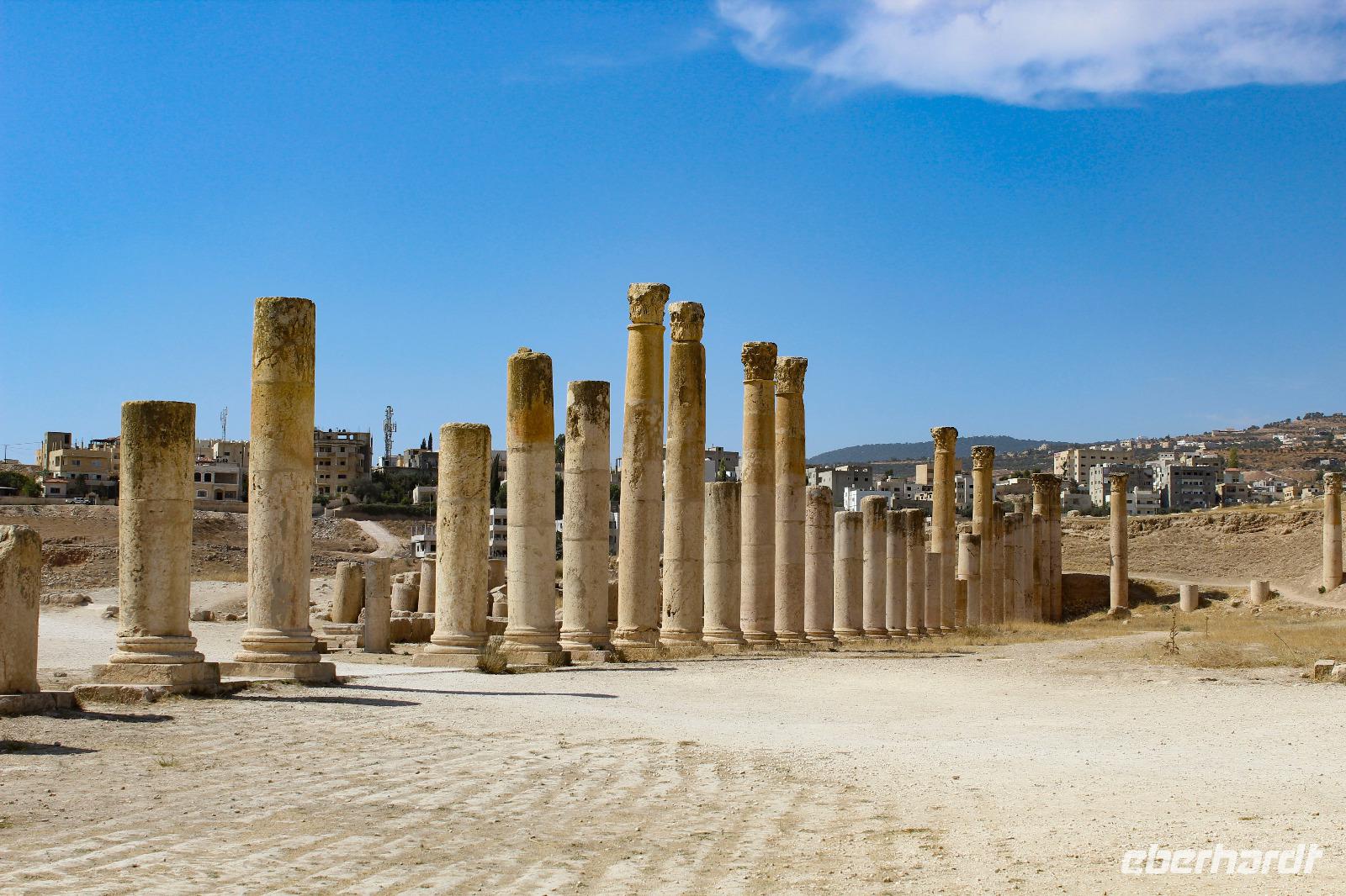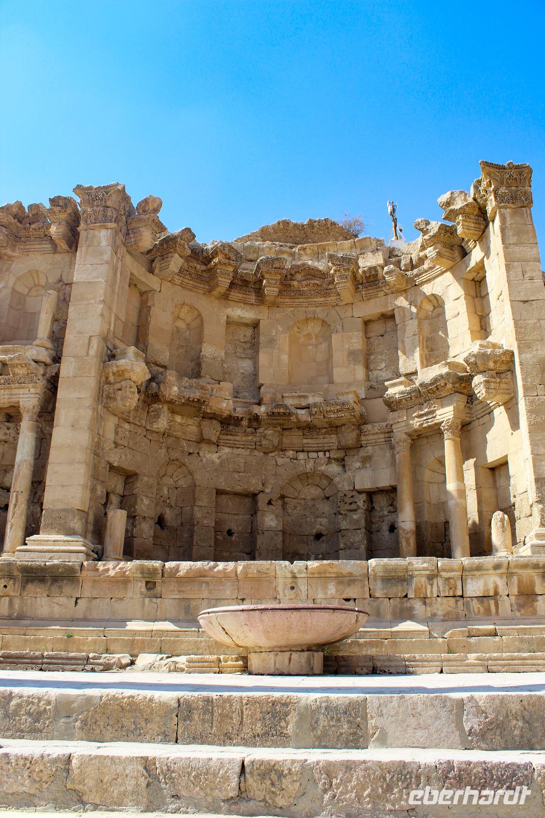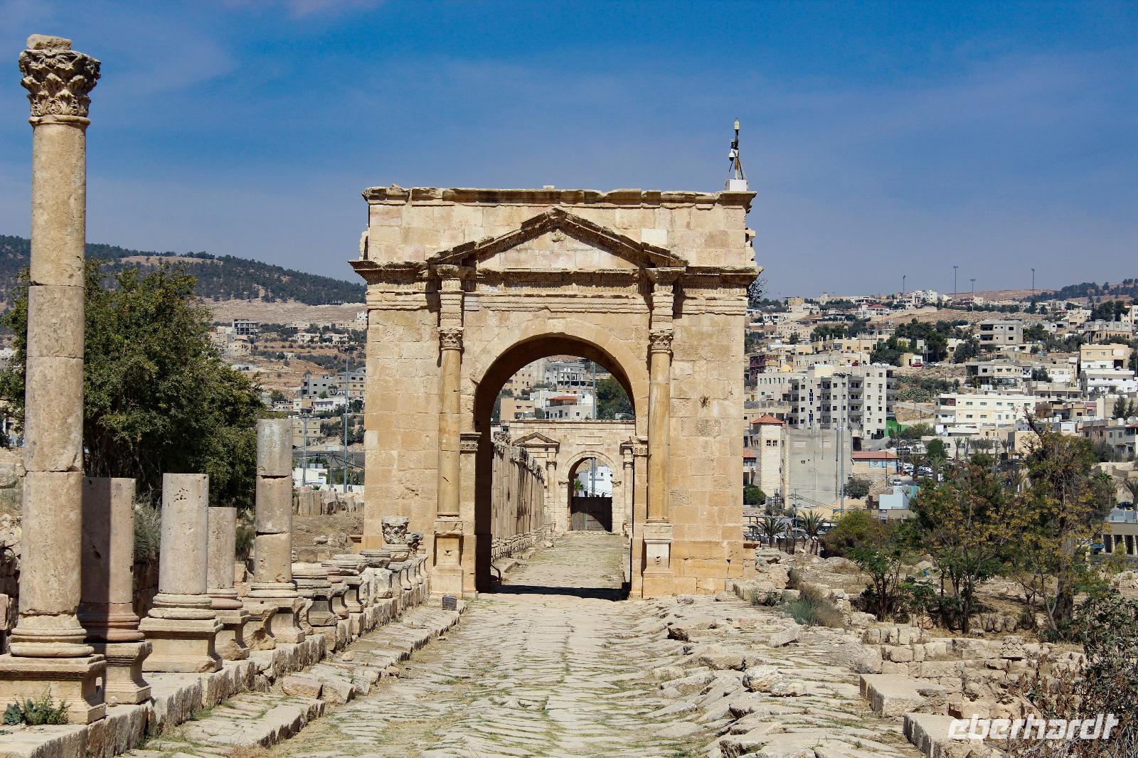 Nach dem Frühstück fahren wir in den Norden Jordaniens. Im Gegensatz zum Rest des Landes finden wir hier grüne Bäume und wir sehen einen deutlichen Kontrast zur Landschaft der letzten Tage. Viele Einheimische kommen am Wochenende hier her um sich zum Essen zu treffen. Aufgeforstete Pinien- und immergrüne Steineichenwälder spenden Schatten. Bei einem Fotostopp können wir schon den ersten guten Blick auf den Berg Qalaat ar-Rabad und die Festung von Ajlun erhaschen. Diese mittelalterliche Burg aus dem 12. Jahrhundert wurde zum Schutz der Pilger nach Mekka errichtet. Auf dem Rückweg halten wir in der antiken Stadt Jerash. Gemeinsam treten wir durch den Hadrian-Bogen und besichtigen den Zeus-Tempel und das Südtheater. Eine kleine Dudelsack-Kapelle spielt die schottische Nationalhymne und danach demonstriert Mahmoud uns die unglaubliche Akustik des Theaters. Egal wie hoch wir sitzen, wenn Mahmoud in der Mitte steht und zu uns spricht, können wir ihn alle hören. Weiter geht es zum Artemis-Tempel und dem Nordtheater, bis wir schließlich auf der von Säulen gesäumten Hauptstraße ankommen, welche uns wieder zurück zum Ovalen Platz führt. Bevor es zurück zum Hotel geht machen wir noch eine Pause in einem Restaurant in Jerash. Zurück in Amman haben alle noch ein wenig Freizeit bevor wir uns zum Abendessen treffen.