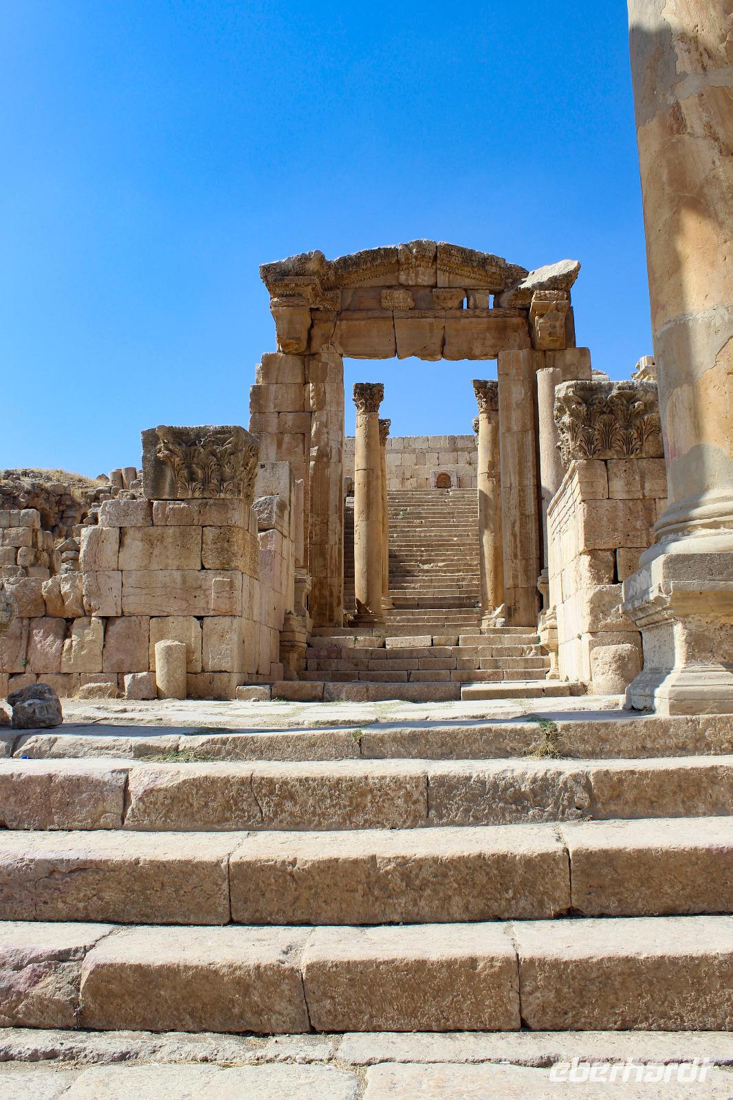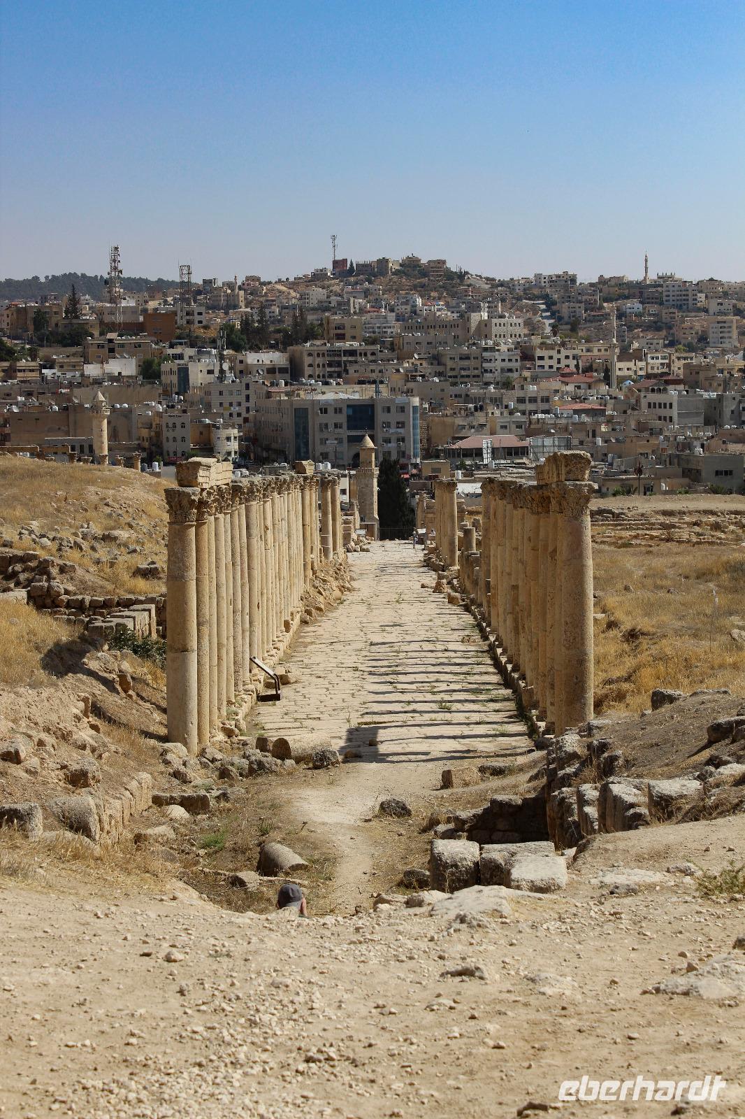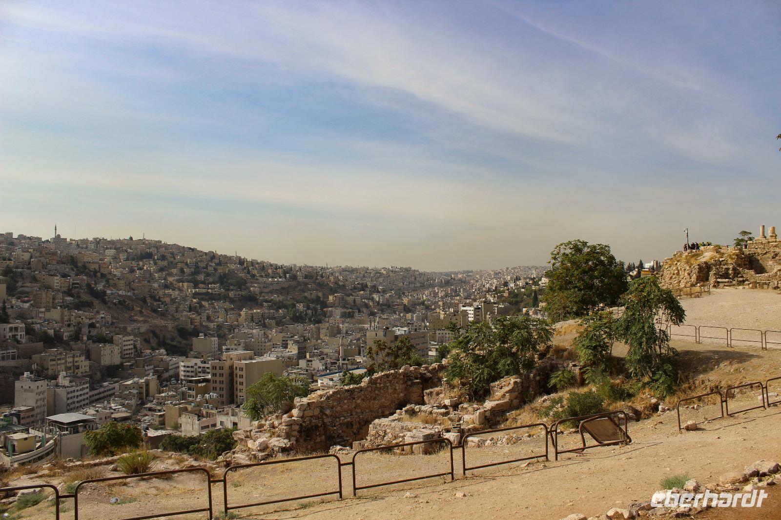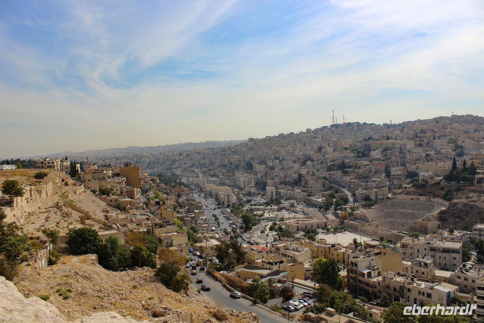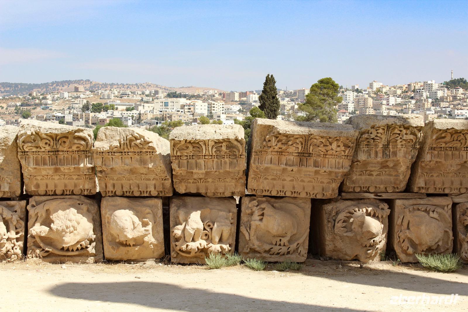 Nach dem Frühstück fahren wir in den Norden Jordaniens. Im Gegensatz zum Rest des Landes finden wir hier grüne Bäume und wir sehen einen deutlichen Kontrast zur Landschaft der letzten Tage. Viele Einheimische kommen am Wochenende hier her um sich zum Essen zu treffen. Aufgeforstete Pinien- und immergrüne Steineichenwälder spenden Schatten. Bei einem Fotostopp können wir schon den ersten guten Blick auf den Berg Qalaat ar-Rabad und die Festung von Ajlun erhaschen. Diese mittelalterliche Burg aus dem 12. Jahrhundert wurde zum Schutz der Pilger nach Mekka errichtet. Auf dem Rückweg halten wir in der antiken Stadt Jerash. Gemeinsam treten wir durch den Hadrian-Bogen und besichtigen den Zeus-Tempel und das Südtheater. Eine kleine Dudelsack-Kapelle spielt die schottische Nationalhymne und danach demonstriert Mahmoud uns die unglaubliche Akustik des Theaters. Egal wie hoch wir sitzen, wenn Mahmoud in der Mitte steht und zu uns spricht, können wir ihn alle hören. Weiter geht es zum Artemis-Tempel und dem Nordtheater, bis wir schließlich auf der von Säulen gesäumten Hauptstraße ankommen, welche uns wieder zurück zum Ovalen Platz führt. Bevor es zurück zum Hotel geht machen wir noch eine Pause in einem Restaurant in Jerash. Zurück in Amman haben alle noch ein wenig Freizeit bevor wir uns zum Abendessen treffen.