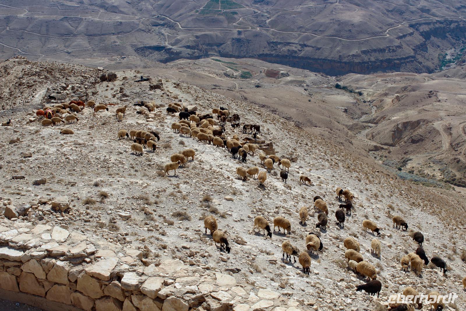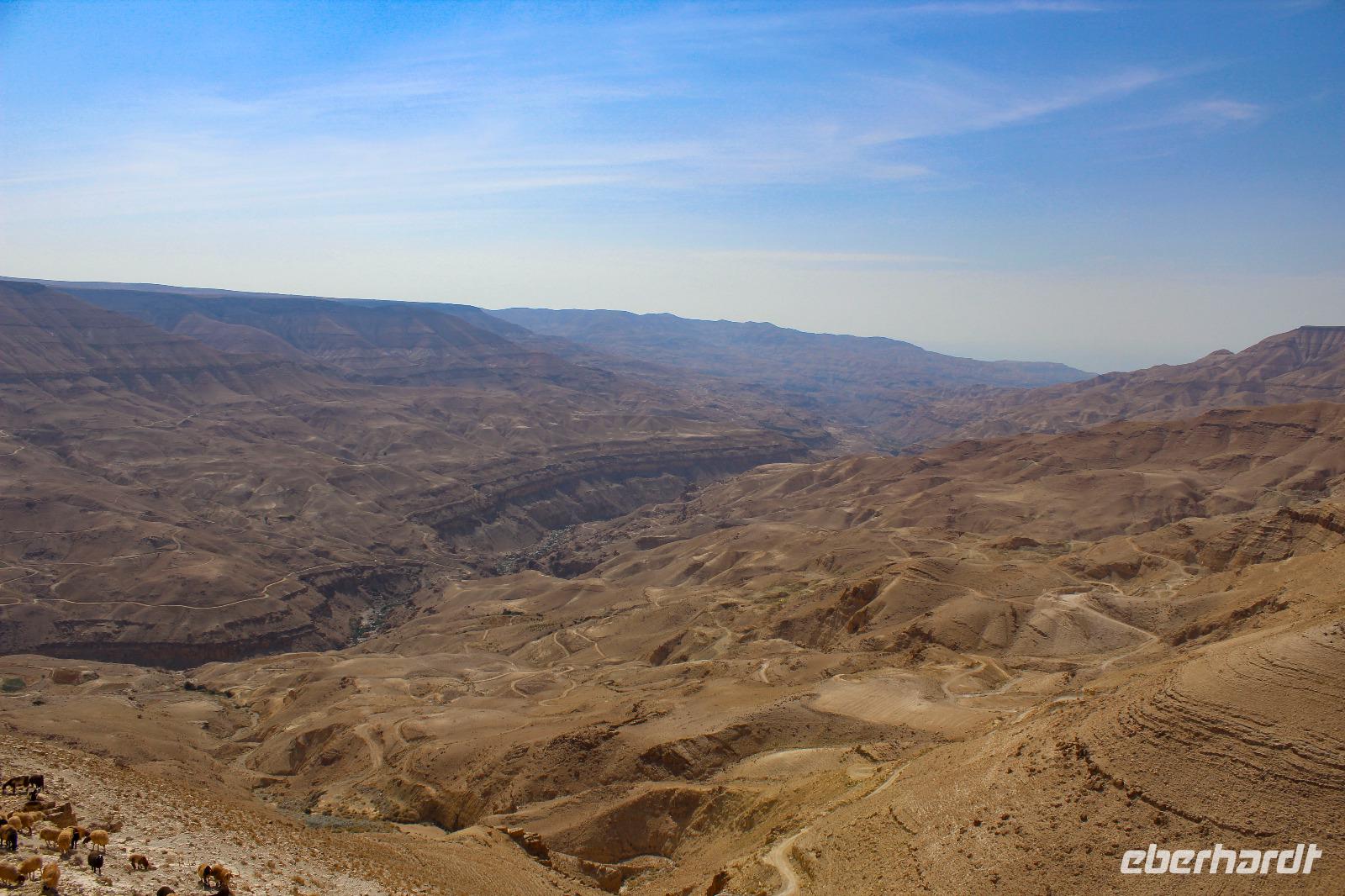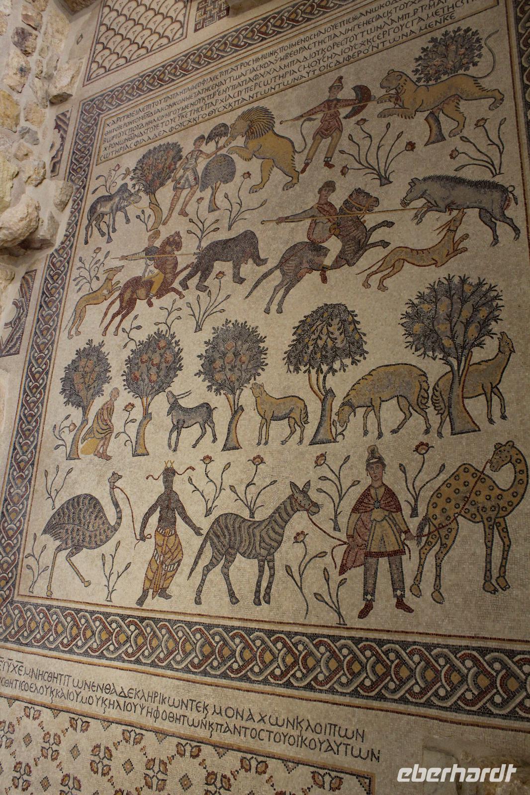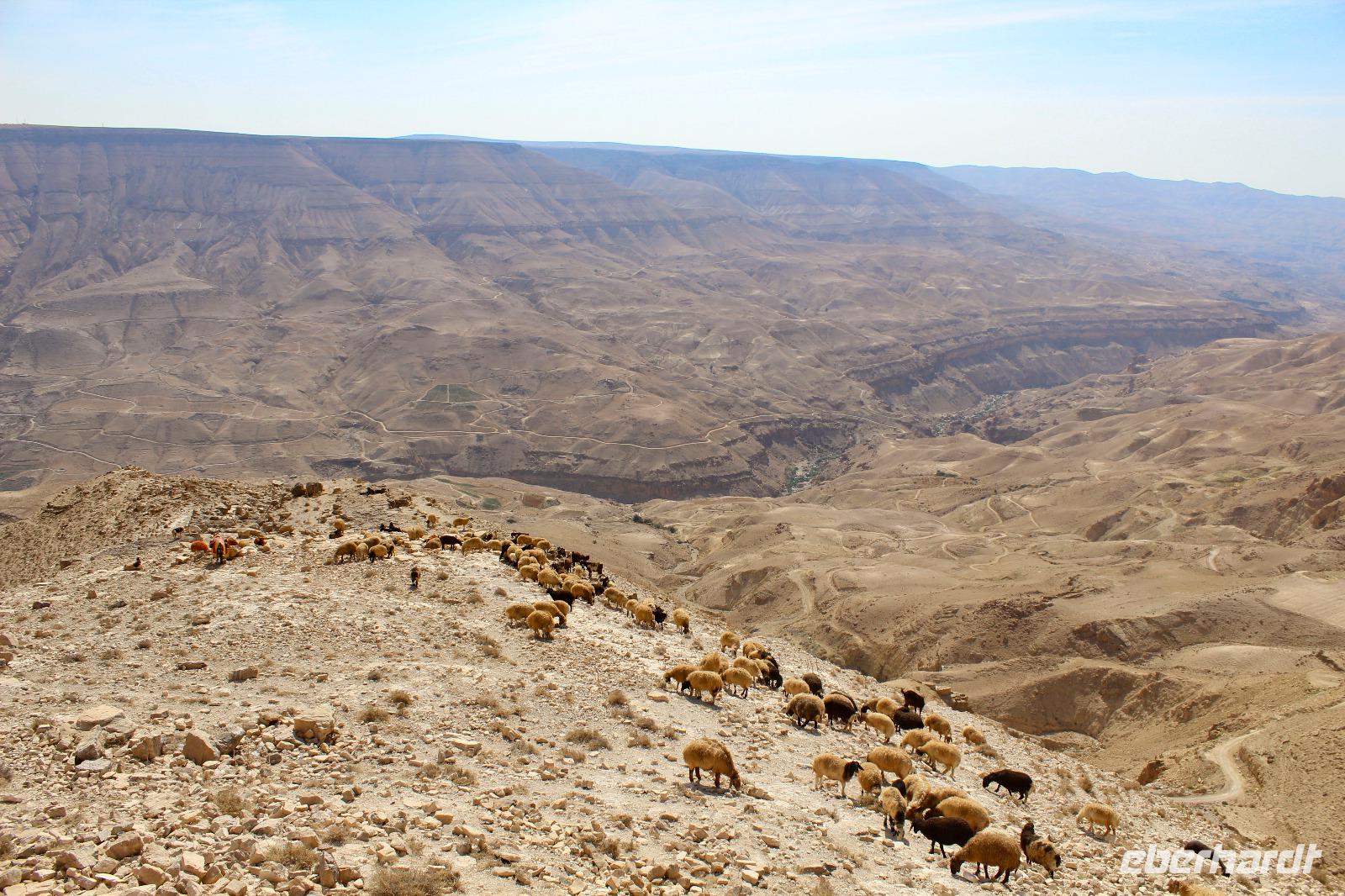 Am heutigen Tag unserer Rundreise bewegen wir uns auf den Spuren Moses. Auf dem Berg Nebo soll er nicht nur gestanden haben, sondern auch begraben sein. Hier angekommen bietet sich uns ein toller Ausblick: das Jordantal. Die Sicht ist heute nicht die Beste, doch Mahmud erzählt uns, in welcher Richtung sich Amman, der Jordan und die antike Stadt Jericho befinden. Im Museum deckt Mahmoud noch den geschichtlichen Teil ab und danach gehen wir in die Kirche in welcher wir gut erhaltene Mosaike bewundern können. Ein weiteres sehr beeindruckendes Mosaik finden wir in der Kirche von Madaba, dem Zentrum der Mosaikkunst in Jordanien. In der Kirche des Heiligen Georg befindet sich eine Landkarte von Palästina welche Ursprünglich aus 2,3 Mio. Steinen bestand. Bevor wir die Kirche betreten erklärt uns Mahmoud an einer großen Tafel die Besonderheiten der Landkarte. In der Kirche selbst sehen wir uns die erhaltenen Stücke an. Im Anschluss gibt es noch ein leckeres Mittagessen in einem kleinen Familienrestaurant. Auf unserer Fahrt nach Petra machen wir noch einen Fotostopp am Wadi Mujib, dem „Grand Canyon von Jordanien". Eine Serpentinenstraße bahnt sich den Weg an einem Stausee vorbei und überall begegnen uns Ziegen und Schafe. Von Mahmoud erfahren wir vieles über die Flora und Fauna dieses Landstriches. Unser nächster Stopp ist der Ort Kerak mit seiner beeindruckenden Kreuzritterfestung. Im Laufe der Jahrhunderte haben auf dieser Festung viele Grausamkeiten stattgefunden bis sie schließlich 1188 nach 8-monatiger Belagerung fiel. Nach der Besichtigung treten wir die letzte Fahrt des heutigen Tages an. Am Abend erreichen wir unser Hotel, welches direkt am Eingang der berühmten Felsenstadt Petra liegt.