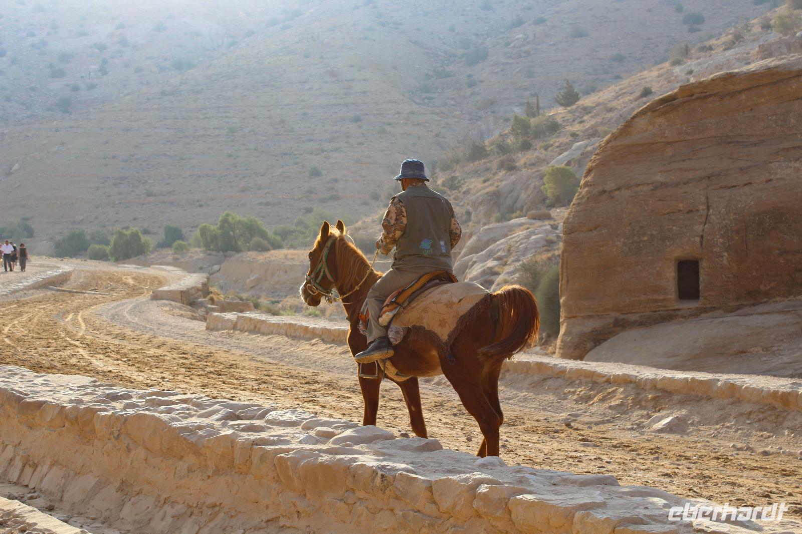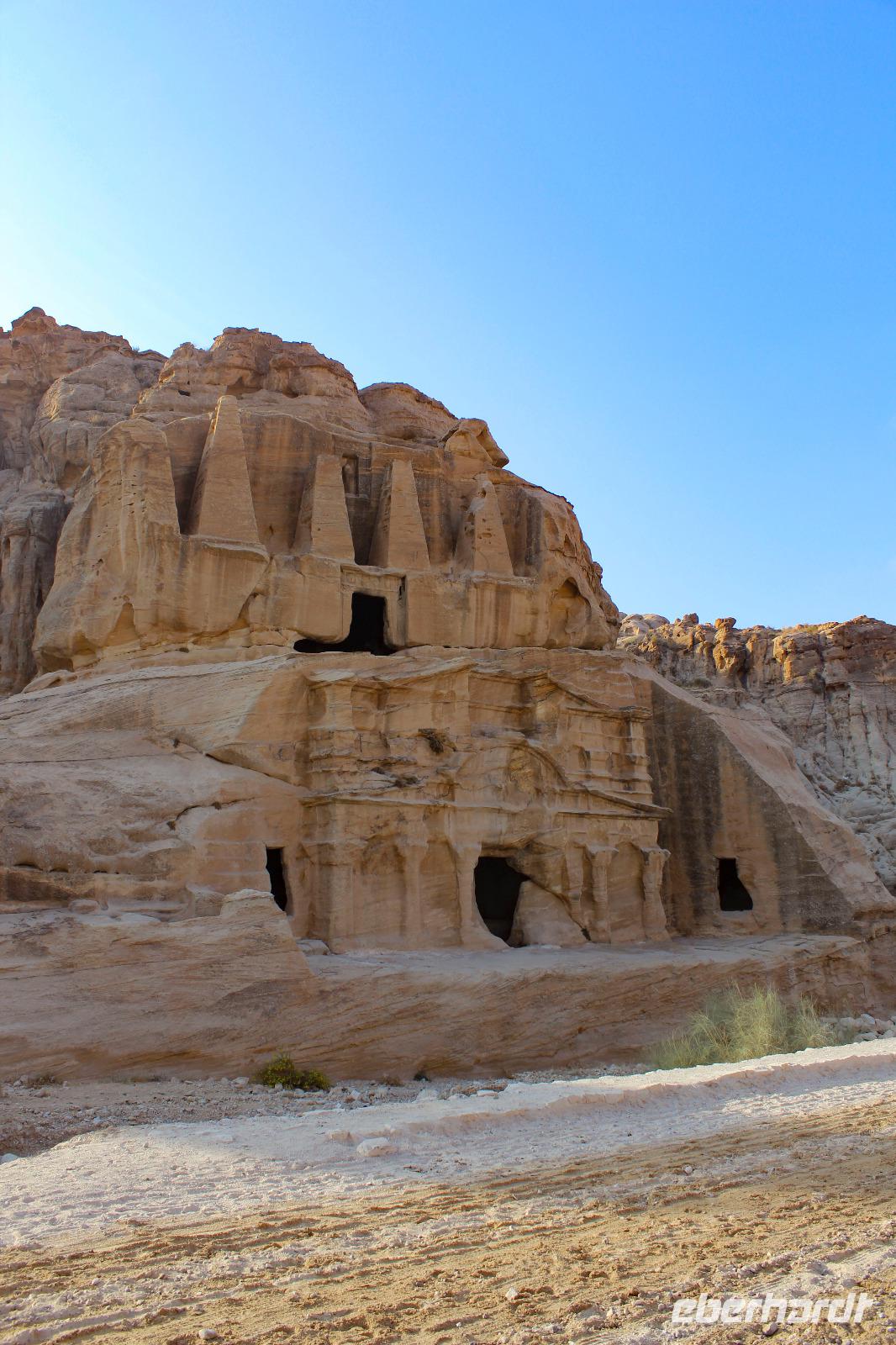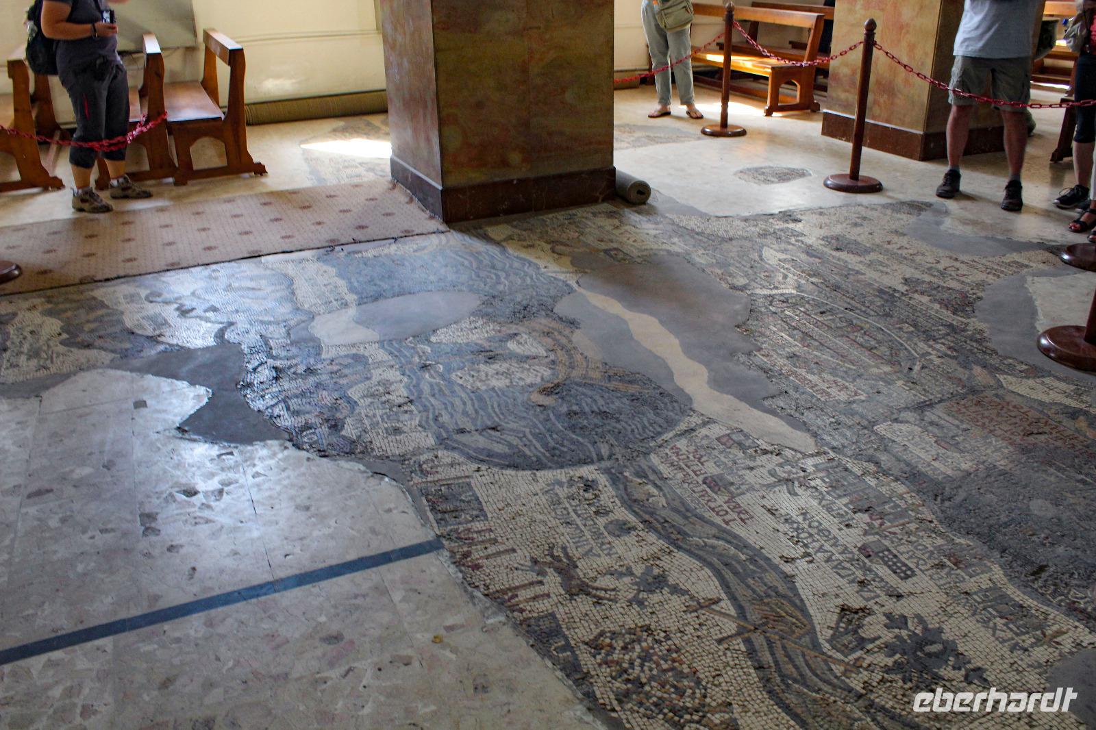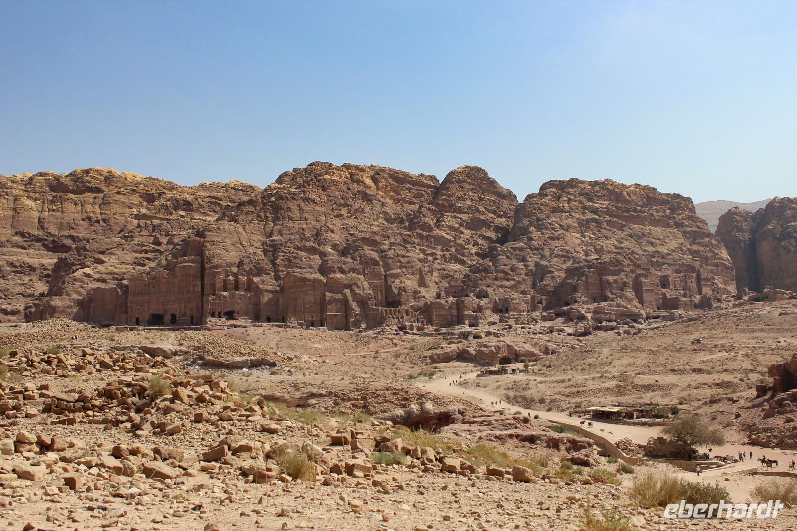 Am heutigen Tag unserer Rundreise bewegen wir uns auf den Spuren Moses. Auf dem Berg Nebo soll er nicht nur gestanden haben, sondern auch begraben sein. Hier angekommen bietet sich uns ein toller Ausblick: das Jordantal. Die Sicht ist heute nicht die Beste, doch Mahmud erzählt uns, in welcher Richtung sich Amman, der Jordan und die antike Stadt Jericho befinden. Im Museum deckt Mahmoud noch den geschichtlichen Teil ab und danach gehen wir in die Kirche in welcher wir gut erhaltene Mosaike bewundern können. Ein weiteres sehr beeindruckendes Mosaik finden wir in der Kirche von Madaba, dem Zentrum der Mosaikkunst in Jordanien. In der Kirche des Heiligen Georg befindet sich eine Landkarte von Palästina welche Ursprünglich aus 2,3 Mio. Steinen bestand. Bevor wir die Kirche betreten erklärt uns Mahmoud an einer großen Tafel die Besonderheiten der Landkarte. In der Kirche selbst sehen wir uns die erhaltenen Stücke an. Im Anschluss gibt es noch ein leckeres Mittagessen in einem kleinen Familienrestaurant. Auf unserer Fahrt nach Petra machen wir noch einen Fotostopp am Wadi Mujib, dem „Grand Canyon von Jordanien". Eine Serpentinenstraße bahnt sich den Weg an einem Stausee vorbei und überall begegnen uns Ziegen und Schafe. Von Mahmoud erfahren wir vieles über die Flora und Fauna dieses Landstriches. Unser nächster Stopp ist der Ort Kerak mit seiner beeindruckenden Kreuzritterfestung. Im Laufe der Jahrhunderte haben auf dieser Festung viele Grausamkeiten stattgefunden bis sie schließlich 1188 nach 8-monatiger Belagerung fiel. Nach der Besichtigung treten wir die letzte Fahrt des heutigen Tages an. Am Abend erreichen wir unser Hotel, welches direkt am Eingang der berühmten Felsenstadt Petra liegt.