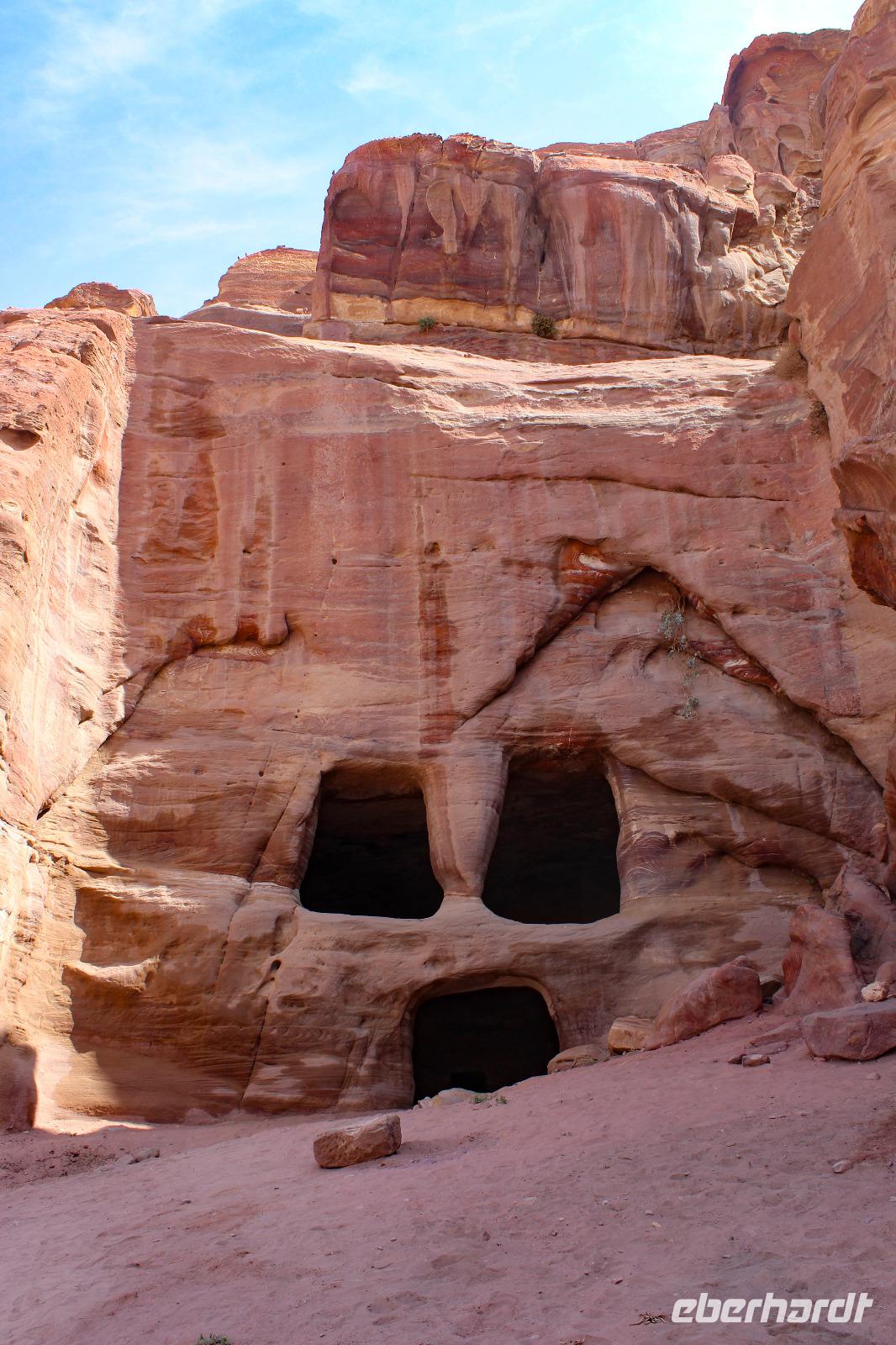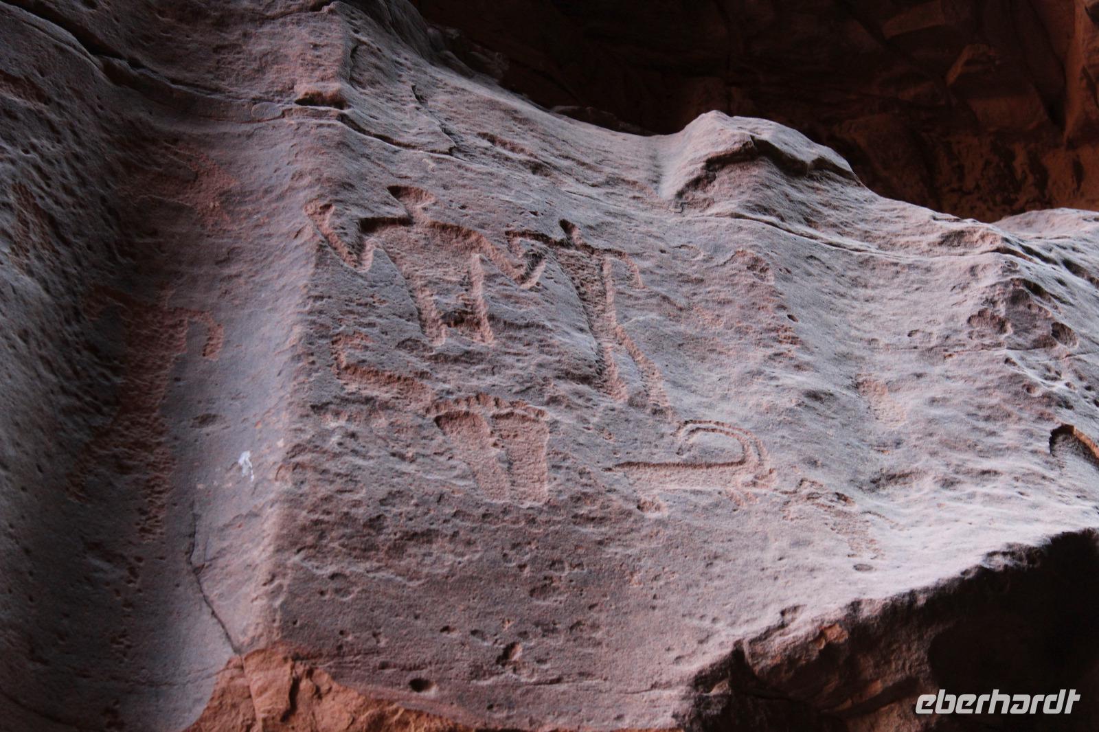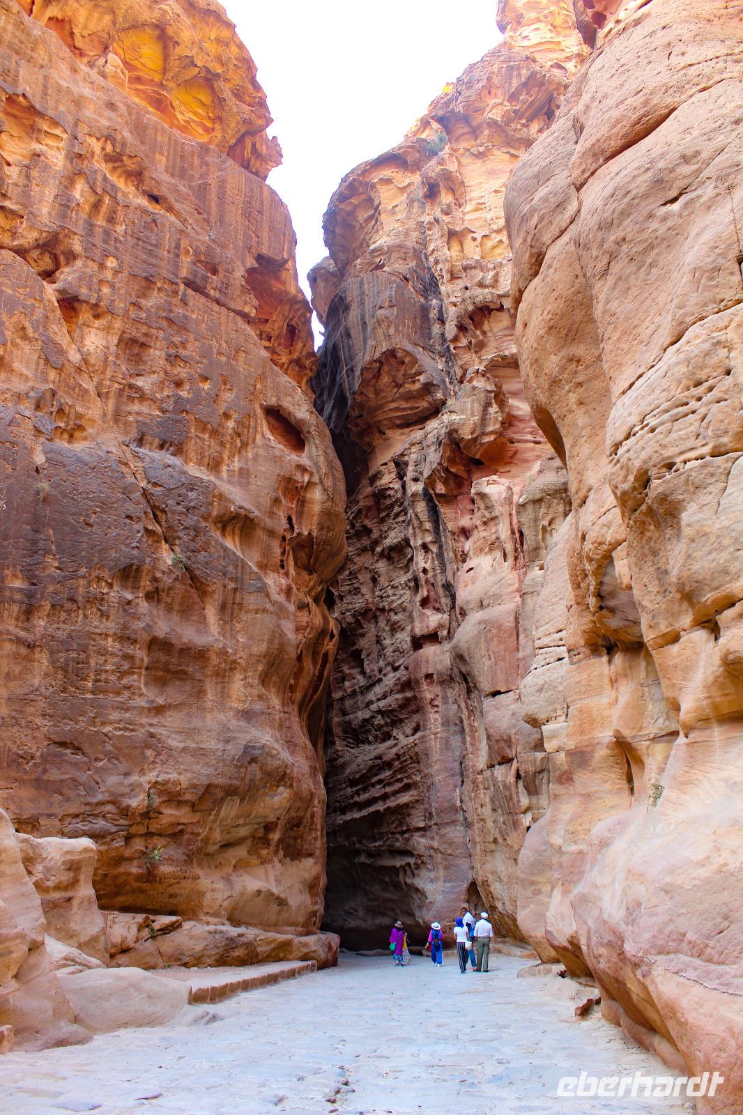 Nach unserer langen Fahrt am Tag zuvor steht heute alles im Zeichen des Weltwunders Petra. Unser Hotel liegt direkt am Eingang zur berühmten Felsenstadt und so können wir ohne Probleme los laufen. Vor uns tut sich der gewaltige Siq auf, welcher je nach Tageszeit anders aussieht. Immer wieder werden wir von den gewaltigen Pferdekutschen überholt. Nach ca 2 km erblicken wir auch schon das Schatzhaus. Hier sammeln sich viele Menschen um Fotos zu schießen, Souvenirs zu kaufen und auf Kamelen zu reiten. Mit Mahmoud machen wir uns auf den Weg um weitere Teile der unerschöpflichen Felsenstadt zu erkunden. Einst wohnten hier bis zu 30.000 Menschen. Vorbei an etlichen Ausgrabungstätten und wunderschönen Mosaiken erfahren wir viel Wissenswertes über die Landschaft welche sich vor unseren Augen auftut. Bevor wir Petra fürs erste wieder verlassen betrachten wir die Königswand noch einmal genau: Urnengrab, Seidengrab, Korinthisches Grab und Palastgrab bieten einen tollen Anblick. Am Abend sehen wir uns „Petra bei Nacht" an. Sowohl der Siq als auch der Platz vor dem Schatzhaus sind mit Kerzen hell erleuchtet. Wir nehmen auf den Bänken ganz an der Seite Platz und warten bis alle sich versammelt und niedergelassen haben. Auf typischen Instrumenten spielt ein Beduine für uns verschiedene Lieder. Dazu gibt es noch einen heißen Becher Tee. Im Anschluss finden alle den Weg zurück zum Hotel und nach einem sehr spannenden Tag können wir in unsere Betten fallen.