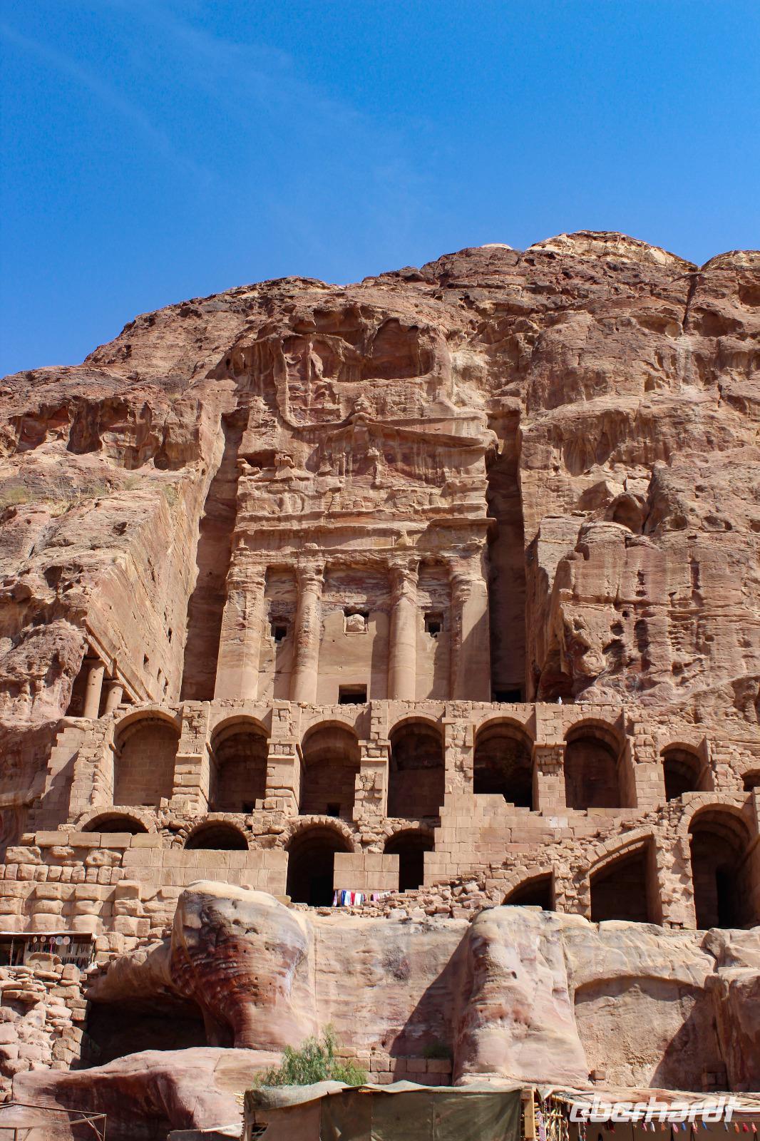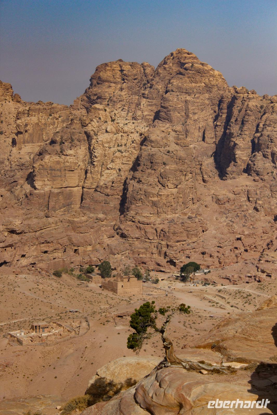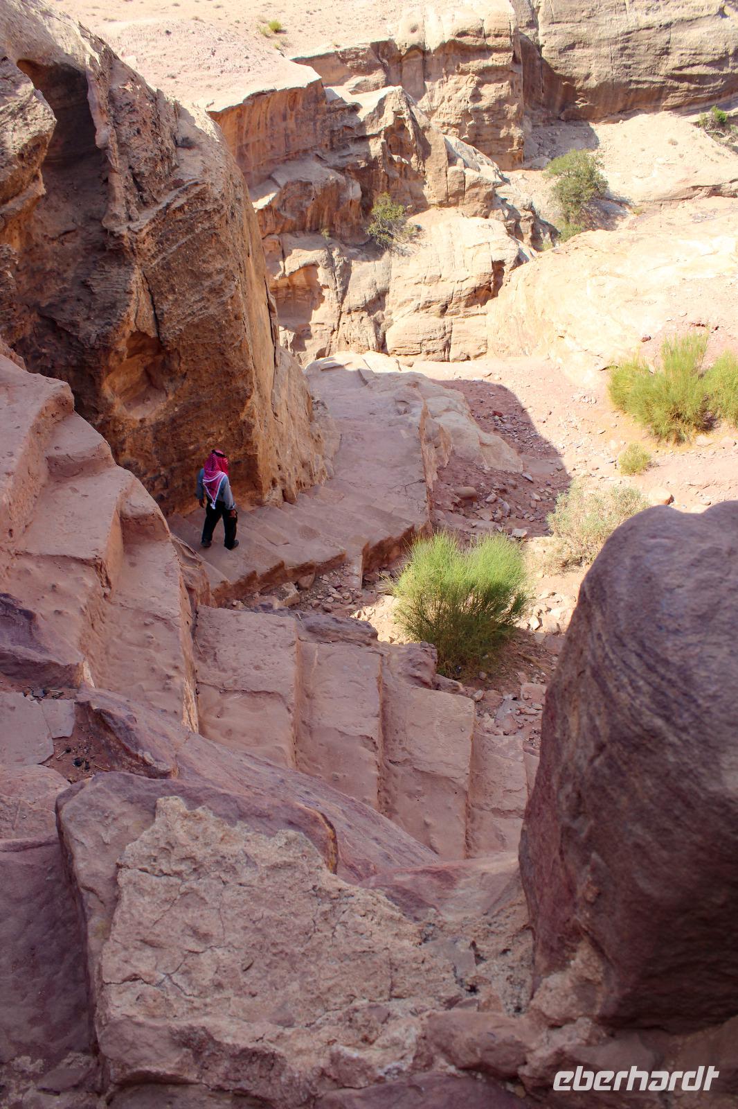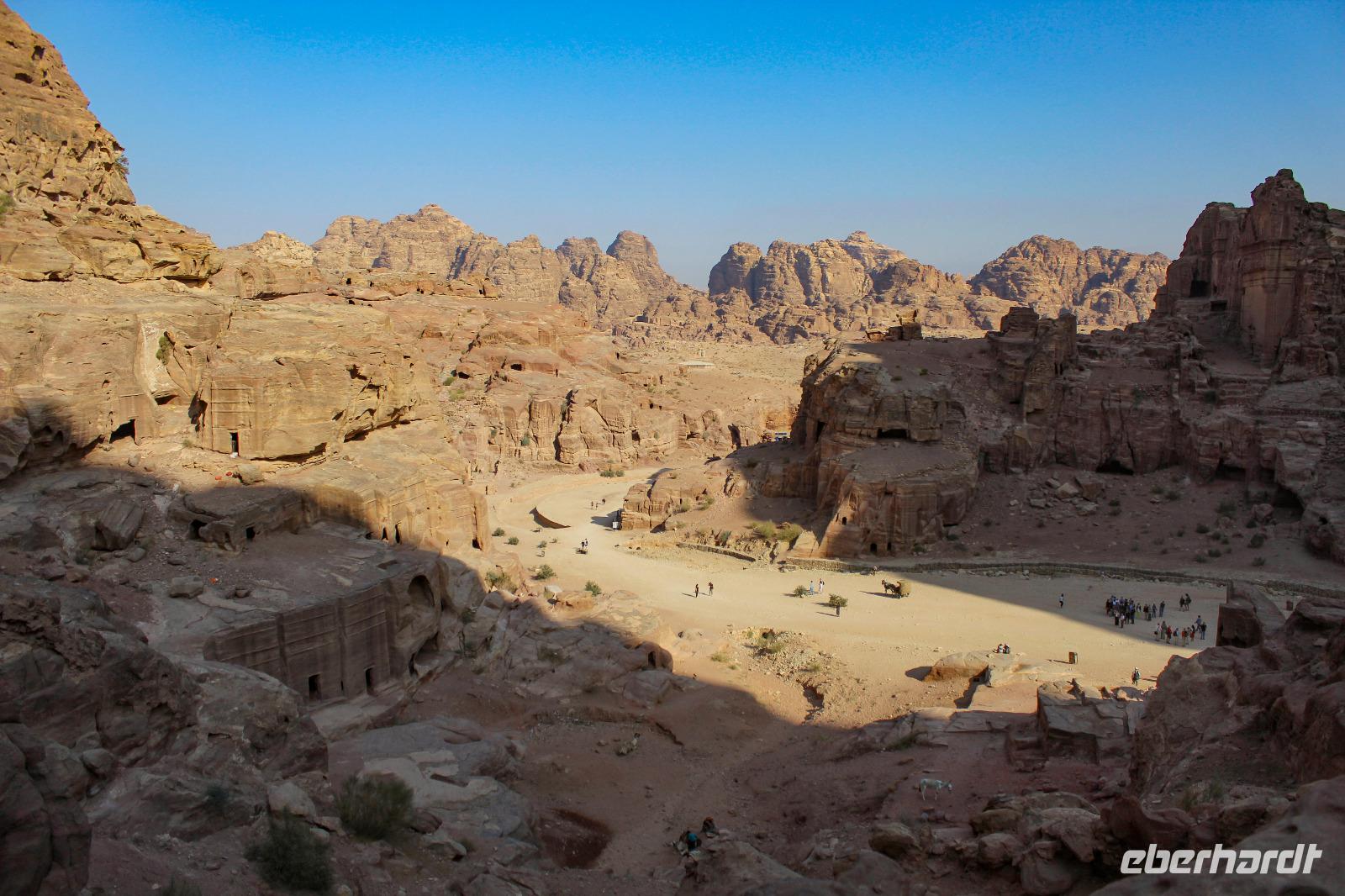 Auch den zweiten Tag in der Felsenstadt Petra verbringen wir bei strahlendem Sonnenschein. Wer möchte begleitet Mahmoud mit auf den Opferberg. Über 800 Stufen führen uns auf eine tolle Aussichtsplattform von welcher aus wir einen schönen Ausblick über die Landschaft von Petra haben. Auf der anderen Seite des Berges geht es wieder hinunter und es tun sich uns immer mehr in den Fels gehauene Gräber auf. Wer noch ganz viel Puste hat begibt sich noch einmal 800 Stufen hinauf zum Kloster und macht schöne Fotos. Bei den Händlern in Petra kann man noch das ein oder andere Souvenir kaufen. Am Abend sind wir alle gut ausgelastet und genießen unser gemeinsames Abendessen.