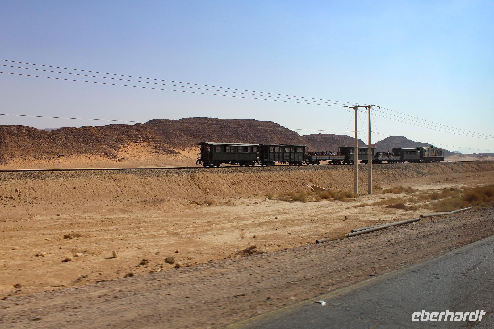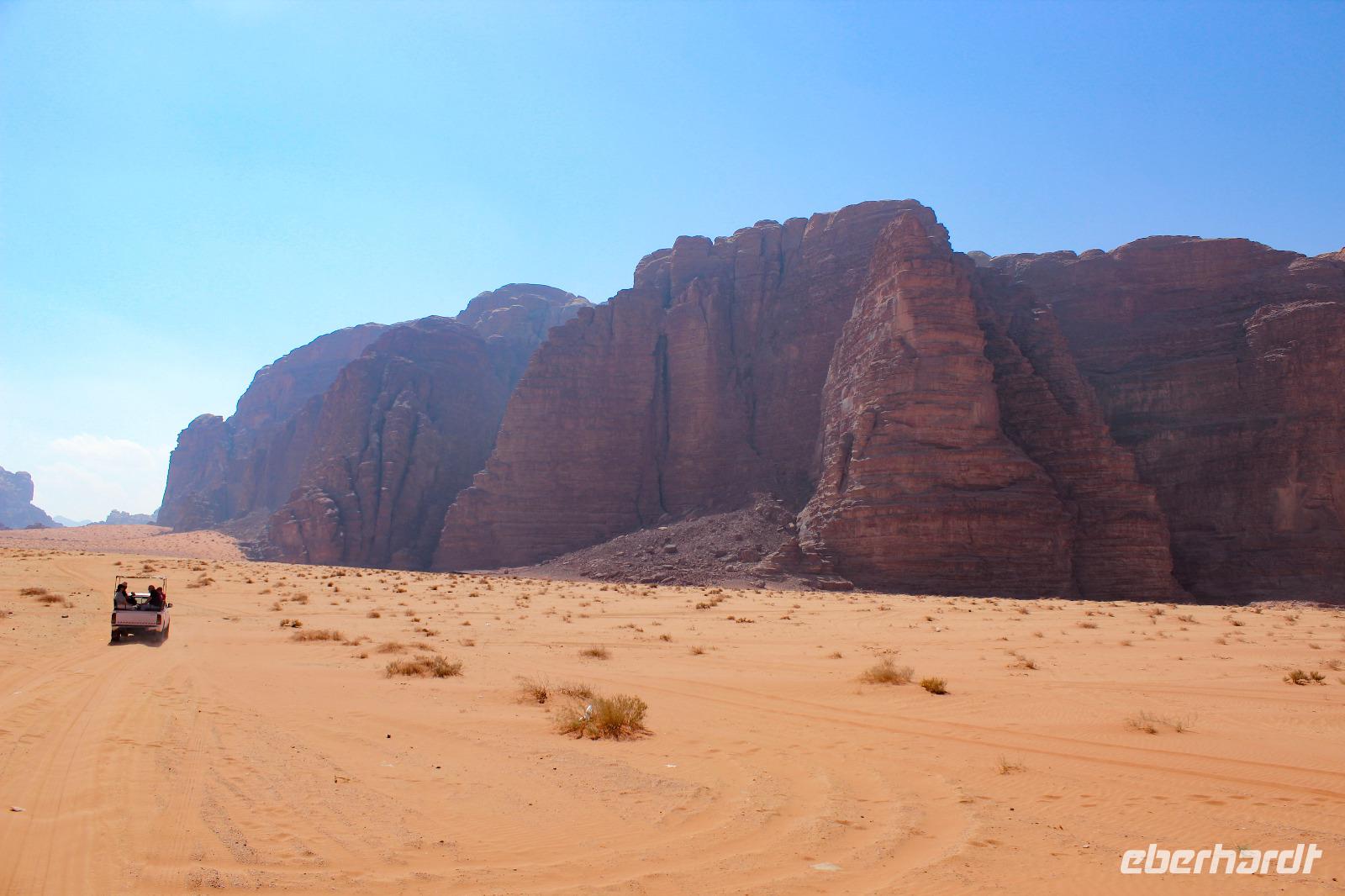 Wie gehabt machen wir uns mit dem Bus nach dem Frühstück auf den Weg zum nächsten Höhepunkt unserer Reise. Auf der Fahrt nach Wadi Rum können wir uns noch einmal die beeindruckende Felslandschaft von Petra ansehen bevor wir sie nach zwei schönen Tagen hinter uns lassen. In Wadi Rum angekommen erwarten uns auch schon zwei Jeeps mit jeweils 6 Sitzplätzen. Der erste Stopp unserer Wüstensafari ist die Lawrence Quelle. Hier steigen wir aus und sehen uns in den Fels gemeißelte Schriften an. Bevor es weiter in den Siq geht machen wir noch eine kleine Teepause in einem Beduinenzelt. Hier gibt es auch Teemischungen und Seife zu kaufen. Auf dem Rückweg machen wir noch einen Fotostopp an der Felsenbrücke. Schließlich lassen wir auch den roten Sand der Wüste Wadi Rum hinter uns und fahren zu unserem nächsten Hotel in Aqaba. Den Nachmittag haben alle zur freien Verfügung. Das Hotel bietet eine tolle Poollandschaft und hat einen privaten Zugang zum Roten Meer. Heute geht es dann zum Abendessen in ein Fischrestaurant. Am Abend sind die Temperaturen sehr angenehm und so sitzen wir auf der Terrasse des Restaurants und genießen unsere Mahlzeit.