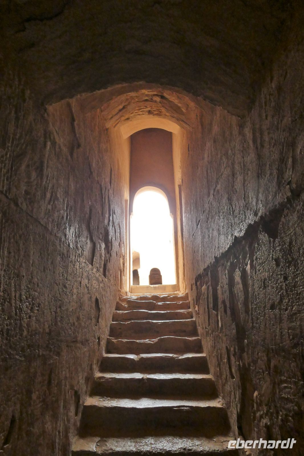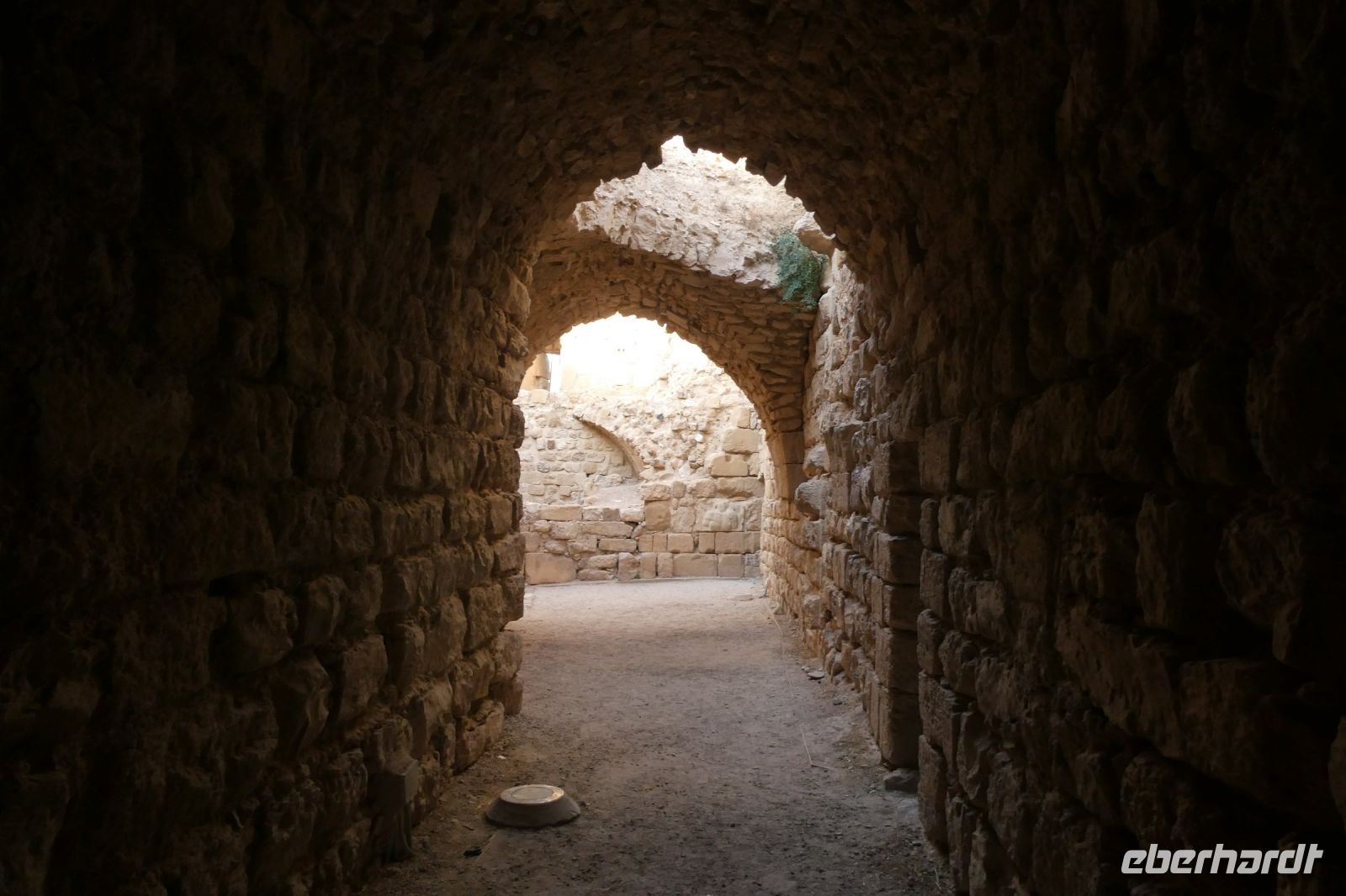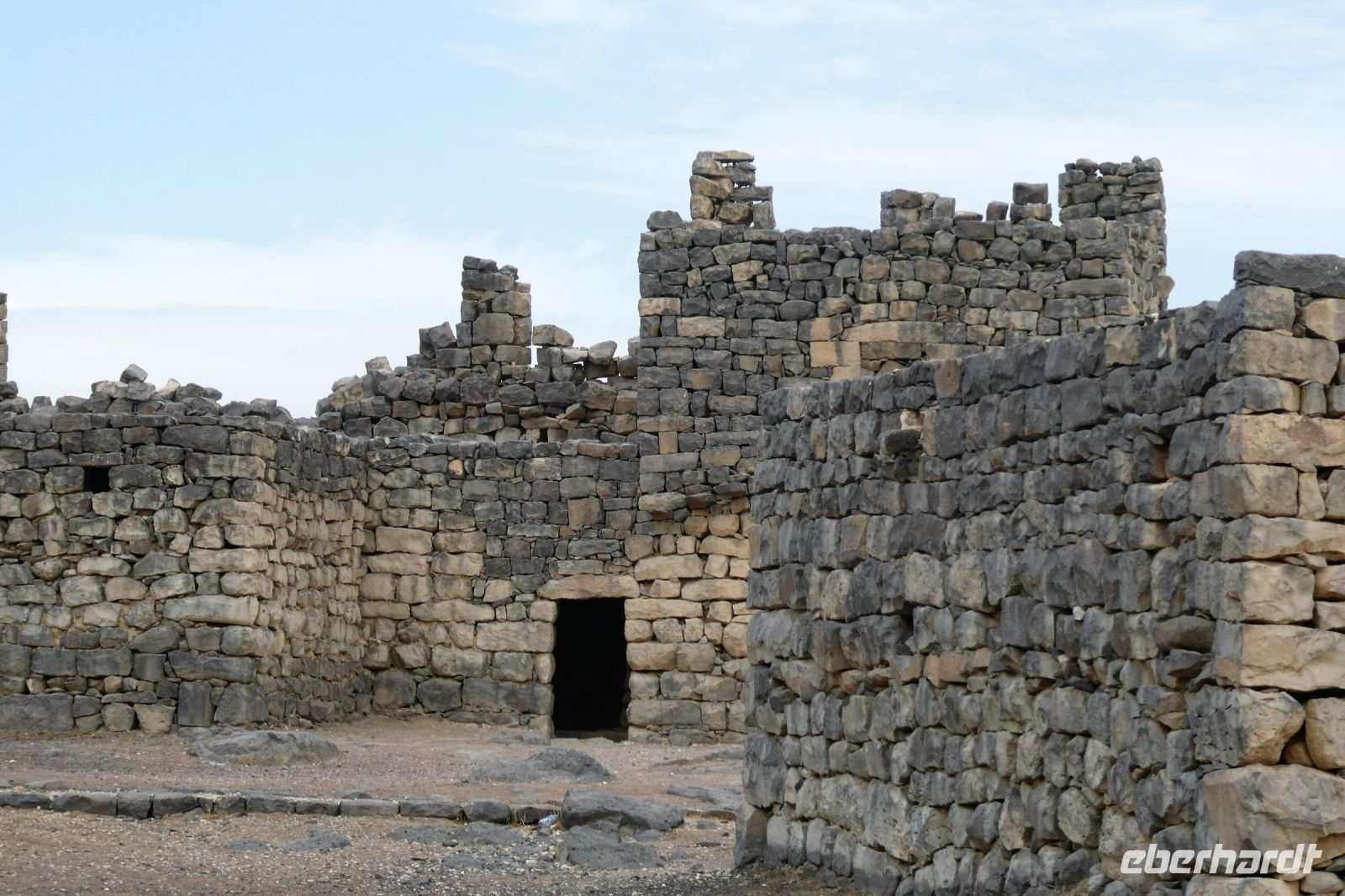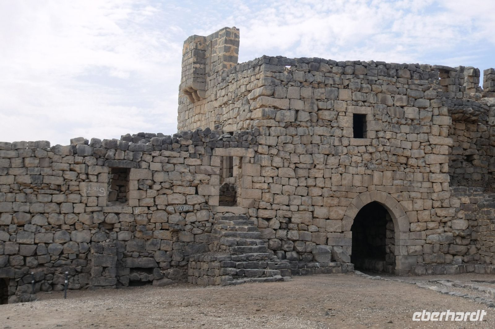 Ursprung der Anlage war ein römisches Kastell, welches später mit Basaltgestein erweitert wurde und sein endgültiges Aussehen im 13.Jahrhundert von den „Mamelucken“ erhielt. Der Grund war die Lage in der einzigen Oase der Region. Wir betreten die Anlage durch eine Steinpforte, welche sich zwar nicht so leicht aber dann doch bewegen lässt. Wir gehen durch die weitläufige Anlage und bewundert die Bautechnik und die Konstruktion aus Basalt und Granit.