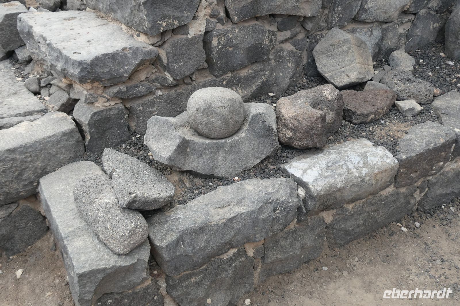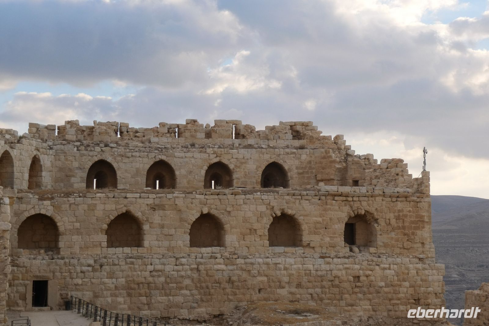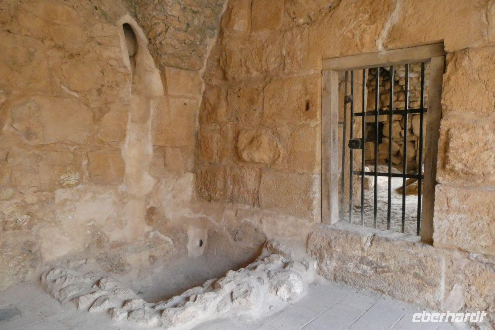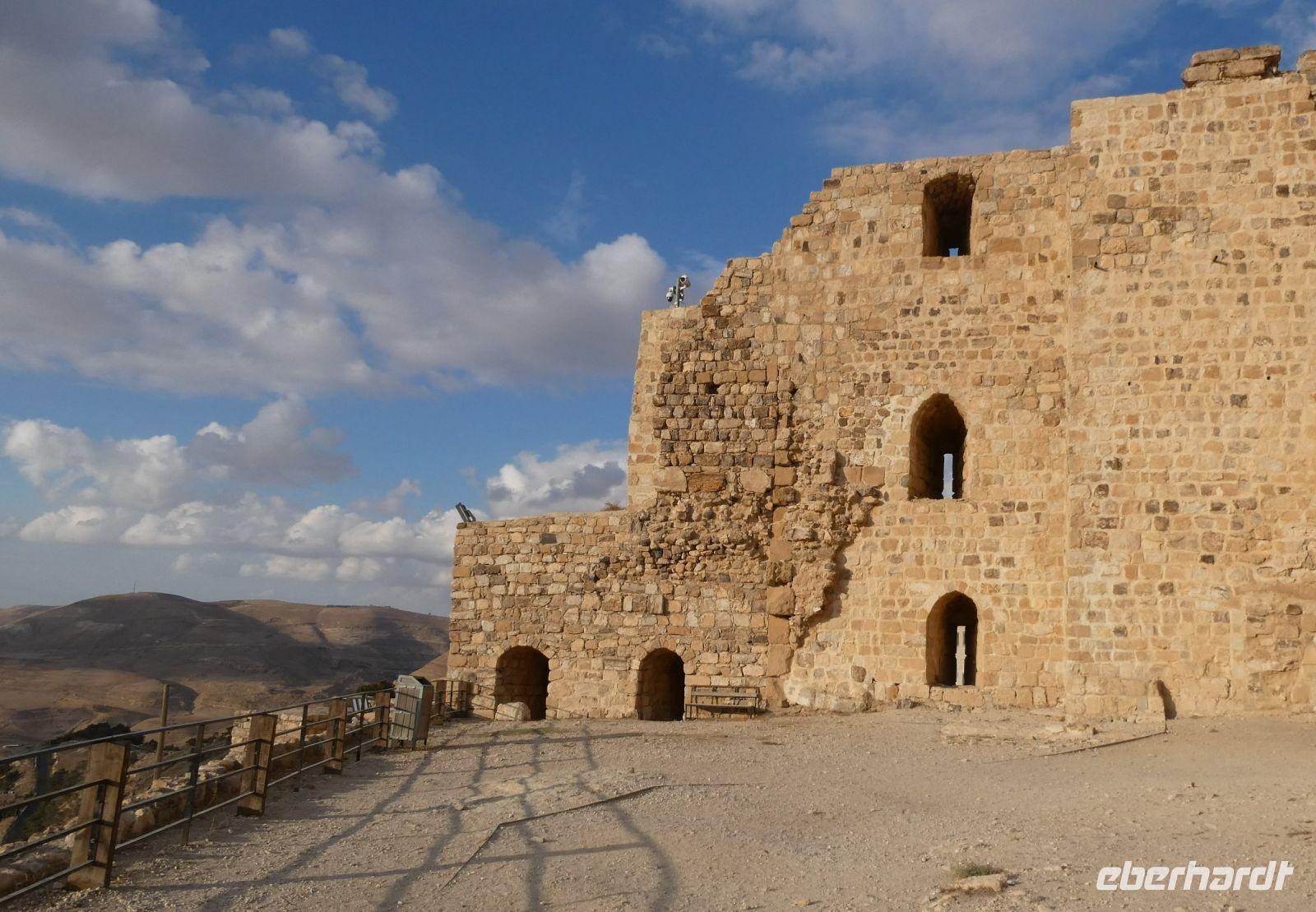 Ursprung der Anlage war ein römisches Kastell, welches später mit Basaltgestein erweitert wurde und sein endgültiges Aussehen im 13.Jahrhundert von den „Mamelucken“ erhielt. Der Grund war die Lage in der einzigen Oase der Region. Wir betreten die Anlage durch eine Steinpforte, welche sich zwar nicht so leicht aber dann doch bewegen lässt. Wir gehen durch die weitläufige Anlage und bewundert die Bautechnik und die Konstruktion aus Basalt und Granit.