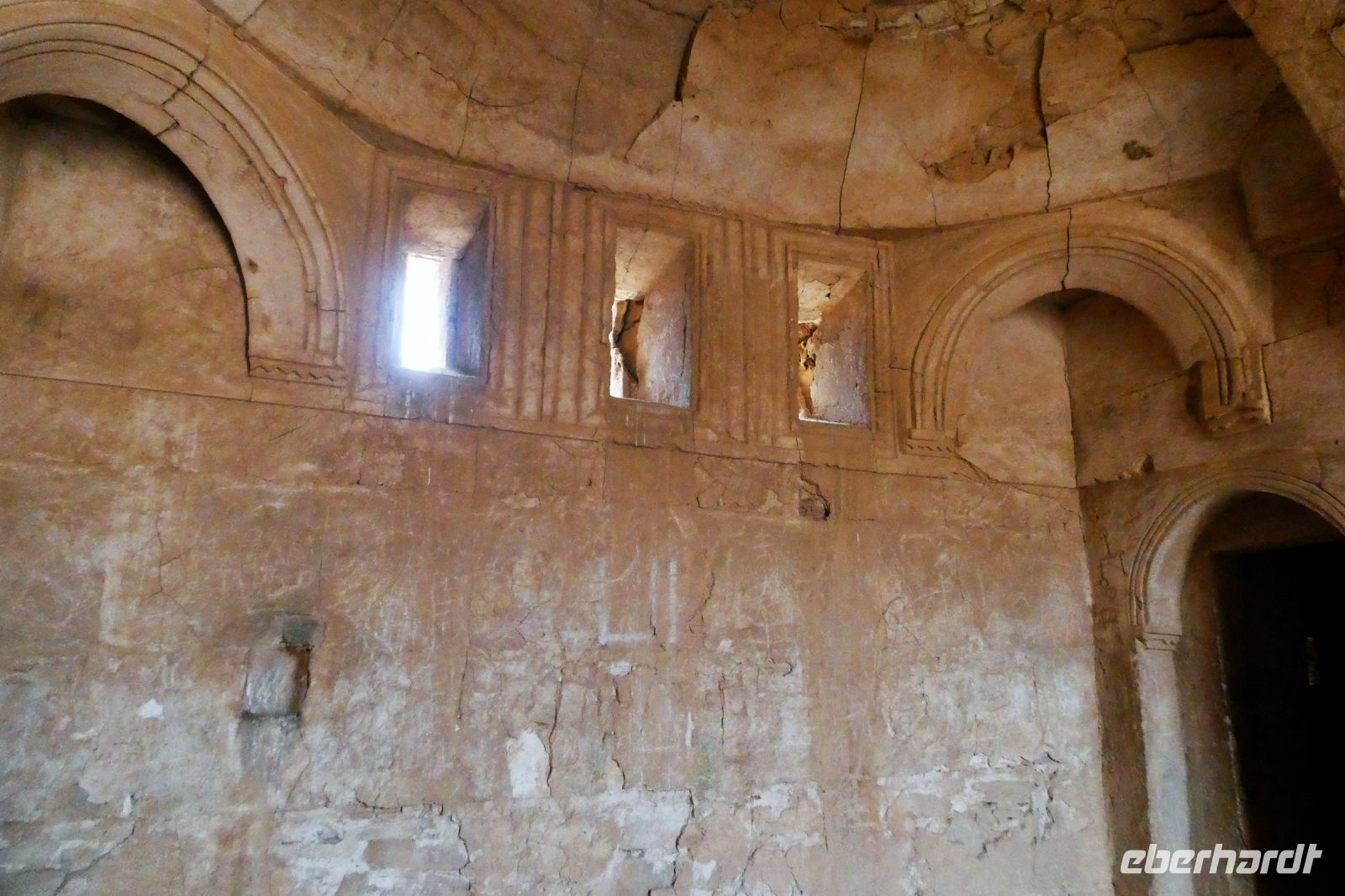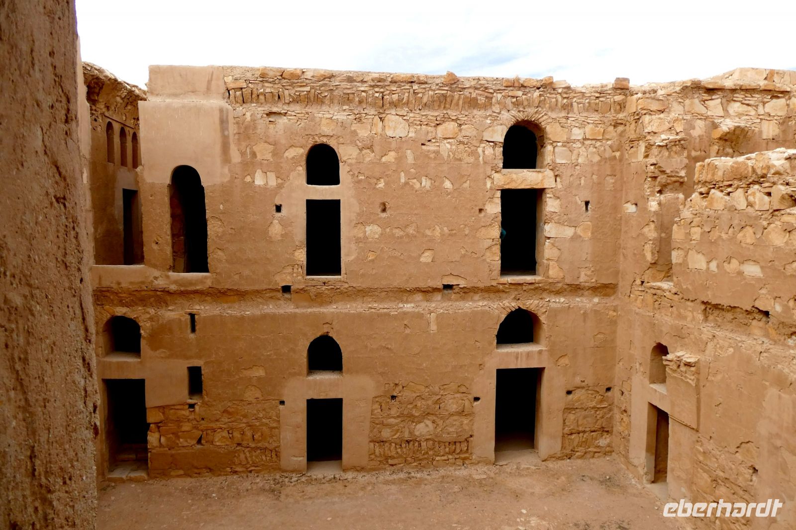 In dieser Anfangszeit der islamischen Religion wurden Gebäude errichtet, die seit 661, Herrschaftsbeginn der Umayyaden, zu verschiedenen Zwecken dienten. Das erste dieser Gebäude welches wir besuchen, „Qasr Kharana“, war wahrscheinlich eine Karawanserei aus dem 7.Jahrhundert. Nach einer Theorie geht sie auf die Sassaniden, der letzten vorislamischen persischen Dynastie, zurück. Zu dieser Zeit nahm auch der Karawanenhandel massiv zu. Trutzige Mauern und verschiedene Räume für die Händler und anderen Reisenden, sind erhalten. Beachtenswert ist das Belüftungssystem, welches immer für einen leichten Luftstrom und für den Luftaustausch in dem Gebäude sorgte. Wir teilen die Gruppe und ein Teil nimmt die eine Richtung mit Kareem und die anderen werden von unserem netten Polizisten, der auf uns aufpassen soll, begleitet. Fast ein kleines Labyrinth. Immer ist ein wenig Vorsicht geboten, denn an manchen Stellen geht es nicht weiter. Die Stimmung in unserer Gruppe ist sehr gut und es wird viel gelacht.