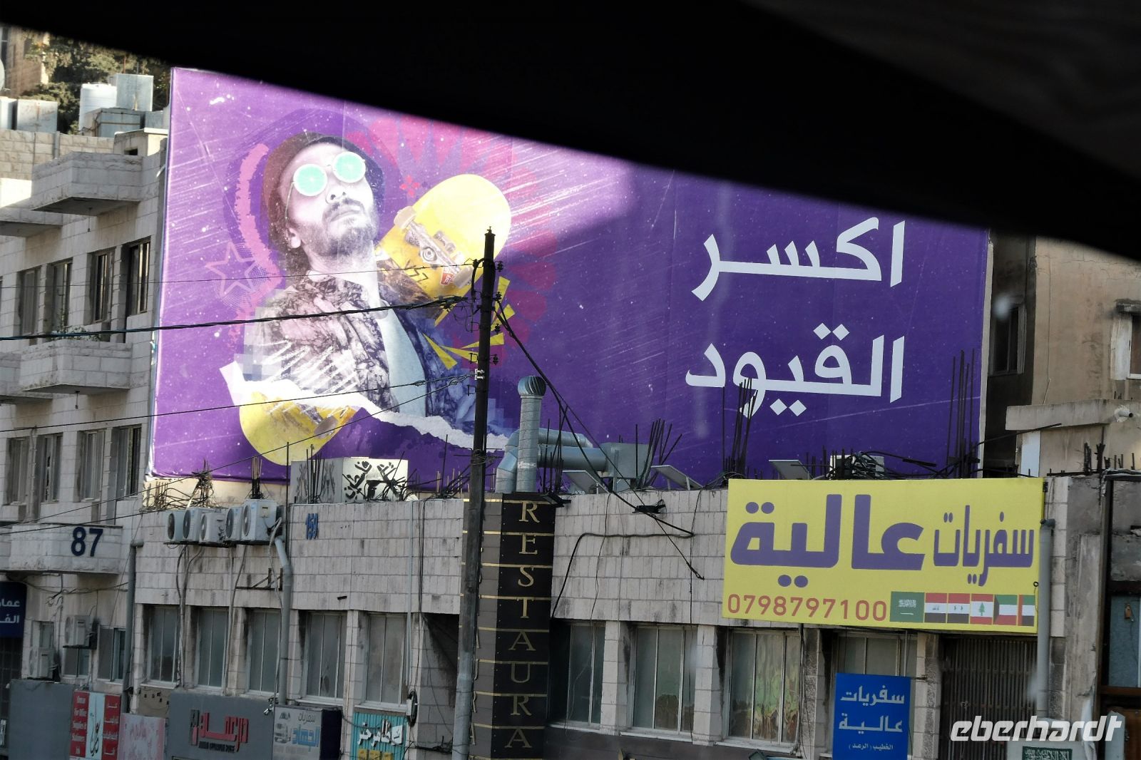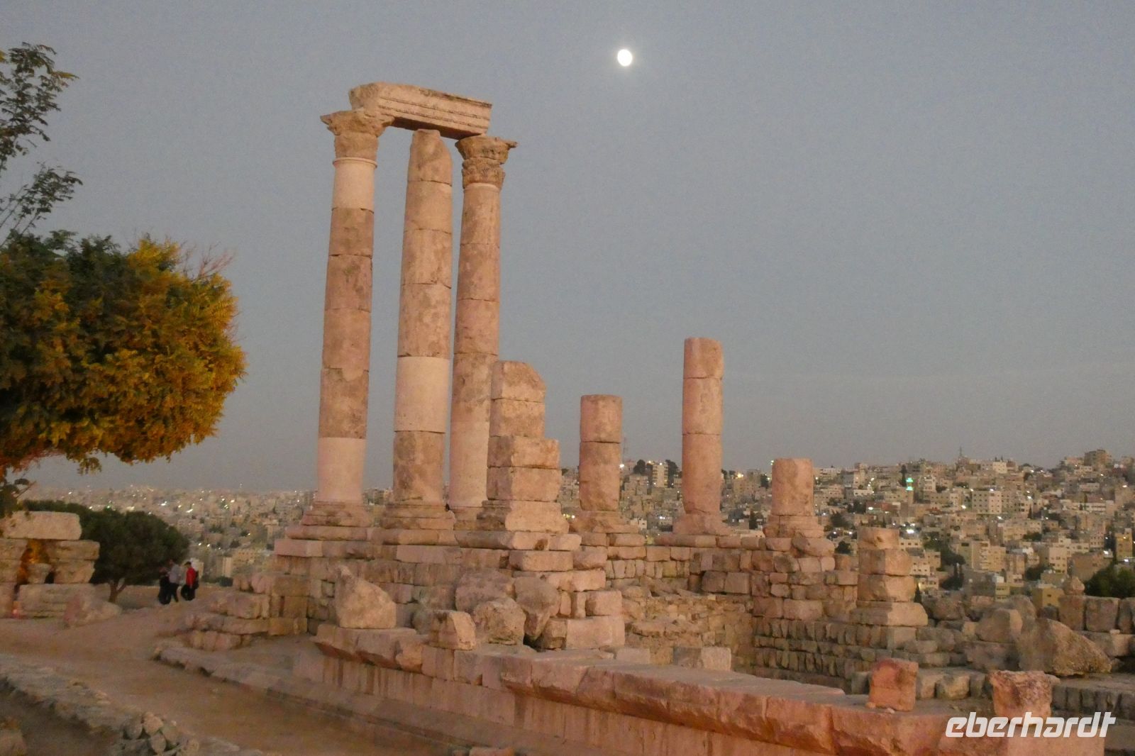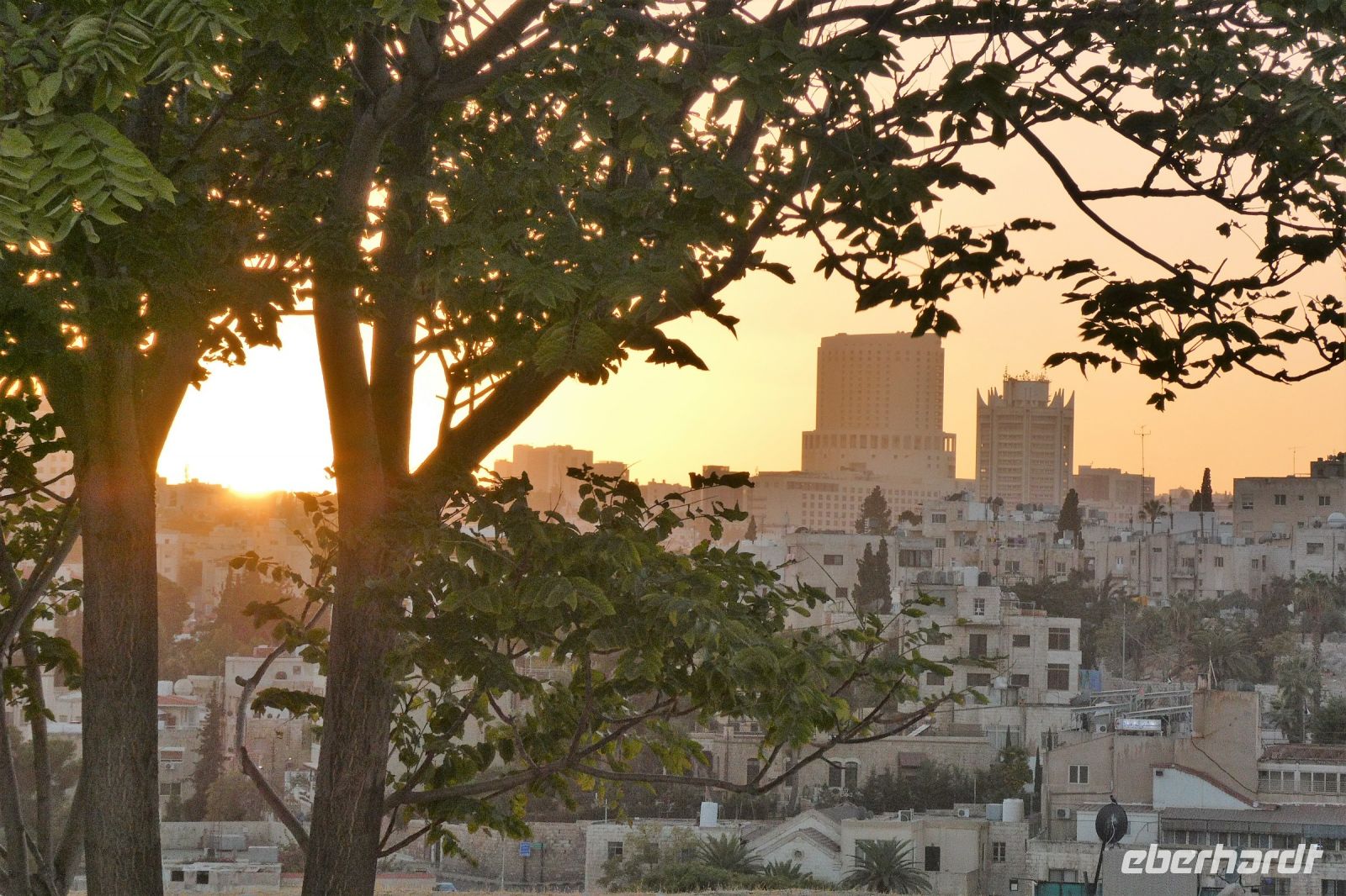 Die Sonne geht unter und wir sehen auf die Stadt Amman hinunter, entdecken das römische Theater und erleben das langsame abendliche Erwachen der Stadt. Wir steigen zu Fuß hinunter in das Zentrum. Ein Treppenweg bringt uns sicher in das abendliche Amman. Vorbei an einer Galerie wo wir neuzeitliche Kunst betrachten können geht es in die Hauptgeschäftsstraße. Kareem erzählt, dass Amman eigentlich eine Stadt des Abends und der Nacht ist. Der Jordanier geht hinaus, einkaufen, flanieren und trifft sich mit Freunden in der Stadt. Wir werden angesprochen, freundlich aber nicht aufdringlich. Ein schöner Tagesausklang bevor wir in unser Hotel fahren.