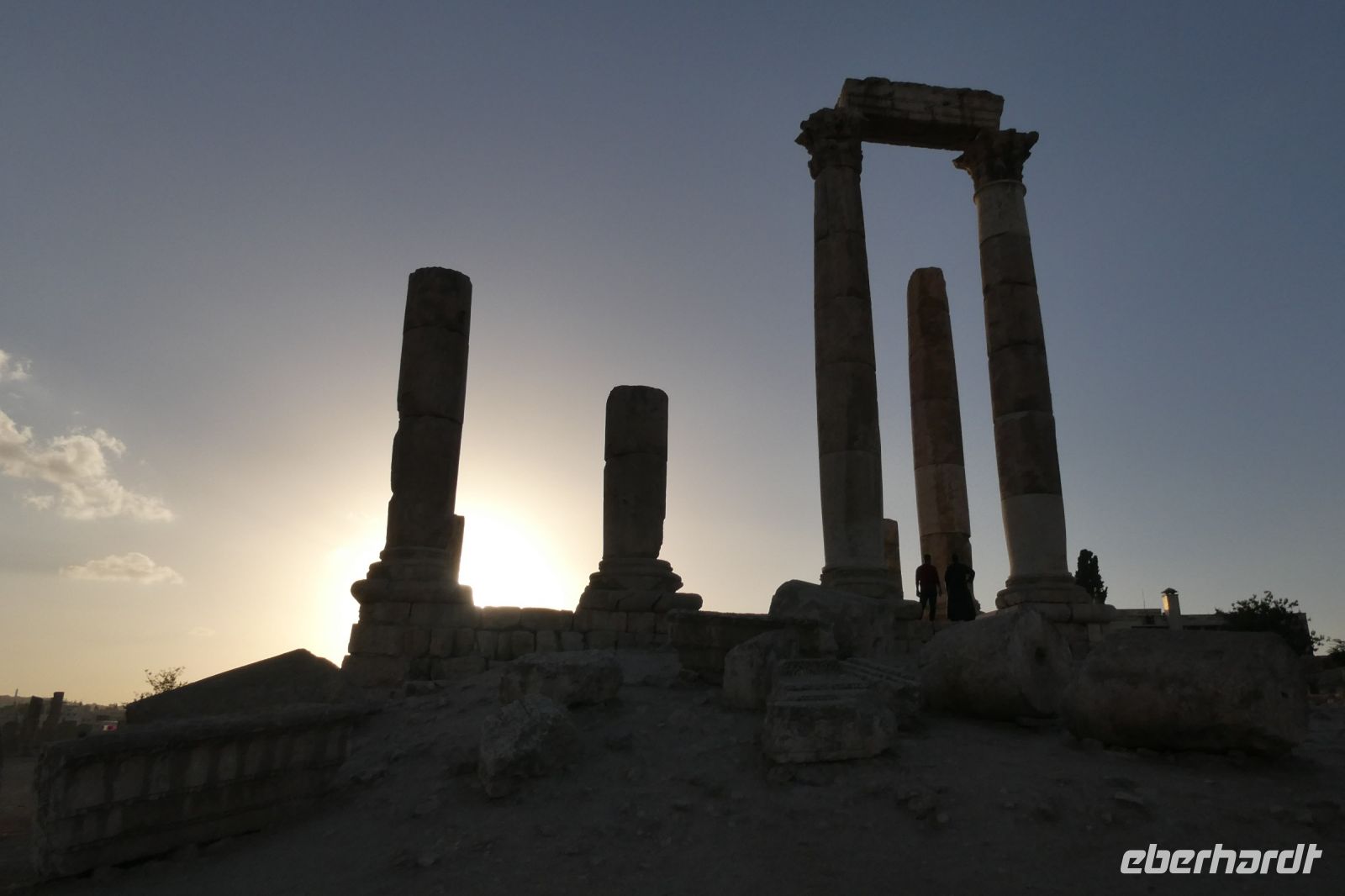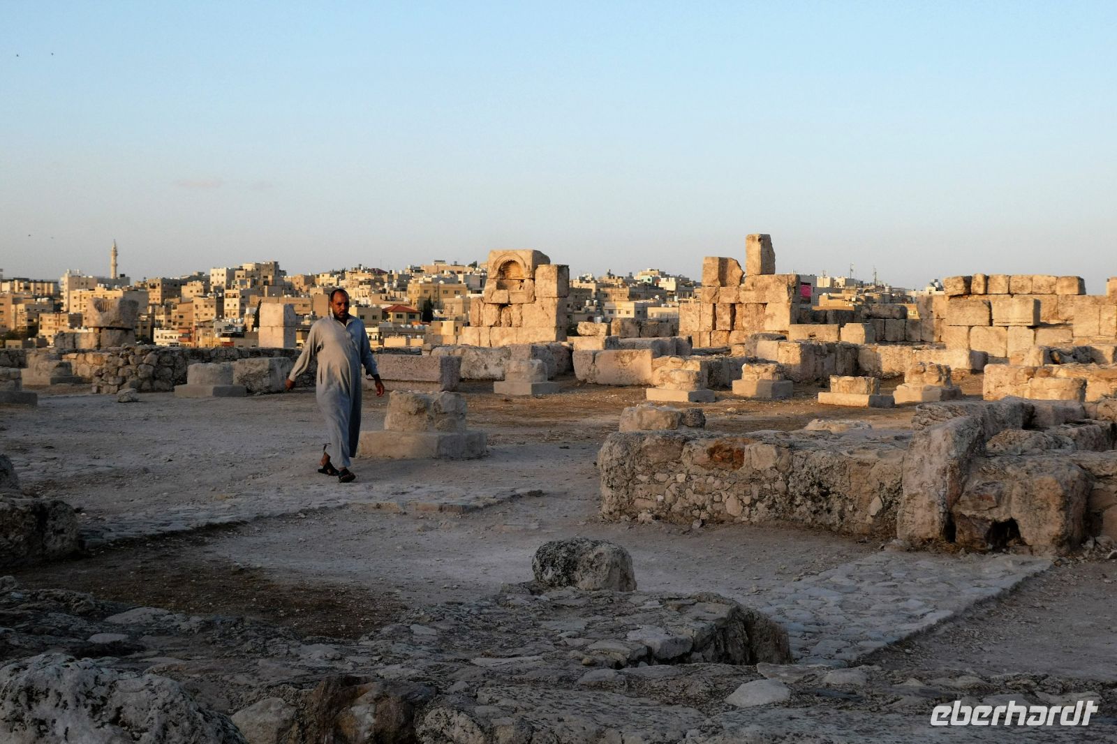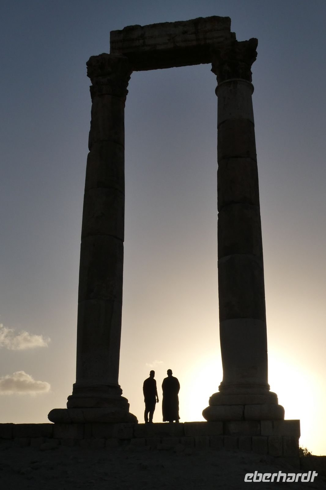 Schließlich kommen wir doch an die sog. „Zitadelle“. Sie ist auf einem der 7 Hügel gelegen, welche damals und einst die Stadt Amman ausmachen. Diese historische Stätte wollen wir erkunden und da wir am späteren Nachmittag ankommen, ist das Licht schon jetzt besonders. Wir erfahren etwas über die Geschichte der gesamten Region, stammen doch die heutigen Grenzen Jordaniens erst aus dem 20.Jahrhundert. Zahlreiche Völker haben seit der Steinzeit die Region erobert und bevölkert. Dieser Hügel hier war seit der Neusteinzeit besiedelt und wurde während der Bronzezeit befestigt. Dann folgten verschiedene Imperien von denen wir hier Hinterlassenschaften finden: den unvollendeten römischen Tempel des Herkules, der besonders im Abendlicht ein Treffpunkt zu sein scheint (siehe Bilder), das "Ammontor" und den "Umayyaden Palast", sowie eine byzantinische Kirche. Das archäologische Museum wurde bereits 1951 erbaut. In ihm kann man zahlreiche Fundstücke aus Jordanien, geordnet nach Epochen, betrachten. Unter anderem gibt es einige Kopien der „Ain Ghazal“ Statuen, die vor ca. 8700 Jahren entstandenen ersten großformatigen Darstellungen des Menschen überhaupt. Man fand sie in der Nähe von Amman im Jahr 1974 im Zuge von Bauarbeiten und grub sie 1983 – 1985 aus. Die Originale befinden sich heute in internationale Museen weltweit, die sich immer noch mit ihrer Erforschung befassen. Über die Bedeutung kann man bis heute nur Vermutungen anstellen.