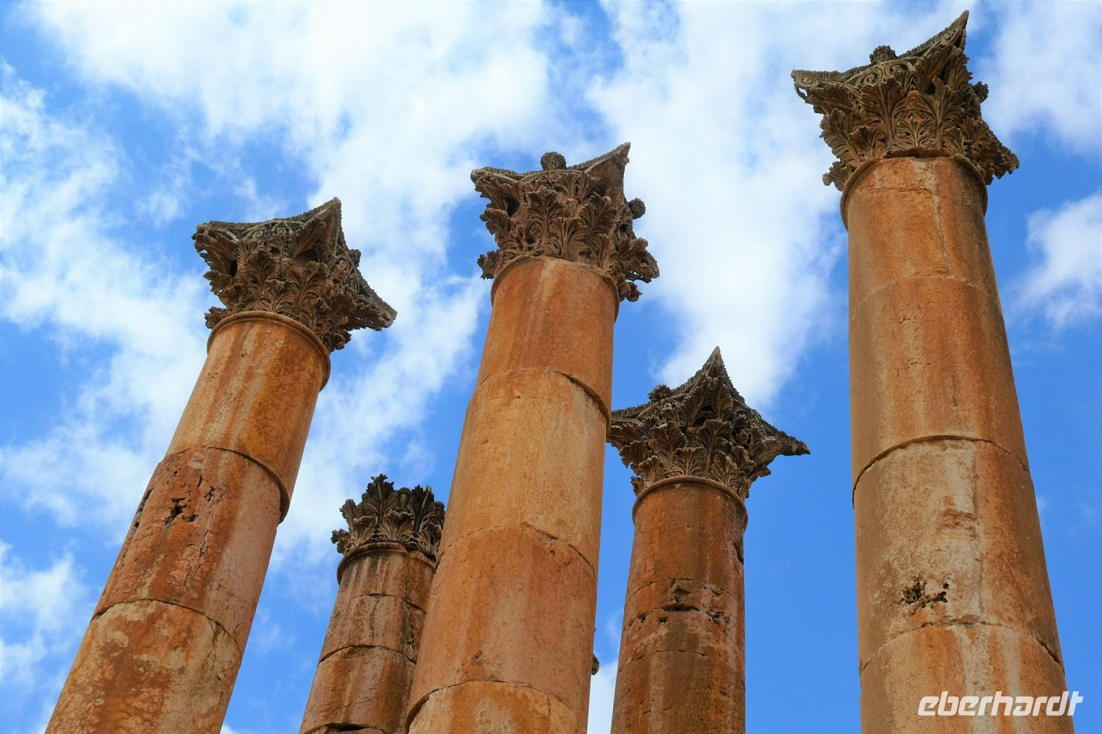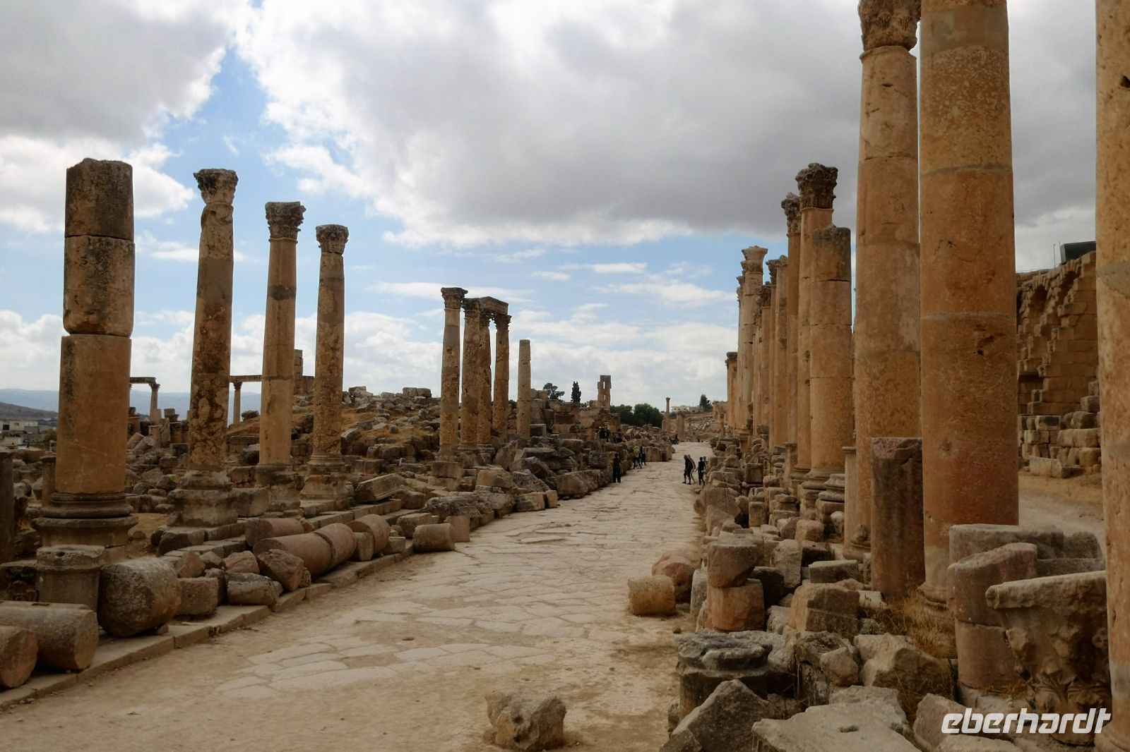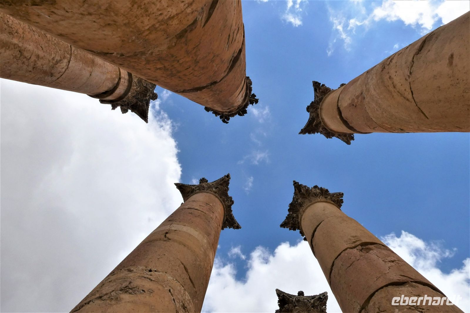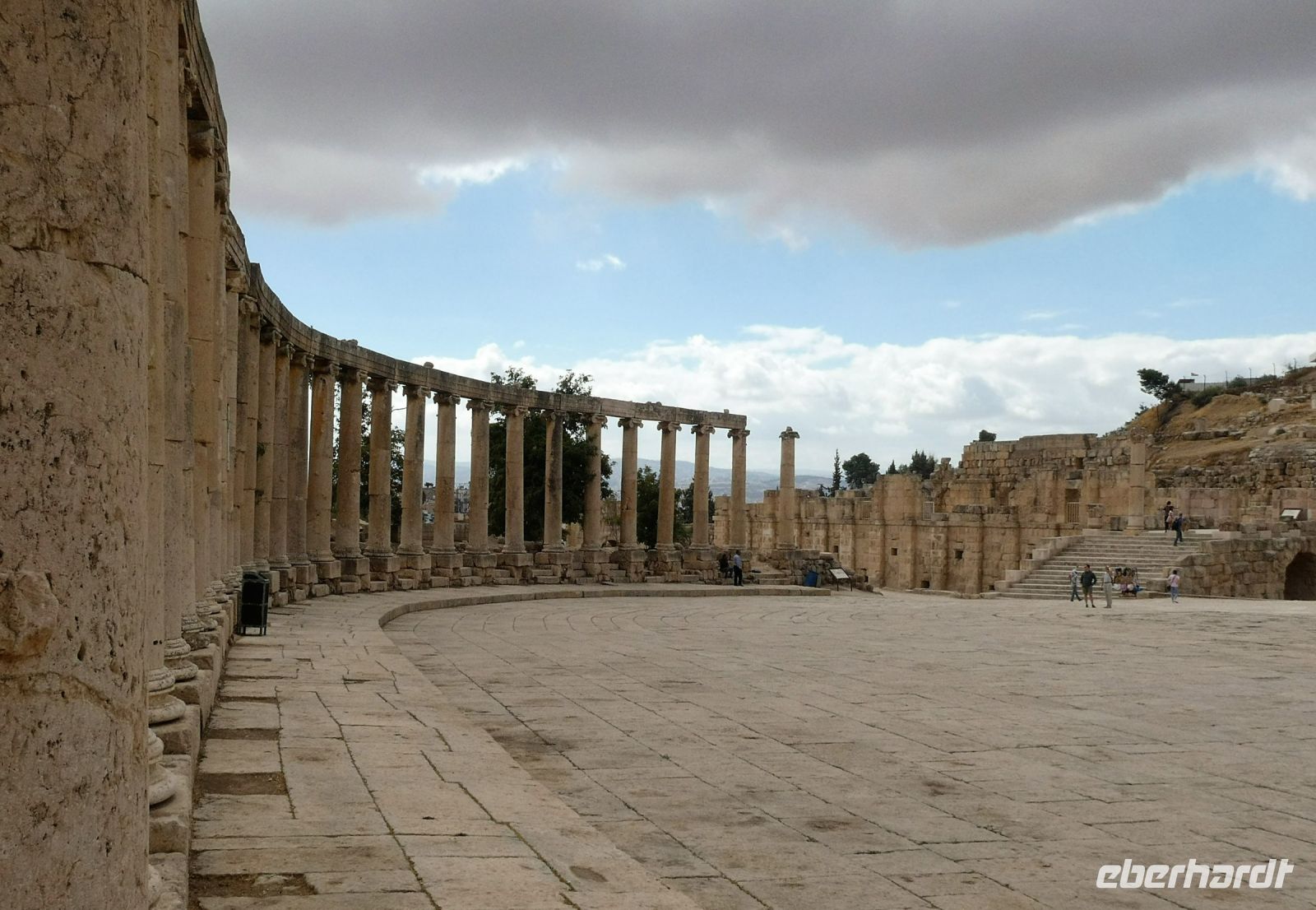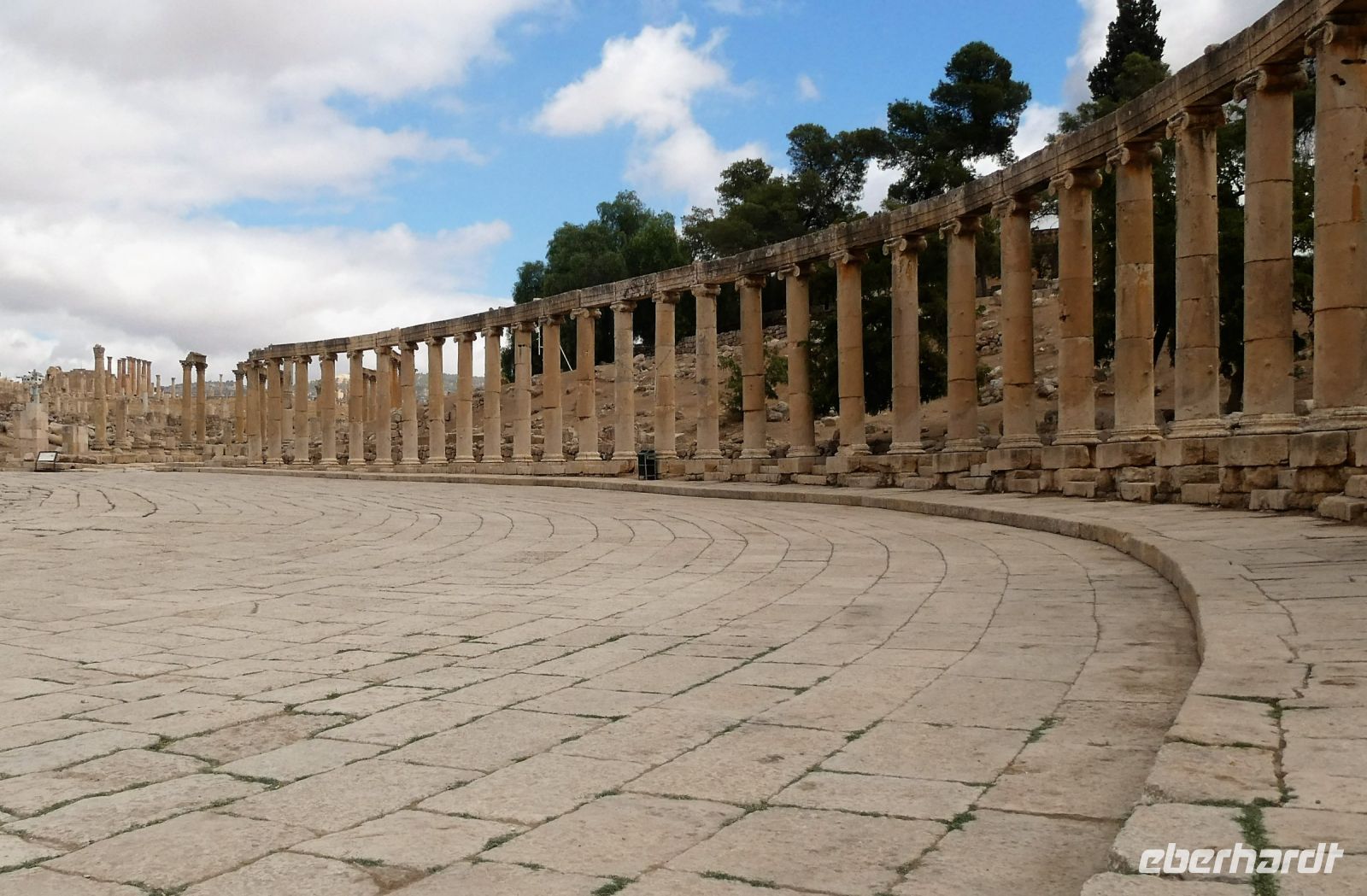 Nach Meinung der Archäologen handelt es sich bei diesem ovalen Platz um einen Kniff der Städtebauer. Sie wollten den „Zeus-Tempel“ mit der Hauptstraße (Cardo) verbinden. Dieser Cardo ist mit seinen korinthischen Säulen wirklich als prachtvoll zu bezeichnen. Im originalen römischen Pflaster sind noch die Wagenspuren der antiken Wagen zu sehen, die sich über Jahrhunderte eingegraben haben. Vorbei am "Nymphäeum", dem Stadtbrunnen, erreichen wir den Aufgang zum „Artemis-Tempel“, einem der schönsten Tempel von Gerasa. Imposant wirkt der Weg über den Decumanus hinauf mit interessanter Perspektive. Bevor wir uns aber den Tempel von der Nähe anschauen besuchen wir das nördliche Theater mit 800 Sitzplätzen und testen die Akustik. Dann aber machen wir eine kleine Pause bei Artemis und ein freundlicher Jordanier kocht Kaffee oder Tee für uns. Dabei bekommen wir die Elastizität der Tempelsäulen demonstriert. Man kann sie doch tatsächlich bewegen.