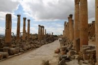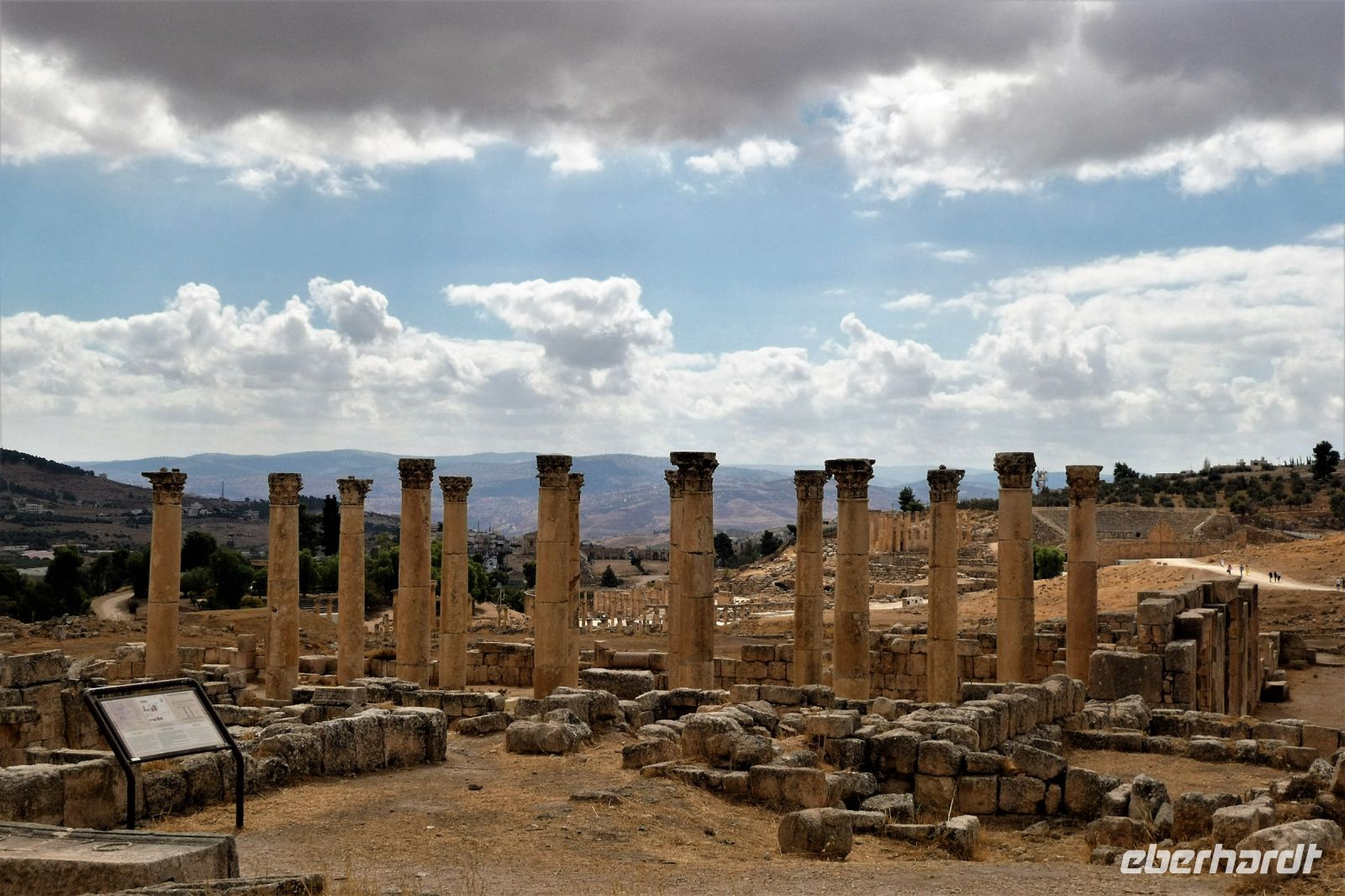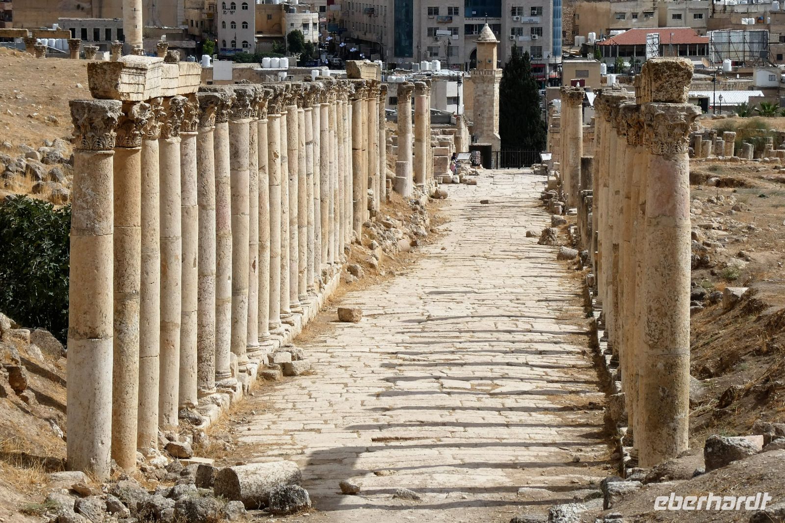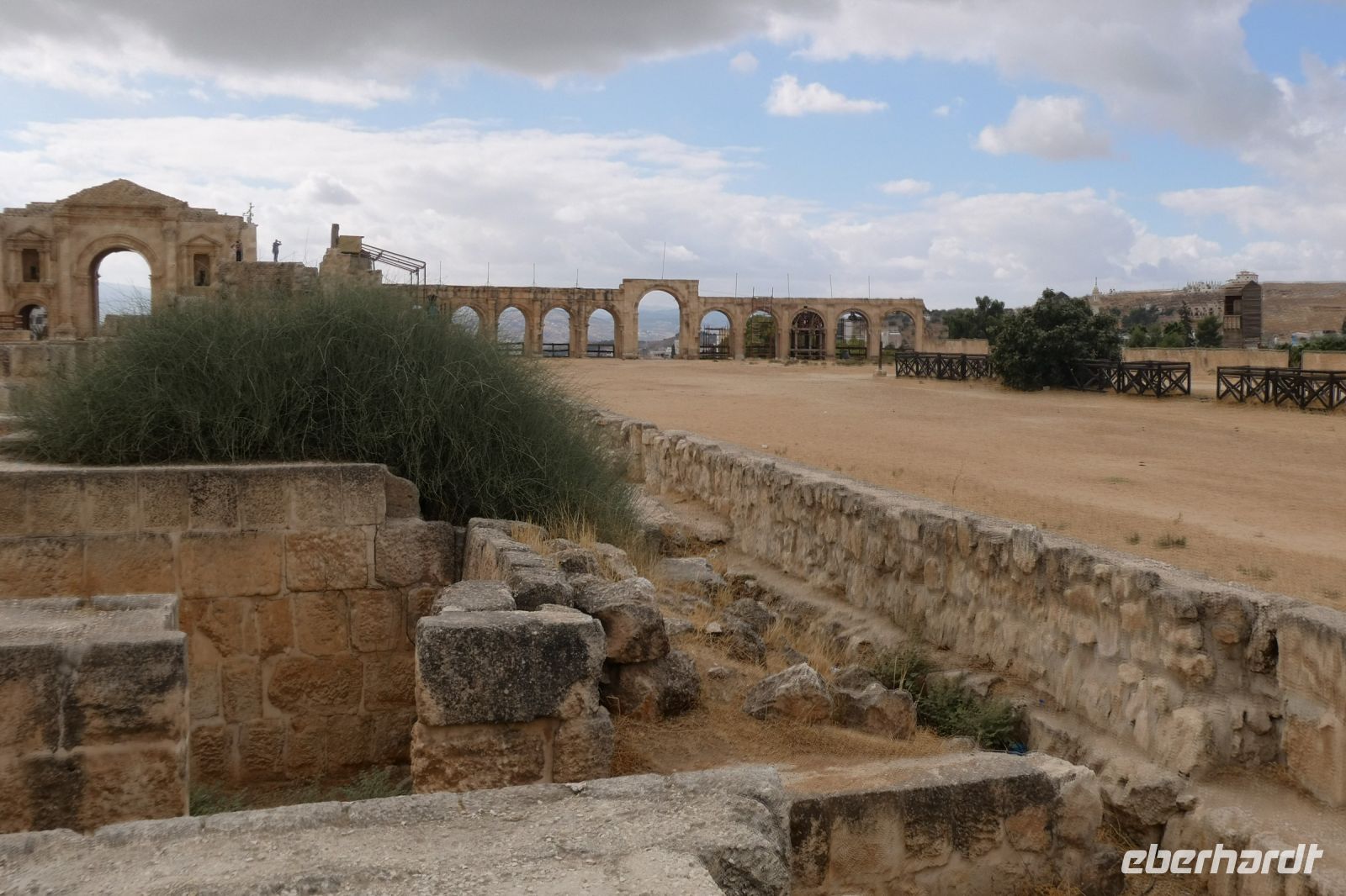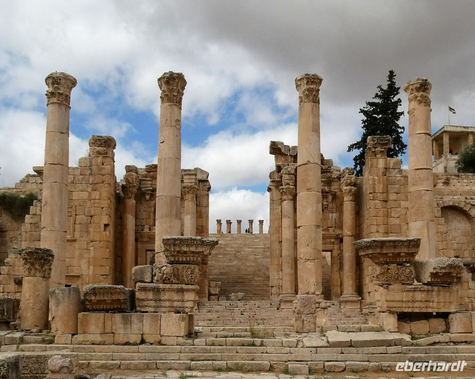 Nach Meinung der Archäologen handelt es sich bei diesem ovalen Platz um einen Kniff der Städtebauer. Sie wollten den „Zeus-Tempel“ mit der Hauptstraße (Cardo) verbinden. Dieser Cardo ist mit seinen korinthischen Säulen wirklich als prachtvoll zu bezeichnen. Im originalen römischen Pflaster sind noch die Wagenspuren der antiken Wagen zu sehen, die sich über Jahrhunderte eingegraben haben. Vorbei am "Nymphäeum", dem Stadtbrunnen, erreichen wir den Aufgang zum „Artemis-Tempel“, einem der schönsten Tempel von Gerasa. Imposant wirkt der Weg über den Decumanus hinauf mit interessanter Perspektive. Bevor wir uns aber den Tempel von der Nähe anschauen besuchen wir das nördliche Theater mit 800 Sitzplätzen und testen die Akustik. Dann aber machen wir eine kleine Pause bei Artemis und ein freundlicher Jordanier kocht Kaffee oder Tee für uns. Dabei bekommen wir die Elastizität der Tempelsäulen demonstriert. Man kann sie doch tatsächlich bewegen.