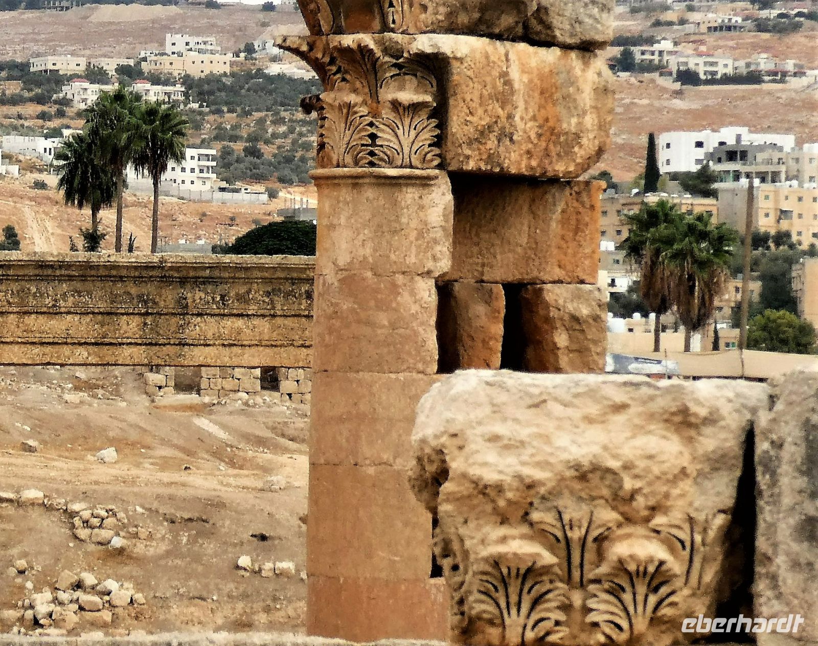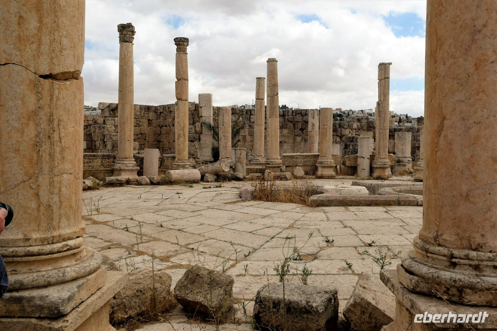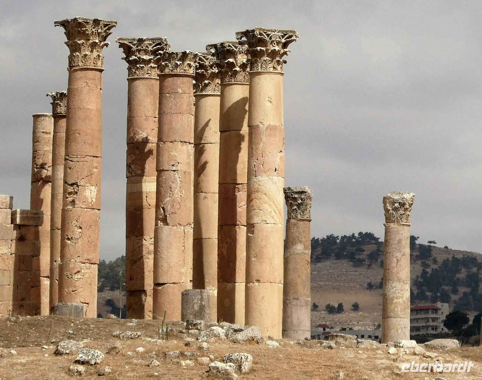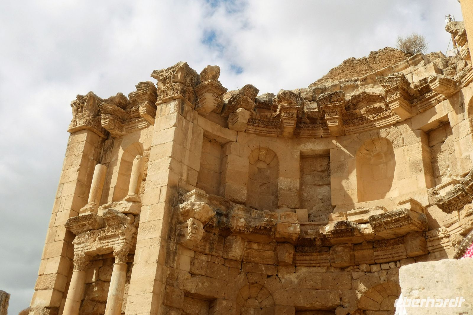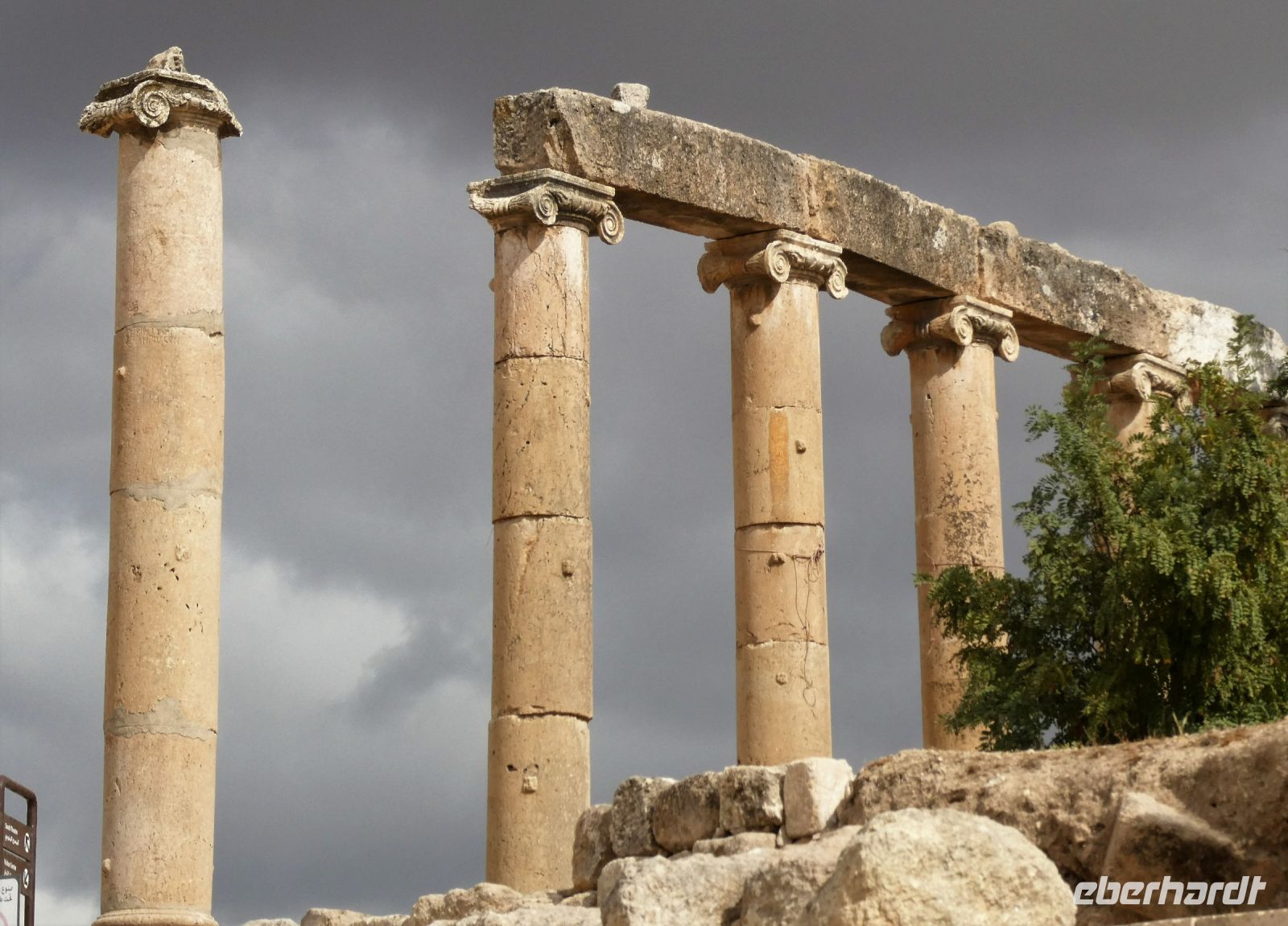 Nach Meinung der Archäologen handelt es sich bei diesem ovalen Platz um einen Kniff der Städtebauer. Sie wollten den „Zeus-Tempel“ mit der Hauptstraße (Cardo) verbinden. Dieser Cardo ist mit seinen korinthischen Säulen wirklich als prachtvoll zu bezeichnen. Im originalen römischen Pflaster sind noch die Wagenspuren der antiken Wagen zu sehen, die sich über Jahrhunderte eingegraben haben. Vorbei am "Nymphäeum", dem Stadtbrunnen, erreichen wir den Aufgang zum „Artemis-Tempel“, einem der schönsten Tempel von Gerasa. Imposant wirkt der Weg über den Decumanus hinauf mit interessanter Perspektive. Bevor wir uns aber den Tempel von der Nähe anschauen besuchen wir das nördliche Theater mit 800 Sitzplätzen und testen die Akustik. Dann aber machen wir eine kleine Pause bei Artemis und ein freundlicher Jordanier kocht Kaffee oder Tee für uns. Dabei bekommen wir die Elastizität der Tempelsäulen demonstriert. Man kann sie doch tatsächlich bewegen.