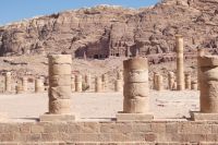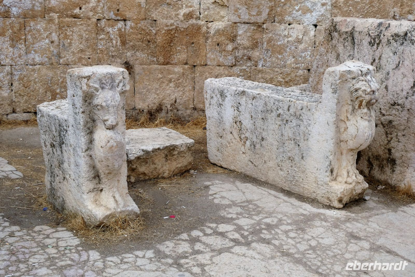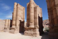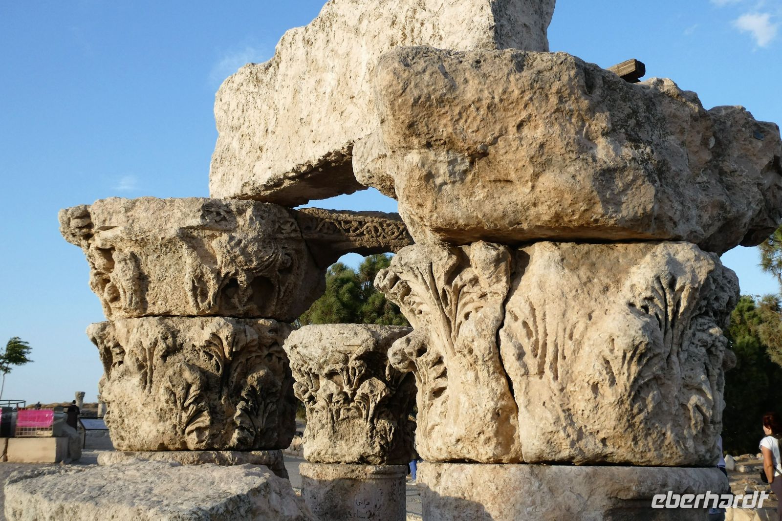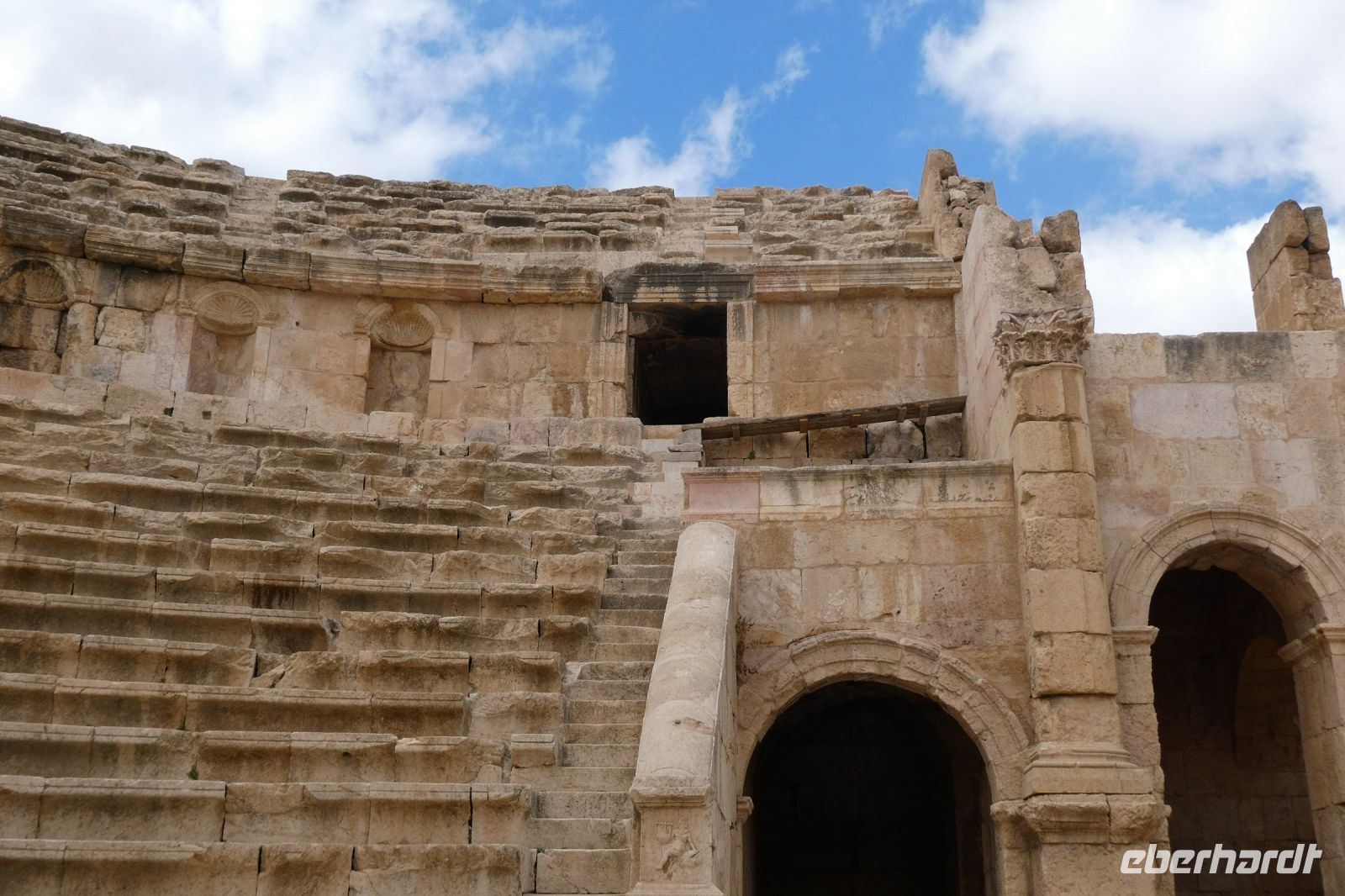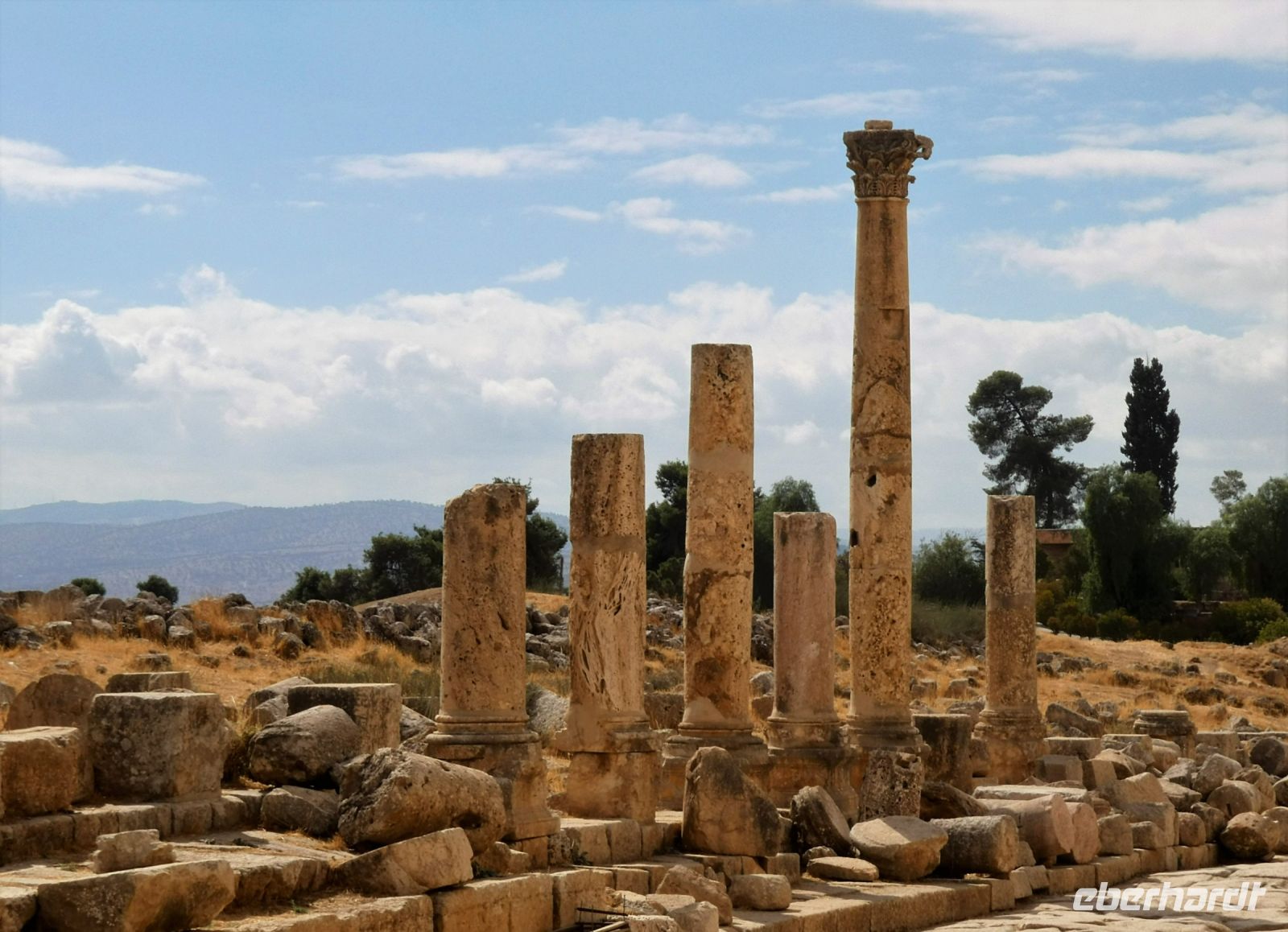 Nach Meinung der Archäologen handelt es sich bei diesem ovalen Platz um einen Kniff der Städtebauer. Sie wollten den „Zeus-Tempel“ mit der Hauptstraße (Cardo) verbinden. Dieser Cardo ist mit seinen korinthischen Säulen wirklich als prachtvoll zu bezeichnen. Im originalen römischen Pflaster sind noch die Wagenspuren der antiken Wagen zu sehen, die sich über Jahrhunderte eingegraben haben. Vorbei am "Nymphäeum", dem Stadtbrunnen, erreichen wir den Aufgang zum „Artemis-Tempel“, einem der schönsten Tempel von Gerasa. Imposant wirkt der Weg über den Decumanus hinauf mit interessanter Perspektive. Bevor wir uns aber den Tempel von der Nähe anschauen besuchen wir das nördliche Theater mit 800 Sitzplätzen und testen die Akustik. Dann aber machen wir eine kleine Pause bei Artemis und ein freundlicher Jordanier kocht Kaffee oder Tee für uns. Dabei bekommen wir die Elastizität der Tempelsäulen demonstriert. Man kann sie doch tatsächlich bewegen.